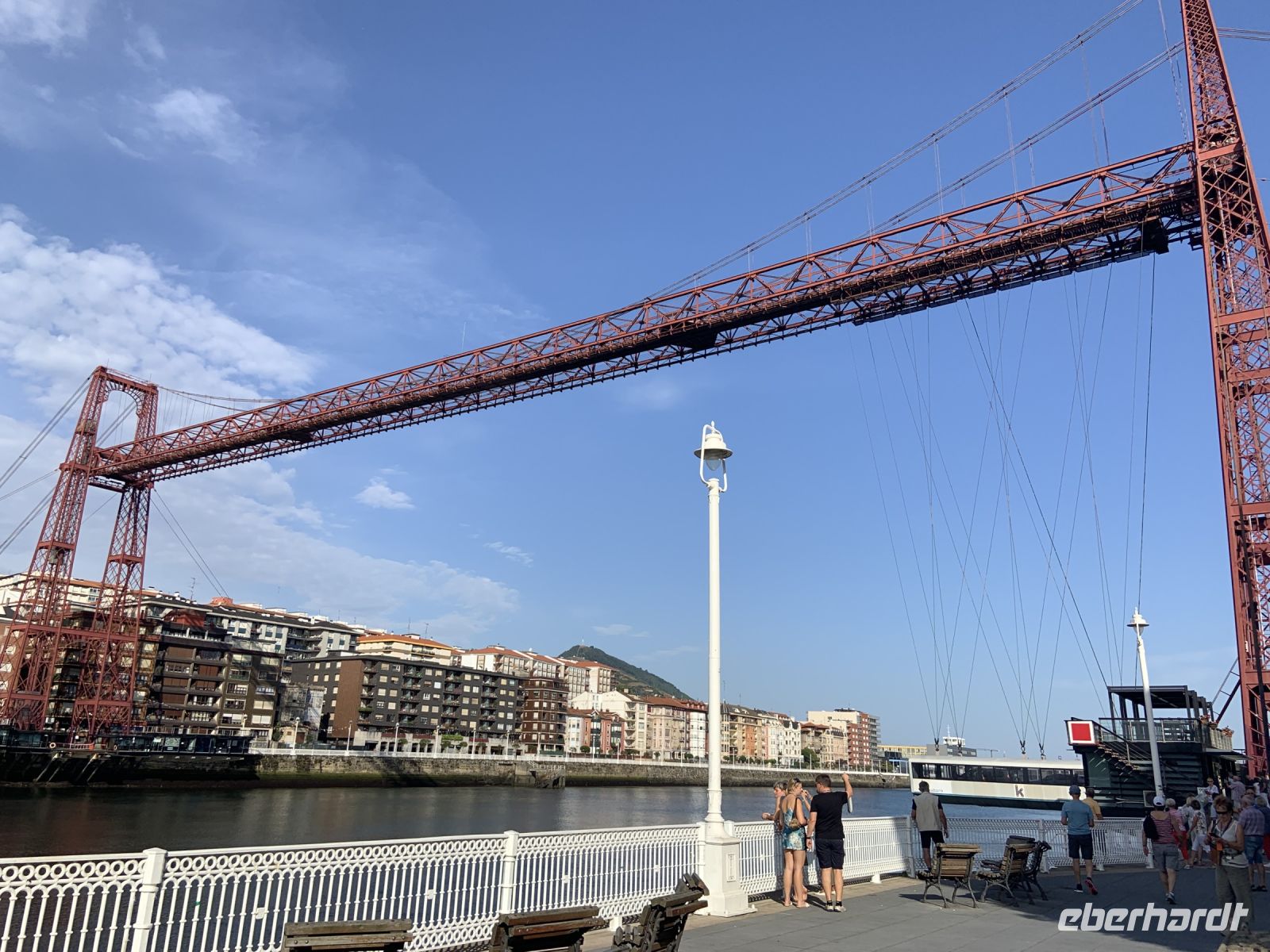 Die Stadtrundfahrt mit der örtlichen Reiseleiterin Mabel führt uns zunächst auf den Monte Artxanda. Der Panoramablick auf die Stadt und das spektakuläre Guggenheimmuseum ist beeindruckend. Entlang der Adelspaläste im vornehmen Vorort Getxo erreichen wir die Mündung der Ria und sehen den Strand und Hafen von Bilbao. Die Puente Vizcaya, die Hängebrücke mit der außergewöhnlichen Schwebefähre, ist ein beeindruckendes Konstrukt, bereits im Jahre 1893 erbaut, das den Fluss Nervion überspannt und heute zum UNESCO-Weltkulturerbe zählt.