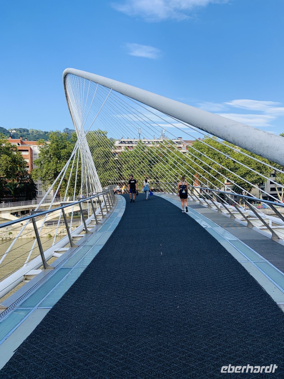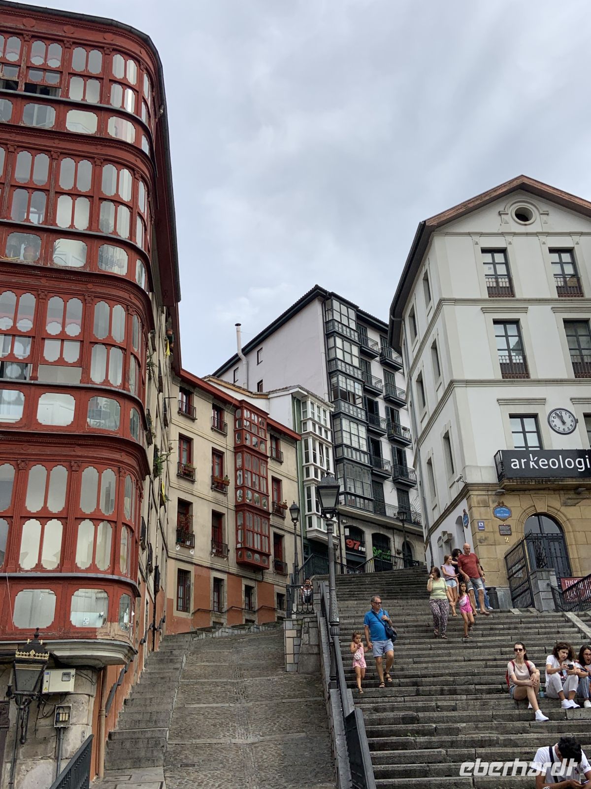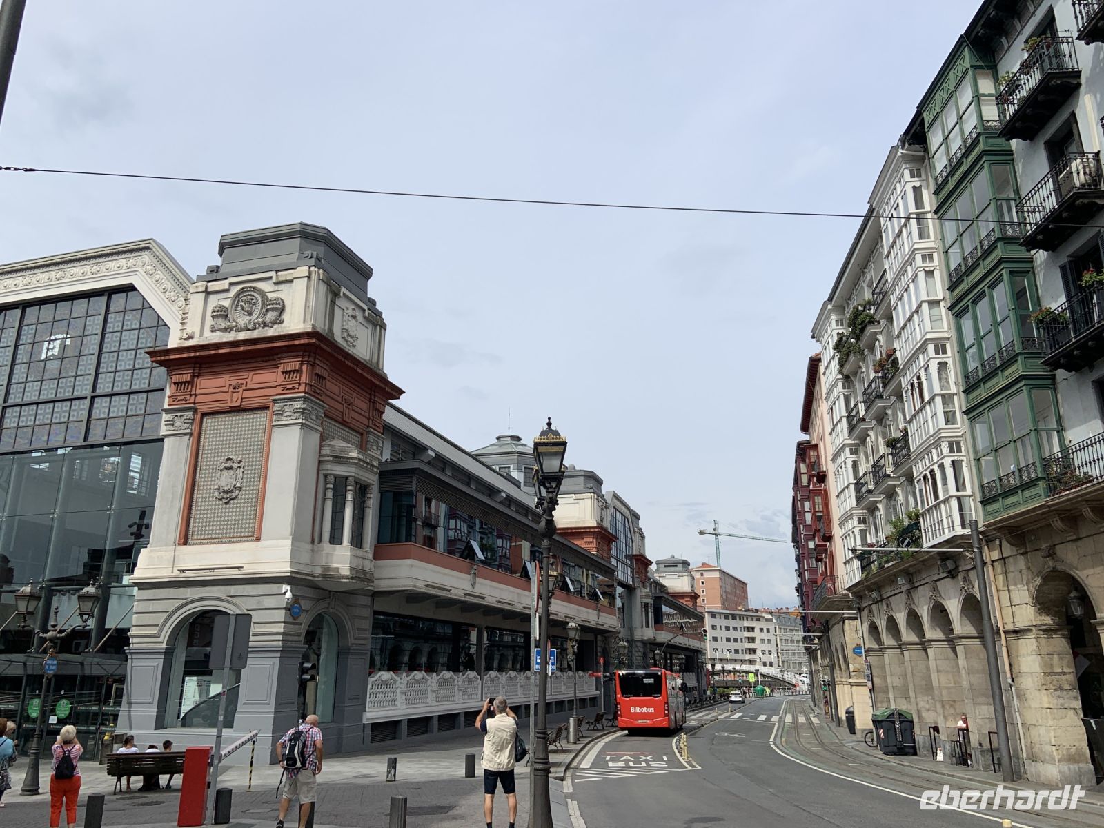 Vorbei an der Zubizuri-Brücke von Calatrava, in der Form eines Segelschiffs und mit gläsernem Boden, an den Hochhaustürmen Isozaki, der Universität von Deusto, Torre Iberdrola fahren wir bis zur Altstadt. Wir spazieren am Fluss Nervion entlang bis zum Theater Arriaga, von wo die 7 calles (7 Gassen) im „casco viejo“ parallel bis zur Markthalle führen. Wir sehen die Plaza Nueva, die Kathedrale Santiago, einige interessante Gebäude, wo die Überschwemmungshöhe der Stadt im Jahre 1983 markiert ist. Dann wollen alle nur noch zur Markthalle, wo die köstlichsten Leckereien und Pintxos zur Mittagszeit warten.