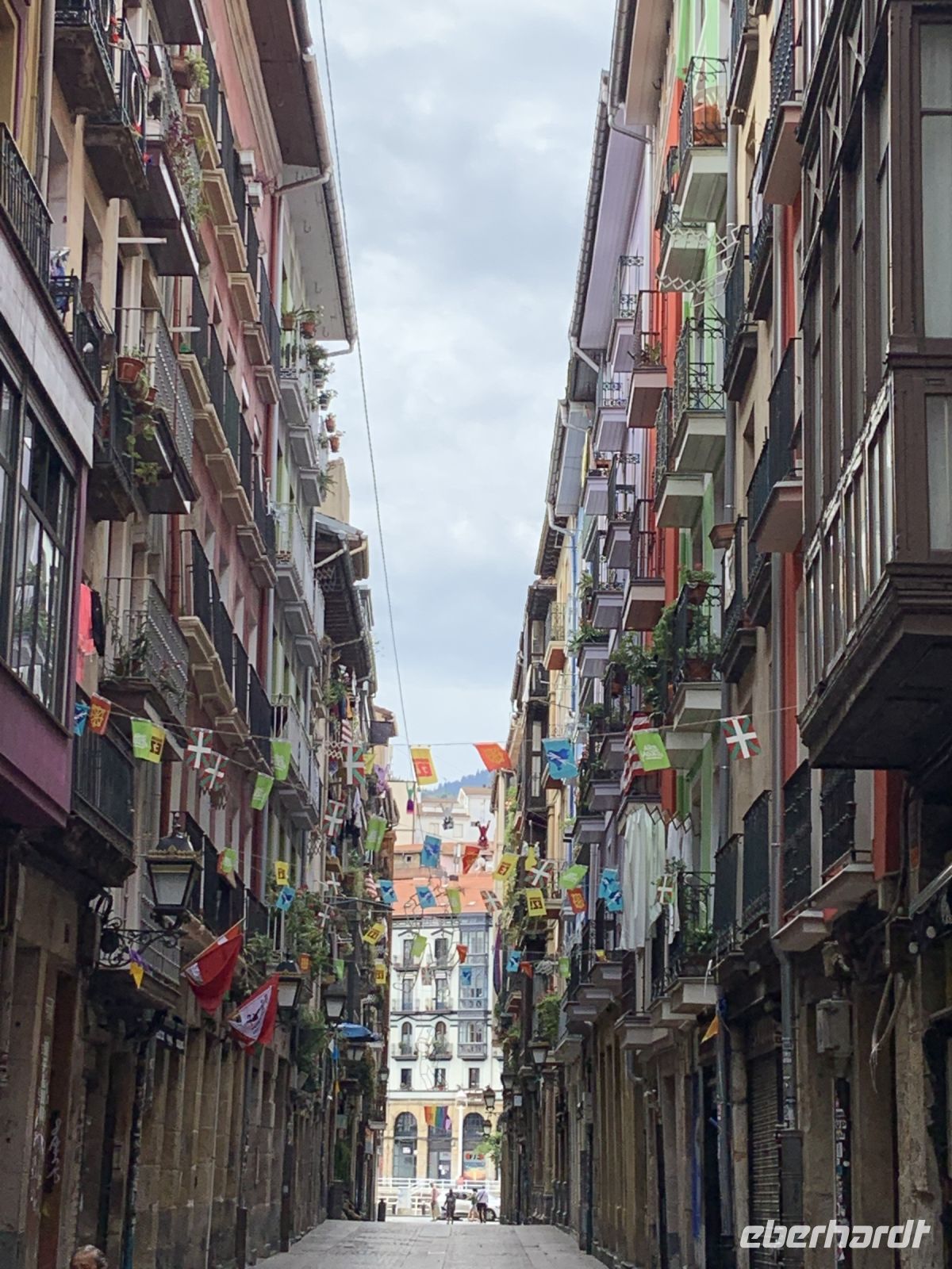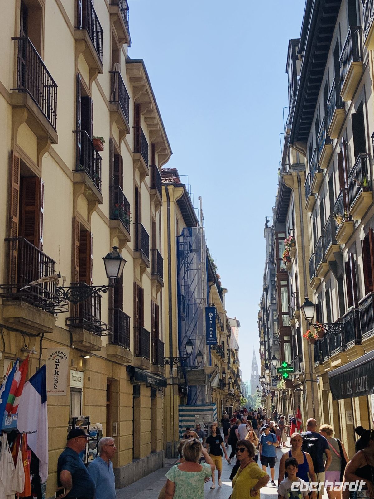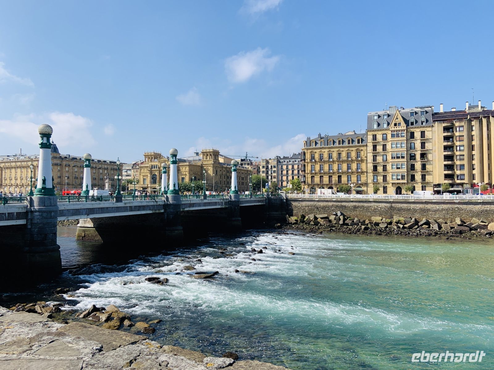 Danach wartet die Altstadtbesichtigung auf uns. Vom Busbahnhof führt uns Lourdes, die lokale Stadtführerin, am Fluss entlang und über die pompöse Brücke des Flusses Urumea. Von hier sehen wir das moderne Gebäude des Kursaal (Palacio de Congresos). Doch nun geht es hinein in die Altstadt, die durch 7 Tore erreichbar ist. Vorbei an der Markthalle La Bretxa kommen wir zur Plaza Constitución mit nummerierten Fenstern, ehemals Stierkampfarena. Die pittoresken Gassen sind gesäumt von unzähligen Pintxos-Bars und kleinen Läden. Sehr einladend! Wir bestaunen das Portal der Basilika Santa Maria und kommen zum alten Hafen. Wir enden am Casa Constitutional, dem Rathaus, das an das Casino von Monaco erinnert. Und da ist auch die Bucht La Concha! Was für ein Anblick!