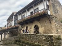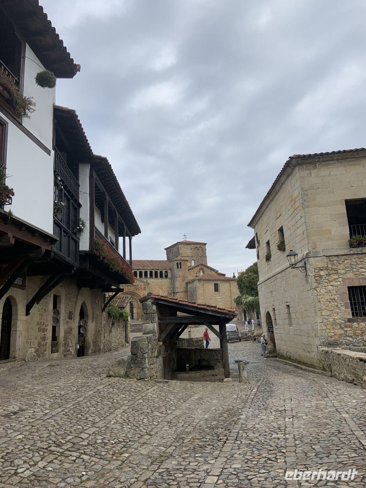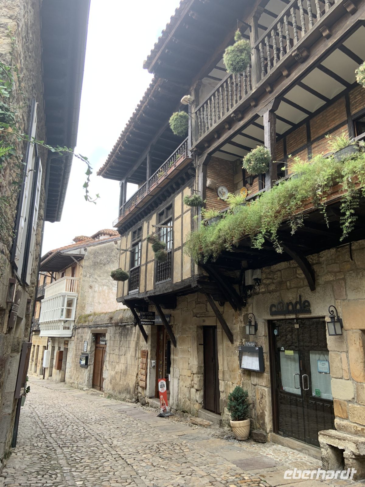 Wir fahren eine halbe Stunde früher los und stoppen noch am Aussichtspunkt Faro Cabo Mayor (Leuchtturm), bevor wir nach kurzer Fahrt das mittelalterliche Santillana erreichen. Das Museumsdorf entzückt mit seiner Architektur, blumengeschmückten Fenstern , Kopfsteinpflaster und der Klosterkirche der Santa Juliana (12.Jh.) , der Namensgeberin am oberen Dorfende. Gerne würden wir uns hier noch etwas aufhalten, doch der Besuch der Altamira-Höhle wartet auf uns.