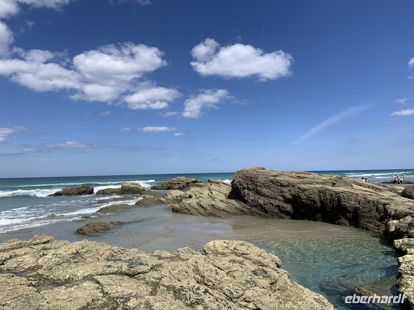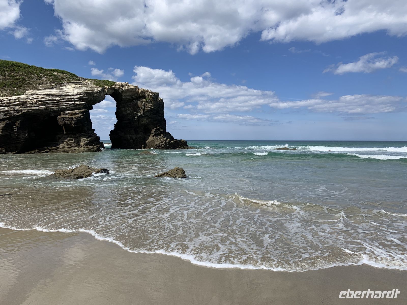 Wir fahren mittags weiter zum Kathedralenstrand bei Ribadeo. Der optimale Zeitpunkt für einen Besuch ist von der Ebbe abhängig. Es passt gegen 15 Uhr, dann können wir über den Strand in voller Breite und Eindrücklichkeit spazieren. Das Meer hat hier in Jahrtausenden Bögen und Durchgänge aus dem Stein gewaschen, Felstore, die an ein Gotteshaus erinnern und bei Flut gänzlich überschwemmt sind. Der Zugang zu diesem Spektakel ist in den Sommermonaten streng limitiert und nur mit langer Vorreservierung der Eintrittskarten möglich. Sich hier den Wind um die Nase wehen zu lassen, war schon ein besonderes Erlebnis!