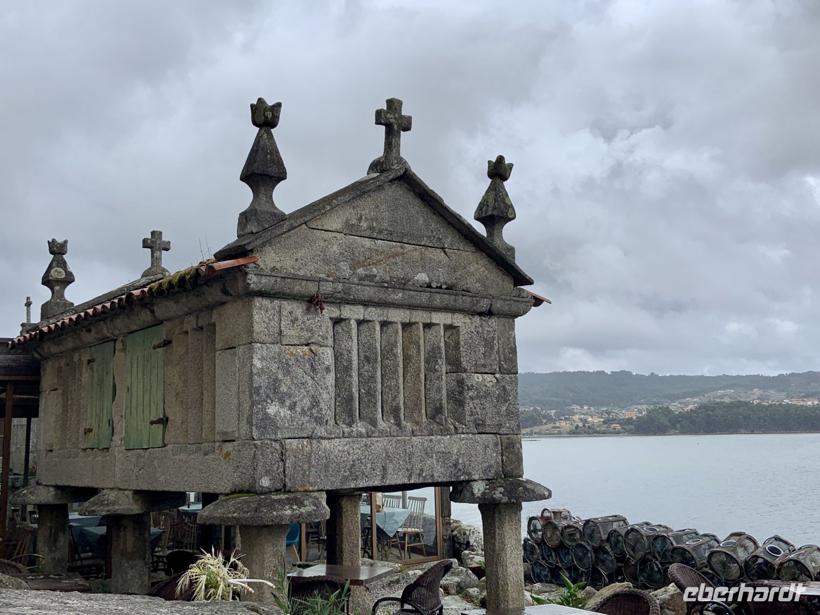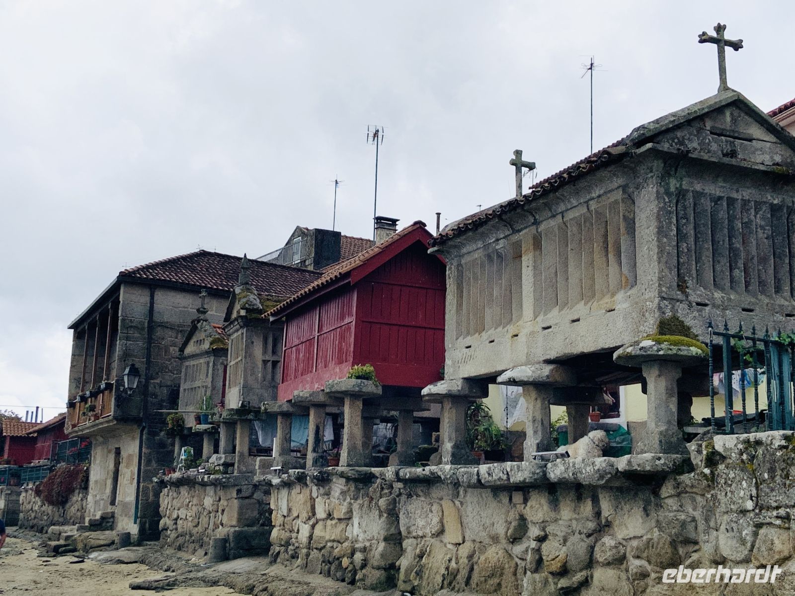 Es geht weiter zum längsten Strand Galiciens, La Lanzada, der sehr malerisch aussieht. Doch heute ist es für einen Spaziergang definitiv zu windig und dicke Regenwolken türmen sich am Himmel. Wir beschließen einen Abstecher zum Fischerdorf Combarro zu machen und dort im schönen, mittelalterlichen Ortskern eine späte Mittagspause zu verbringen. Es gibt schöne Lädchen und gute Fischrestaurants direkt am Wasser. Wir sehen auch originale Hórreos (Speicherhäuschen) auf Pfosten. Leider öffnet der Himmel nun erneut seine Schleusen.