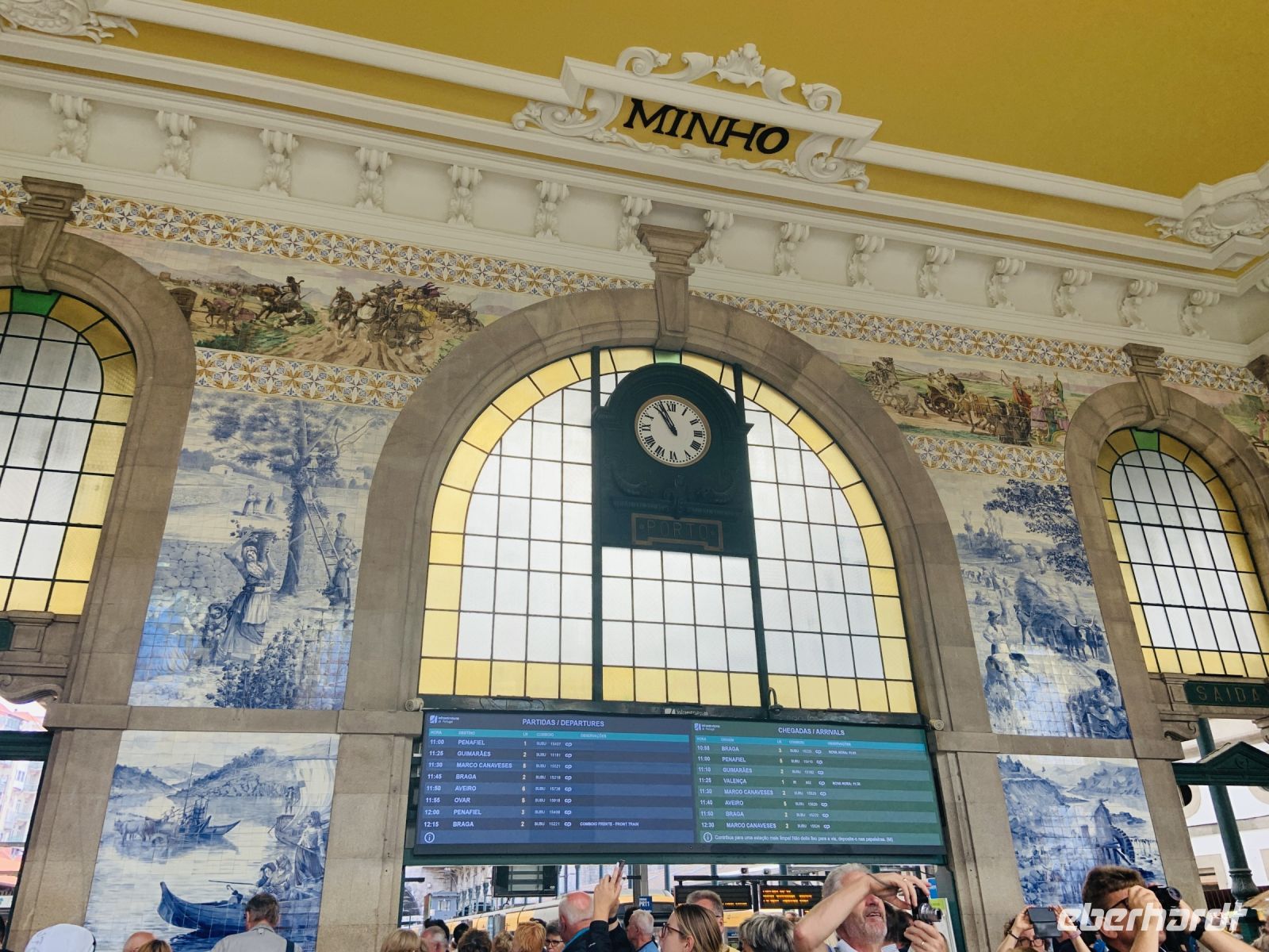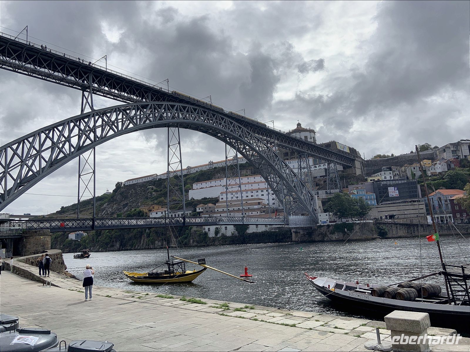 Eindrucksvolle Brücken überspannen den Douro, auch sie sind Wahrzeichen von Porto. Links die Altstadt von Porto, rechts (auf der Schattenseite) liegt Gaia. Beide verbunden durch die Brücken. Wir streifen zu Fuß durch die Altstadt und sehen den Bahnhof Sao Bento mit kunstvollen Azulejo-Malereien, die Fußgängerzone Rua das Flores und die Kathedrale in der Oberstadt. Dann geht es abwärts durch enge Gassen, vorbei an urigen Wohnhäusern ins Viertel Ribeira. Dort am Flussufer ist jede Menge los, Touristen aus aller Welt bevölkern die netten Bars und Restaurants.