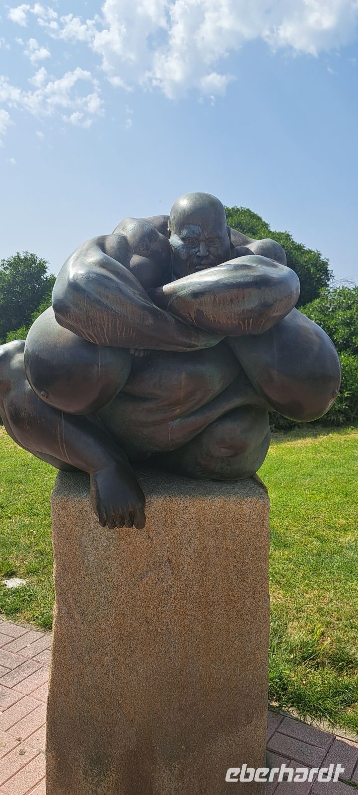 Um 9h kommt unsere örtliche Reiseleiterin, um uns für die Stadterkundung abzuholen. Sie hat den für uns unaussprechbaren baskischen Namen Izaskun, wir einigen uns schnell auf Iza . Ausgestattet mit Audioguides, machen wir uns zunächst mit dem Bus auf den Weg hoch zum Monte Artxanta. Der Hausberg von Bilbao, verschafft uns einen ersten spektakulären Überblick auf die Stadt. Wir erkennen das Guggenheim Museum, die Altstadt (Casco Viejo) und den Fluss Nervión der sich durch die Stadt schlängelt, im Hintergrund grüne Hügel Eine bronzene Skulptur, die einen Fingerabdruck darstellt, erinnert mahnend an den spanischen Bürgerkrieg (Juli 1936-April 1939).