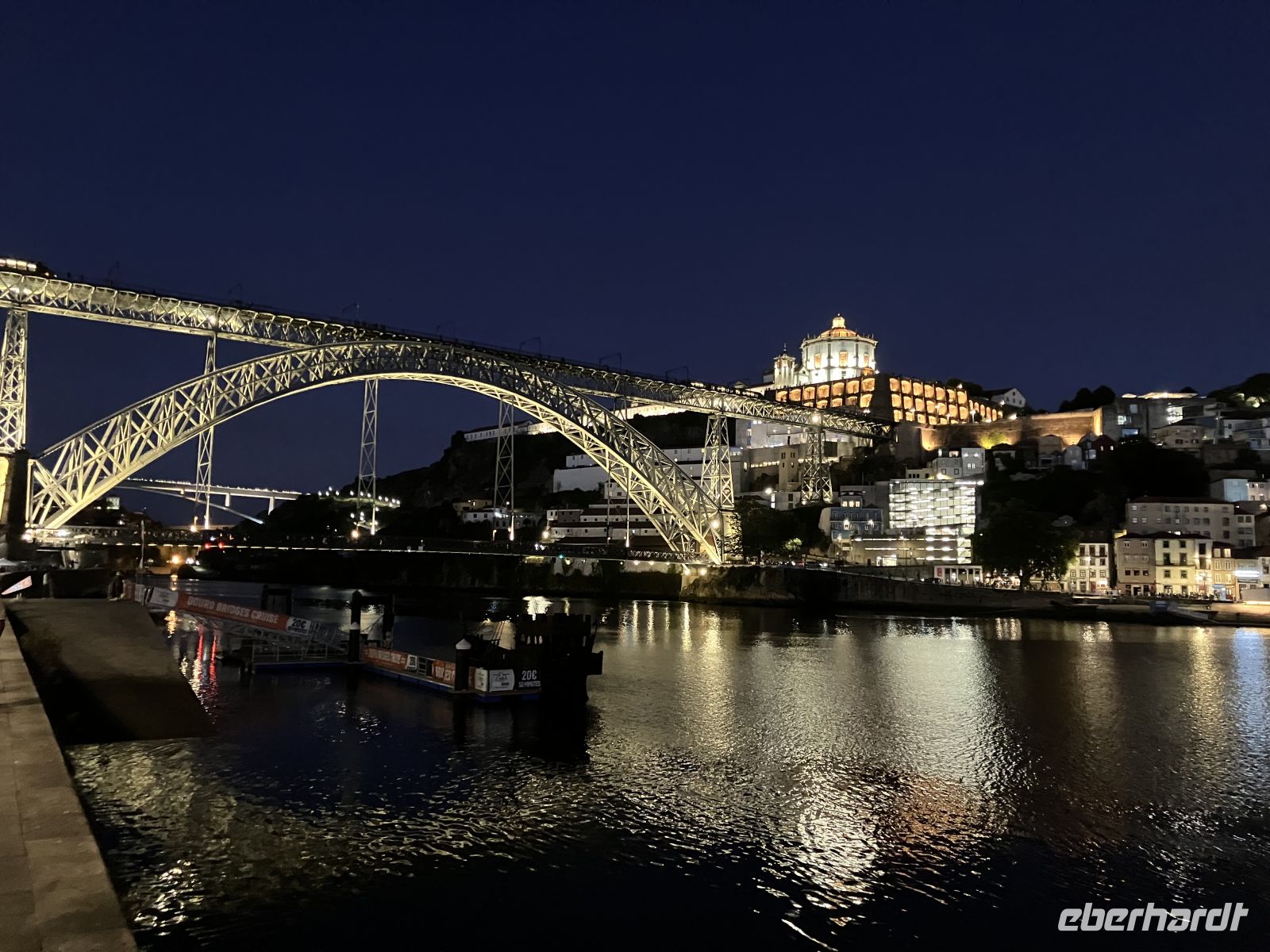In Vila Nova de Gaia, am gegenüberliegenden Ufer des Douro, besuchten wir den traditionsreichen Portweinkeller Burmester. Dort erfuhren wir von unsererm Weinexperten Ruben, wie aus den Trauben der Douro-Täler durch Haltbarmachen mit Alkohol der legendäre Portwein entsteht – und kosteten zwei verschiedene Sorten:, gereifter Tawny, eleganter White Port. Der Nachmittag stand für alle zur freien Verfügung, einige bummelten durch die Stadt und andere unternahmen eine Bootsfahrt. Am Abend trafen wir uns alle zu einem stimmungsvollen Ausklang wieder: In einer urigen Taverne direkt am Douro-Ufer, saßen wir bei Bacalhau, Vinho Tinto und einem Schokoladenkuchen zusammen. Zum Abschied blickten wir auf die Lichter der Altstadt und die beleuchtete Ponte Dom Luís I - ein würdiger, ja perfekter Abschluss einer bewegenden Reise.