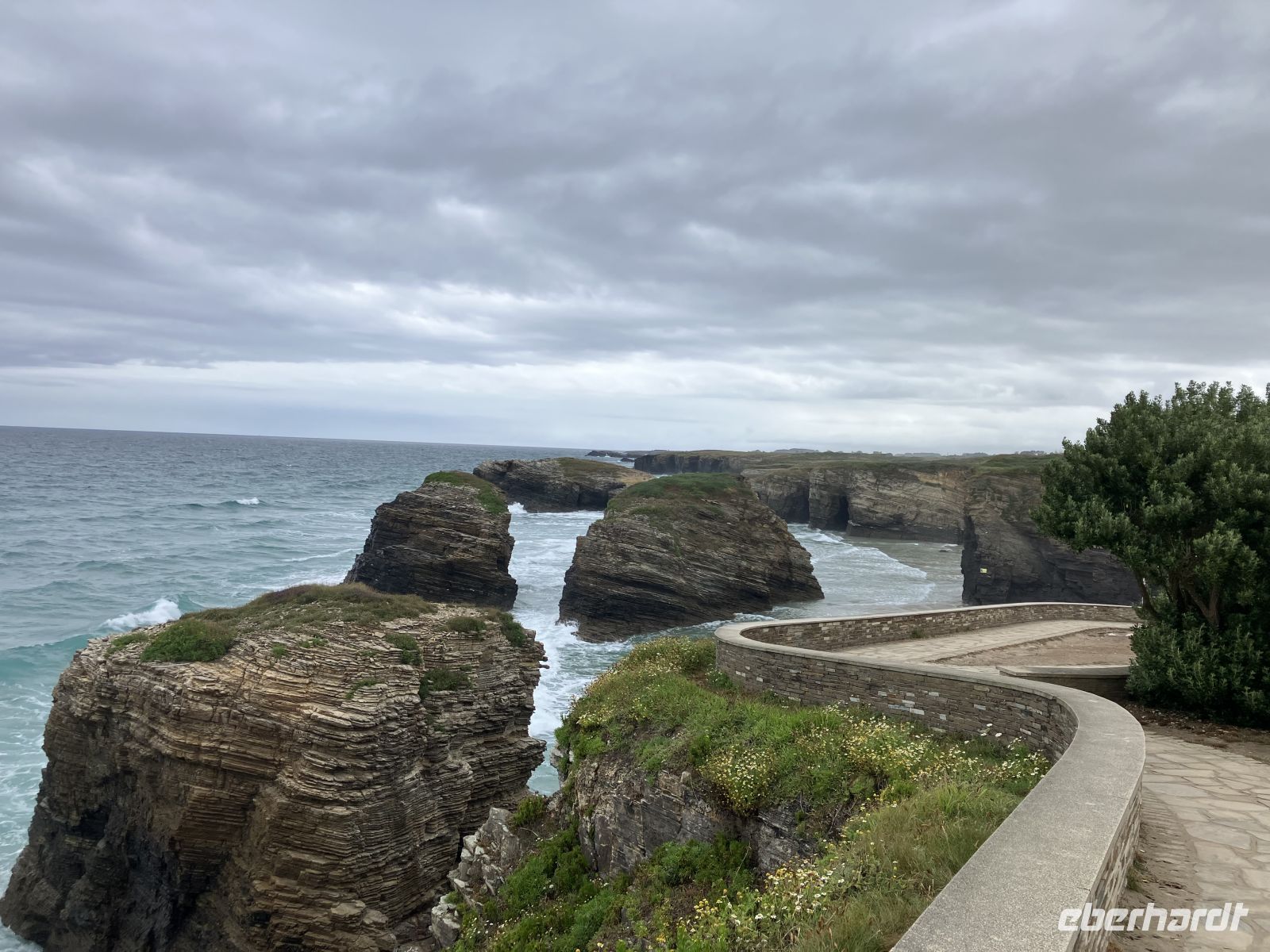 Früh am Morgen verließen wir Oviedo in Richtung Galicien. Unser Ziel: der berühmte Praia das Catedrais – der „Strand der Kathedralen“. Die Sonne lugte durch die Wolken, als wir die Küste bei Ribadeo erreichten. Leider herrschte zur Ankunft Flut, sodass wir die spektakulären Felsbögen – wie gotische Pfeiler aus Stein – nicht hautnah durchwandern konnten. Doch der Besuch lohnte sich dennoch: Der Holzbohlenweg auf der Klippe führte uns entlang der schroffen Küstenlinie und bot herrliche Ausblicke auf die tosend brandenden Wellen des Atlantiks. Salz in der Luft, Wind in den Haaren – ein eindrucksvolles Naturerlebnis.