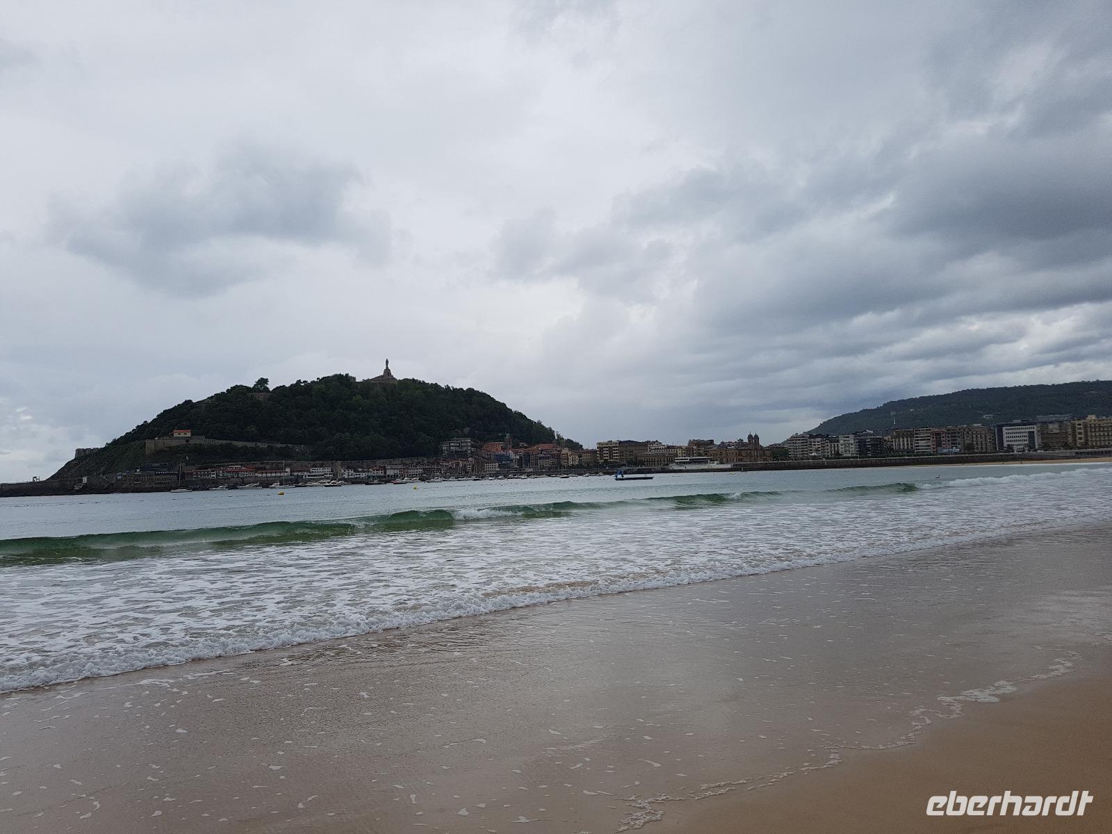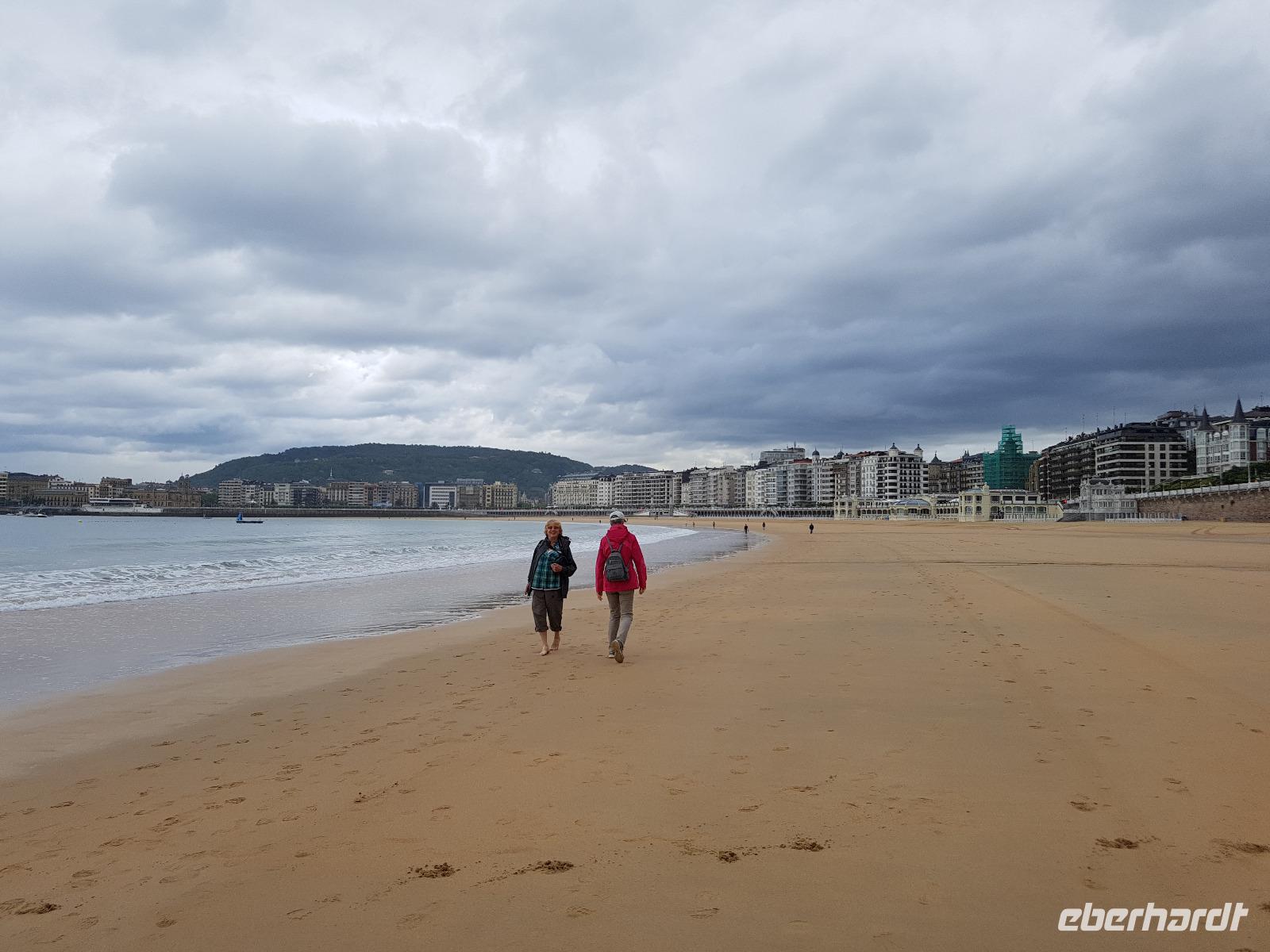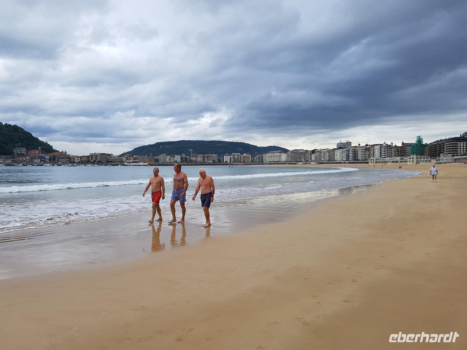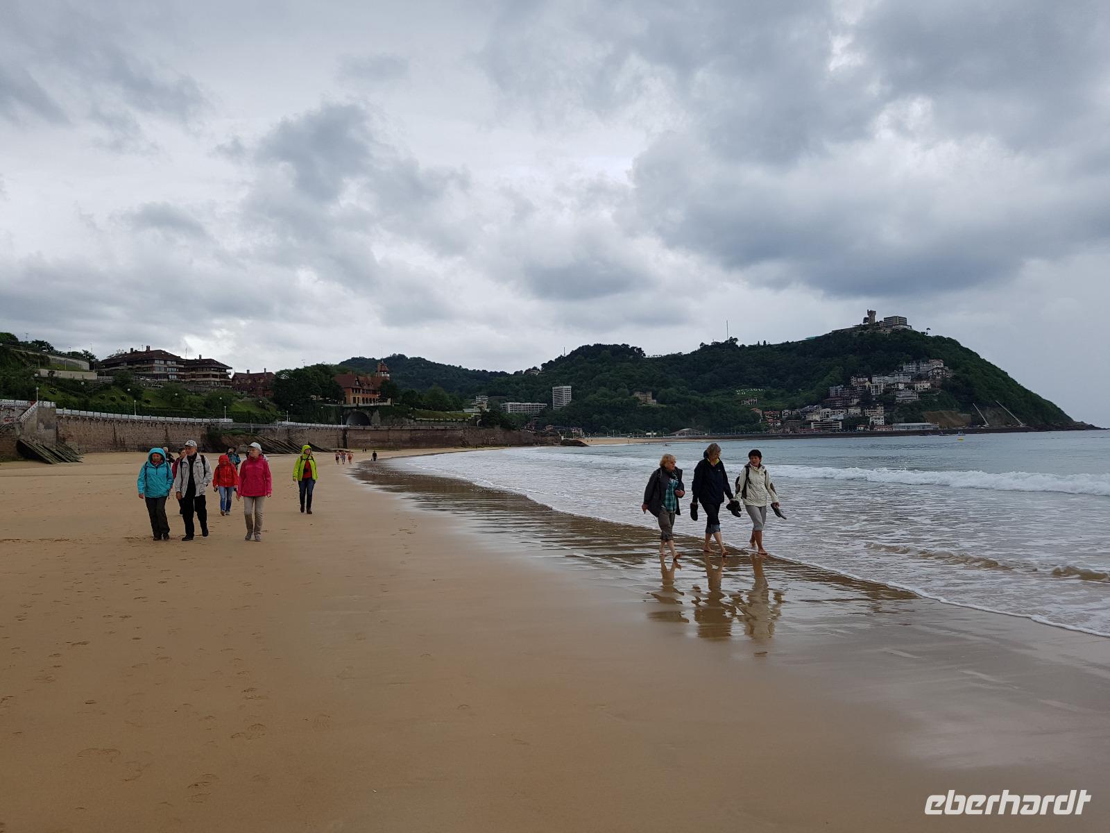 Nach einem reichhaltigen Frühstück fingen wir heute mit einer ersten kleinen Wanderung an oder sagen wir lieber einem fast 3 Kilometer langem, schönem Spaziergang an der Promenade und am Strand;) Wir spazierten durch die für Benjamin schönste Stadt Spaniens (zusammen mit Granada) und erfuhren später an der Markthalle was Tapas und "picotear" bedeutet - zusammen mit Gazpacho. Nach der Besichtigung der schönen Kirchen Santa Maria del Coro und San Vicente organisierte Benjamin ein Tapas-Picknick an der Markthalle mit Käse, Schinken und Chorizo. Lecker! Uns gefällt diese Stadt sehr, die am Atlantik sehr idyllisch an einer weiten Bucht liegt. San Sebastian wird begrenzt von den Felsmassiven des Monte Igueldo und des Monte Urgull. Bei dem ersten Spaziergang entlang dieses weitläufigen Bogens von der La Concha (Die Muschel) genannten Bucht mit der ca. 1.350 Meter langen Strandpromenade, gingen einige von uns sogar ohne Schuhe immer am Meer entlang. Wir gingen gemeinsam von links nach rechts den ganzen und einen der bekanntesten Stadtstrände in Europa entlang und lernten dabei so eine der schönsten spanischen Städte am Meer kennen. Am Ende des Strandes befindet sich hoch auf dem Urgull Berg auf dem Gipfel eine 12,5 Meter hohe Christus-Statue von wo man einen schönen Blick auf den Hafen und die Altstadt hat.