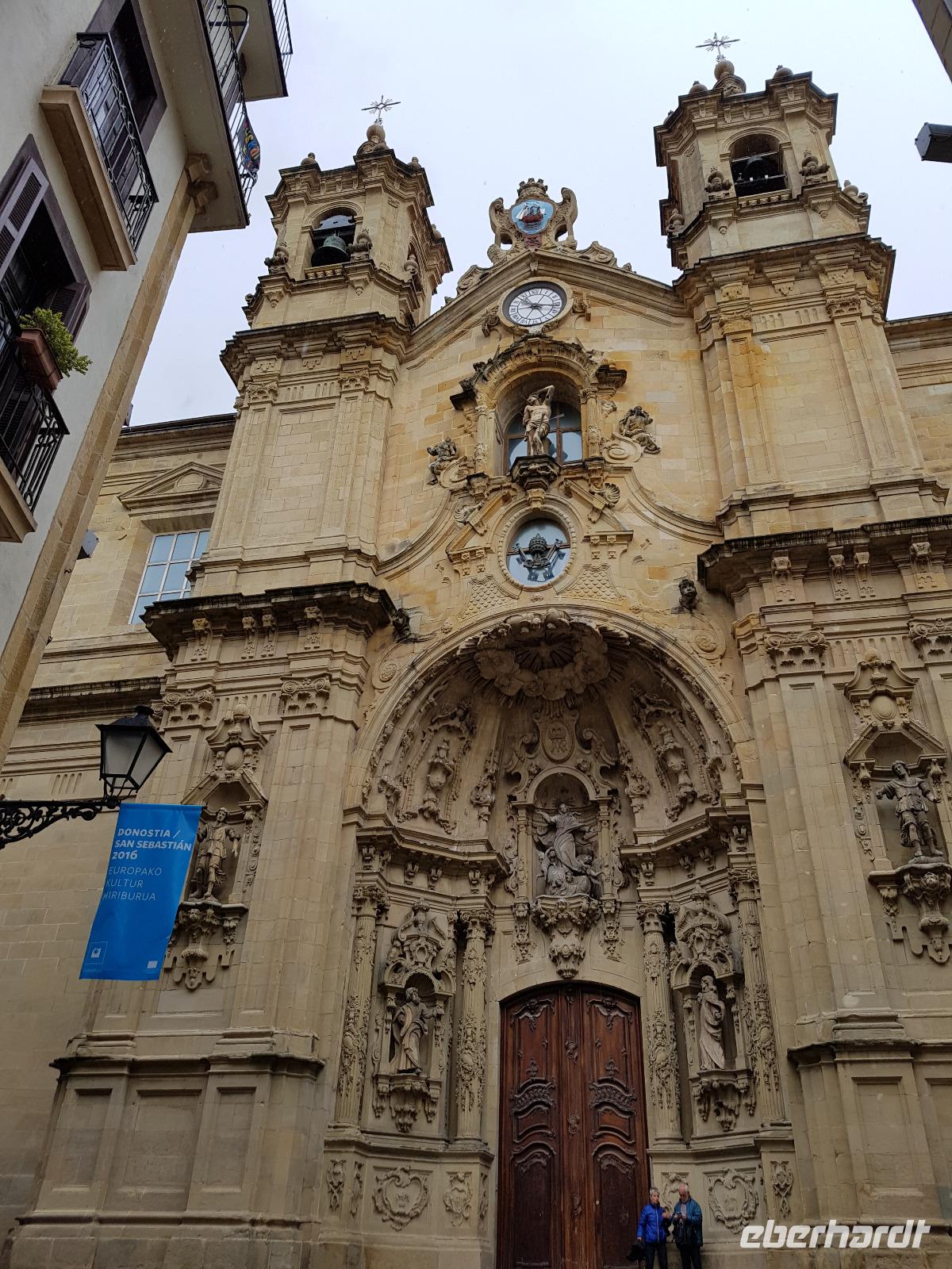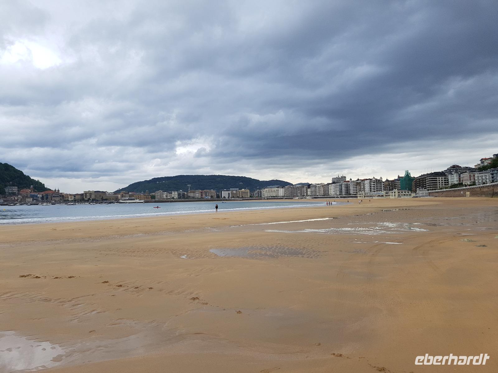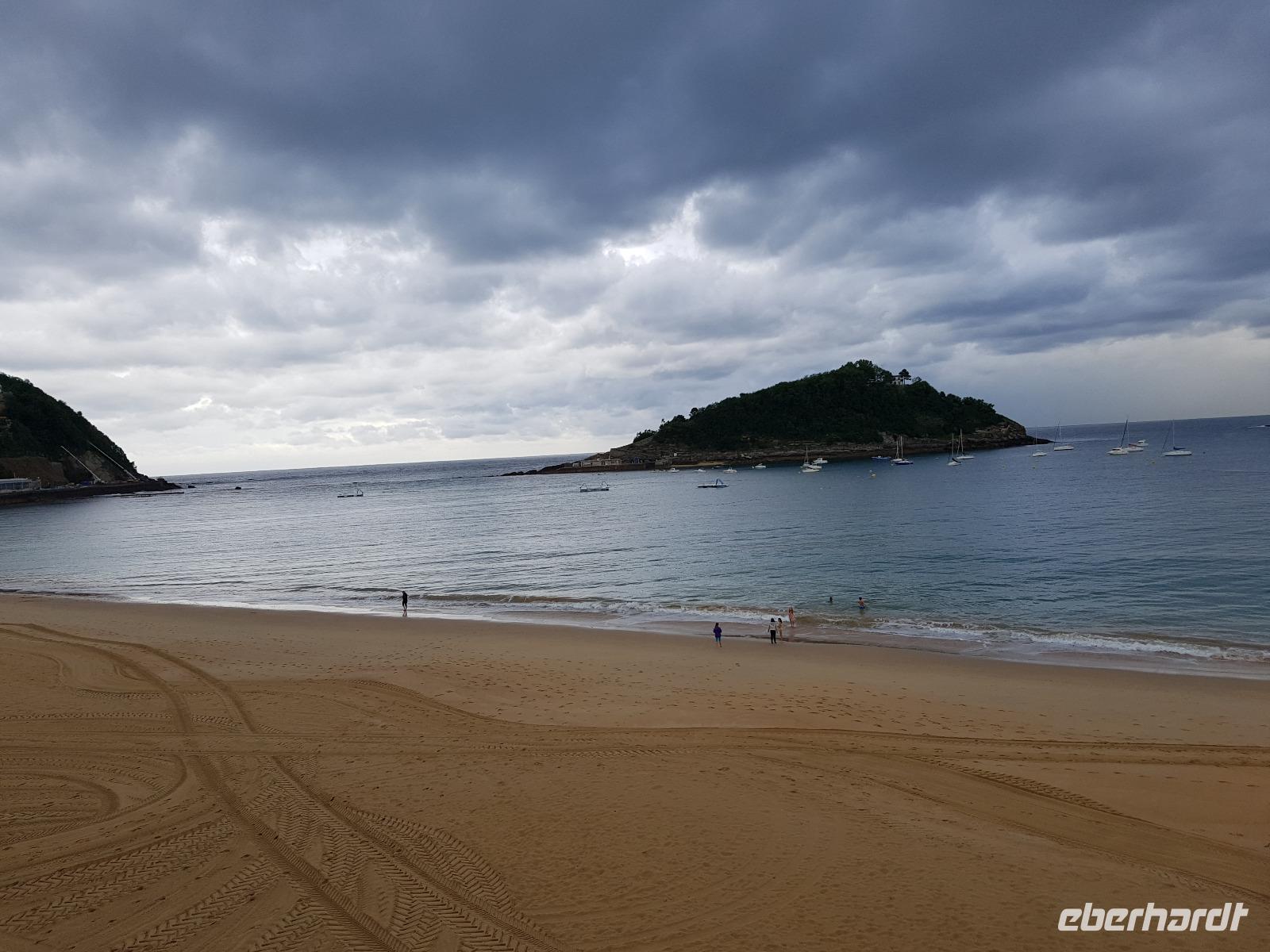 Nach einem reichhaltigen Frühstück fingen wir heute mit einer ersten kleinen Wanderung an oder sagen wir lieber einem fast 3 Kilometer langem, schönem Spaziergang an der Promenade und am Strand;) Wir spazierten durch die für Benjamin schönste Stadt Spaniens (zusammen mit Granada) und erfuhren später an der Markthalle was Tapas und "picotear" bedeutet - zusammen mit Gazpacho. Nach der Besichtigung der schönen Kirchen Santa Maria del Coro und San Vicente organisierte Benjamin ein Tapas-Picknick an der Markthalle mit Käse, Schinken und Chorizo. Lecker! Uns gefällt diese Stadt sehr, die am Atlantik sehr idyllisch an einer weiten Bucht liegt. San Sebastian wird begrenzt von den Felsmassiven des Monte Igueldo und des Monte Urgull. Bei dem ersten Spaziergang entlang dieses weitläufigen Bogens von der La Concha (Die Muschel) genannten Bucht mit der ca. 1.350 Meter langen Strandpromenade, gingen einige von uns sogar ohne Schuhe immer am Meer entlang. Wir gingen gemeinsam von links nach rechts den ganzen und einen der bekanntesten Stadtstrände in Europa entlang und lernten dabei so eine der schönsten spanischen Städte am Meer kennen. Am Ende des Strandes befindet sich hoch auf dem Urgull Berg auf dem Gipfel eine 12,5 Meter hohe Christus-Statue von wo man einen schönen Blick auf den Hafen und die Altstadt hat.