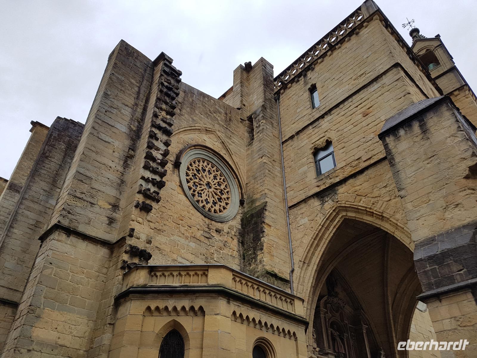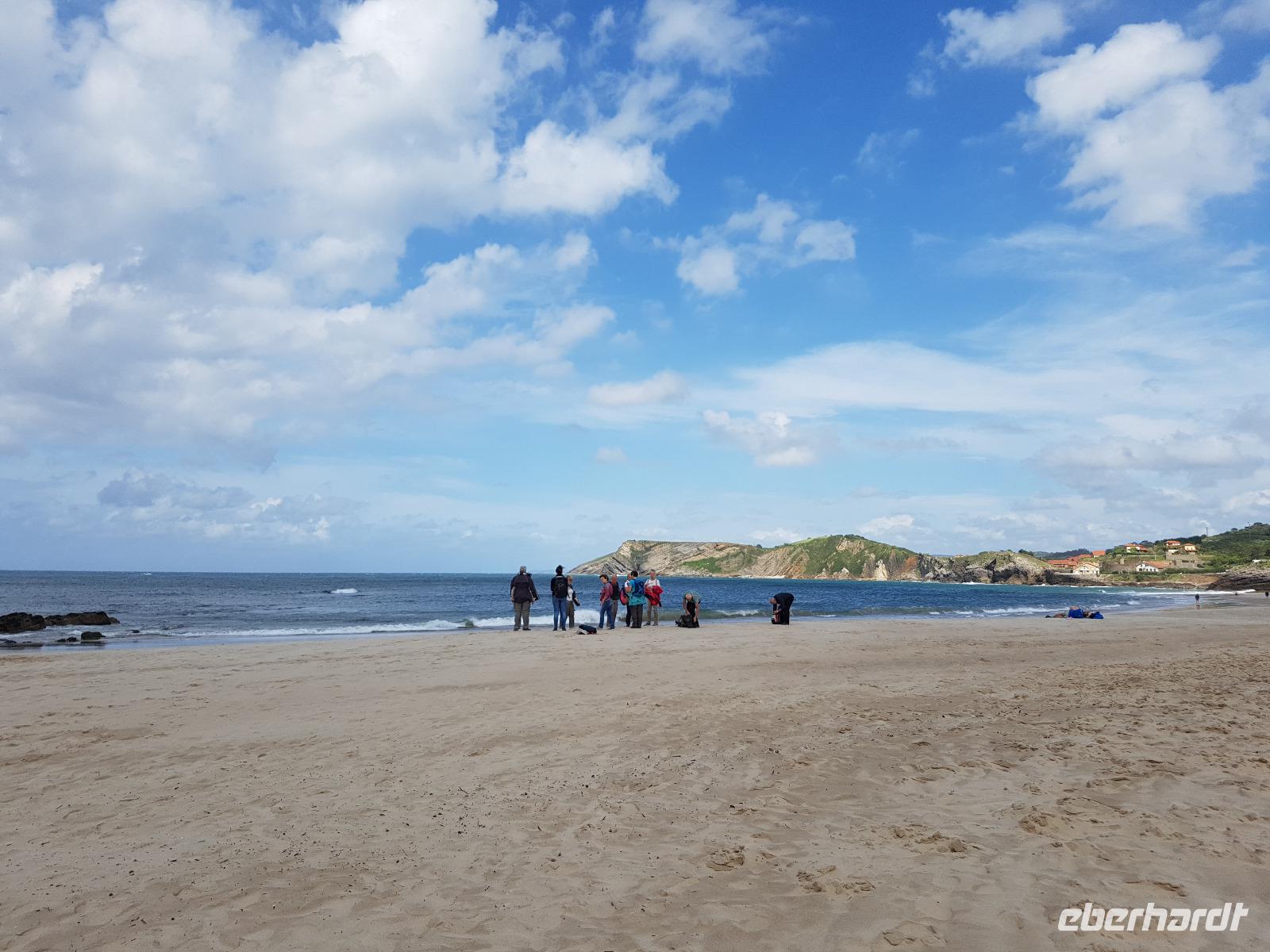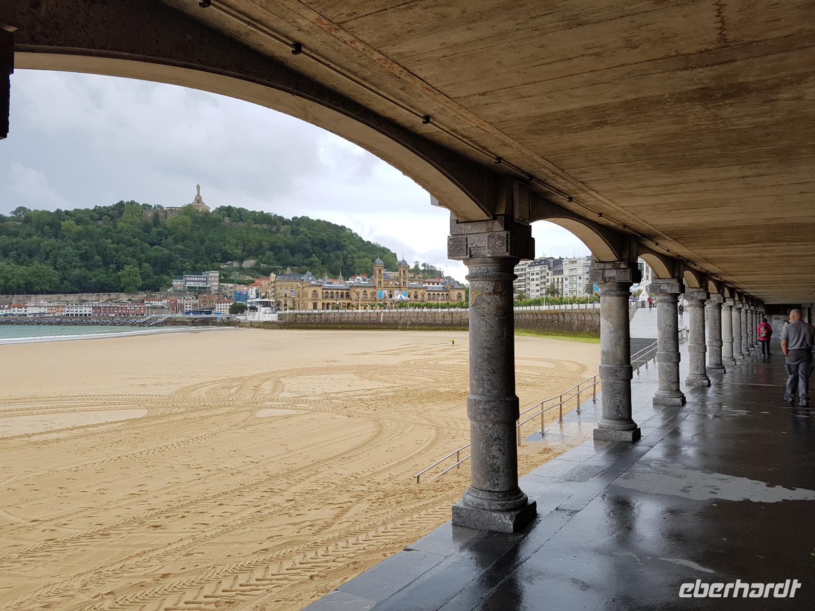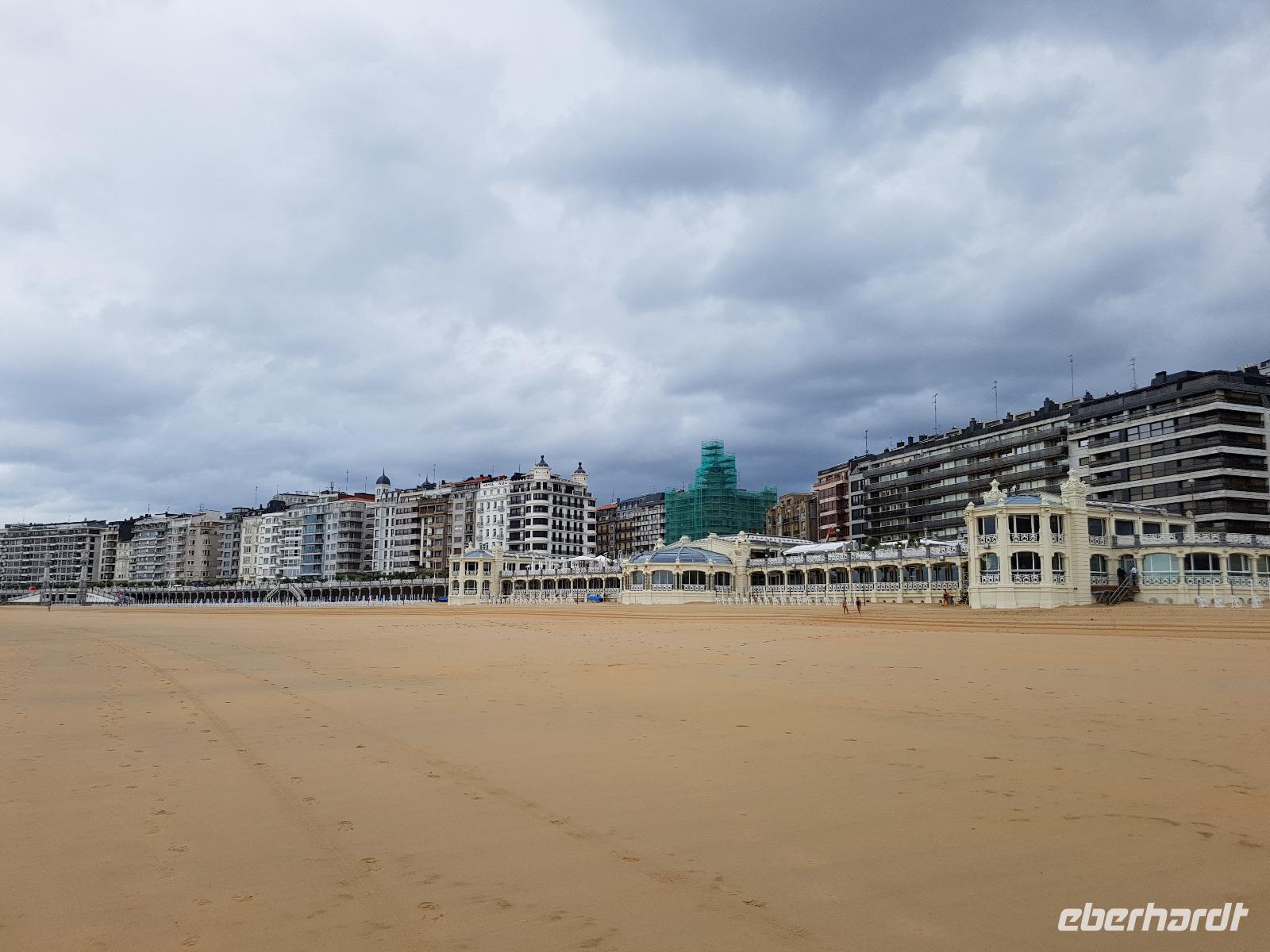Nach einem reichhaltigen Frühstück fingen wir heute mit einer ersten kleinen Wanderung an oder sagen wir lieber einem fast 3 Kilometer langem, schönem Spaziergang an der Promenade und am Strand;) Wir spazierten durch die für Benjamin schönste Stadt Spaniens (zusammen mit Granada) und erfuhren später an der Markthalle was Tapas und "picotear" bedeutet - zusammen mit Gazpacho. Nach der Besichtigung der schönen Kirchen Santa Maria del Coro und San Vicente organisierte Benjamin ein Tapas-Picknick an der Markthalle mit Käse, Schinken und Chorizo. Lecker! Uns gefällt diese Stadt sehr, die am Atlantik sehr idyllisch an einer weiten Bucht liegt. San Sebastian wird begrenzt von den Felsmassiven des Monte Igueldo und des Monte Urgull. Bei dem ersten Spaziergang entlang dieses weitläufigen Bogens von der La Concha (Die Muschel) genannten Bucht mit der ca. 1.350 Meter langen Strandpromenade, gingen einige von uns sogar ohne Schuhe immer am Meer entlang. Wir gingen gemeinsam von links nach rechts den ganzen und einen der bekanntesten Stadtstrände in Europa entlang und lernten dabei so eine der schönsten spanischen Städte am Meer kennen. Am Ende des Strandes befindet sich hoch auf dem Urgull Berg auf dem Gipfel eine 12,5 Meter hohe Christus-Statue von wo man einen schönen Blick auf den Hafen und die Altstadt hat.