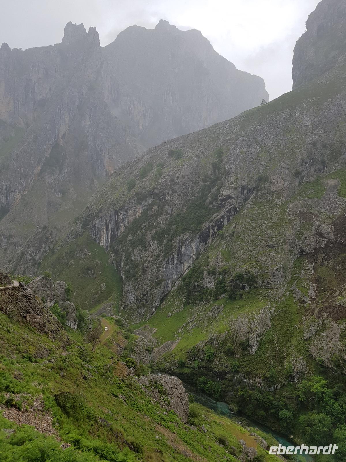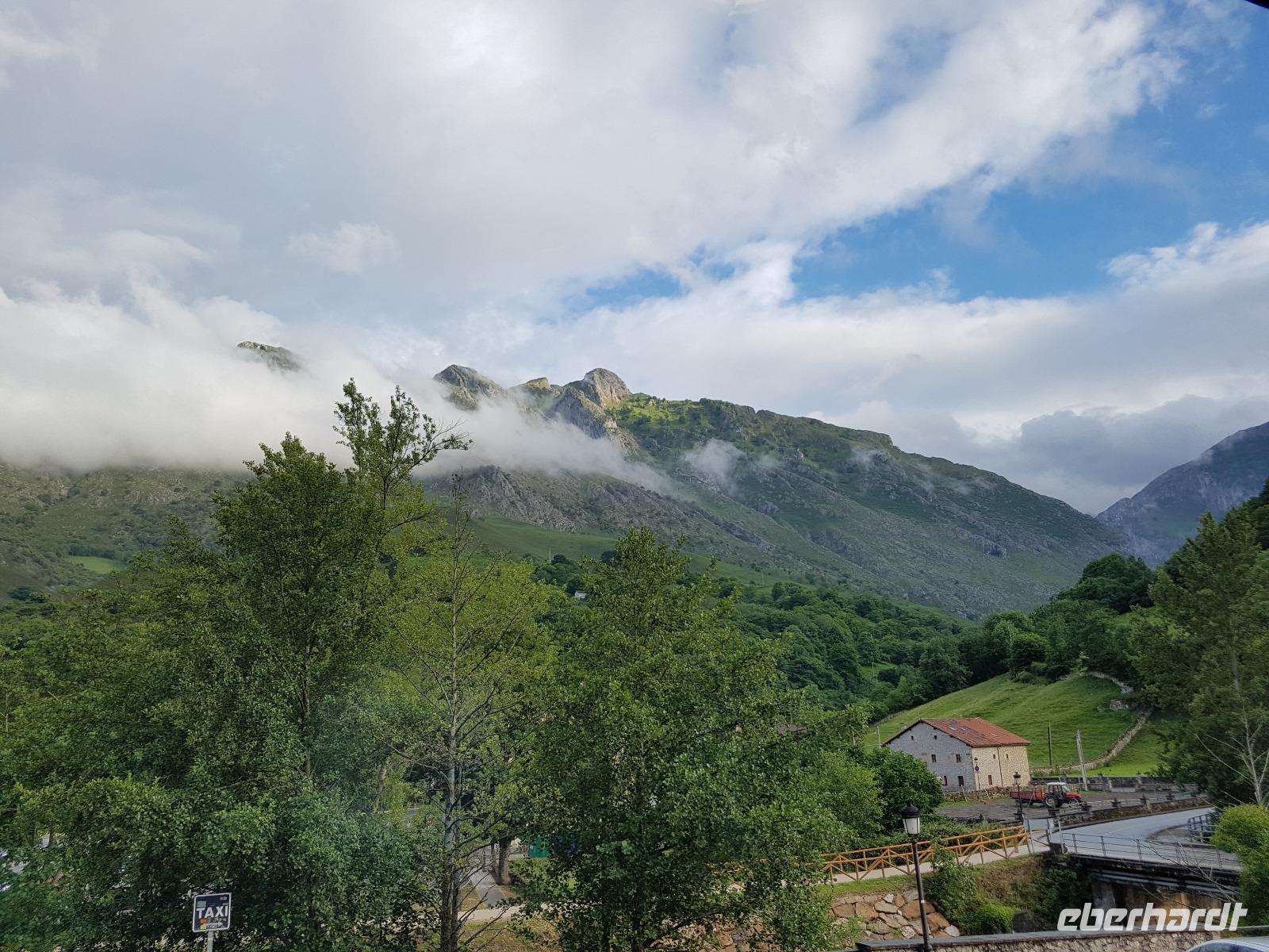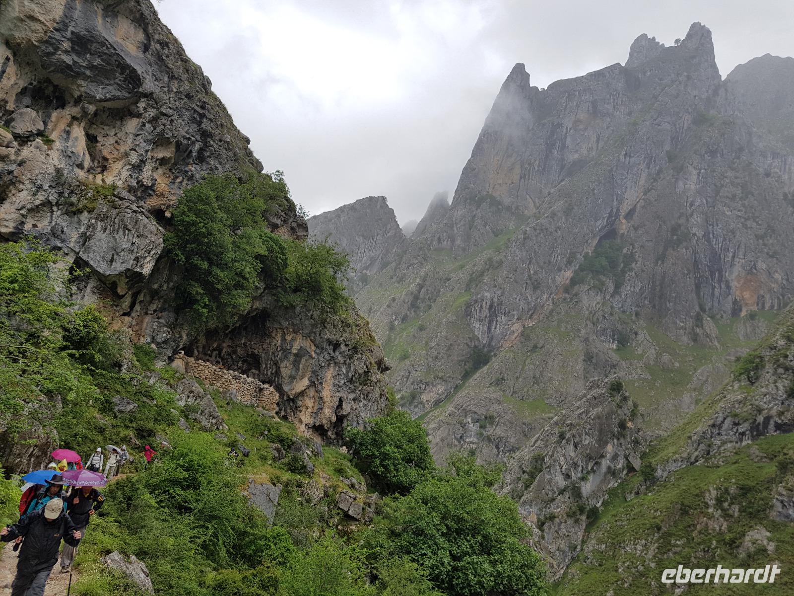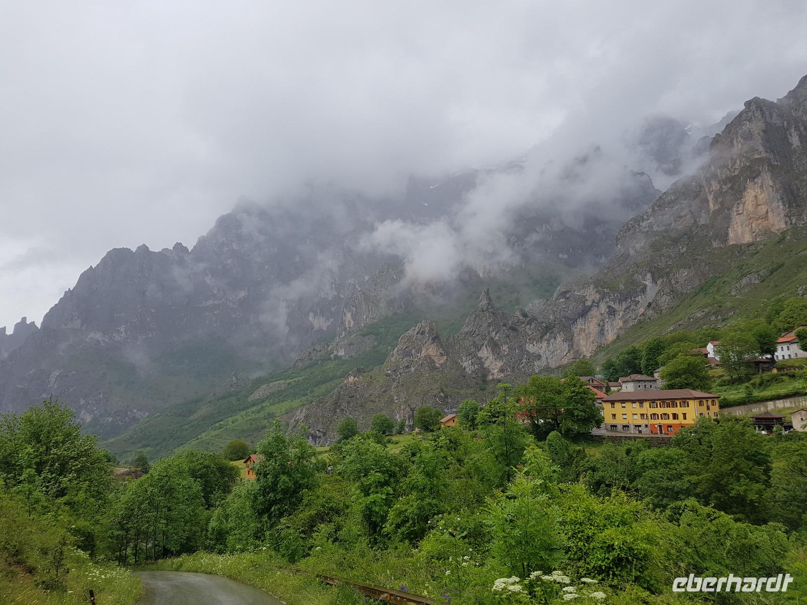 Heute fängt unsere Wanderreise mit einer ca. 12 Kilometer tollen und leichten Wanderung durch die atemberaubende Cares Schlucht an. Nach dem Frühstück schnürten wir uns zum ersten Mal unsere Wanderschuhe. Wir fuhren kurz bis Poncebos, die Tür des Nationalparks Picos de Europa und begannen hier, wie gesagt eine leichte Wanderung auf der Ruta del Cares, die uns bis Cain bringt. Die Ruta del Cares ist einer der bekanntesten Wanderwege zwischen Asturien und Leon und verläuft im mittleren und östlichen Teil des Picos de Europa. Während der Wanderung machten wir verschiedene Pausen, um die Landschaft zu genießen und heben die Picknick-Pause lieber für Cain auf, da es heute ein bisschen regnete. Uns gefällt die Natur hier inmitten einer der schönsten Schluchten Spaniens. Doch das Schönste kommt am Ende und wir lassen uns überraschen. Am Ende der Wanderung wartet auf uns eine warme Suppe in Cain und später mit fuhren wir mit zwei Taxen bis Posada de Valdeon, wo sich unser Hotel befindet. Für einige von uns waren die 12 Kilometer nicht genug und wir wanderten Berg auf noch 9 Kilometer von Cain bis Posada de Valdeon, mitten ins Tal und ins Herz des Nationalparks. Einfach herrlich! Wir dachten wir sind in den Alpen. Das sieht genauso aus, oder? Wunderschön! Wer hätte gedacht, dass solche Hochgipfel und Bergketten bis 2.648 Meter hoch hier in Nord-Spanien weit entfernt von den Pyrenäen liegen.