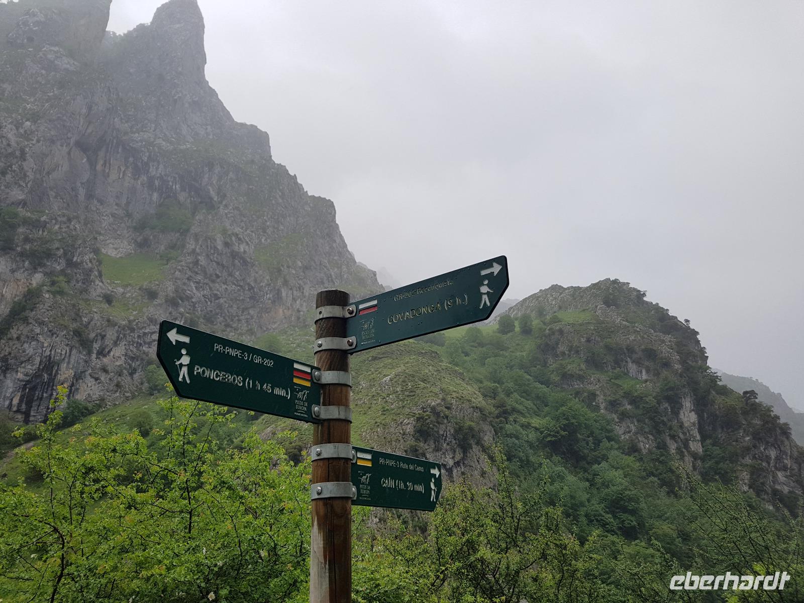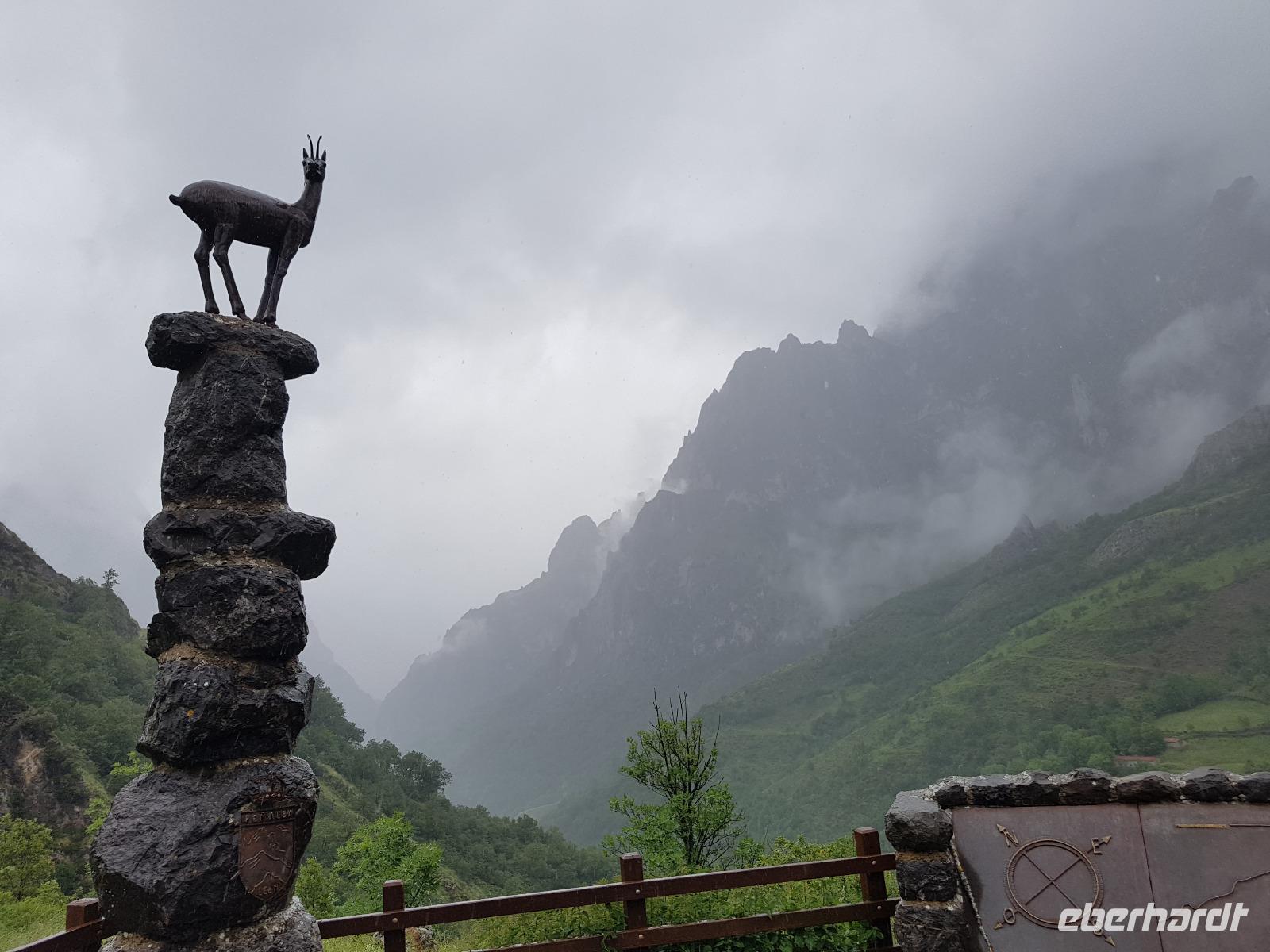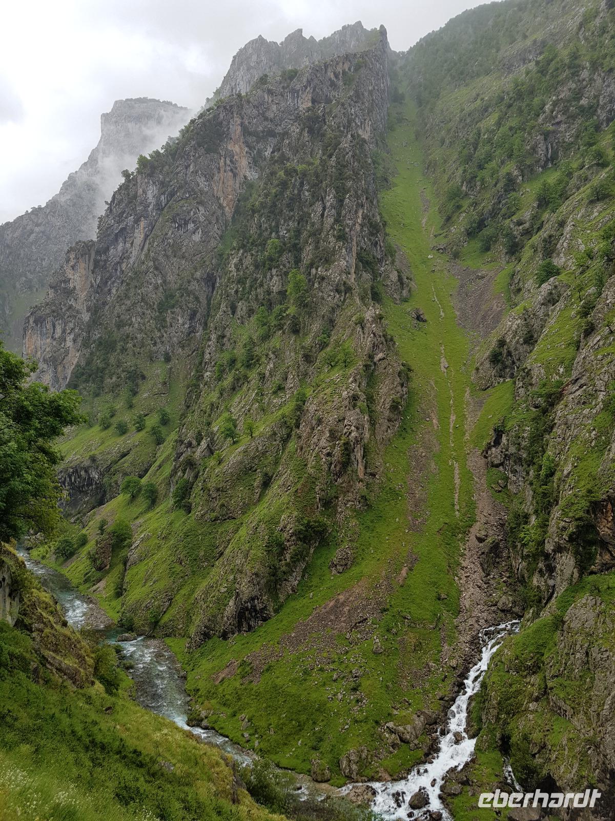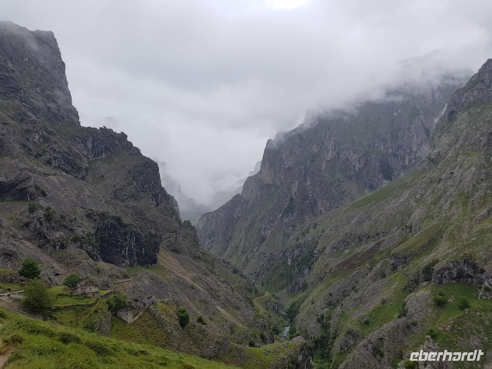 Heute fängt unsere Wanderreise mit einer ca. 12 Kilometer tollen und leichten Wanderung durch die atemberaubende Cares Schlucht an. Nach dem Frühstück schnürten wir uns zum ersten Mal unsere Wanderschuhe. Wir fuhren kurz bis Poncebos, die Tür des Nationalparks Picos de Europa und begannen hier, wie gesagt eine leichte Wanderung auf der Ruta del Cares, die uns bis Cain bringt. Die Ruta del Cares ist einer der bekanntesten Wanderwege zwischen Asturien und Leon und verläuft im mittleren und östlichen Teil des Picos de Europa. Während der Wanderung machten wir verschiedene Pausen, um die Landschaft zu genießen und heben die Picknick-Pause lieber für Cain auf, da es heute ein bisschen regnete. Uns gefällt die Natur hier inmitten einer der schönsten Schluchten Spaniens. Doch das Schönste kommt am Ende und wir lassen uns überraschen. Am Ende der Wanderung wartet auf uns eine warme Suppe in Cain und später mit fuhren wir mit zwei Taxen bis Posada de Valdeon, wo sich unser Hotel befindet. Für einige von uns waren die 12 Kilometer nicht genug und wir wanderten Berg auf noch 9 Kilometer von Cain bis Posada de Valdeon, mitten ins Tal und ins Herz des Nationalparks. Einfach herrlich! Wir dachten wir sind in den Alpen. Das sieht genauso aus, oder? Wunderschön! Wer hätte gedacht, dass solche Hochgipfel und Bergketten bis 2.648 Meter hoch hier in Nord-Spanien weit entfernt von den Pyrenäen liegen.