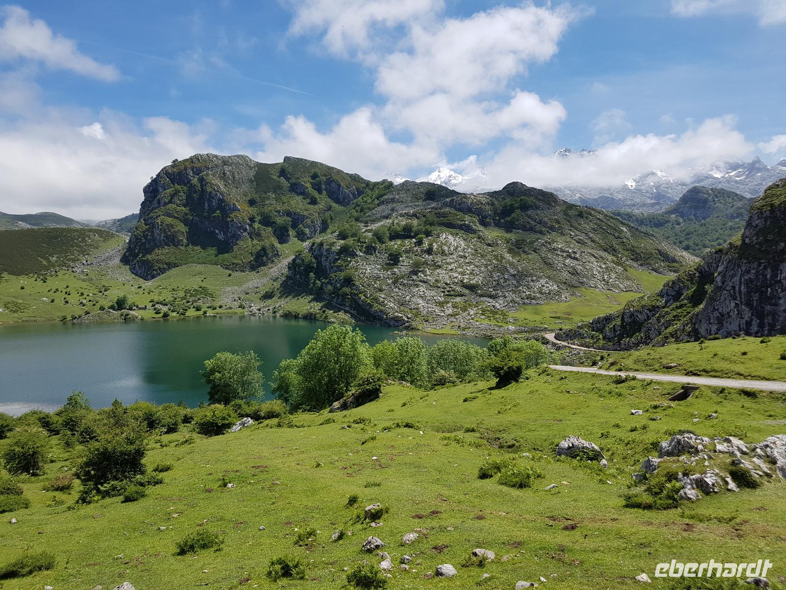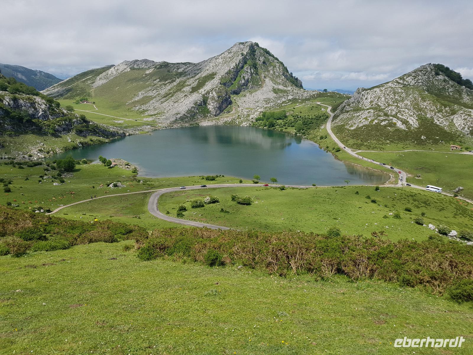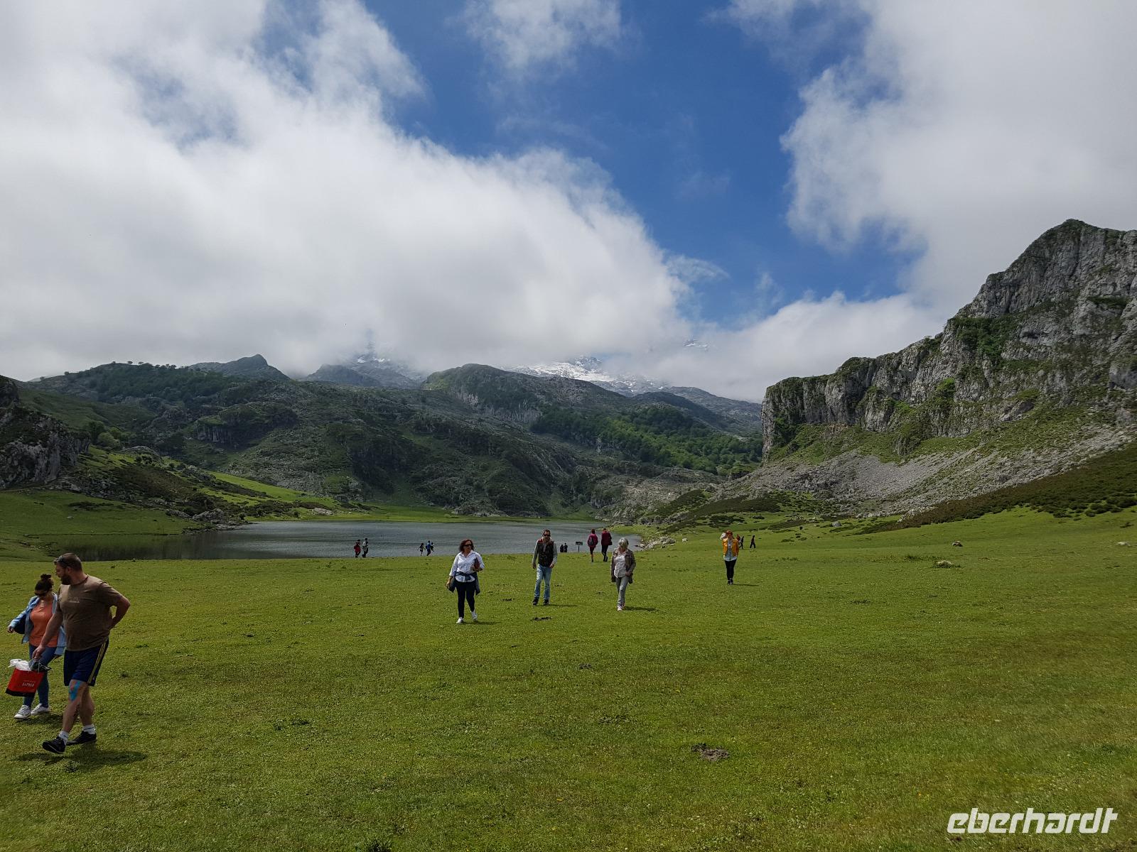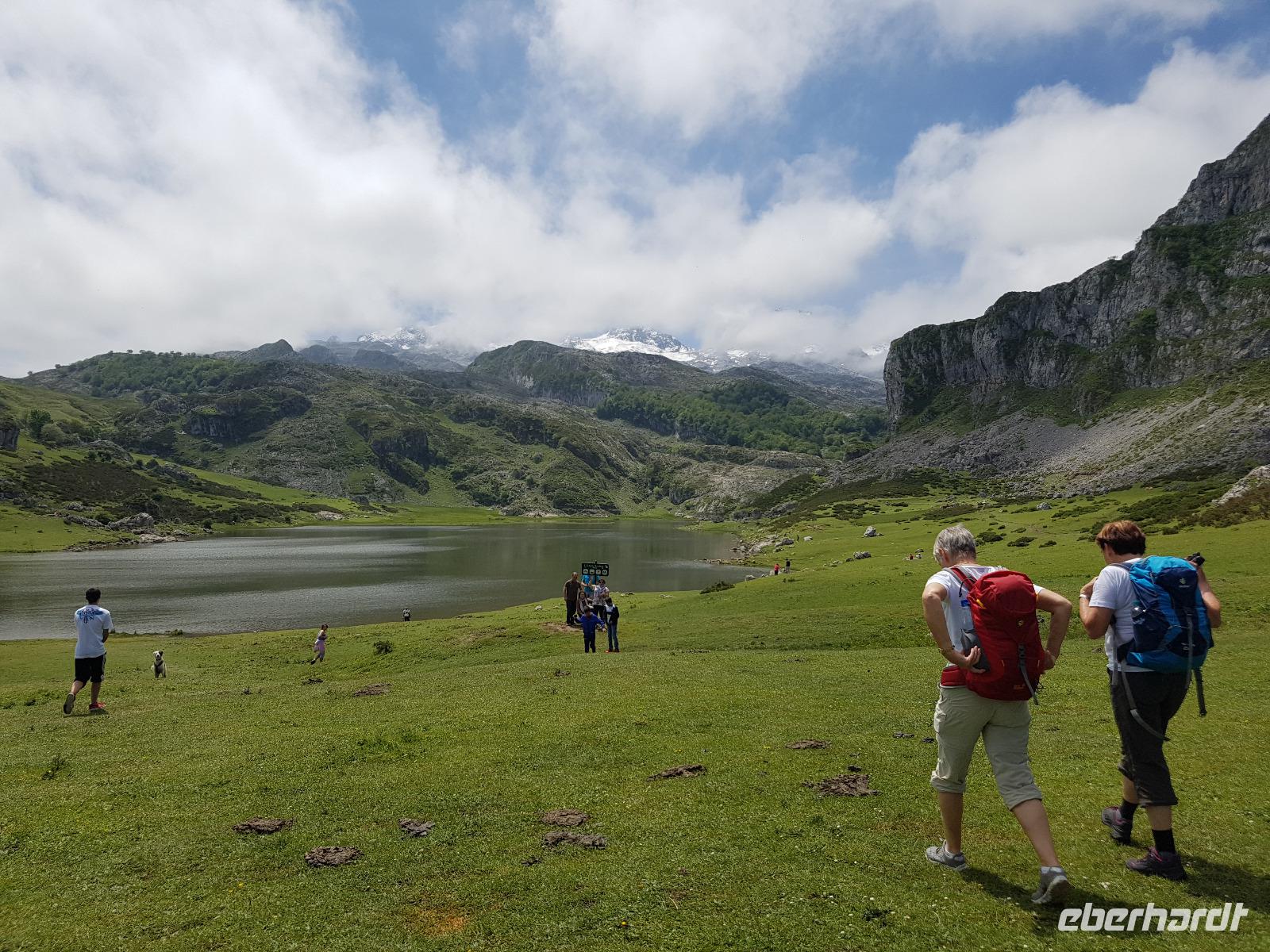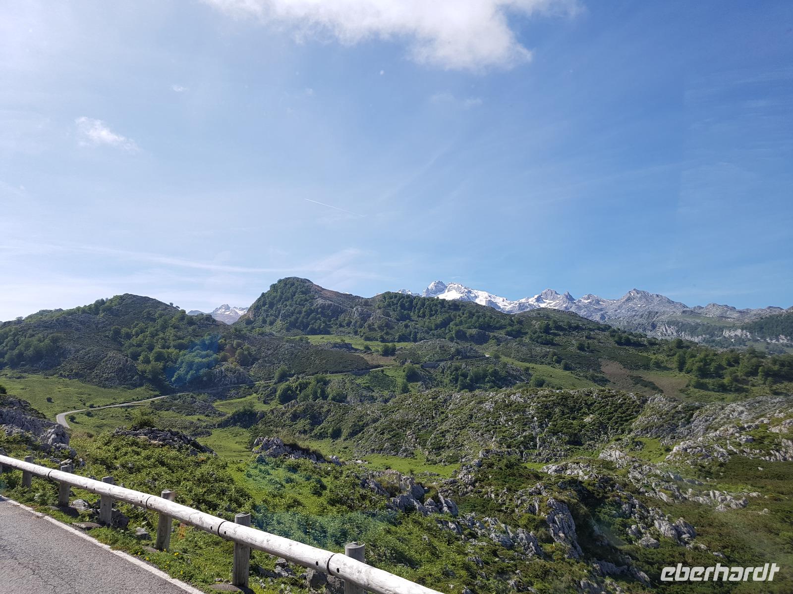 Nach dem Frühstück verlassen wir das kantabrische Tal des Picos de Europa und fuhren über eine serpentinenreiche Panoramastraße bis zu den Gletscher-Seen von Covadonga. Berühmt sind die auch durch den Radsport, da diese Straße hinauf zu den Lagos de Covadonga zu den berühmtesten Anstiegen der Vuelta a Espana führt. Dieser Anstieg von rund 200 auf 1.110 Meter Höhe beträgt durchschnittlich 6,3% und maximal 13%! Aber keine Sorge: wir bewältigten diese Strecke mit Ruben, unserem Busfahrer. Oben angekommen machten wir gemeinsam eine idyllische, kleine, leichte Wanderung von fünf Kilometern um die beiden Gebirgsseen von Covadonga: Lago Enol und Lago Ercina. Uns hat es sehr gut gefallen. Das Wetter war heute prima und über die grüne Wiese mit Kühen hatten wir sogar hier wieder Blick auf die voll mit Schnee bedeckten Gipfel des Picos de Europa.