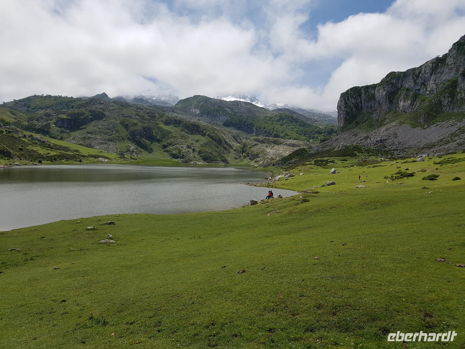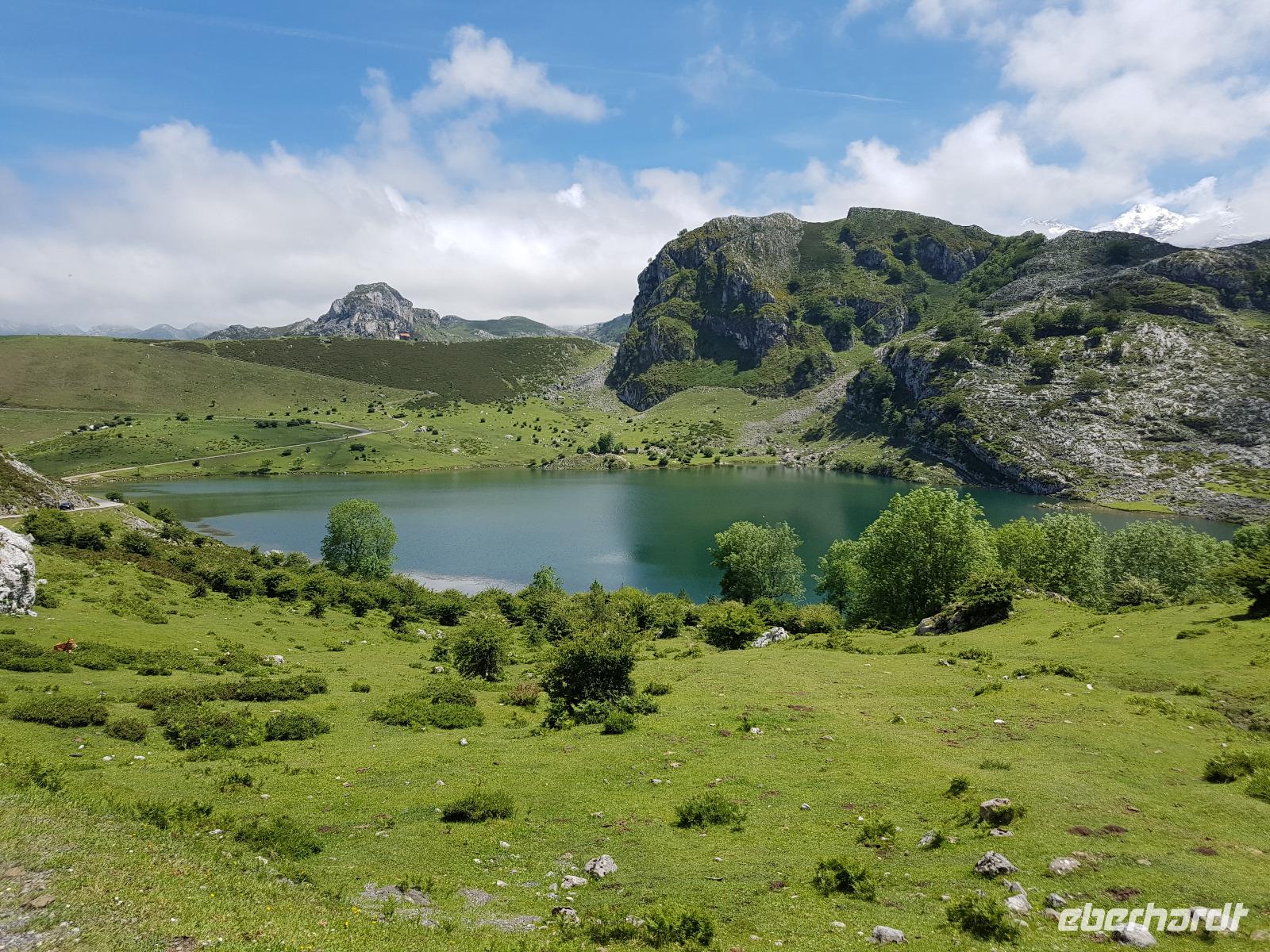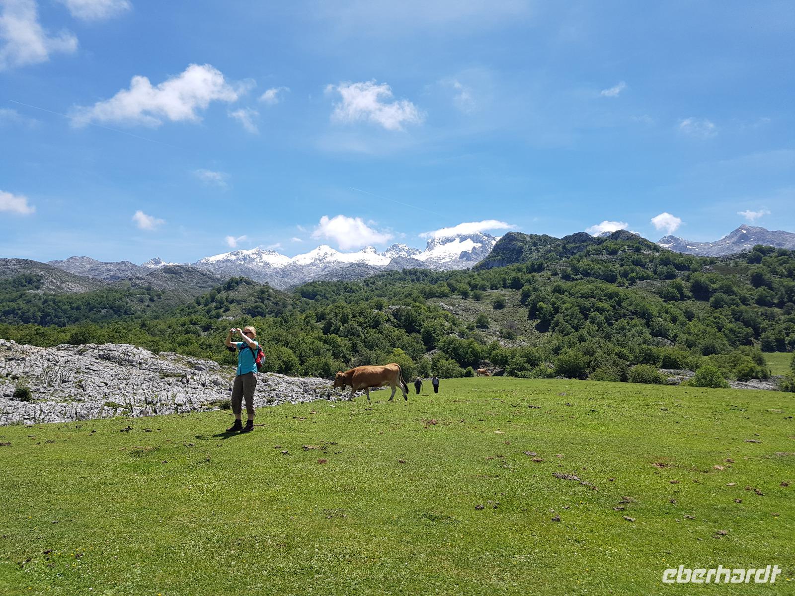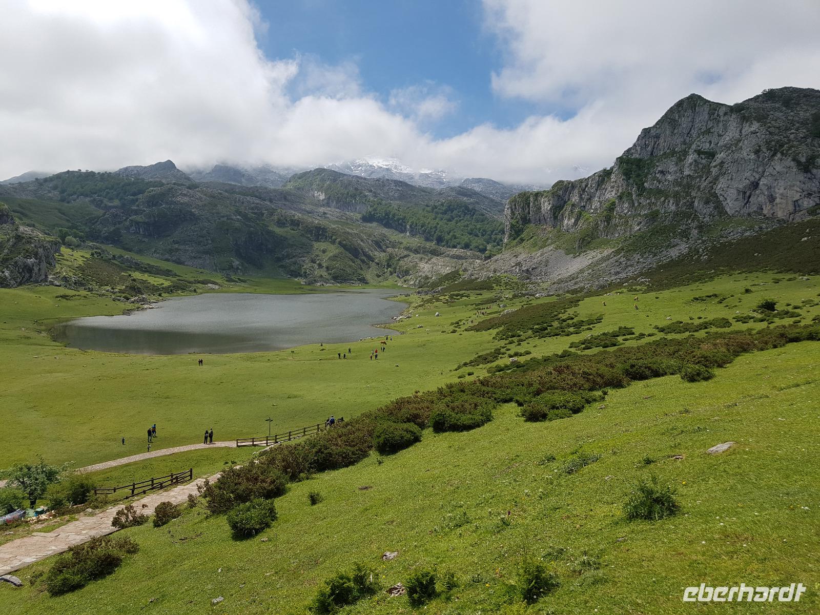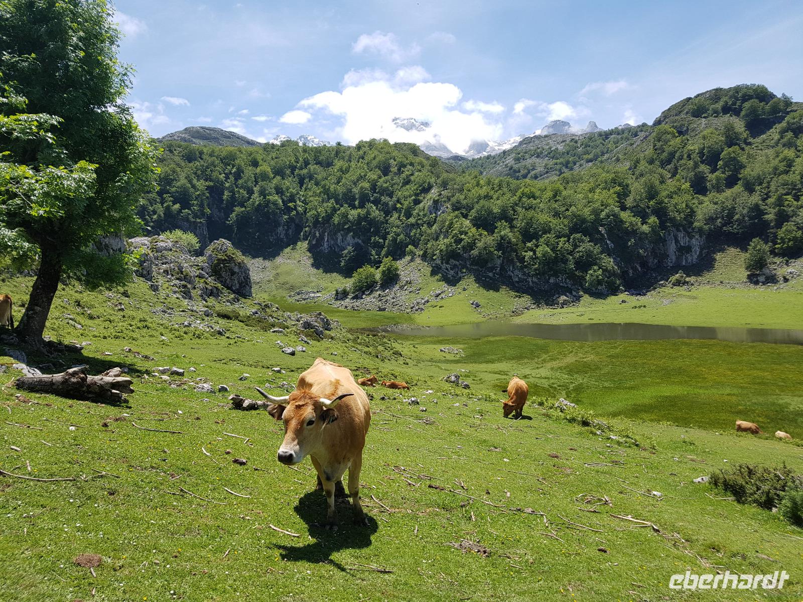 Nach dem Frühstück verlassen wir das kantabrische Tal des Picos de Europa und fuhren über eine serpentinenreiche Panoramastraße bis zu den Gletscher-Seen von Covadonga. Berühmt sind die auch durch den Radsport, da diese Straße hinauf zu den Lagos de Covadonga zu den berühmtesten Anstiegen der Vuelta a Espana führt. Dieser Anstieg von rund 200 auf 1.110 Meter Höhe beträgt durchschnittlich 6,3% und maximal 13%! Aber keine Sorge: wir bewältigten diese Strecke mit Ruben, unserem Busfahrer. Oben angekommen machten wir gemeinsam eine idyllische, kleine, leichte Wanderung von fünf Kilometern um die beiden Gebirgsseen von Covadonga: Lago Enol und Lago Ercina. Uns hat es sehr gut gefallen. Das Wetter war heute prima und über die grüne Wiese mit Kühen hatten wir sogar hier wieder Blick auf die voll mit Schnee bedeckten Gipfel des Picos de Europa.
