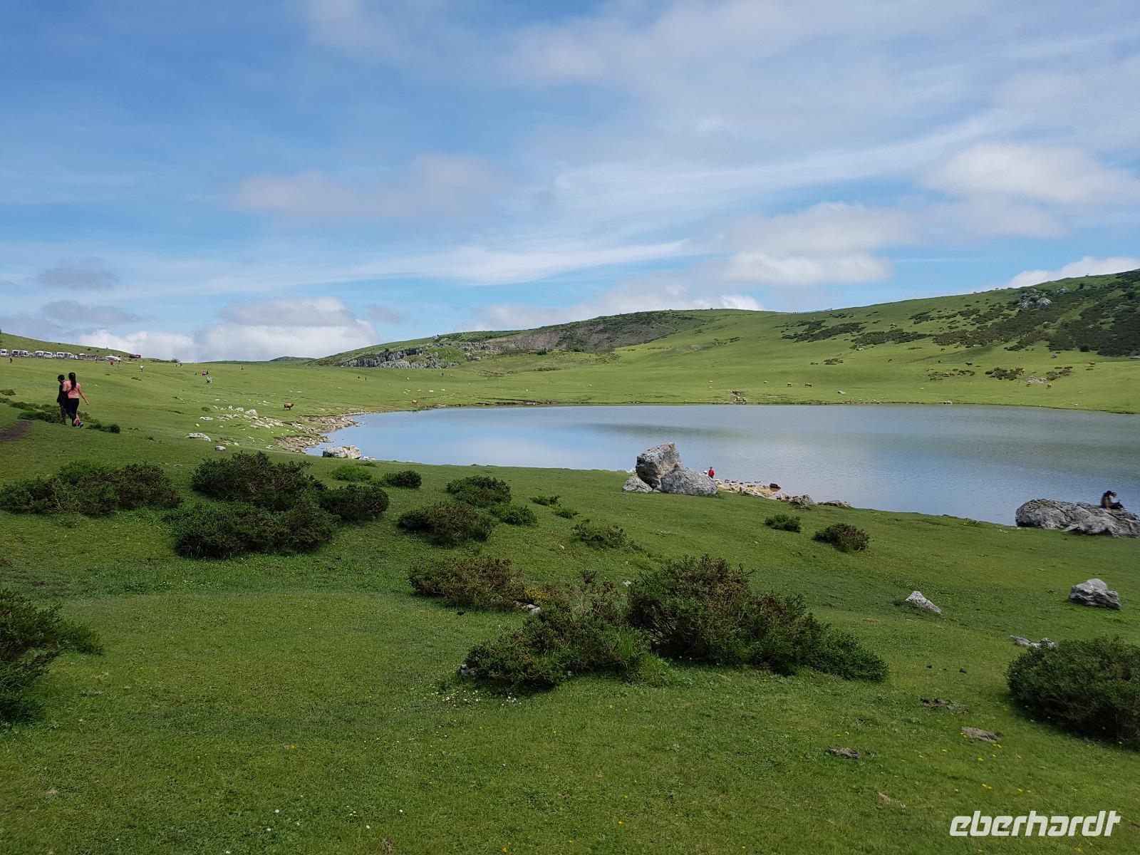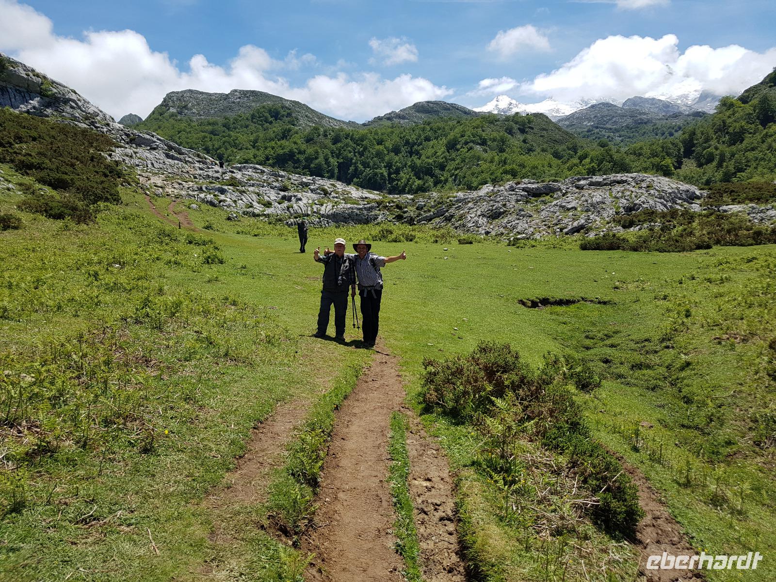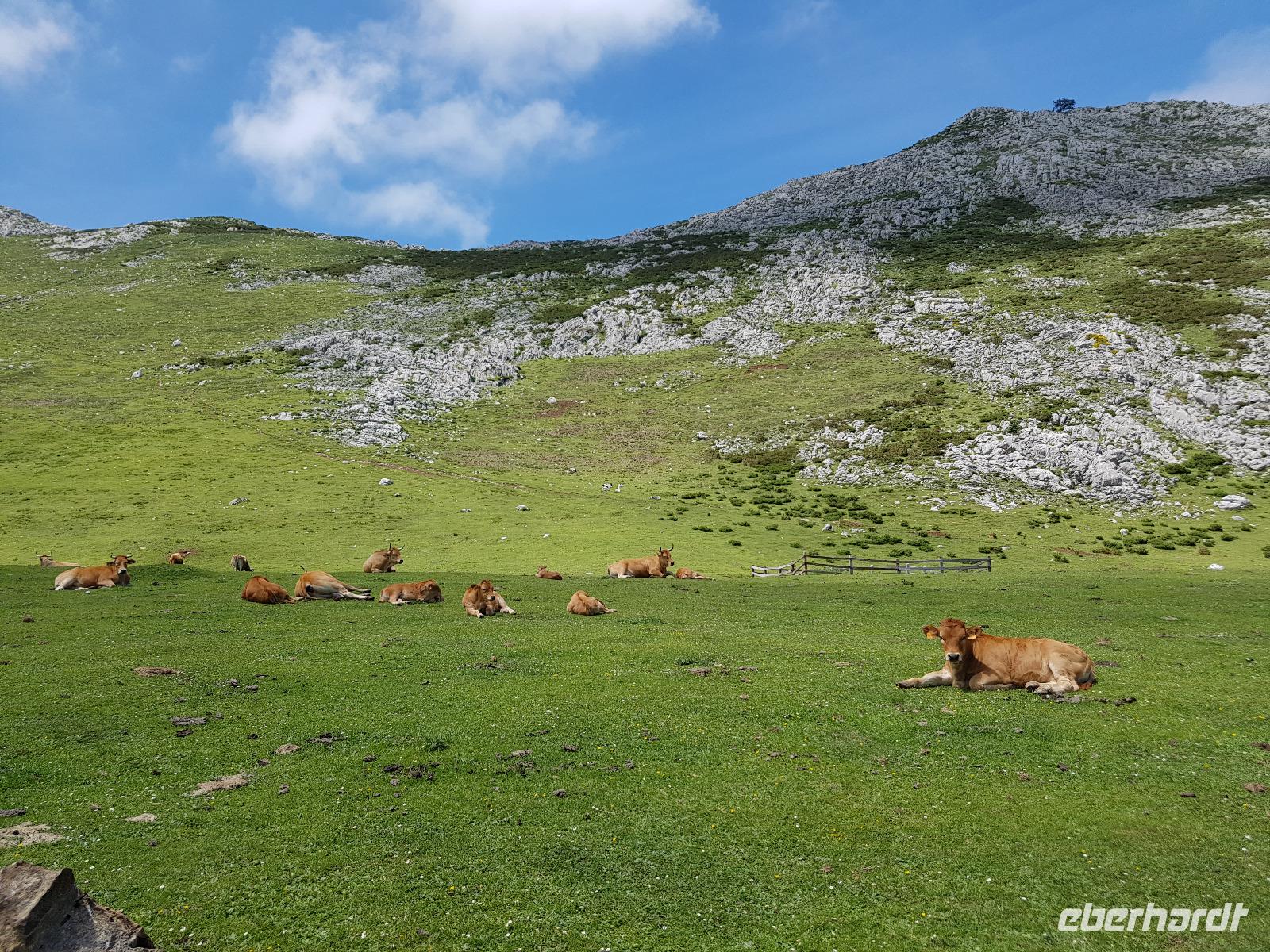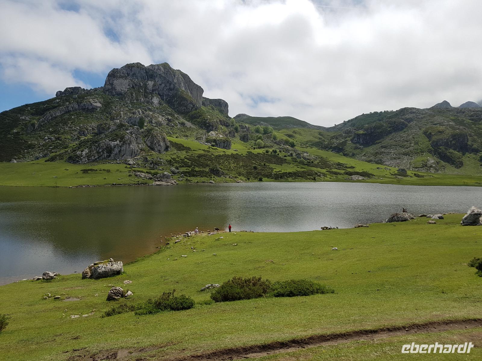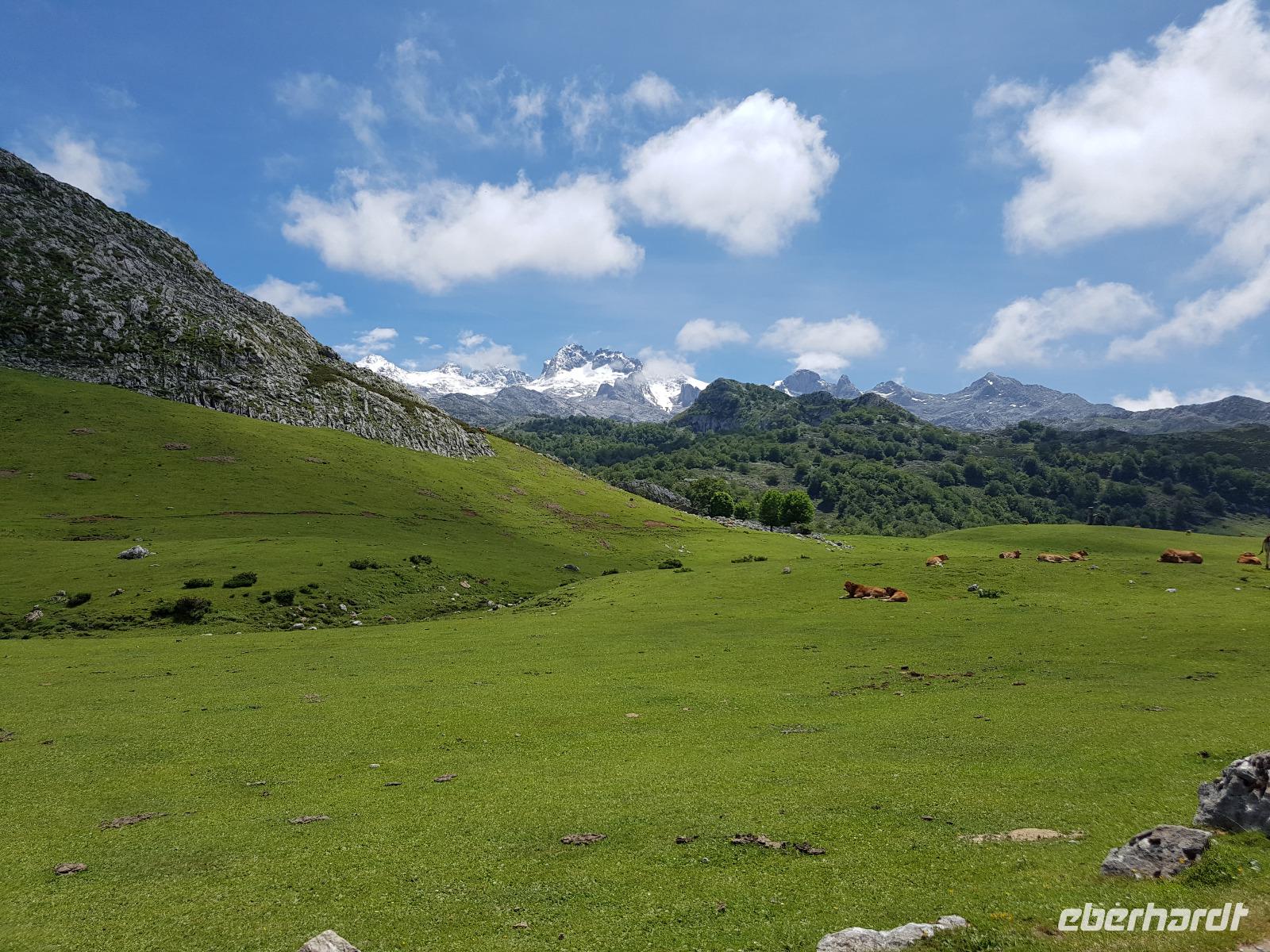 Nach dem Frühstück verlassen wir das kantabrische Tal des Picos de Europa und fuhren über eine serpentinenreiche Panoramastraße bis zu den Gletscher-Seen von Covadonga. Berühmt sind die auch durch den Radsport, da diese Straße hinauf zu den Lagos de Covadonga zu den berühmtesten Anstiegen der Vuelta a Espana führt. Dieser Anstieg von rund 200 auf 1.110 Meter Höhe beträgt durchschnittlich 6,3% und maximal 13%! Aber keine Sorge: wir bewältigten diese Strecke mit Ruben, unserem Busfahrer. Oben angekommen machten wir gemeinsam eine idyllische, kleine, leichte Wanderung von fünf Kilometern um die beiden Gebirgsseen von Covadonga: Lago Enol und Lago Ercina. Uns hat es sehr gut gefallen. Das Wetter war heute prima und über die grüne Wiese mit Kühen hatten wir sogar hier wieder Blick auf die voll mit Schnee bedeckten Gipfel des Picos de Europa.