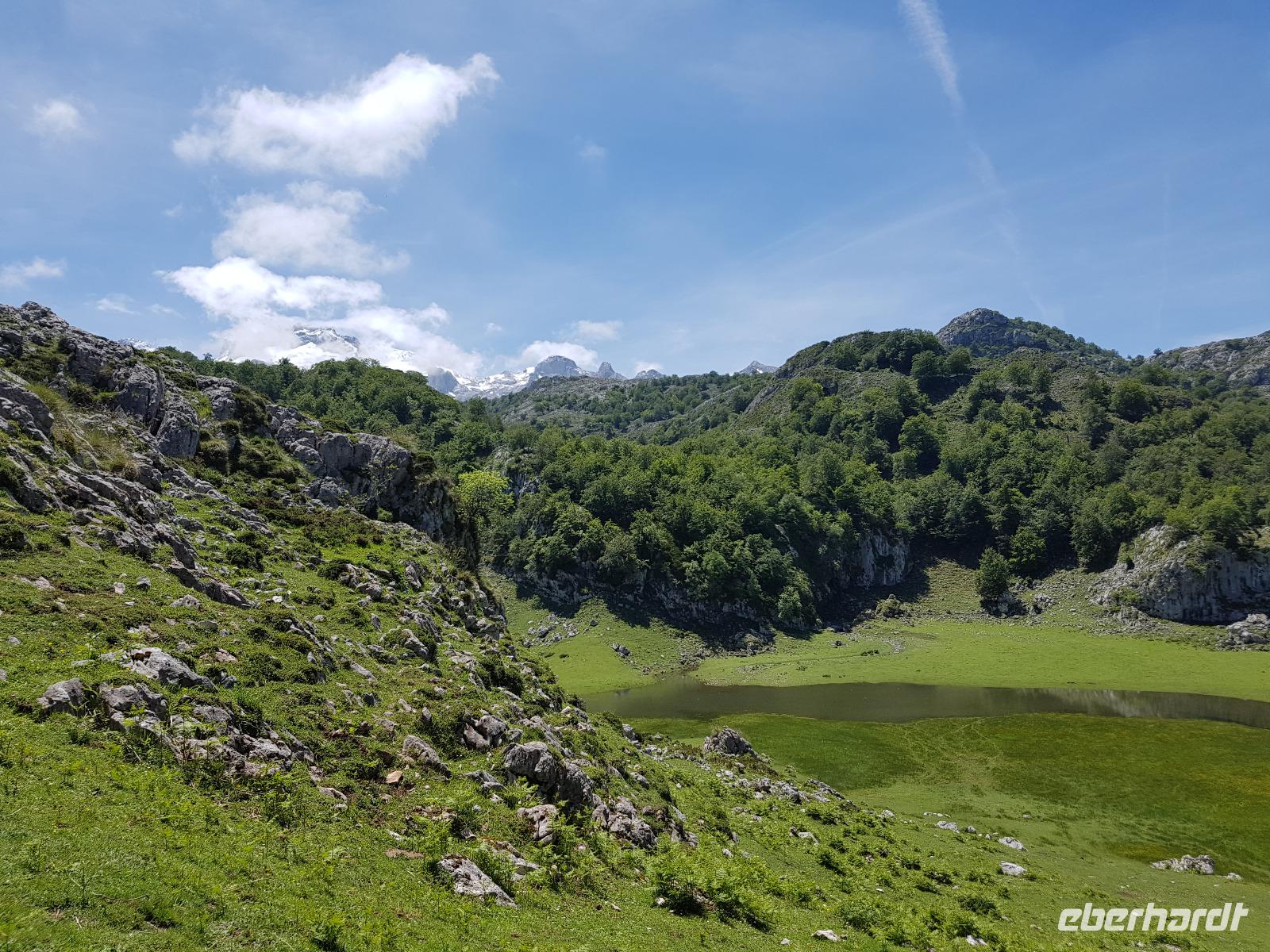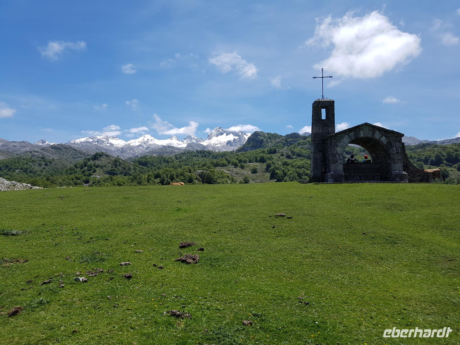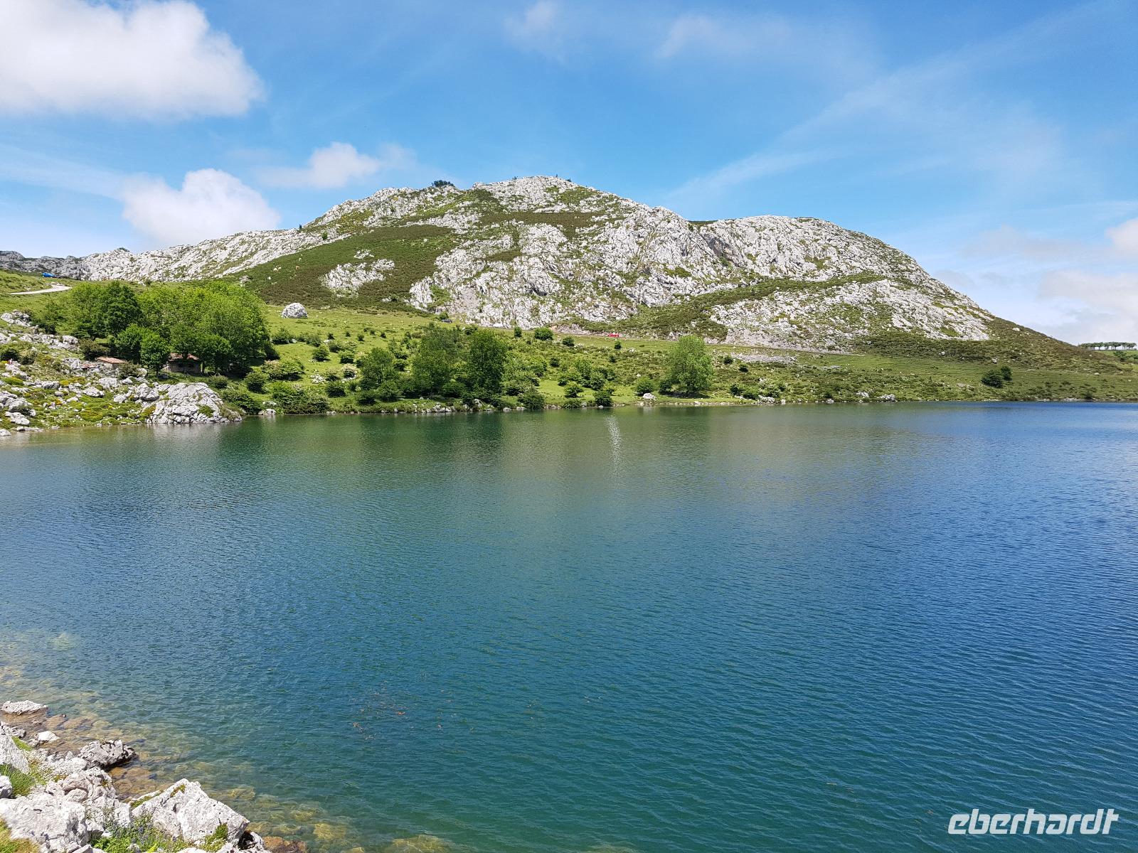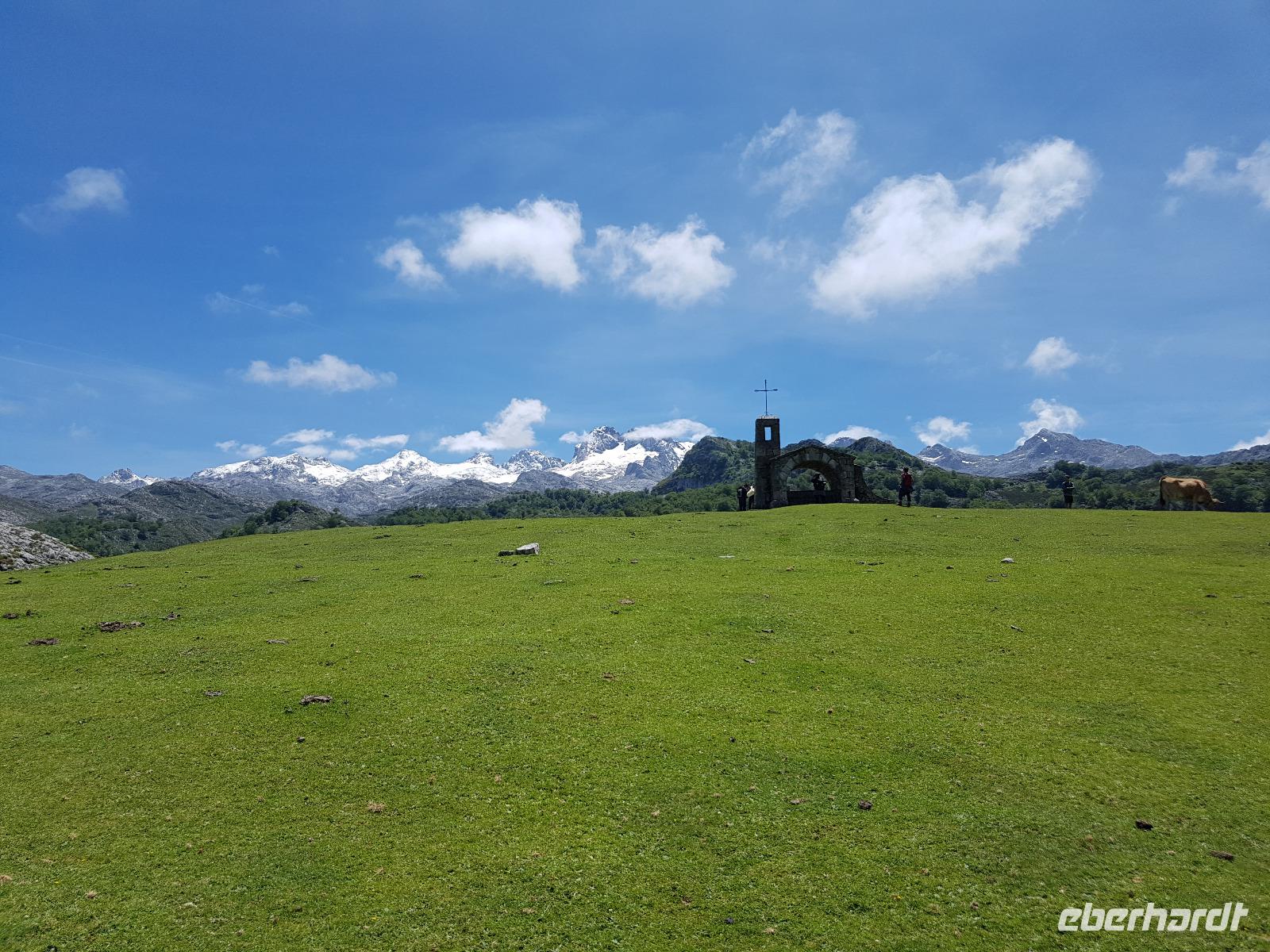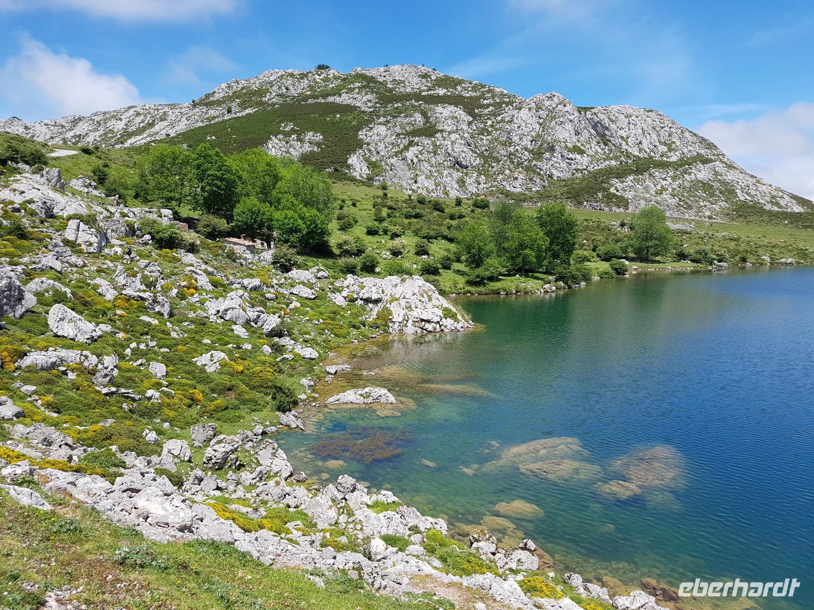 Nach dem Frühstück verlassen wir das kantabrische Tal des Picos de Europa und fuhren über eine serpentinenreiche Panoramastraße bis zu den Gletscher-Seen von Covadonga. Berühmt sind die auch durch den Radsport, da diese Straße hinauf zu den Lagos de Covadonga zu den berühmtesten Anstiegen der Vuelta a Espana führt. Dieser Anstieg von rund 200 auf 1.110 Meter Höhe beträgt durchschnittlich 6,3% und maximal 13%! Aber keine Sorge: wir bewältigten diese Strecke mit Ruben, unserem Busfahrer. Oben angekommen machten wir gemeinsam eine idyllische, kleine, leichte Wanderung von fünf Kilometern um die beiden Gebirgsseen von Covadonga: Lago Enol und Lago Ercina. Uns hat es sehr gut gefallen. Das Wetter war heute prima und über die grüne Wiese mit Kühen hatten wir sogar hier wieder Blick auf die voll mit Schnee bedeckten Gipfel des Picos de Europa.