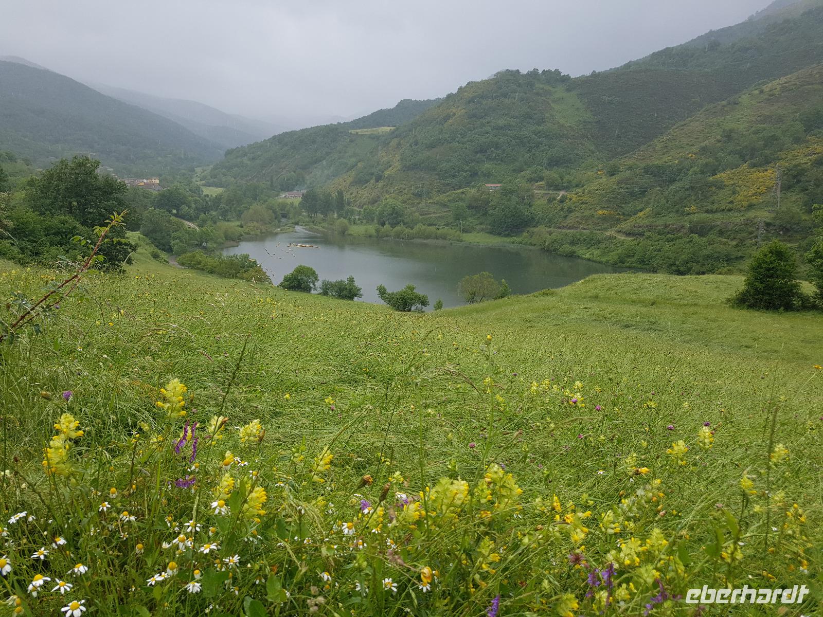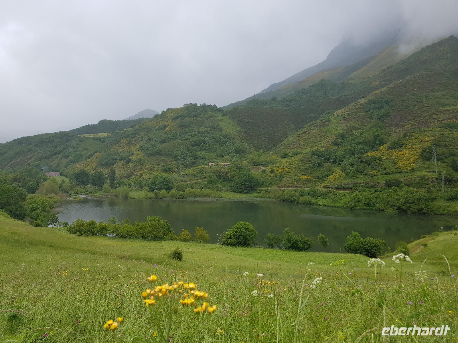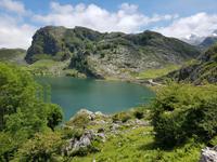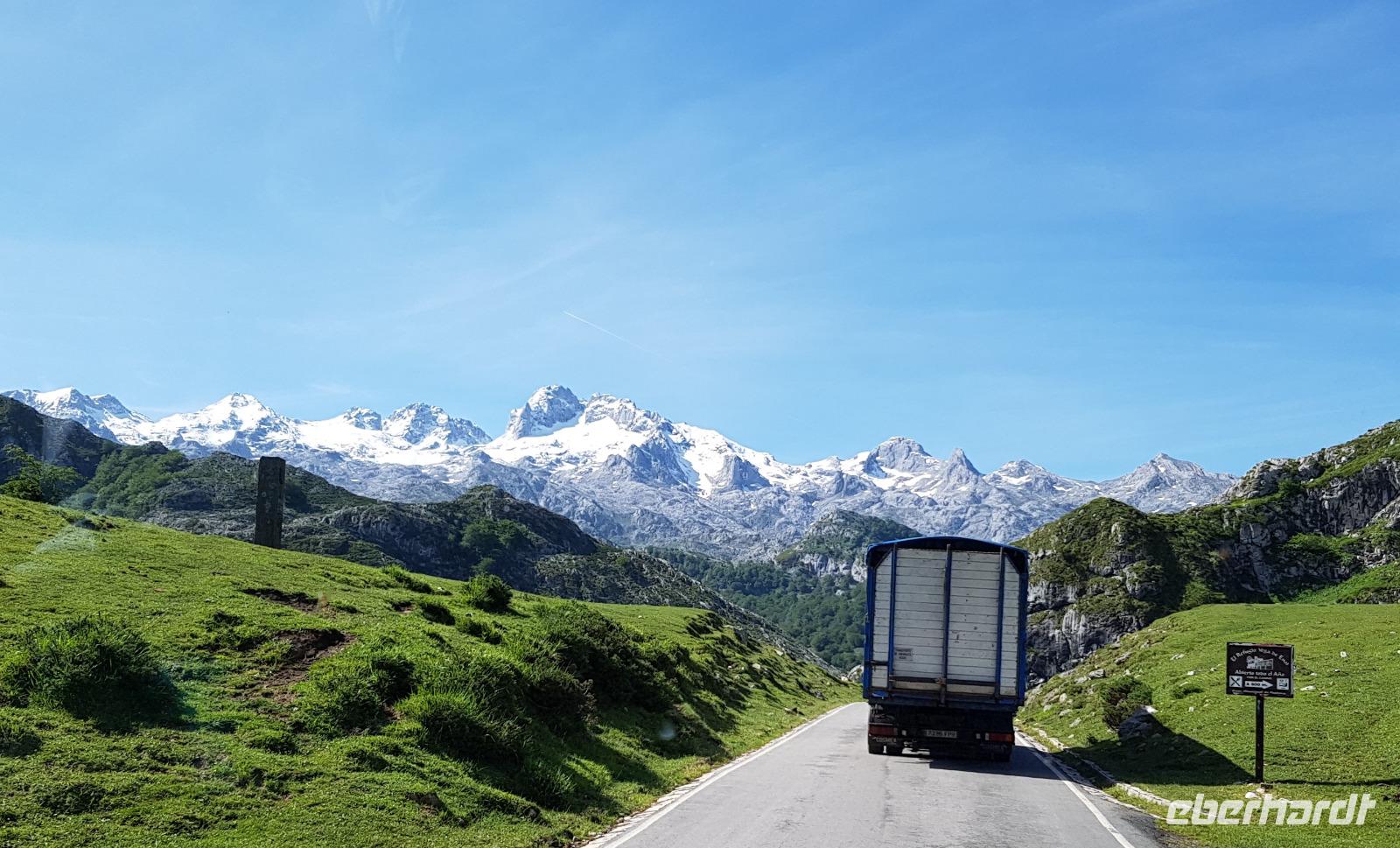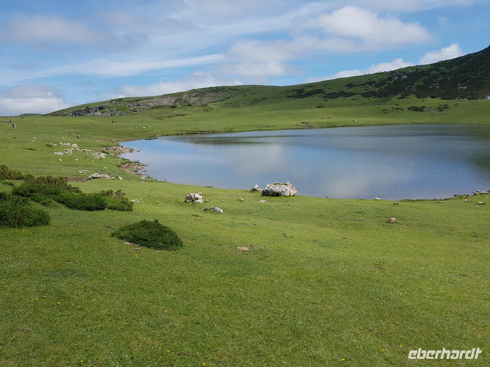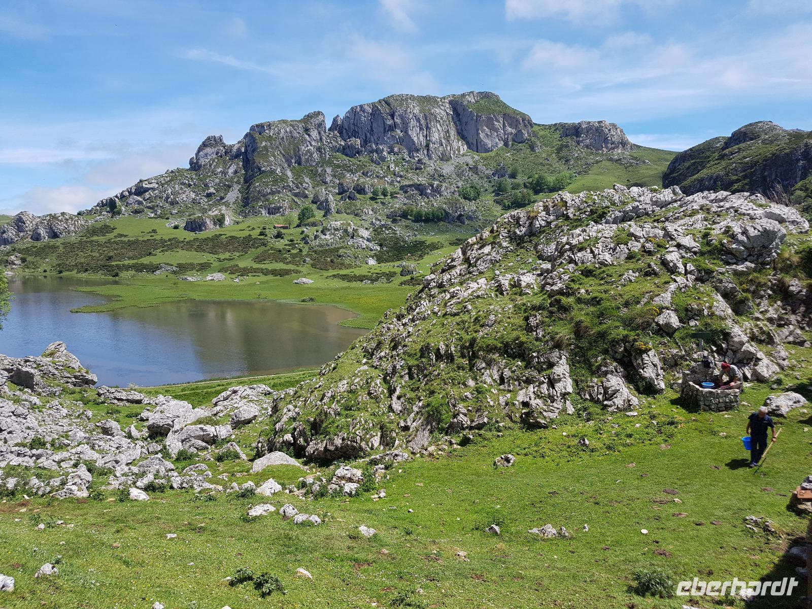 Nach dem Frühstück verlassen wir das kantabrische Tal des Picos de Europa und fuhren über eine serpentinenreiche Panoramastraße bis zu den Gletscher-Seen von Covadonga. Berühmt sind die auch durch den Radsport, da diese Straße hinauf zu den Lagos de Covadonga zu den berühmtesten Anstiegen der Vuelta a Espana führt. Dieser Anstieg von rund 200 auf 1.110 Meter Höhe beträgt durchschnittlich 6,3% und maximal 13%! Aber keine Sorge: wir bewältigten diese Strecke mit Ruben, unserem Busfahrer. Oben angekommen machten wir gemeinsam eine idyllische, kleine, leichte Wanderung von fünf Kilometern um die beiden Gebirgsseen von Covadonga: Lago Enol und Lago Ercina. Uns hat es sehr gut gefallen. Das Wetter war heute prima und über die grüne Wiese mit Kühen hatten wir sogar hier wieder Blick auf die voll mit Schnee bedeckten Gipfel des Picos de Europa.