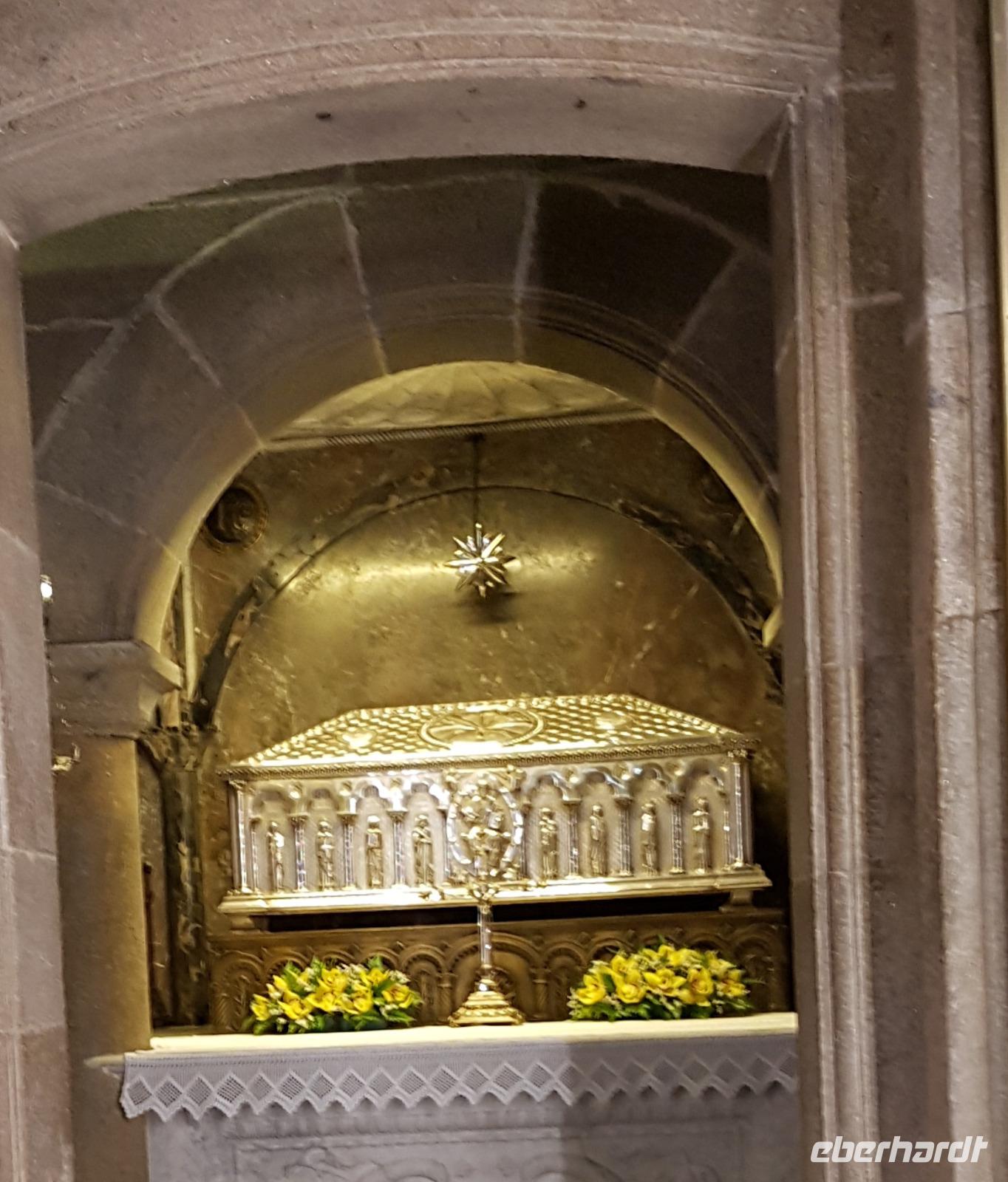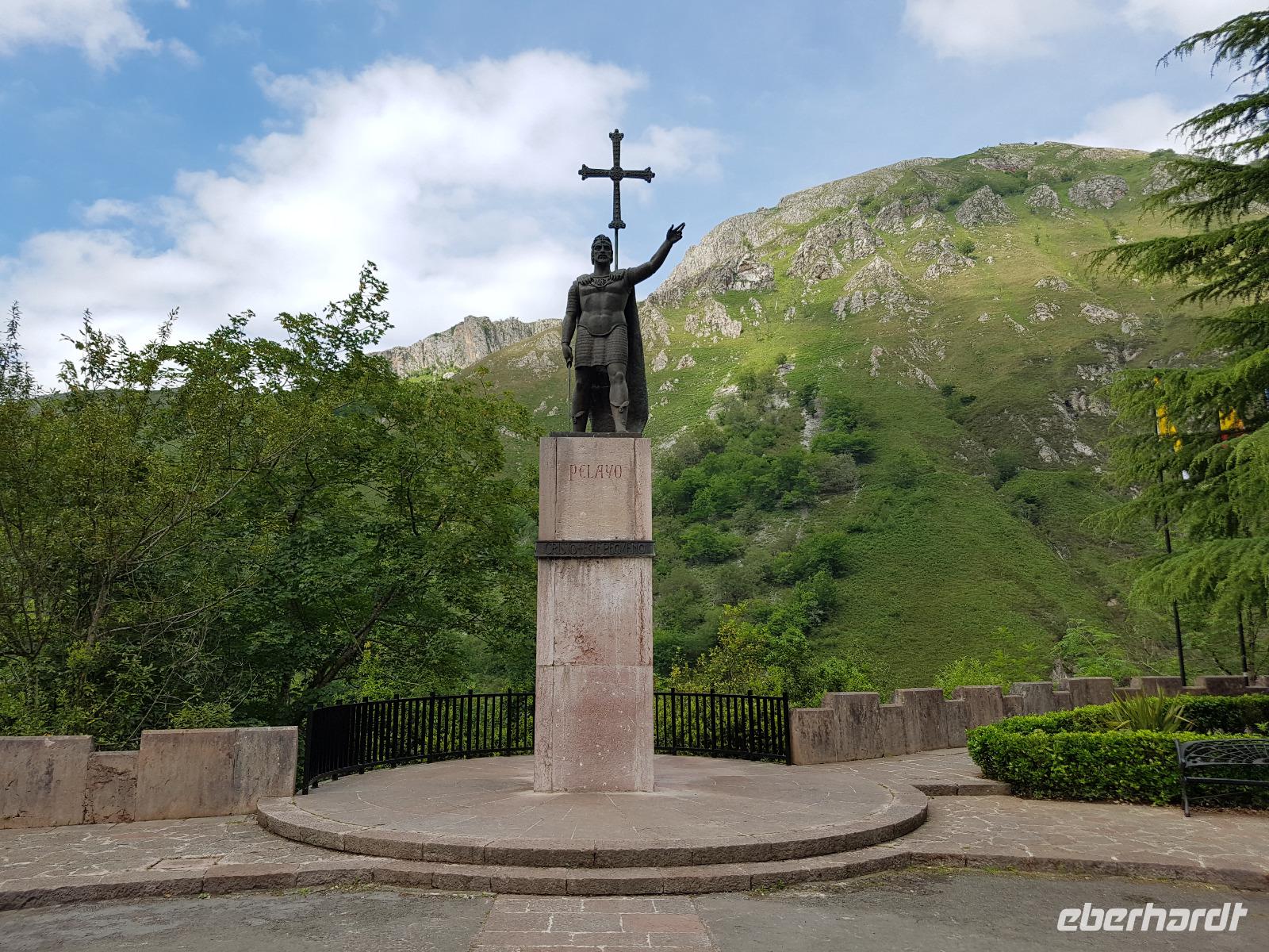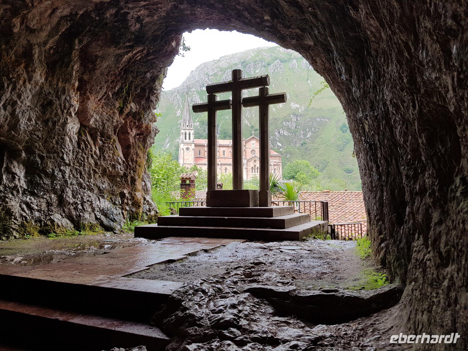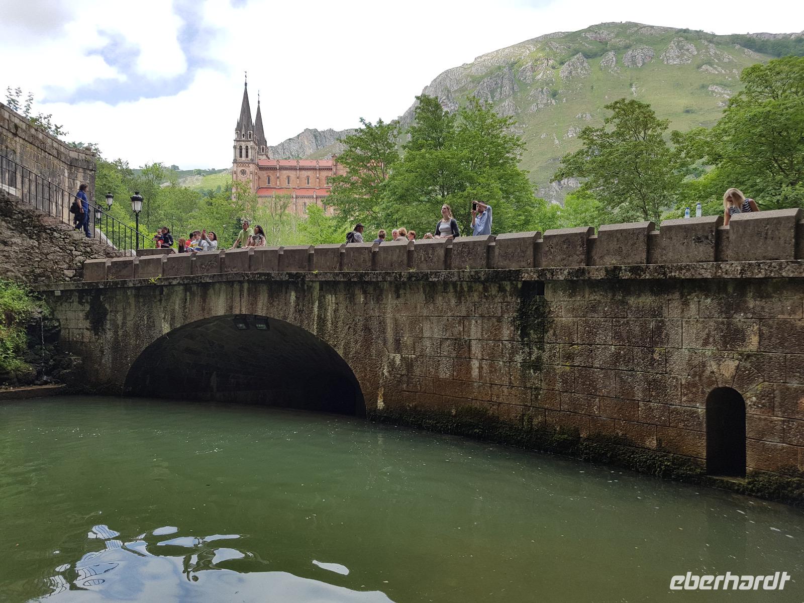 Nach der Wanderung fuhren wir wieder herunter bis zum Wallfahrtsort von Covadonga, wo die große Basilika und eine kleine Kapelle in die Felsen gebaut sind. Hier fanden wir auch andere Pilger, da hier auch eine Station an der Küsten-Nordvariante des spanischen Jakobswegs ist. Berühmt ist Covadonga, da 711 genau hier in diesem Gebirge die Reconquista (Wiedereroberung der Christen) mit der Schlacht von Covadonga, die erst 1492 im andalusischen Granada beendet war, begann. An der Madonna konnte Benjamin zwei Lieder Singen und eine Kerze für uns alle anzünden damit unsere Reise weiter gut läuft.