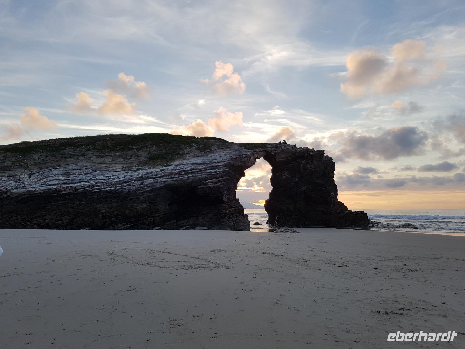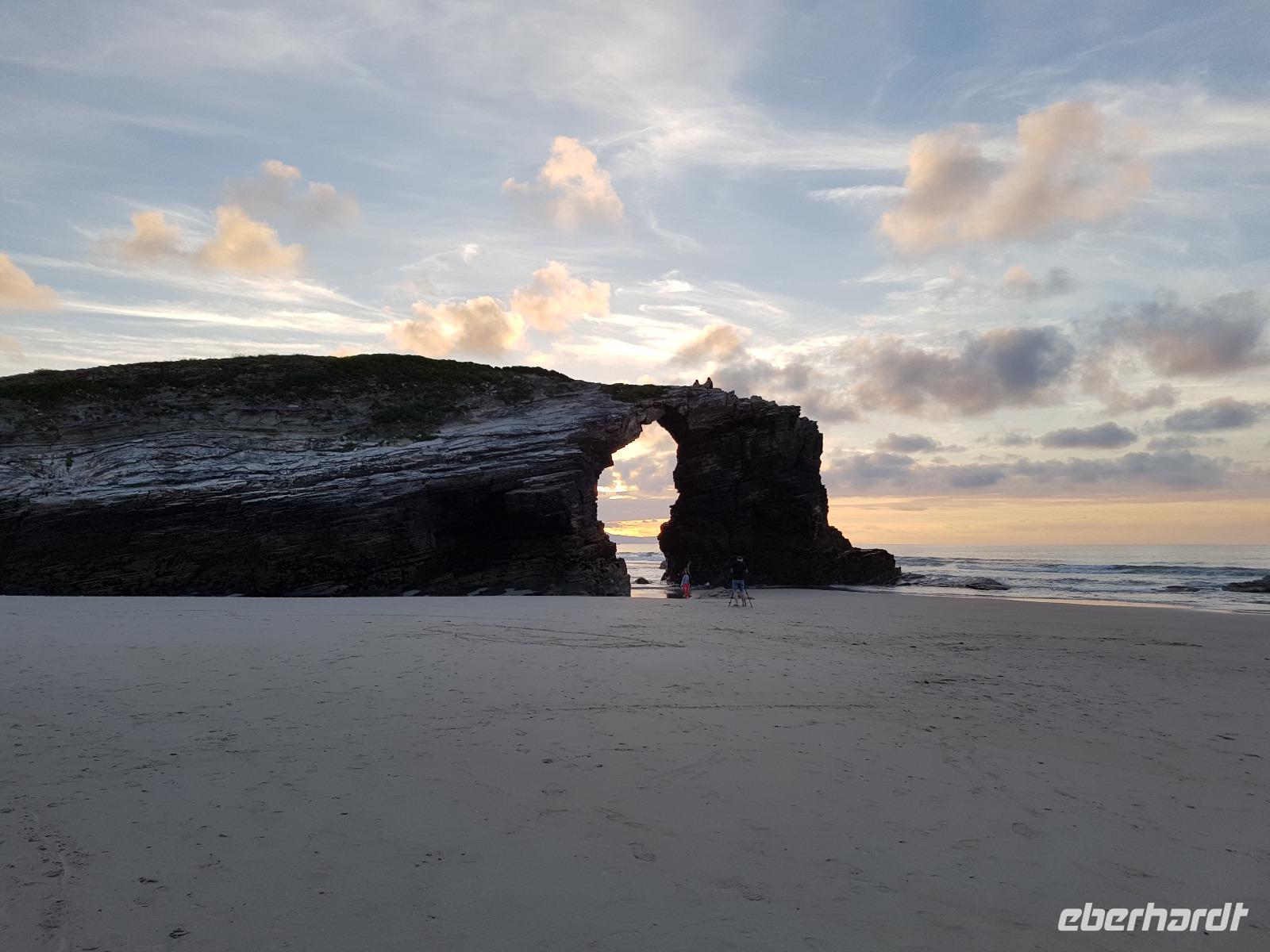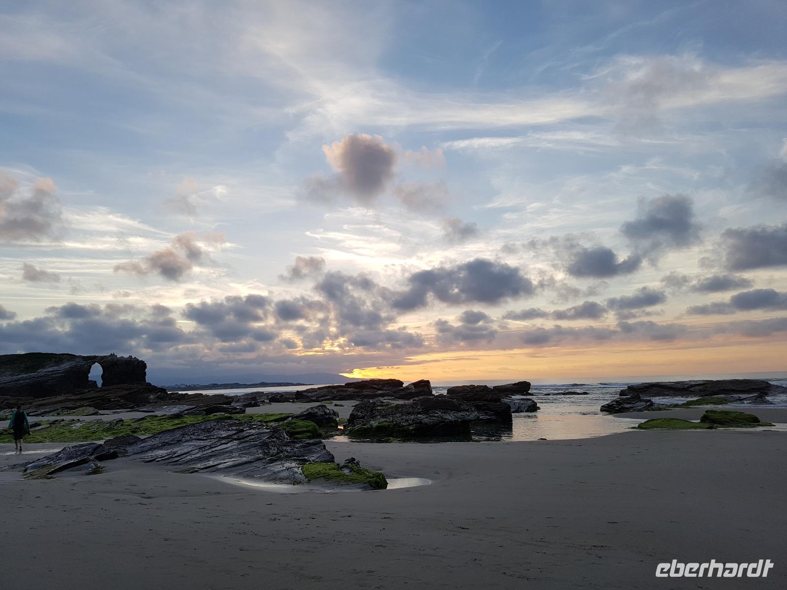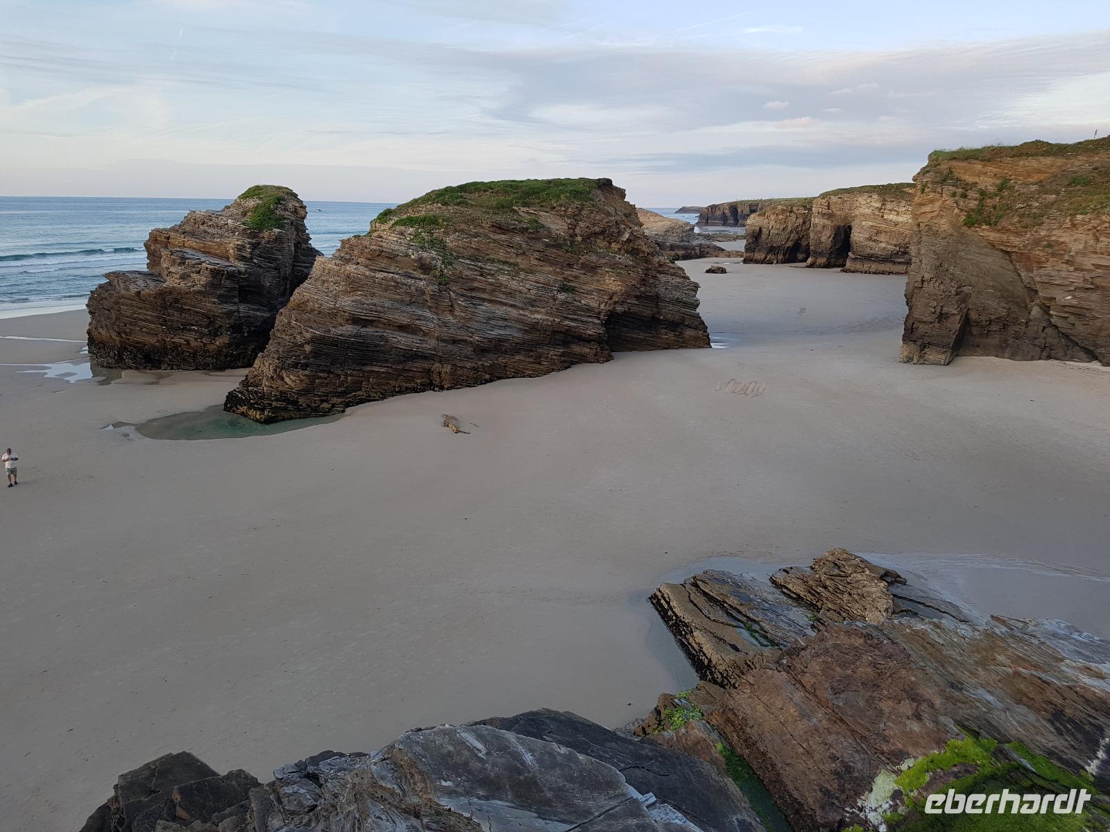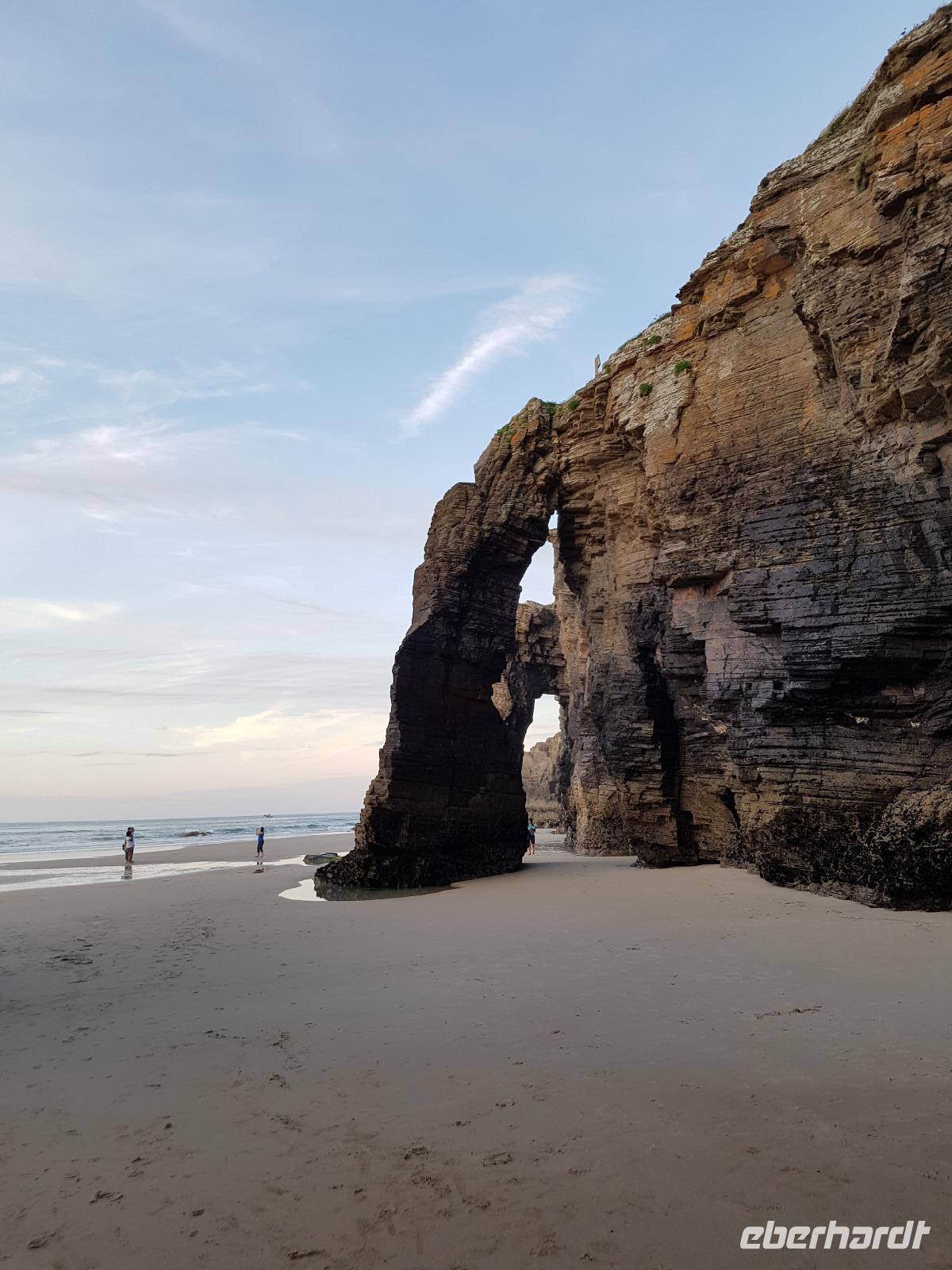 Am frühen Nachmittag fuhren wir weiter nach Ribadeo an der Atlantik-Küste, wo sich der Kathedralen-Strand Praia a Catedrais befindet. Einer der spektakulärsten Strände Europas. Da heute Ebbe um 22.15 Uhr ist, hatten wir Abendessen um 20 Uhr und fuhren nur 10 Minuten weiter zu diesem tollen unvergesslichen Strand. Heute bei klarem Himmel und Sonnenuntergang. Warum bei Ebbe? Bei Ebbe bietet dieser Strand mit seinen skurrilen Felsformationen ein wahres Naturschauspiel. Vier von uns badeten sogar und alle bestaunten gemeinsam die verschiedenen Steinbögen dieses Strandes. Herrlich.