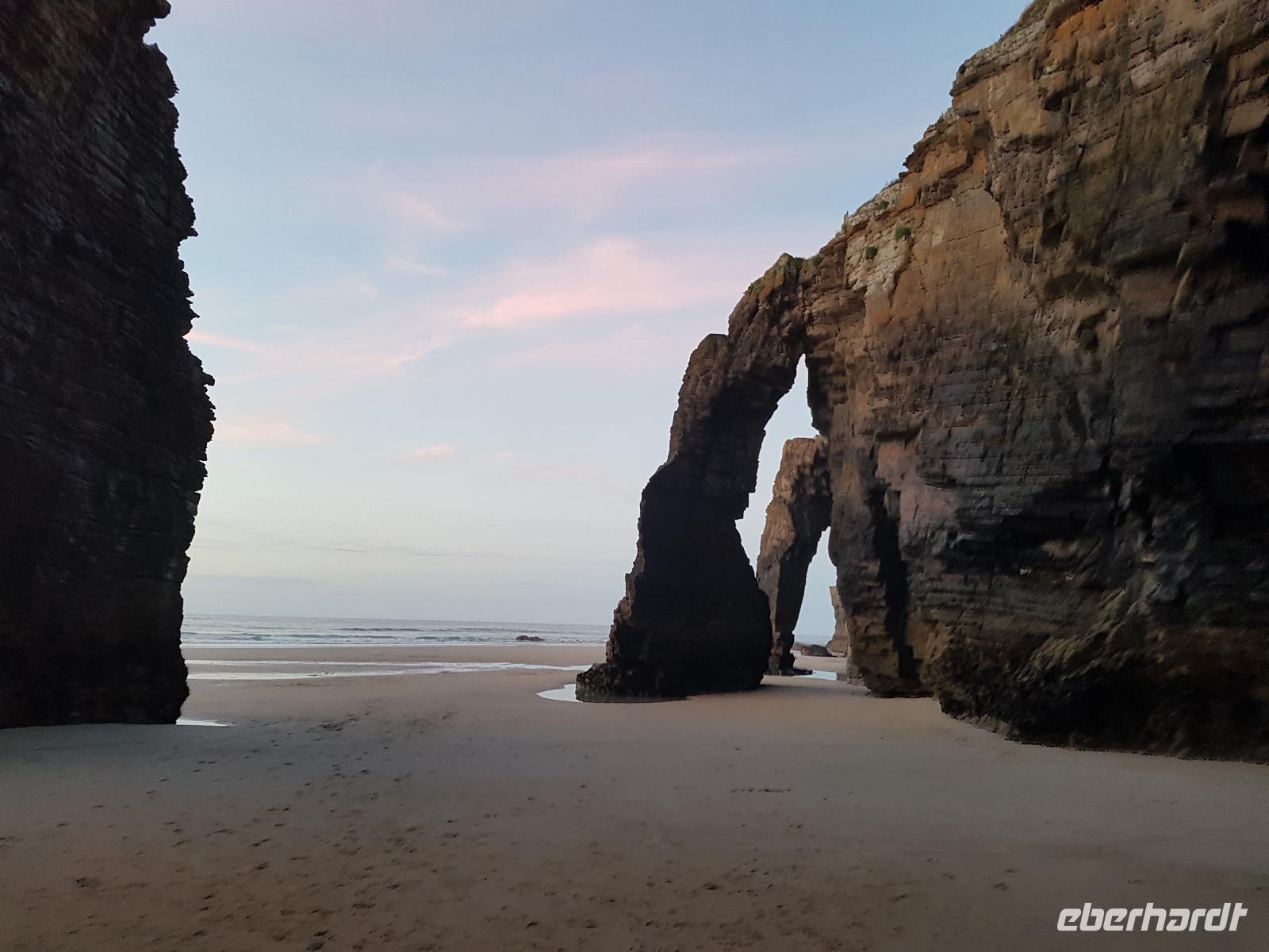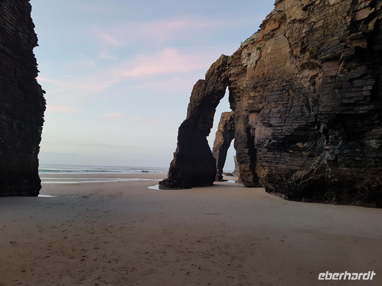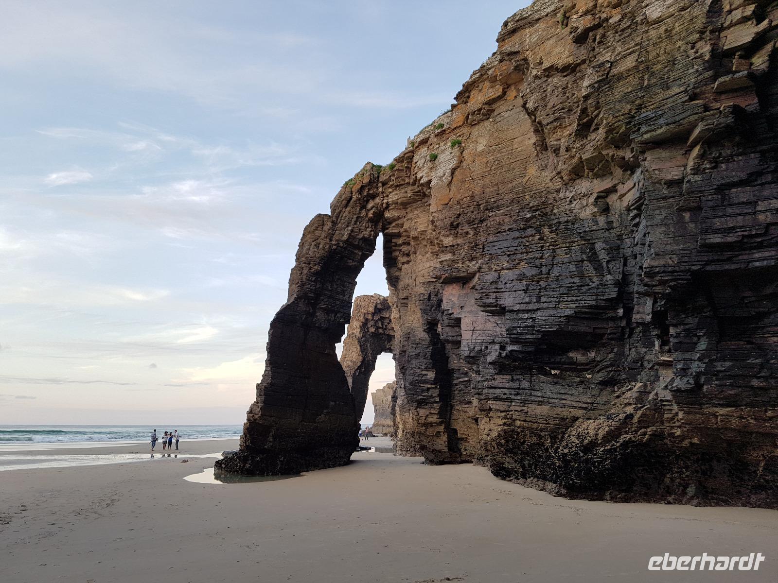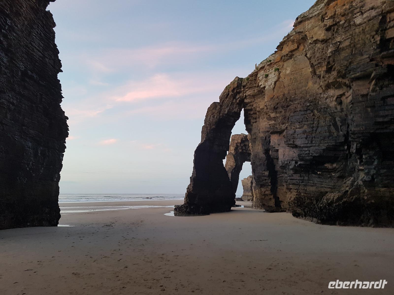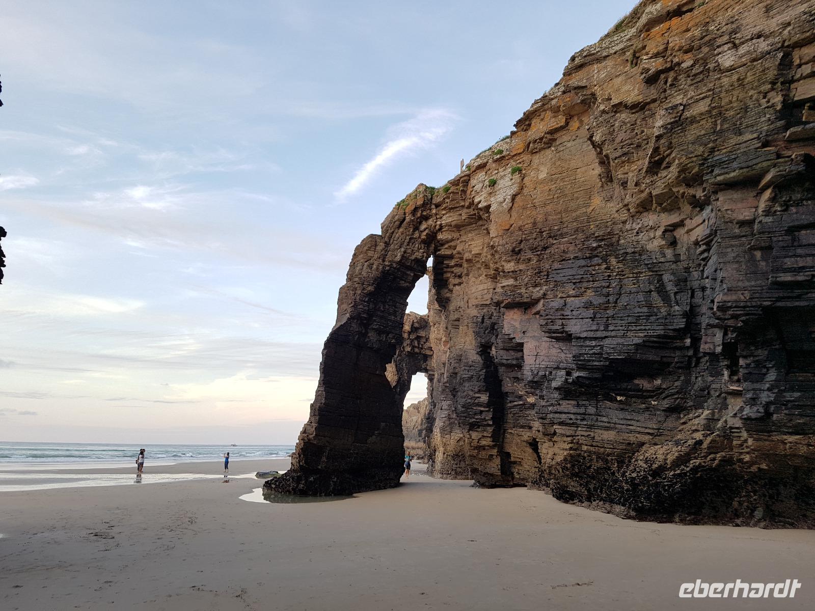 Am frühen Nachmittag fuhren wir weiter nach Ribadeo an der Atlantik-Küste, wo sich der Kathedralen-Strand Praia a Catedrais befindet. Einer der spektakulärsten Strände Europas. Da heute Ebbe um 22.15 Uhr ist, hatten wir Abendessen um 20 Uhr und fuhren nur 10 Minuten weiter zu diesem tollen unvergesslichen Strand. Heute bei klarem Himmel und Sonnenuntergang. Warum bei Ebbe? Bei Ebbe bietet dieser Strand mit seinen skurrilen Felsformationen ein wahres Naturschauspiel. Vier von uns badeten sogar und alle bestaunten gemeinsam die verschiedenen Steinbögen dieses Strandes. Herrlich.