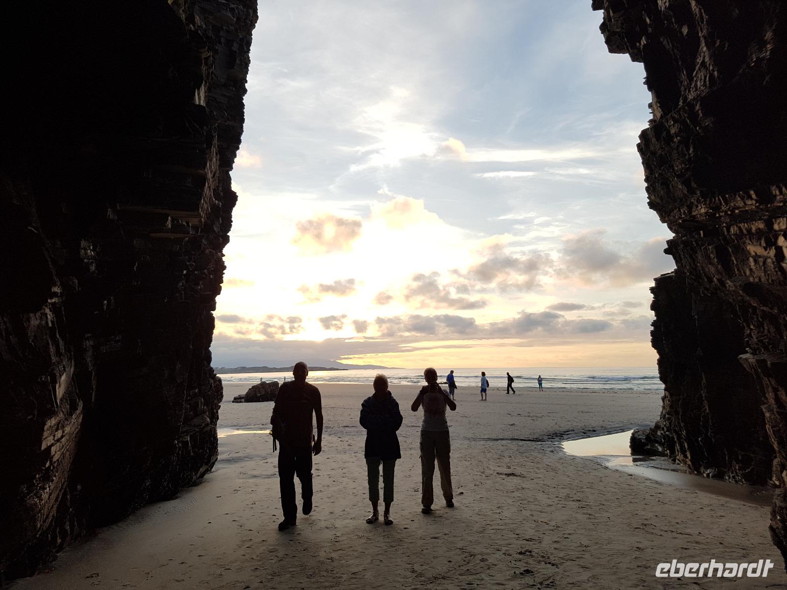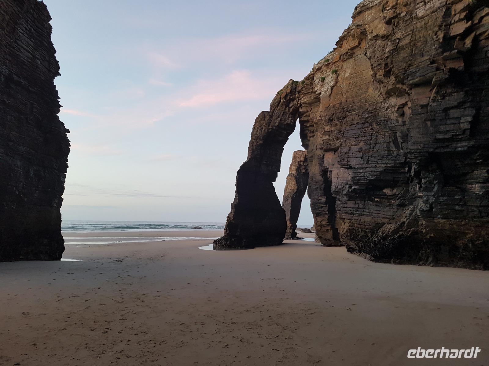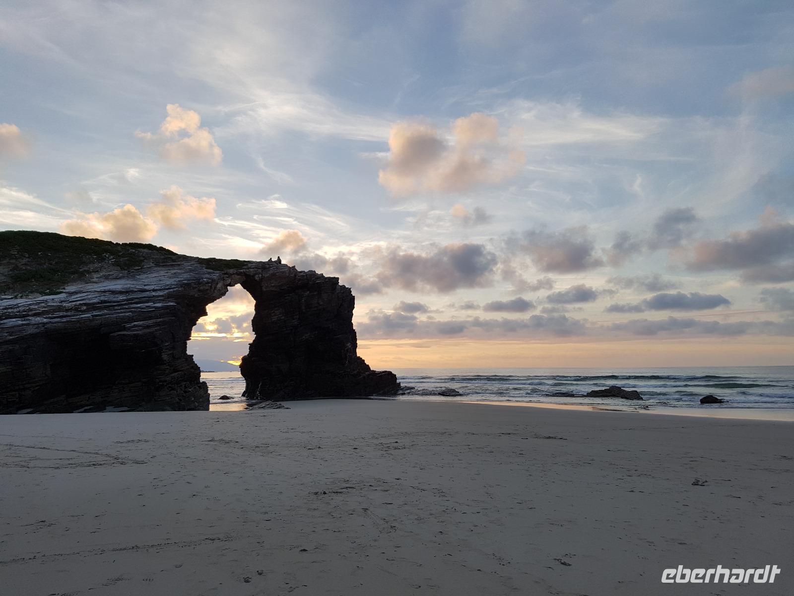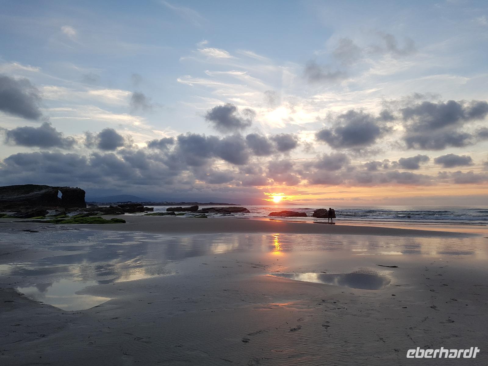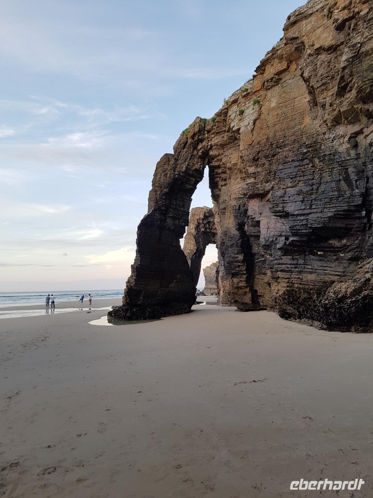 Am frühen Nachmittag fuhren wir weiter nach Ribadeo an der Atlantik-Küste, wo sich der Kathedralen-Strand Praia a Catedrais befindet. Einer der spektakulärsten Strände Europas. Da heute Ebbe um 22.15 Uhr ist, hatten wir Abendessen um 20 Uhr und fuhren nur 10 Minuten weiter zu diesem tollen unvergesslichen Strand. Heute bei klarem Himmel und Sonnenuntergang. Warum bei Ebbe? Bei Ebbe bietet dieser Strand mit seinen skurrilen Felsformationen ein wahres Naturschauspiel. Vier von uns badeten sogar und alle bestaunten gemeinsam die verschiedenen Steinbögen dieses Strandes. Herrlich.
