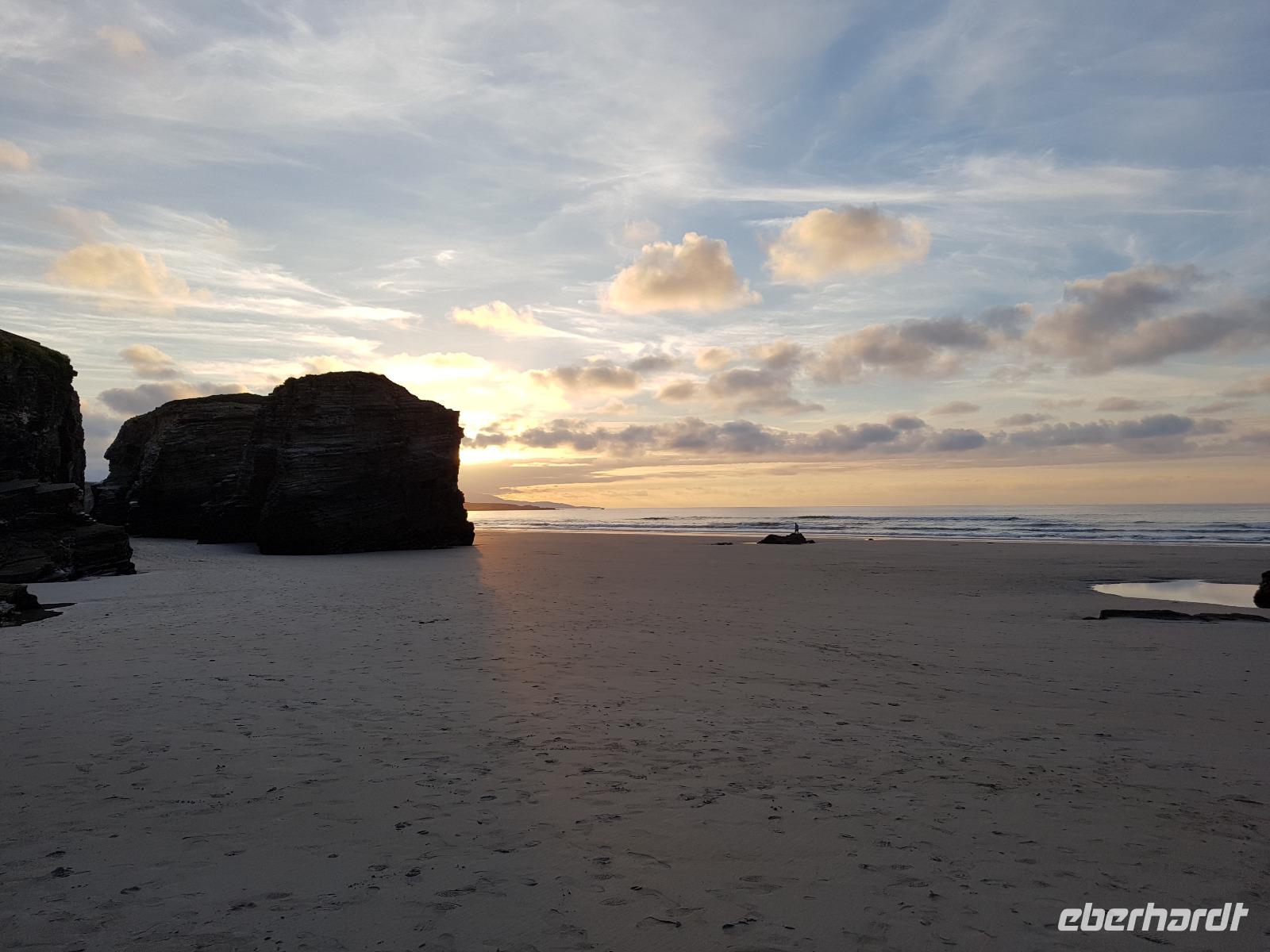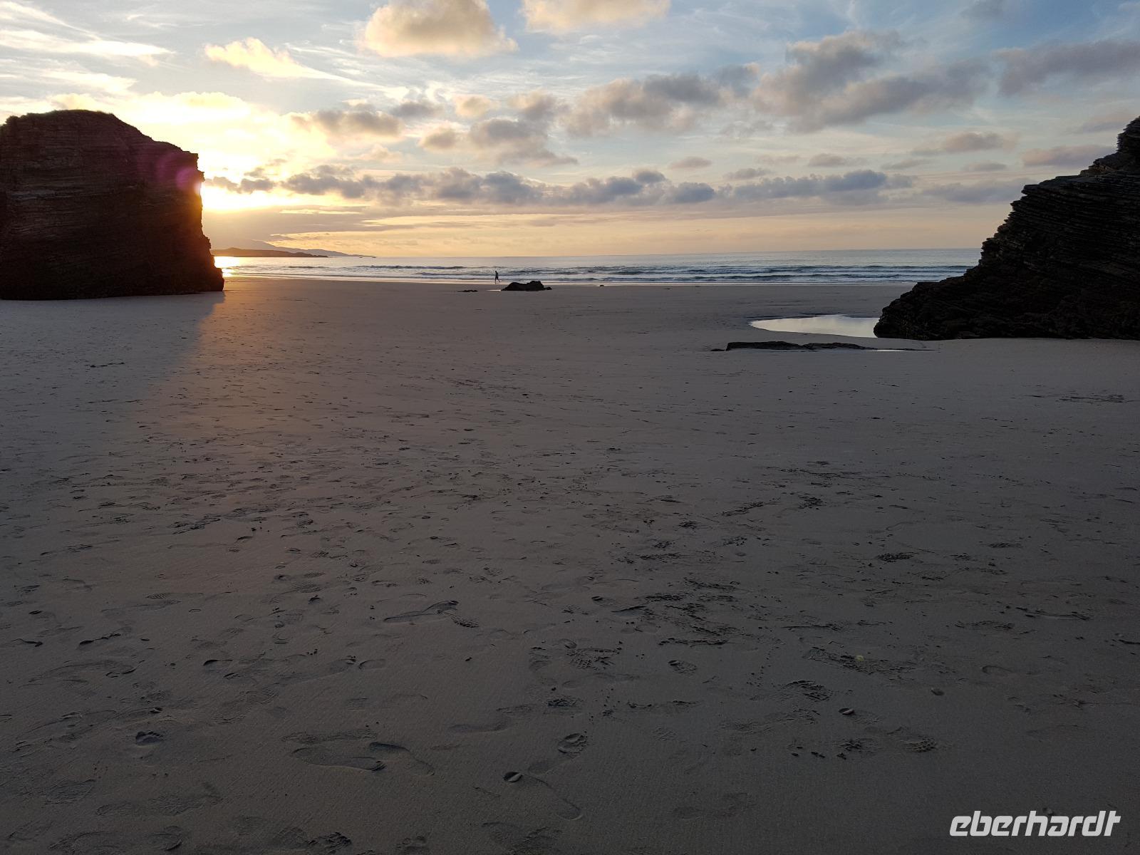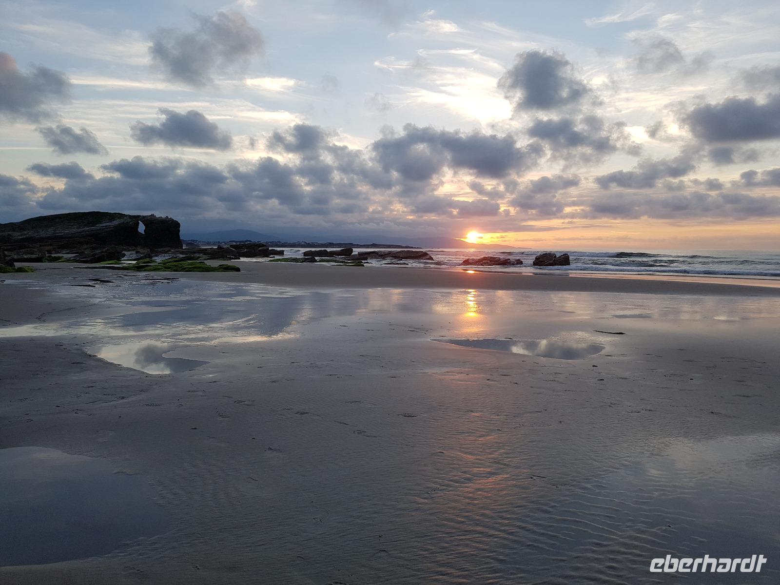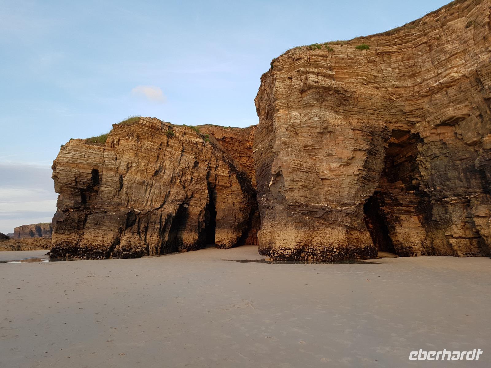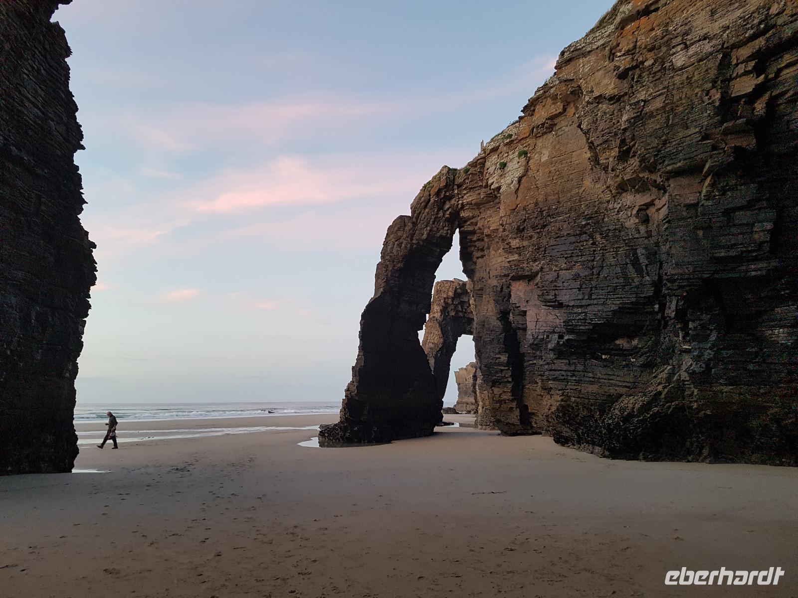 Am frühen Nachmittag fuhren wir weiter nach Ribadeo an der Atlantik-Küste, wo sich der Kathedralen-Strand Praia a Catedrais befindet. Einer der spektakulärsten Strände Europas. Da heute Ebbe um 22.15 Uhr ist, hatten wir Abendessen um 20 Uhr und fuhren nur 10 Minuten weiter zu diesem tollen unvergesslichen Strand. Heute bei klarem Himmel und Sonnenuntergang. Warum bei Ebbe? Bei Ebbe bietet dieser Strand mit seinen skurrilen Felsformationen ein wahres Naturschauspiel. Vier von uns badeten sogar und alle bestaunten gemeinsam die verschiedenen Steinbögen dieses Strandes. Herrlich.