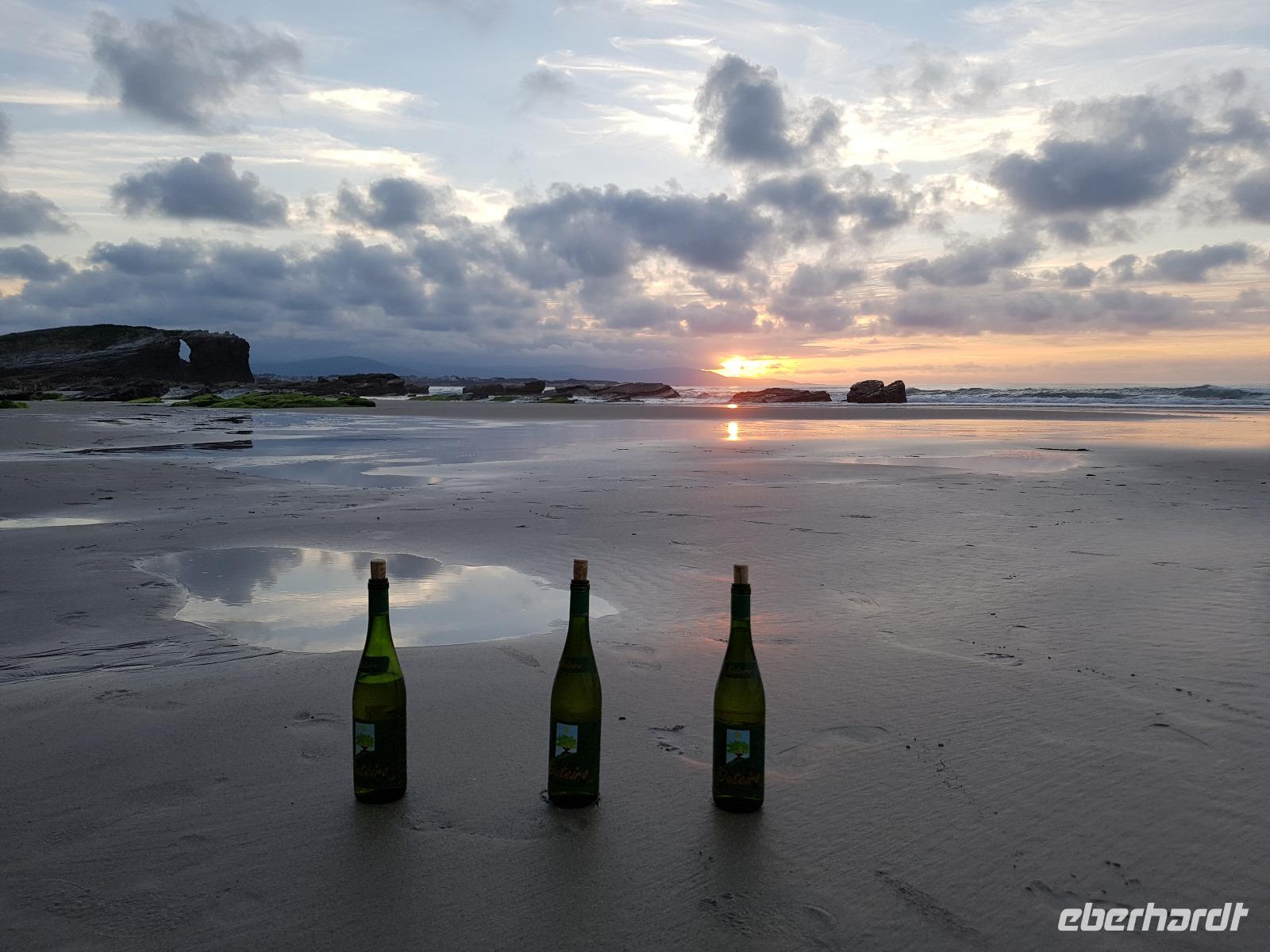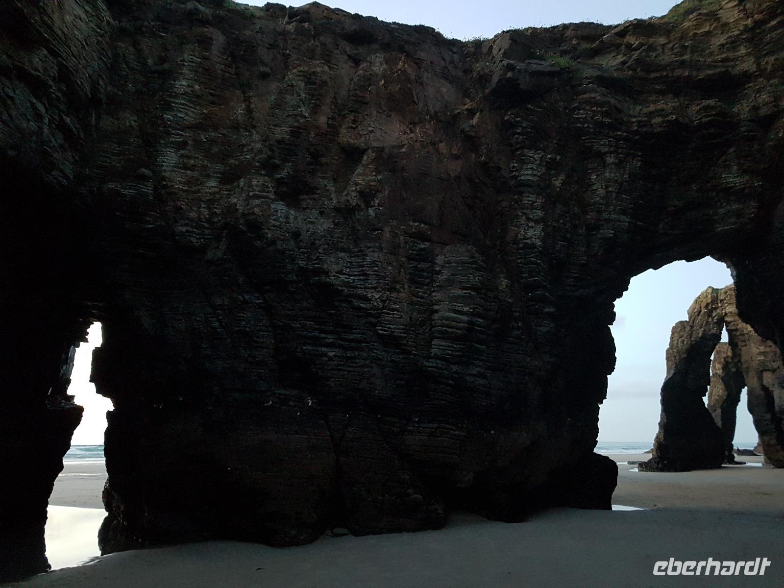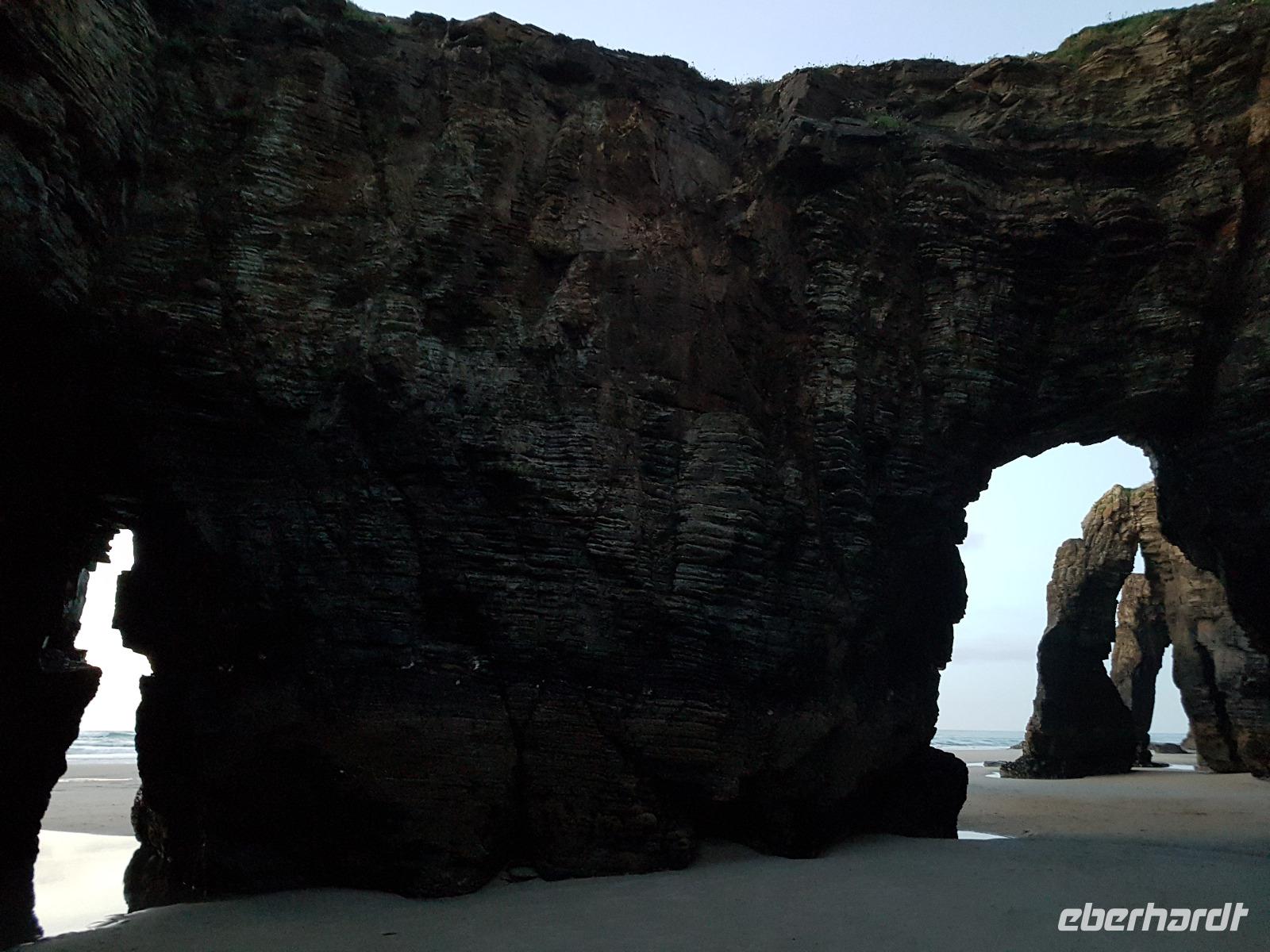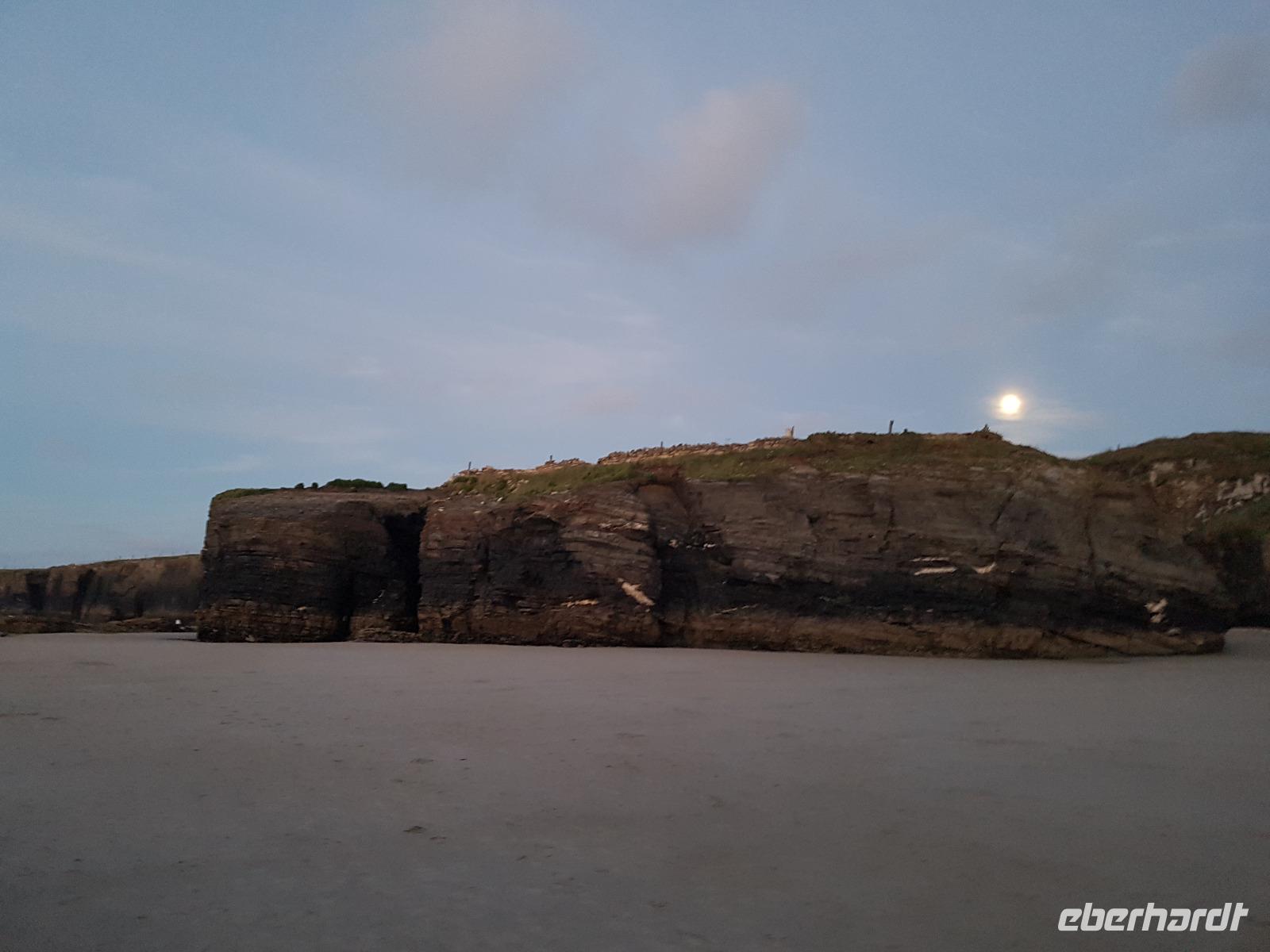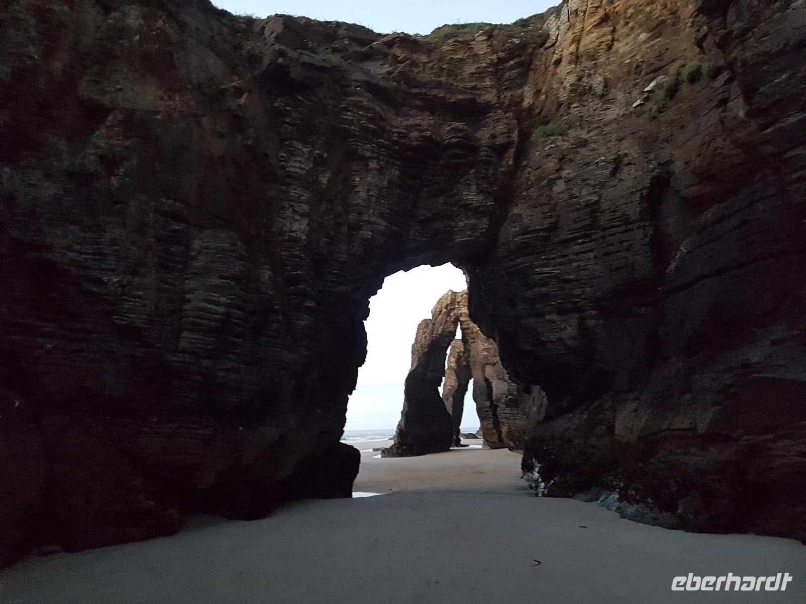 Am frühen Nachmittag fuhren wir weiter nach Ribadeo an der Atlantik-Küste, wo sich der Kathedralen-Strand Praia a Catedrais befindet. Einer der spektakulärsten Strände Europas. Da heute Ebbe um 22.15 Uhr ist, hatten wir Abendessen um 20 Uhr und fuhren nur 10 Minuten weiter zu diesem tollen unvergesslichen Strand. Heute bei klarem Himmel und Sonnenuntergang. Warum bei Ebbe? Bei Ebbe bietet dieser Strand mit seinen skurrilen Felsformationen ein wahres Naturschauspiel. Vier von uns badeten sogar und alle bestaunten gemeinsam die verschiedenen Steinbögen dieses Strandes. Herrlich.