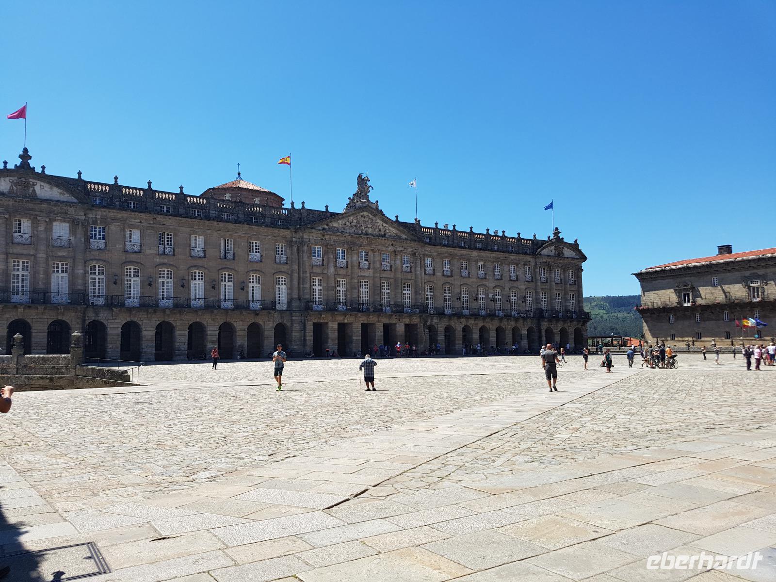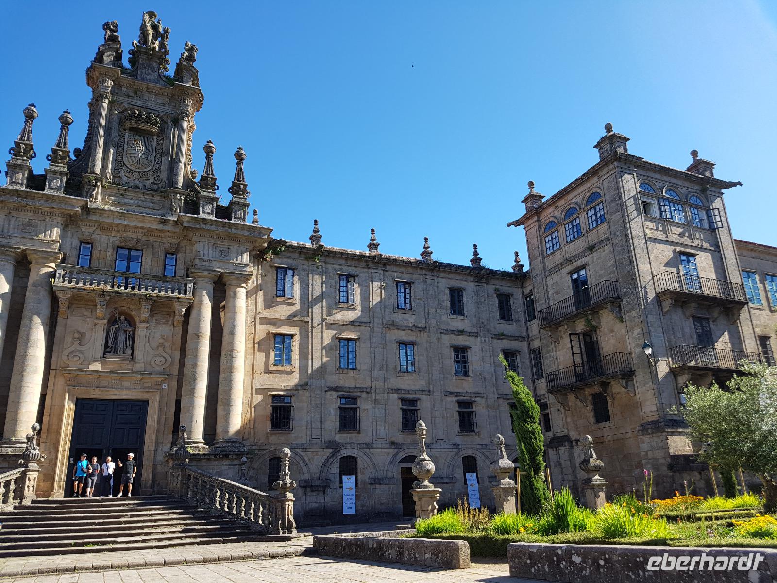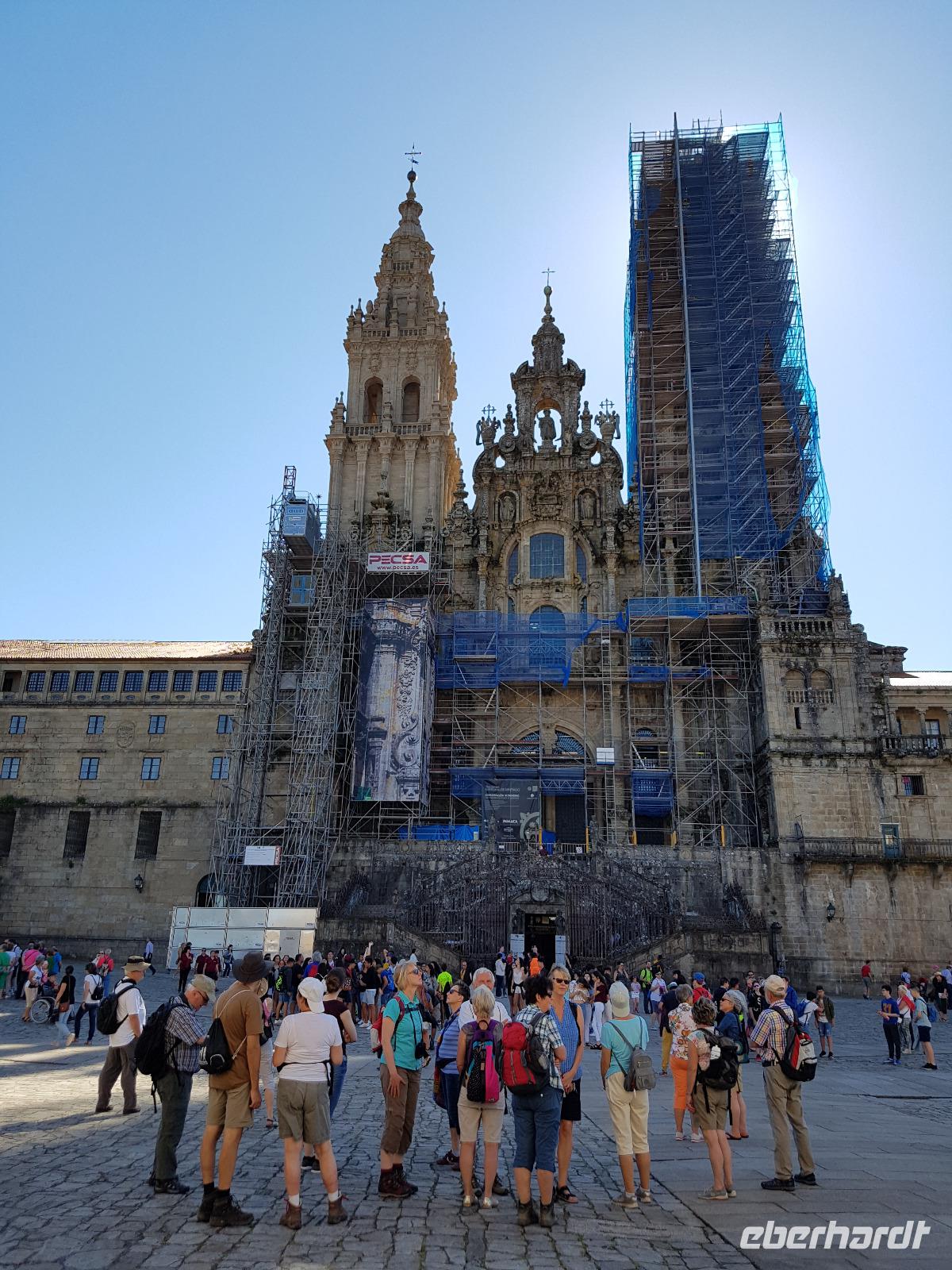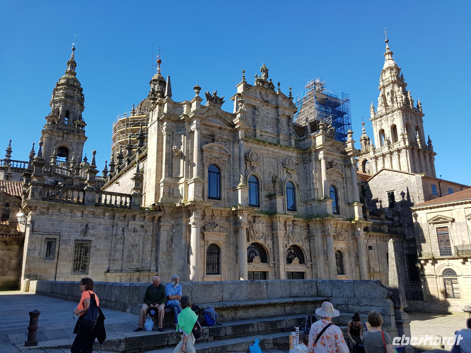 Heute entschieden wir uns alle diese letzten 5 Kilometer bis Santiago ohne reden zu wandern. Wir befinden uns hier vor den Toren von dem weltbekannten Wallfahrtsort Santiago de Compostela und Hauptstadt der Provinz Galicien. Wir wanderten heute das berühmte letzte Stück des Jakobswegs von Monte do Gozo von wo man die Türme von der Kathedrale sieht bis Santiago de Compostela. Unsere Seele freut sich schon darauf! Auf dem Weg sahen wir die Türme der Kathedrale schon von weitem und kamen wie schon im Mittelalter in der Stadt an, um traditionell den Apostel in der Kathedrale zu umarmen. Wir haben unser Ziel erreicht und hörten schon die Glocken der Kathedrale. Wir besichtigten die Kathedrale und umarmten den Apostel laut der Tradition und die Meistens von uns blieben um 12 Uhr da um die Pilgermesse zu hören. Man hat weinend zugehört und Tränen gesehen, aber alle voller Freude und Zufriedenheit. Was für eine Ruhe hier. Später bei einer Stadtbesichtigung erkundeten wir auch die Altstadt von Santiago de Compostela, die neben der Kathedrale und dem Jakobsweg natürlich auch zum Weltkulturerbe der UNESCO gehört. Am Obradoiro Platz gegenüber der prächtigen Fassade der Kathedrale machten wir die Gruppenbilder.