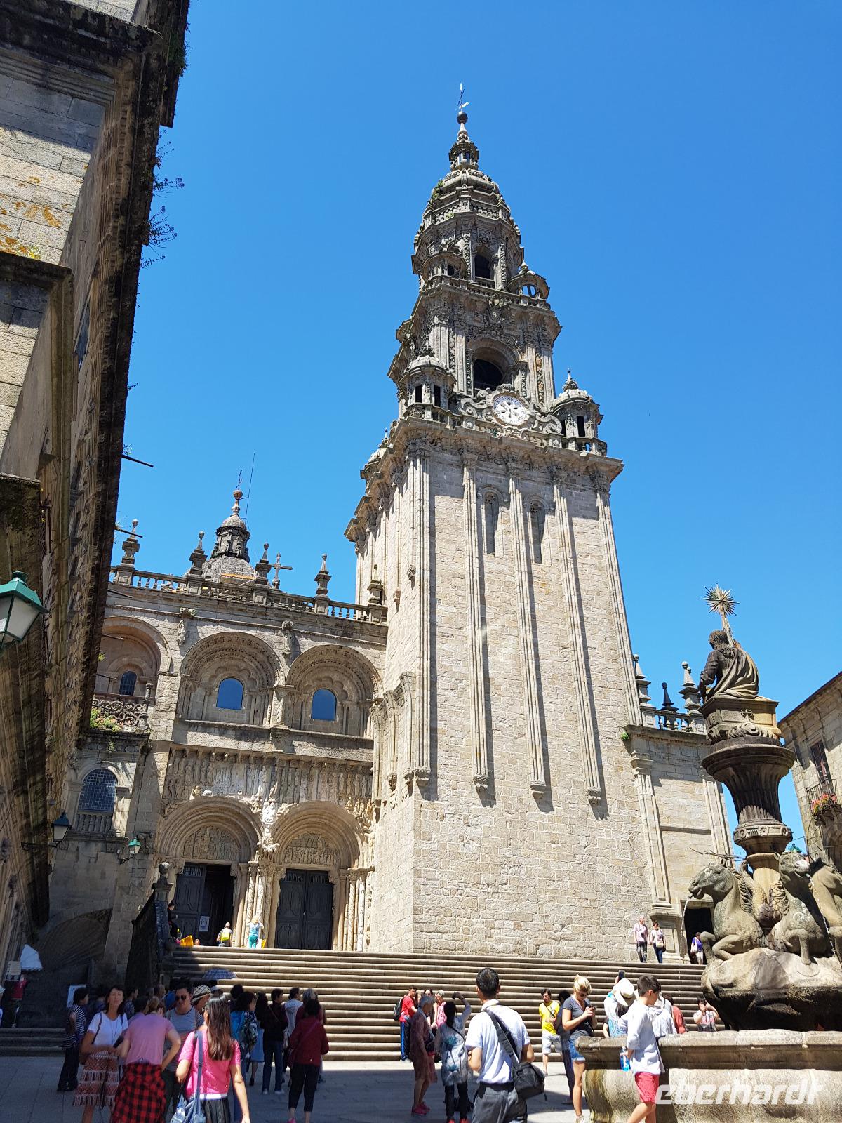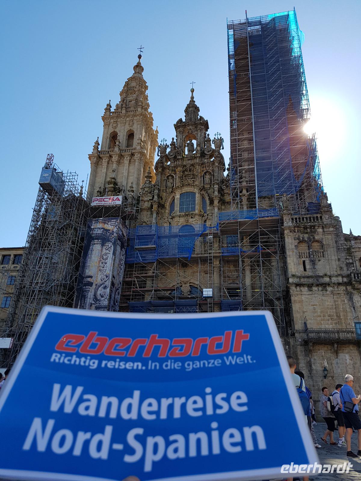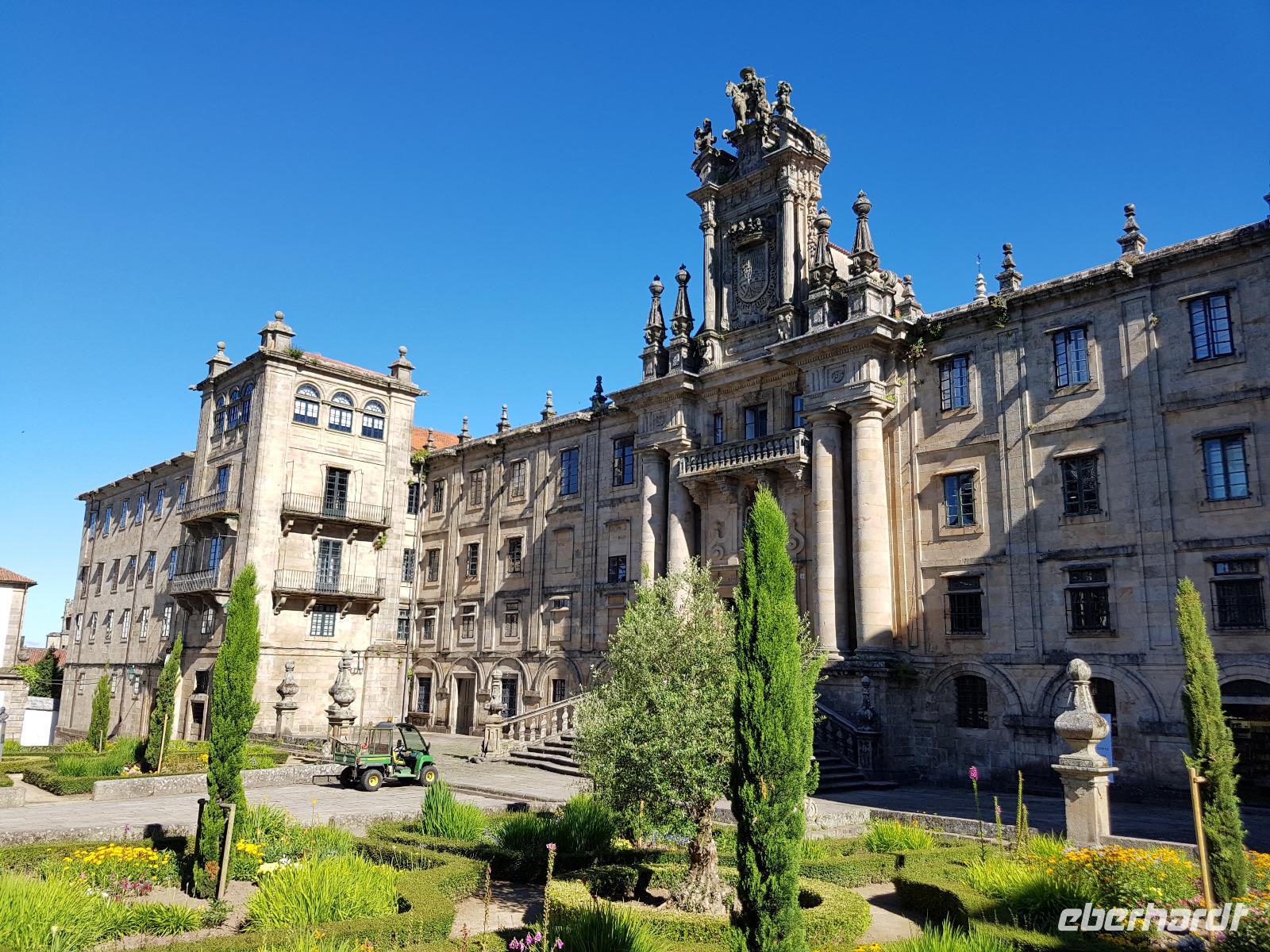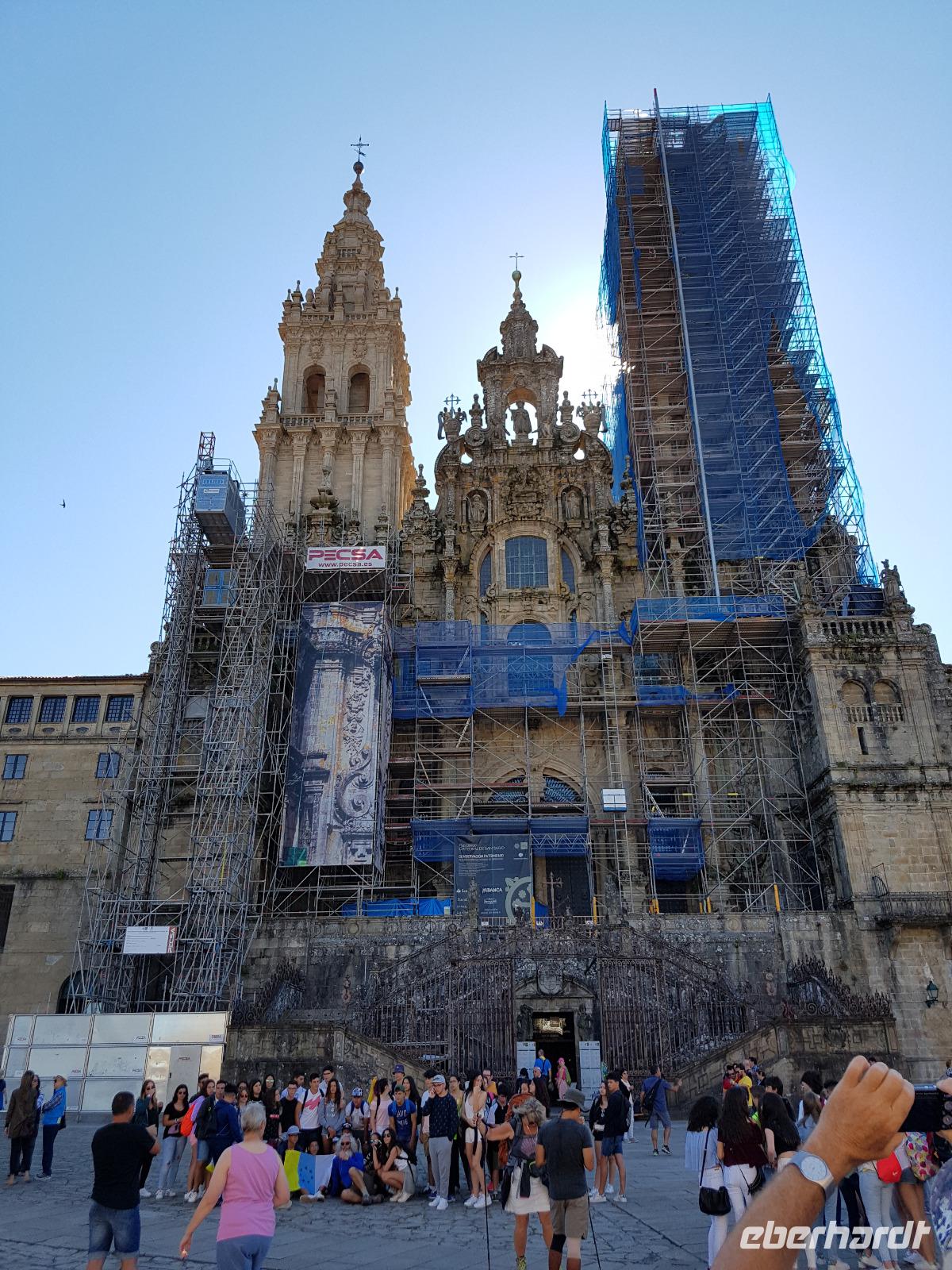 Heute entschieden wir uns alle diese letzten 5 Kilometer bis Santiago ohne reden zu wandern. Wir befinden uns hier vor den Toren von dem weltbekannten Wallfahrtsort Santiago de Compostela und Hauptstadt der Provinz Galicien. Wir wanderten heute das berühmte letzte Stück des Jakobswegs von Monte do Gozo von wo man die Türme von der Kathedrale sieht bis Santiago de Compostela. Unsere Seele freut sich schon darauf! Auf dem Weg sahen wir die Türme der Kathedrale schon von weitem und kamen wie schon im Mittelalter in der Stadt an, um traditionell den Apostel in der Kathedrale zu umarmen. Wir haben unser Ziel erreicht und hörten schon die Glocken der Kathedrale. Wir besichtigten die Kathedrale und umarmten den Apostel laut der Tradition und die Meistens von uns blieben um 12 Uhr da um die Pilgermesse zu hören. Man hat weinend zugehört und Tränen gesehen, aber alle voller Freude und Zufriedenheit. Was für eine Ruhe hier. Später bei einer Stadtbesichtigung erkundeten wir auch die Altstadt von Santiago de Compostela, die neben der Kathedrale und dem Jakobsweg natürlich auch zum Weltkulturerbe der UNESCO gehört. Am Obradoiro Platz gegenüber der prächtigen Fassade der Kathedrale machten wir die Gruppenbilder.