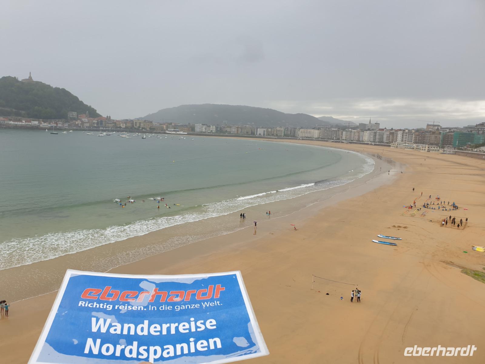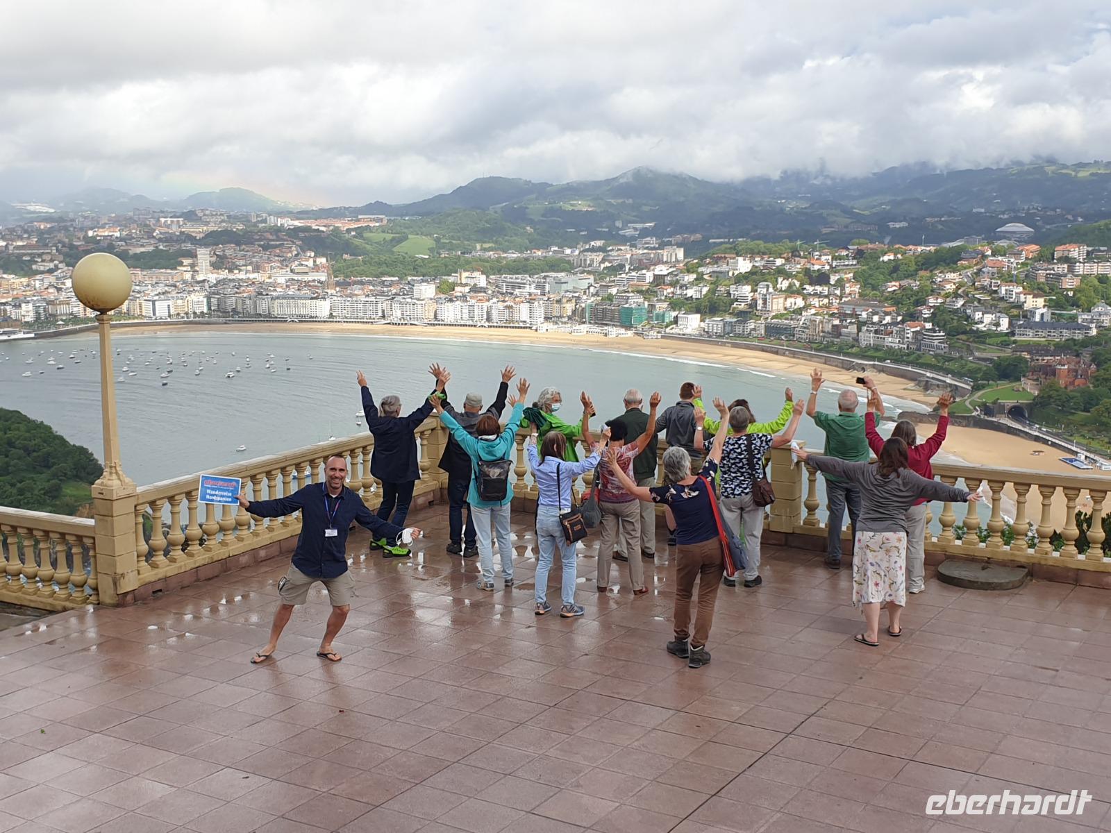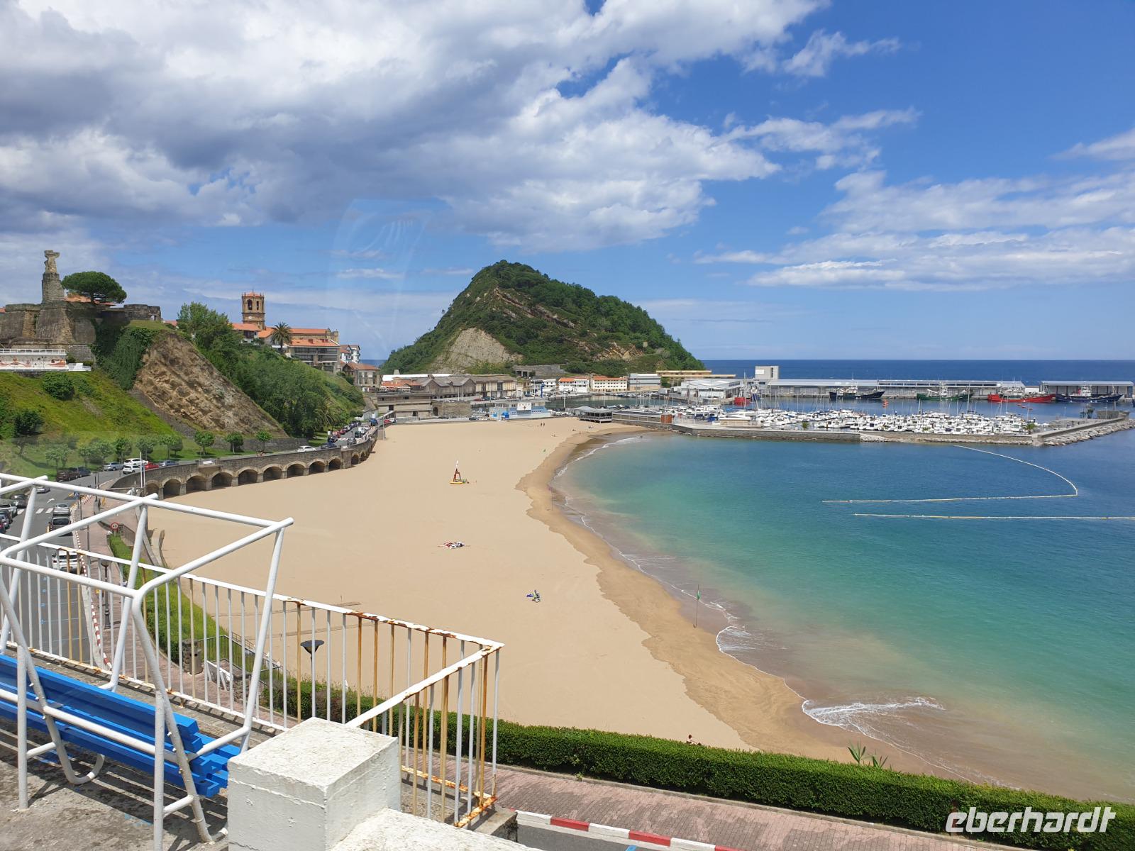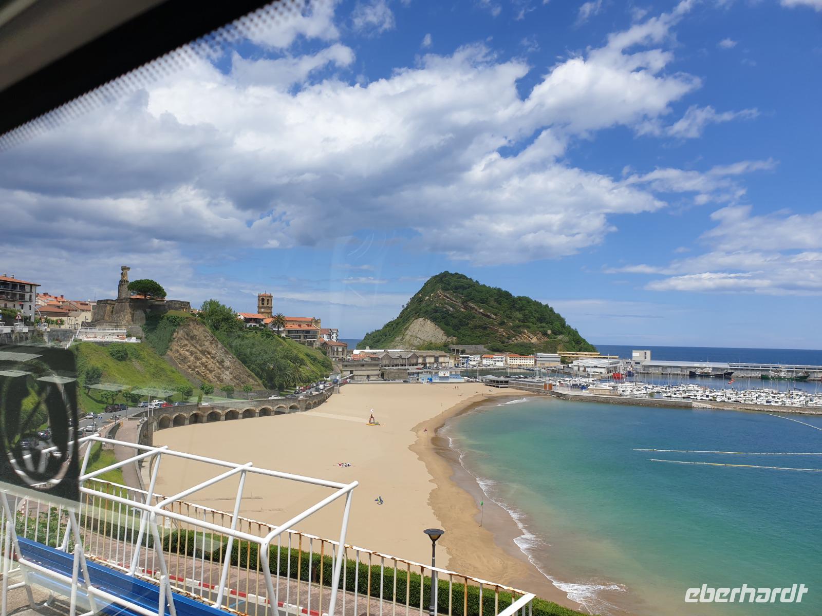 Immer an der Küste entlang fahren wir weiter mit dem Bus weiter an Zarautz vorbei, wo der berühmte spanische Chefkoch, Karlos Arguiñano, sein Restaurant direkt am Strand hat. Hier sieht man am Strand die Surfer, wie sie auf den Wellen reiten. Anschließend fahren wir nach San Sebastian, eine der schönsten Städte im äußersten Norden der iberischen Halbinsel. Diese Perle liegt in einer traumhaften Bucht im Baskenland. Wir hatten bis jetzt Glück mit dem Wetter. Es hat gedonnert, gegossen, geblitzt und gehagelt sogar aber immer als wir im Bus waren und hatten sonne in den Fotos.