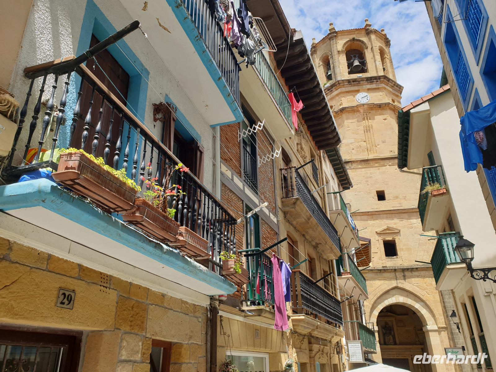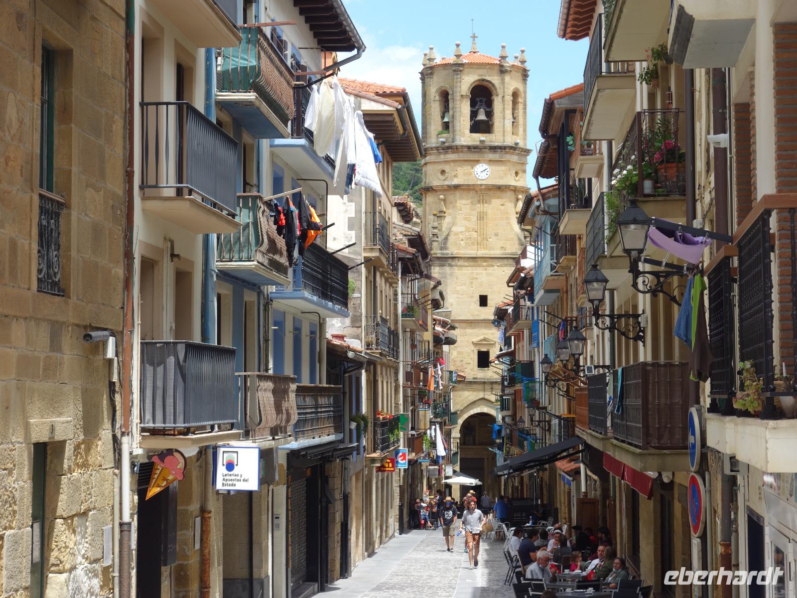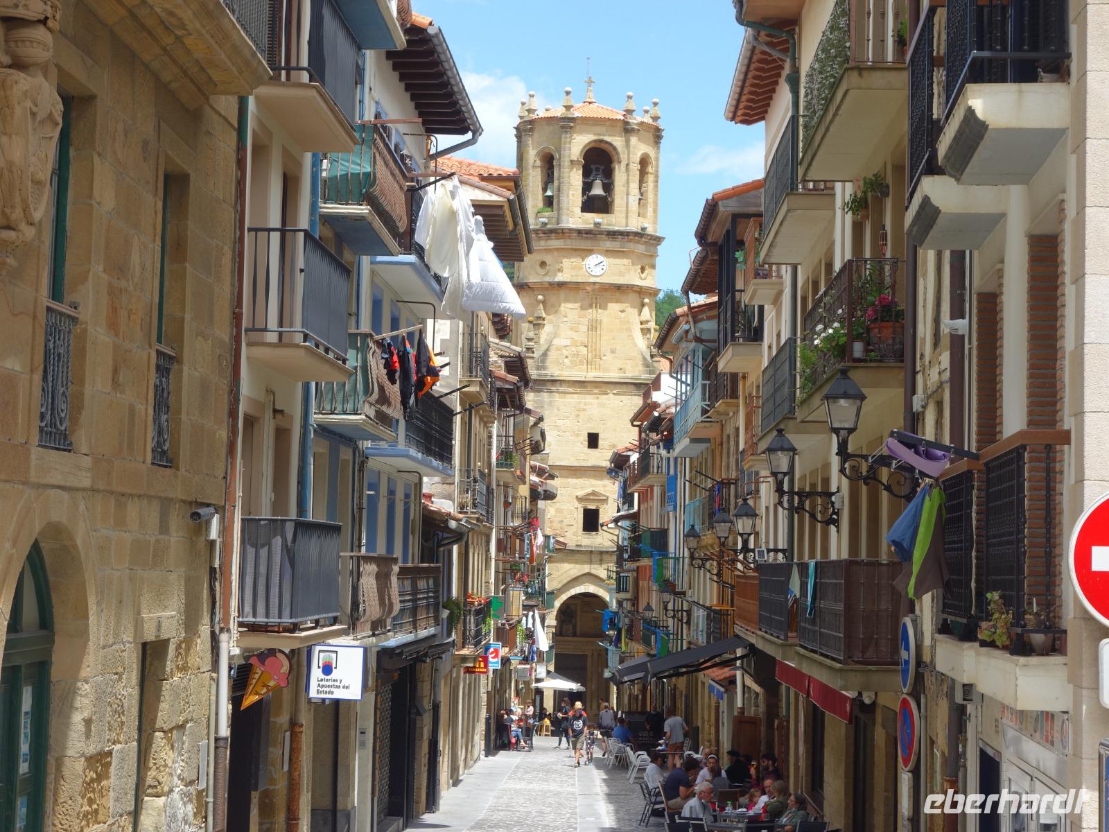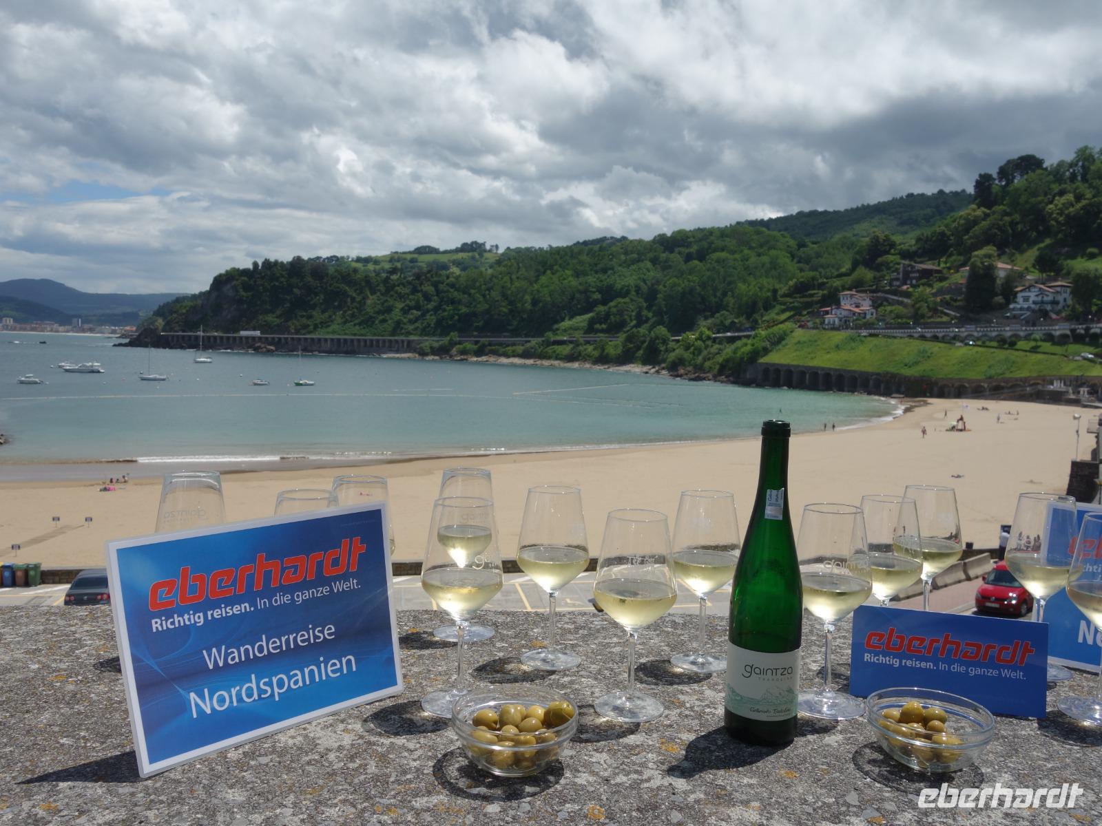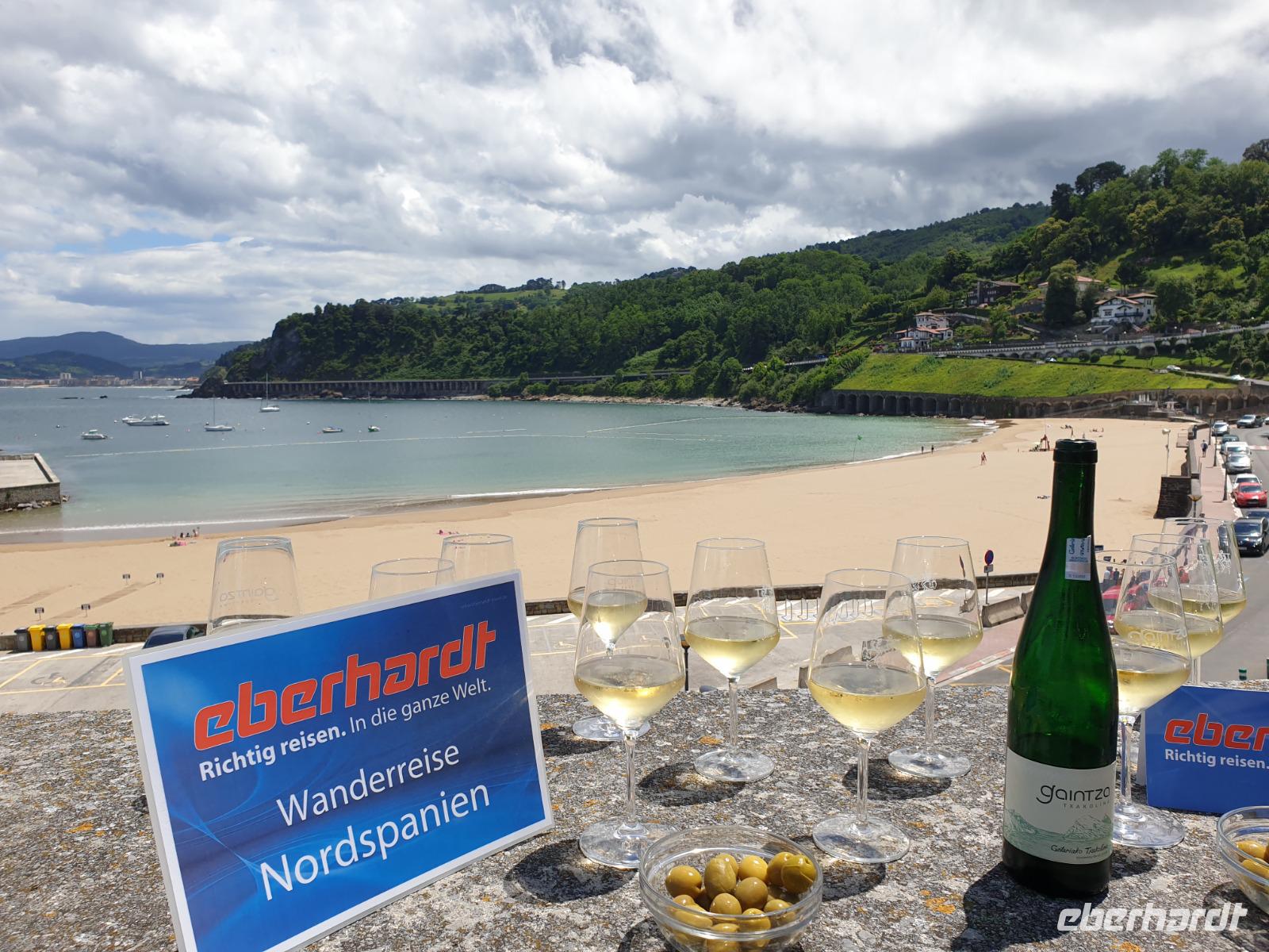 Bevor wir nach San Sebastian zu unserem 3 Sterne Hotel Codina fahren, haben wir noch die paar Überraschungen der Reise: Panoramafahrt an der Küste, Getaria und Monte Igueldo Hügel mit Freizeitpark. Alejandro führt uns an der Küste entlang erst einmal nach Getaria ans Meer, wo sich eine der schönsten kleinen Kirchen Spaniens befindet. Die Kirche von San Savaldor auf einem Hügel gebaut. Zumindest für mich. hier in dieser tollen, alten Kirche von San Salvador singt Benjamin ein paar Lieder für die Gruppe, da hier die Akustik einfach top ist. Hier treffen wir schon die ersten Jakobswegpilgerer, die auf ihrem Weg nach Santiago de Compostela sind, genau wie wir. Auf einer Terrasse oben am Hafen lädt Eberhardt Travel zum Txacoli Wein ein. Es handelt sich um einen typischen Weißwein aus der Baskenland Region. Wir stoßen gemeinsam auf die Reise an. Wir hatten Glück mit dem Wetter muss man auch dazu sagen, oder?
