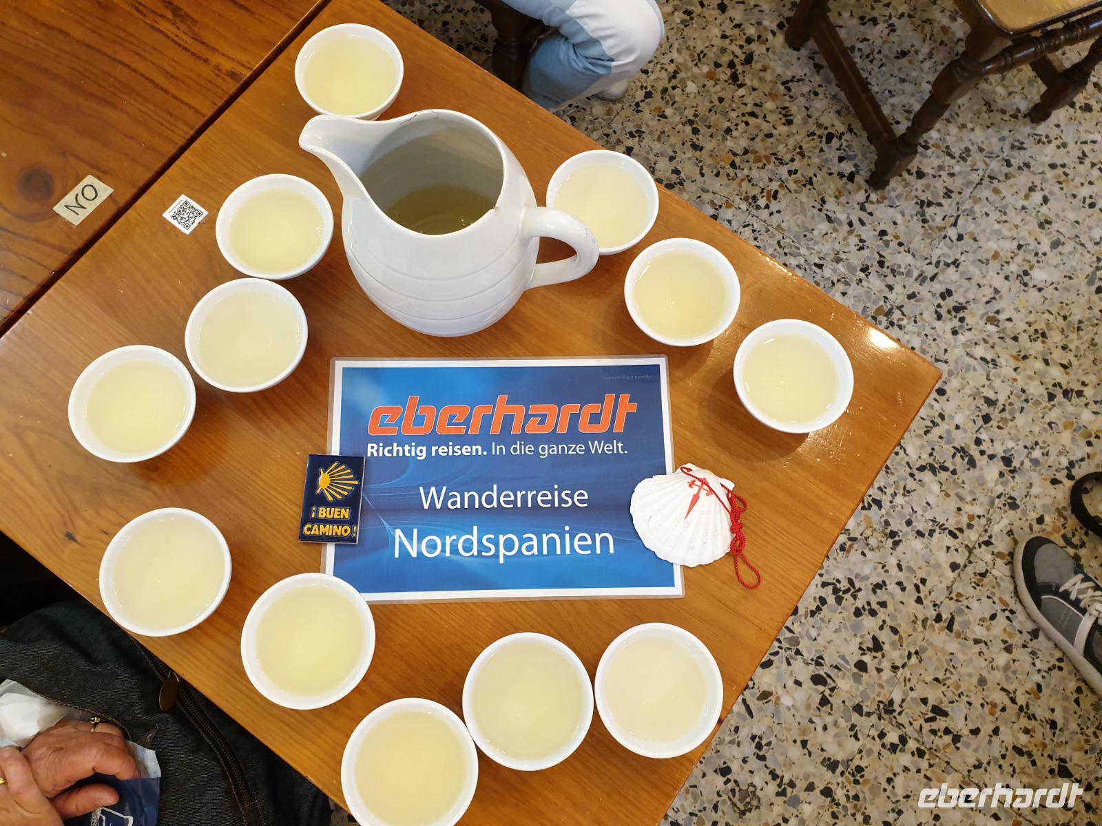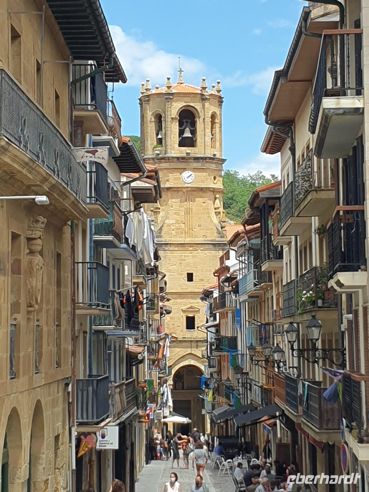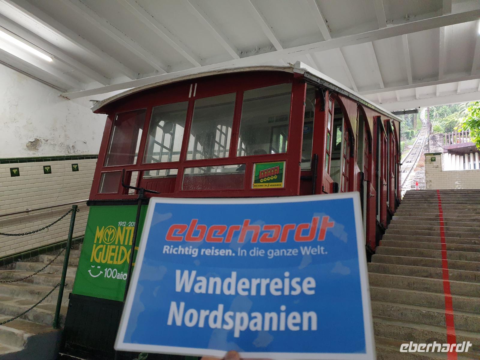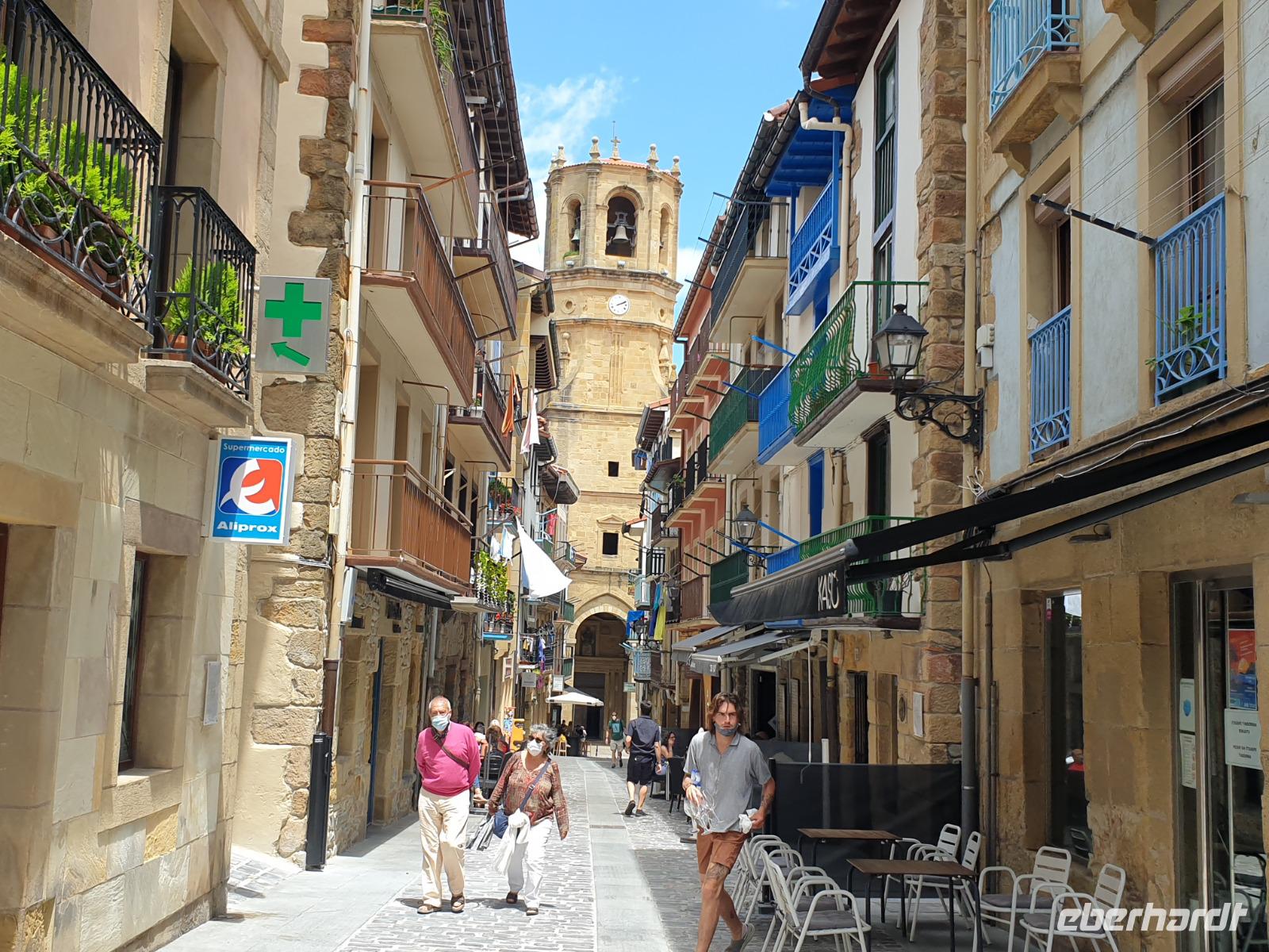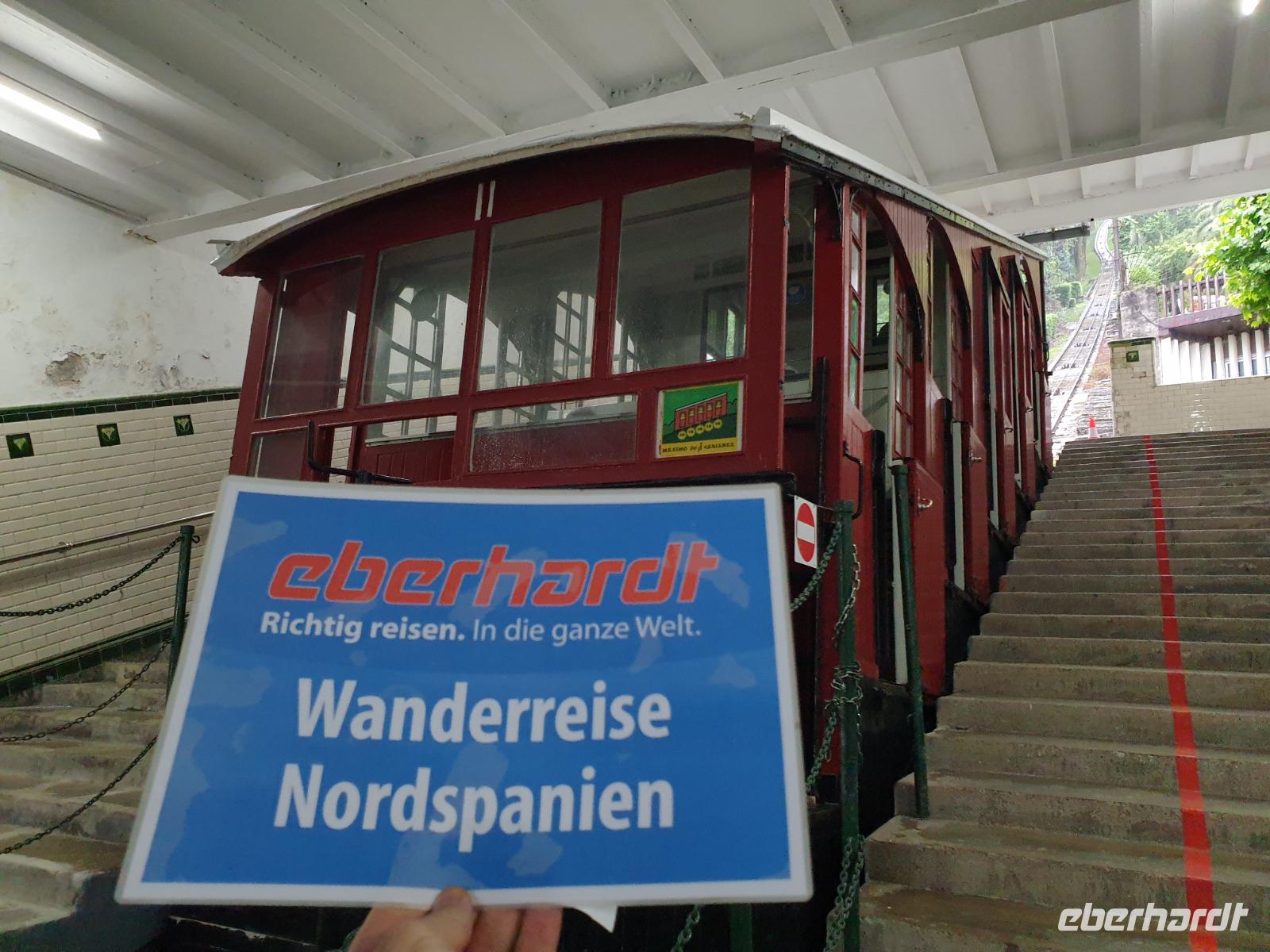 Bevor wir nach San Sebastian zu unserem 3 Sterne Hotel Codina fahren, haben wir noch die paar Überraschungen der Reise: Panoramafahrt an der Küste, Getaria und Monte Igueldo Hügel mit Freizeitpark. Alejandro führt uns an der Küste entlang erst einmal nach Getaria ans Meer, wo sich eine der schönsten kleinen Kirchen Spaniens befindet. Die Kirche von San Savaldor auf einem Hügel gebaut. Zumindest für mich. hier in dieser tollen, alten Kirche von San Salvador singt Benjamin ein paar Lieder für die Gruppe, da hier die Akustik einfach top ist. Hier treffen wir schon die ersten Jakobswegpilgerer, die auf ihrem Weg nach Santiago de Compostela sind, genau wie wir. Auf einer Terrasse oben am Hafen lädt Eberhardt Travel zum Txacoli Wein ein. Es handelt sich um einen typischen Weißwein aus der Baskenland Region. Wir stoßen gemeinsam auf die Reise an. Wir hatten Glück mit dem Wetter muss man auch dazu sagen, oder?