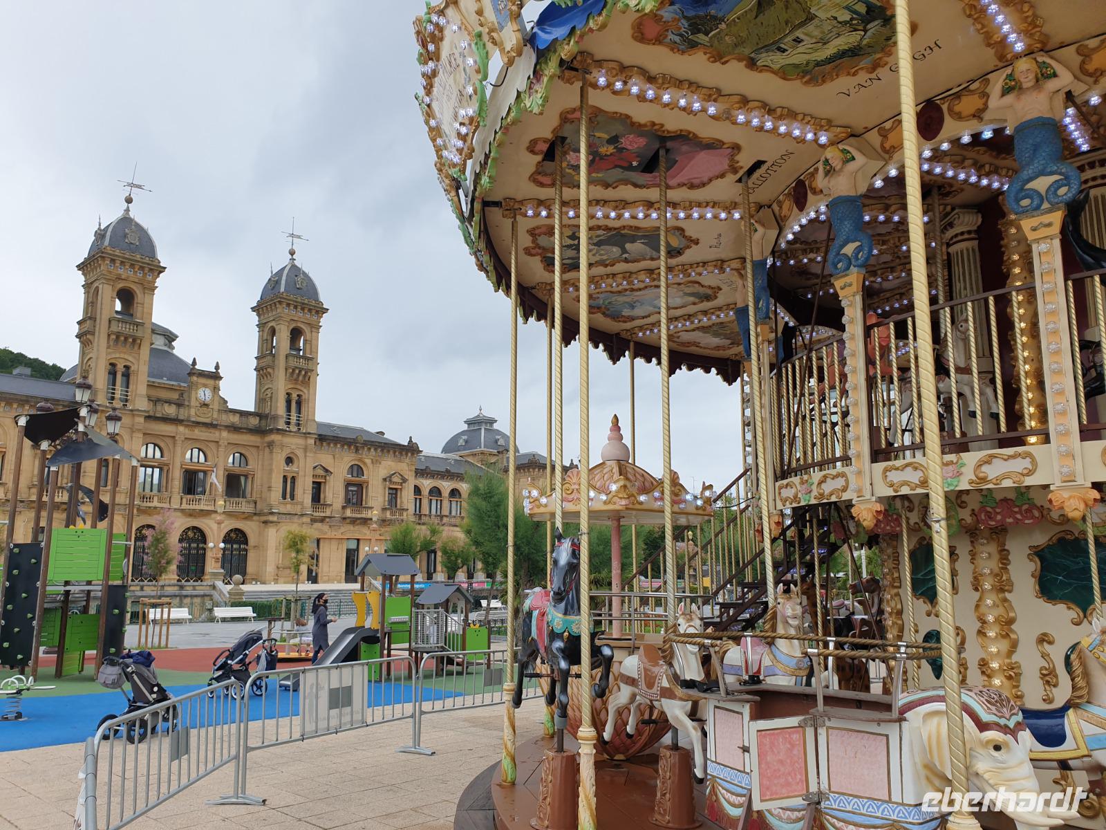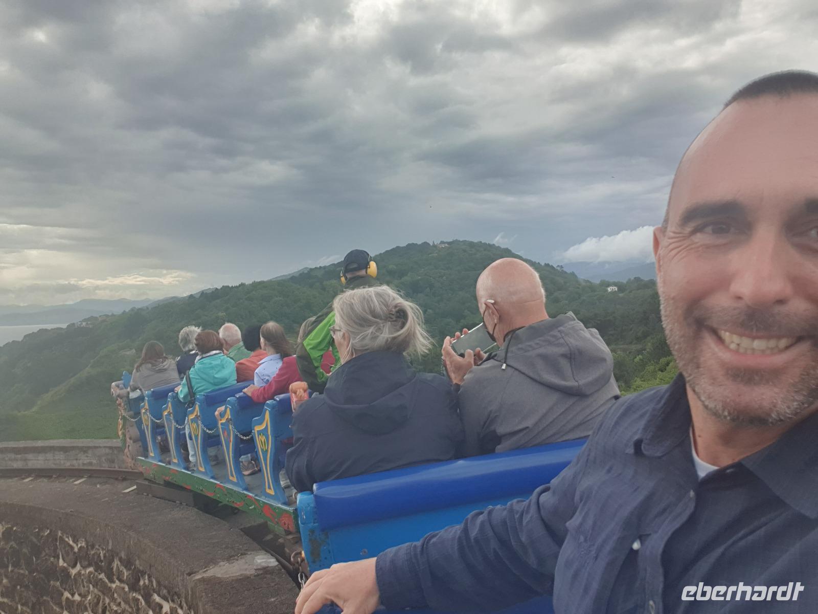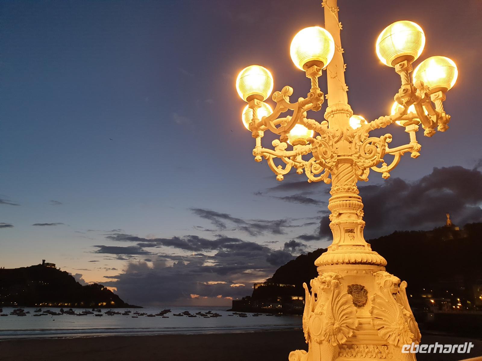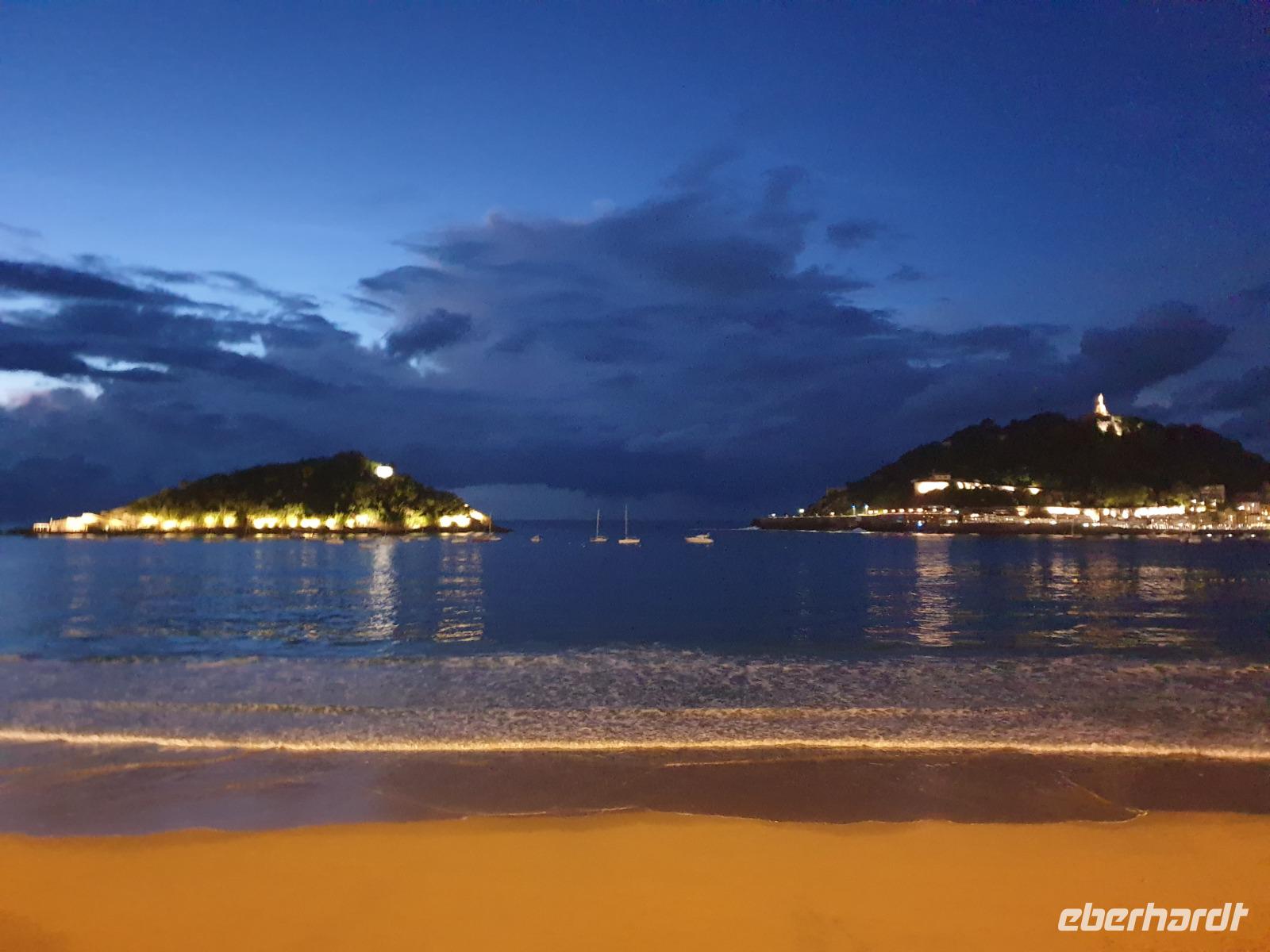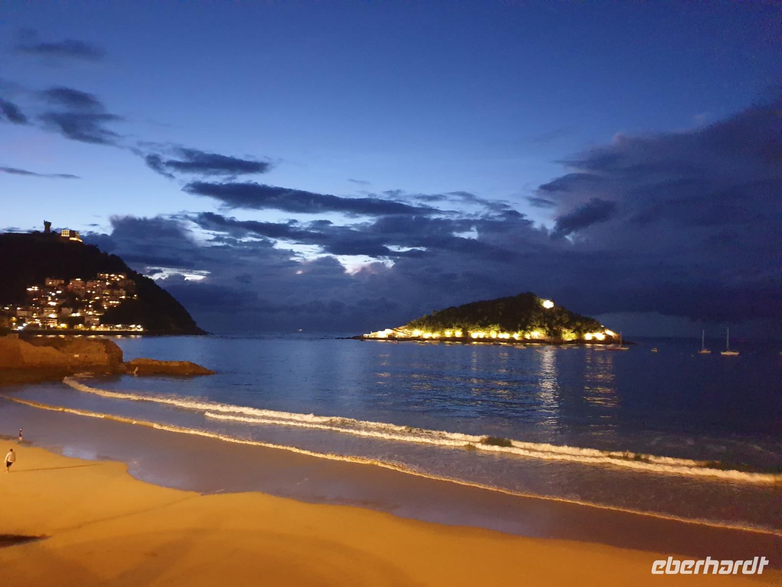 Bevor wir im Hotel ankommen hat Benjamin noch eine Überraschung. Viele von uns fahren mit einer alten Zahnradbahn auf den Monte Igueldo Hügel, wo sich ein alter, lustiger Freizeitpark befindet. Von hier oben hat man beste Ausblicke, wie auf einer Postkarte. Bei einer Fahrt mit einer Achterbahn für Erwachsene haben wir so viel gelacht, wie seit Langem nicht mehr, oder? Meine Güte! Eine Achterbahn aus den 20er Jahren ... und sie funktioniert immer noch. Für kleine Kinder würde ich es nicht empfehlen. Nachdem wir im Hotel Codina angekommen sind, gehen wir gemeinsam diesmal hin mit dem öffentlichen Bus in die Altstadt zum unserem Restaurant. Heute gibt es einen leckeren Salat, Kroquetten und als Hauptgericht Kabeljaufilet, Seehecht oder Entrecot und natürlich guten Wein, der auf dieser Reise nicht fehlen darf. Nach dem Essen fahren paar Gäste zurück mit dem Bus und meisten spazieren wir alle zurück an der Strandpromenade entlang, die ganze Bucht ist toll beleuchtet. Jemand von uns geht dann sogar ans Meer kurz baden. Wer könnte das sein? Das Wasser ist nicht so kalt wie gedacht und so verging der ersten Tag. Er war einfach ein Traum.