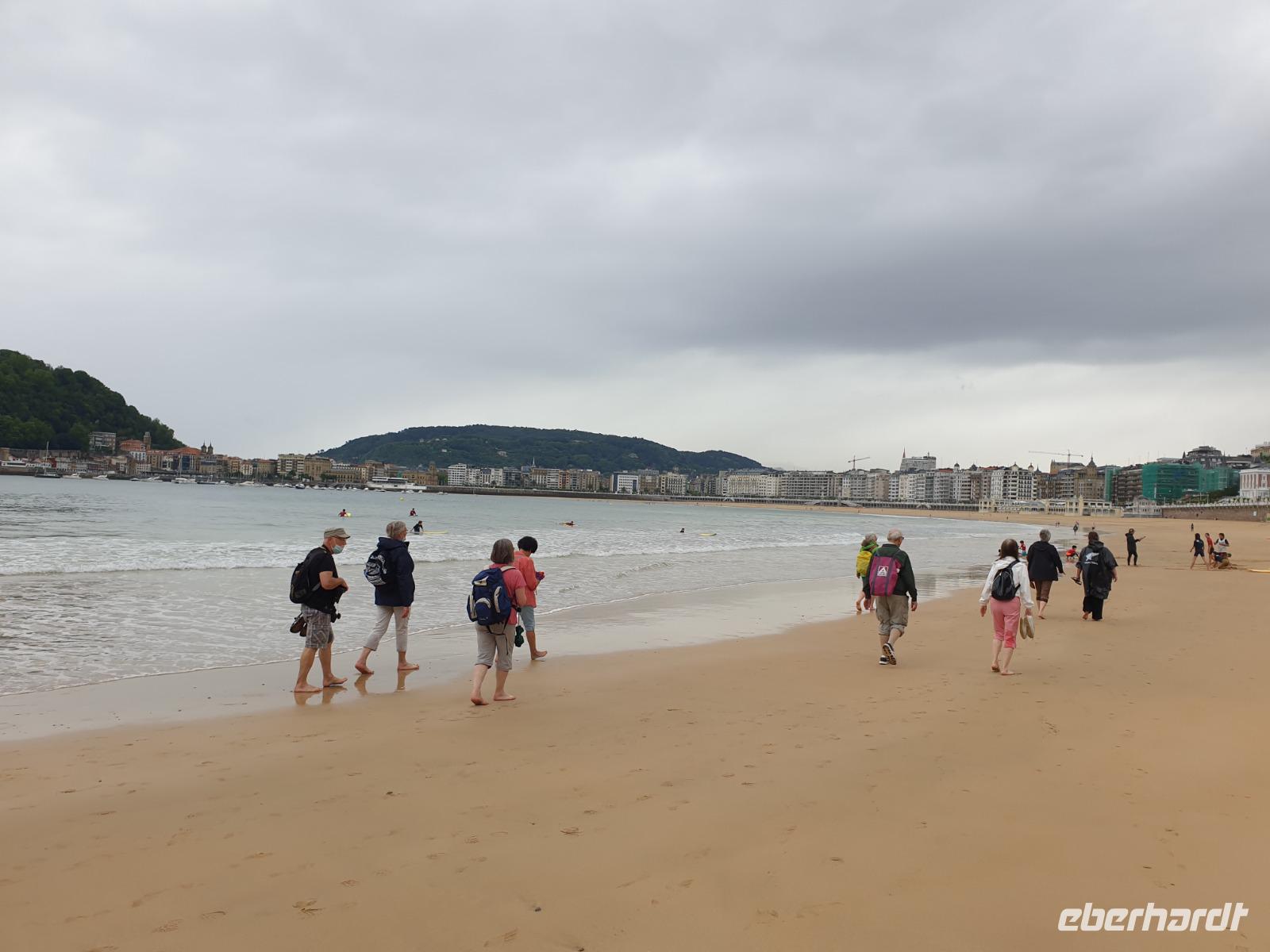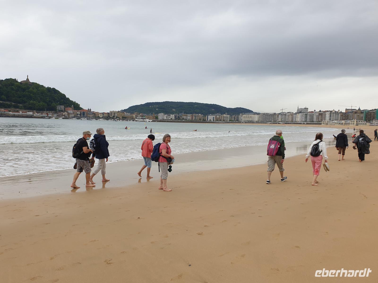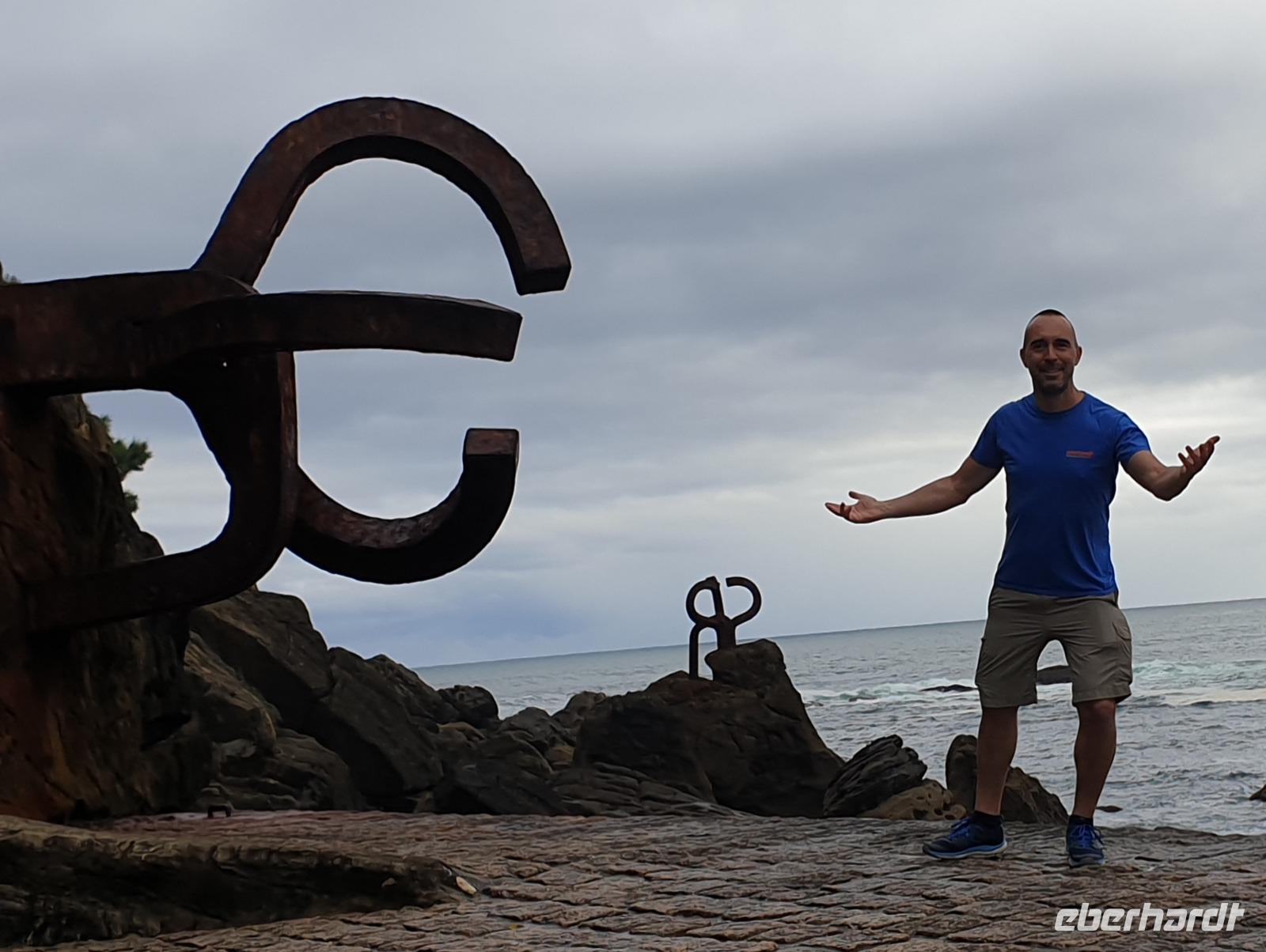 Nach einem guten und reichhaltigen Frühstück beginnen wir mit der ersten kleinen Wanderung an oder sagen wir lieber einem schönen Spaziergang von ca. 3 Kilometern entlang der Strandpromenade. Für Benjamin ist San Sebastian neben Granada die schönste Stadt Spaniens. Das Wetter könnte auch nicht besser sein. Wir fangen die Wanderung am Denkmal Peine de los Vientos (Kamm des Windes). Bis zum Palacio Miramar laufen wir mit Schuhe und dann aber am Strand weiter einige von uns sogar barfuß. Schnell geht Benjamin mit Herr Eberhard (ohne t) ins Wasser. Wir trocken uns ordentlich und weiter in die Altstadt. Nach der Besichtigung der Kirchen Santa Maria del Coro und San Vicente wurde für uns extra an der Markthalle und dann am Strand weiter ein Tapas-Picknick mit Käse, Schinken und Chorizo organisiert. Lecker, oder? In der Markthalle „La Bretxa" erfahren wir, was Tapas , "picotear" und Gazpacho sind. Uns gefällt diese Stadt sehr, die am Atlantik sehr idyllisch an einer weiten Bucht liegt. San Sebastian wird begrenzt von den Felsmassiven des Monte Urgull und Monte Igueldo. Während dem ersten Spaziergang entlang dieses weitläufigen Bogens, der La Concha (oder Muschel) genannten Bucht mit der ca. 1.350 Meter langen Strandpromenade, gehen wir alle ohne Schuhe immer am Meer entlang. Am Ende des Strandes befindet sich hoch auf dem Urgull Berg auf dem Gipfel die Christus-Statue (12,5 Meter hoch) von wo man auch einen schönen Blick auf den Hafen und die Altstadt hat.