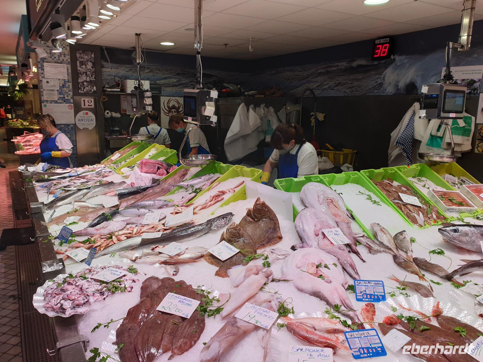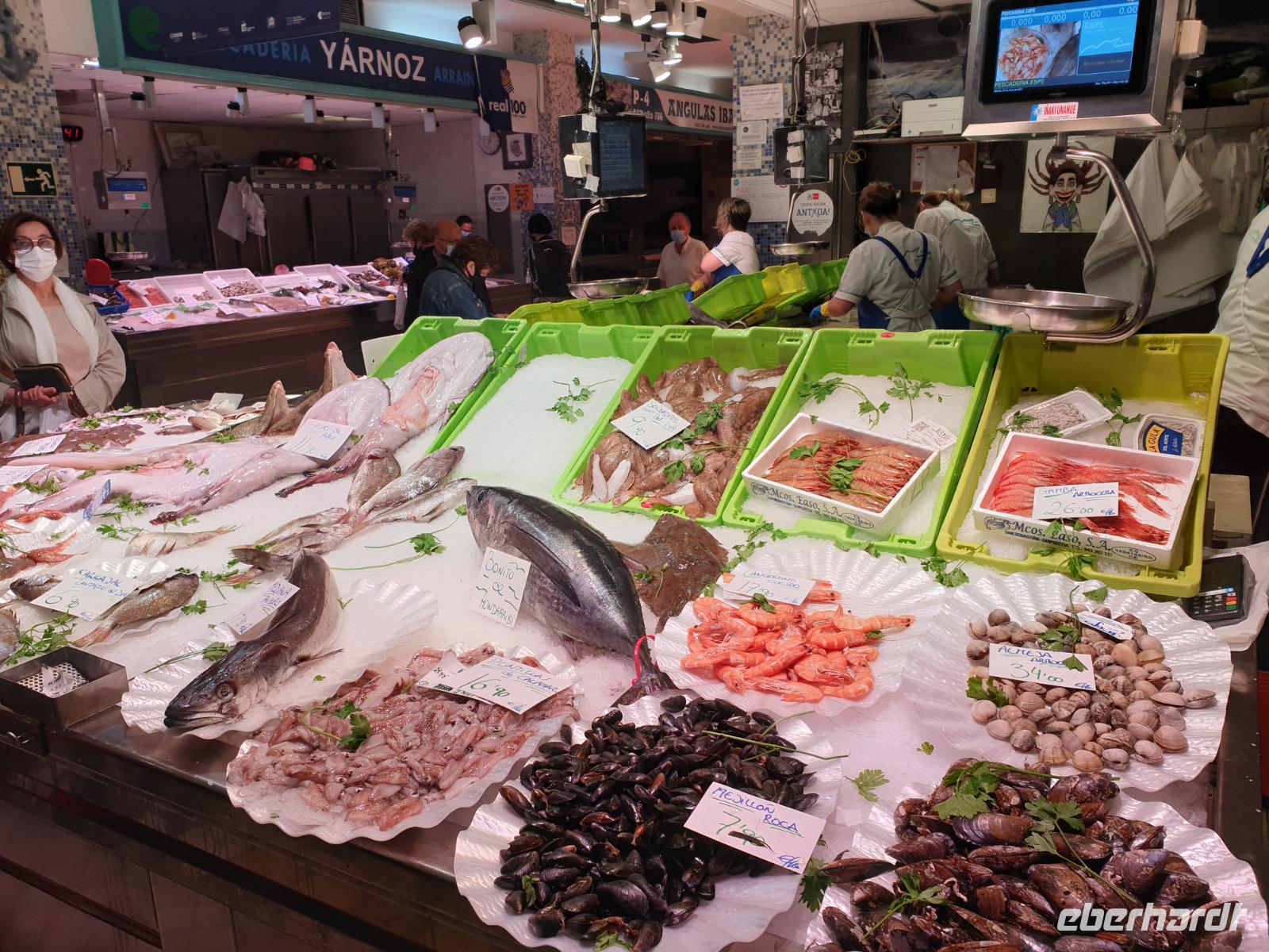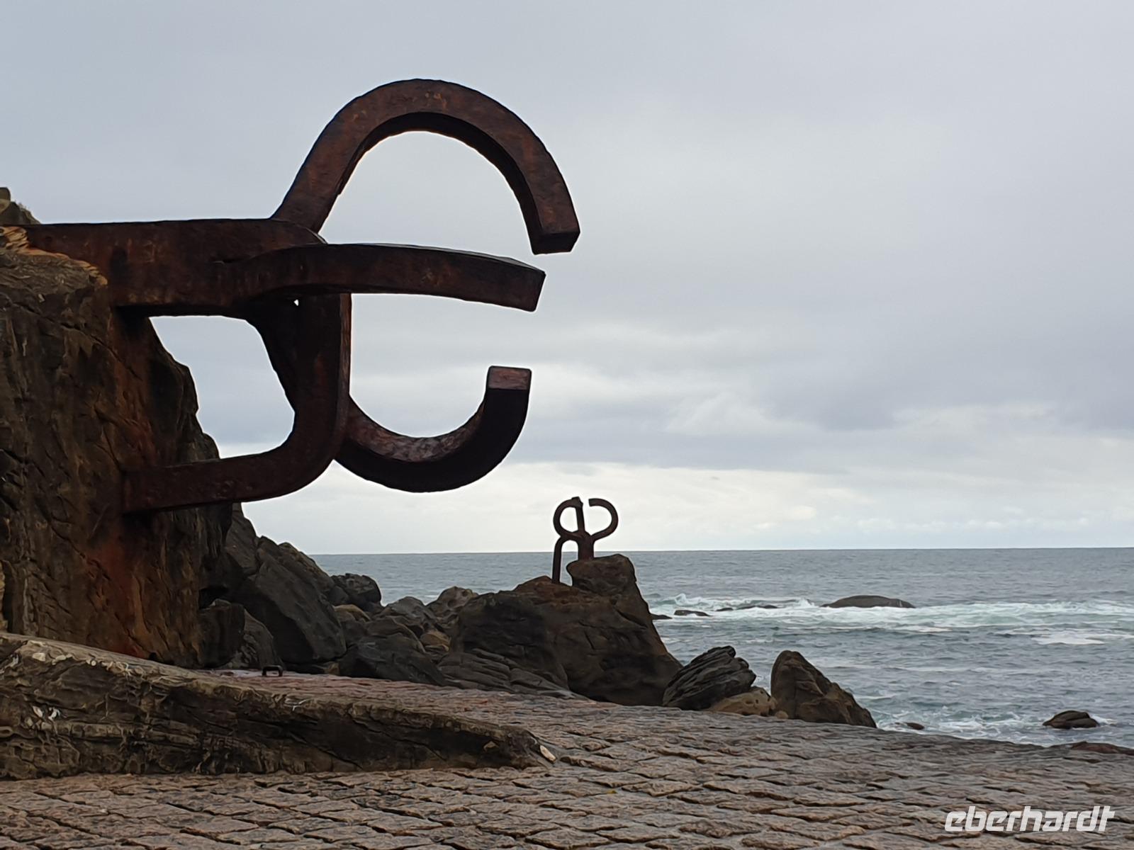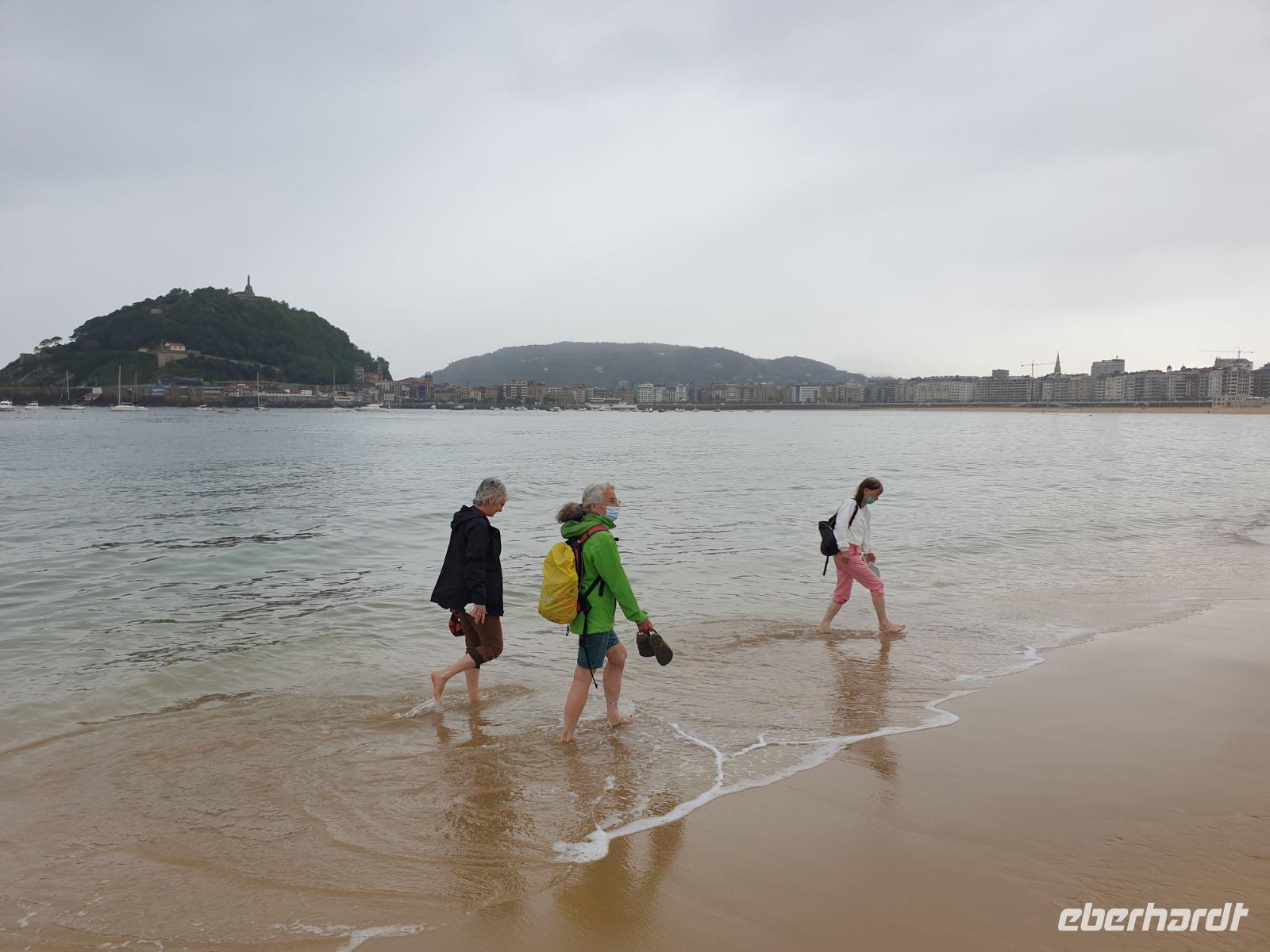 Nach einem guten und reichhaltigen Frühstück beginnen wir mit der ersten kleinen Wanderung an oder sagen wir lieber einem schönen Spaziergang von ca. 3 Kilometern entlang der Strandpromenade. Für Benjamin ist San Sebastian neben Granada die schönste Stadt Spaniens. Das Wetter könnte auch nicht besser sein. Wir fangen die Wanderung am Denkmal Peine de los Vientos (Kamm des Windes). Bis zum Palacio Miramar laufen wir mit Schuhe und dann aber am Strand weiter einige von uns sogar barfuß. Schnell geht Benjamin mit Herr Eberhard (ohne t) ins Wasser. Wir trocken uns ordentlich und weiter in die Altstadt. Nach der Besichtigung der Kirchen Santa Maria del Coro und San Vicente wurde für uns extra an der Markthalle und dann am Strand weiter ein Tapas-Picknick mit Käse, Schinken und Chorizo organisiert. Lecker, oder? In der Markthalle „La Bretxa" erfahren wir, was Tapas , "picotear" und Gazpacho sind. Uns gefällt diese Stadt sehr, die am Atlantik sehr idyllisch an einer weiten Bucht liegt. San Sebastian wird begrenzt von den Felsmassiven des Monte Urgull und Monte Igueldo. Während dem ersten Spaziergang entlang dieses weitläufigen Bogens, der La Concha (oder Muschel) genannten Bucht mit der ca. 1.350 Meter langen Strandpromenade, gehen wir alle ohne Schuhe immer am Meer entlang. Am Ende des Strandes befindet sich hoch auf dem Urgull Berg auf dem Gipfel die Christus-Statue (12,5 Meter hoch) von wo man auch einen schönen Blick auf den Hafen und die Altstadt hat.
