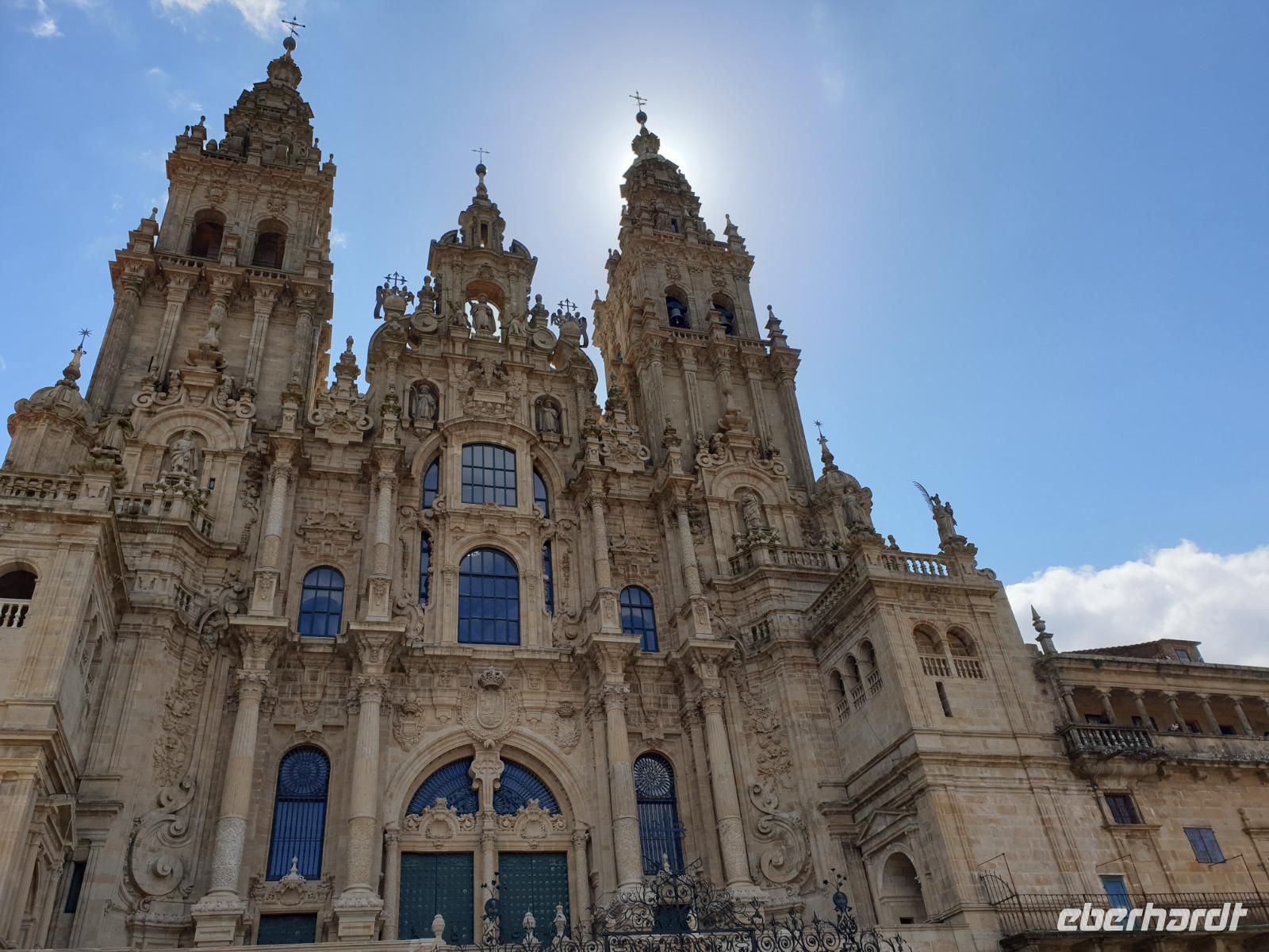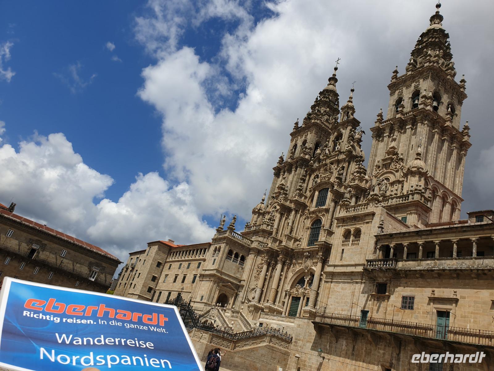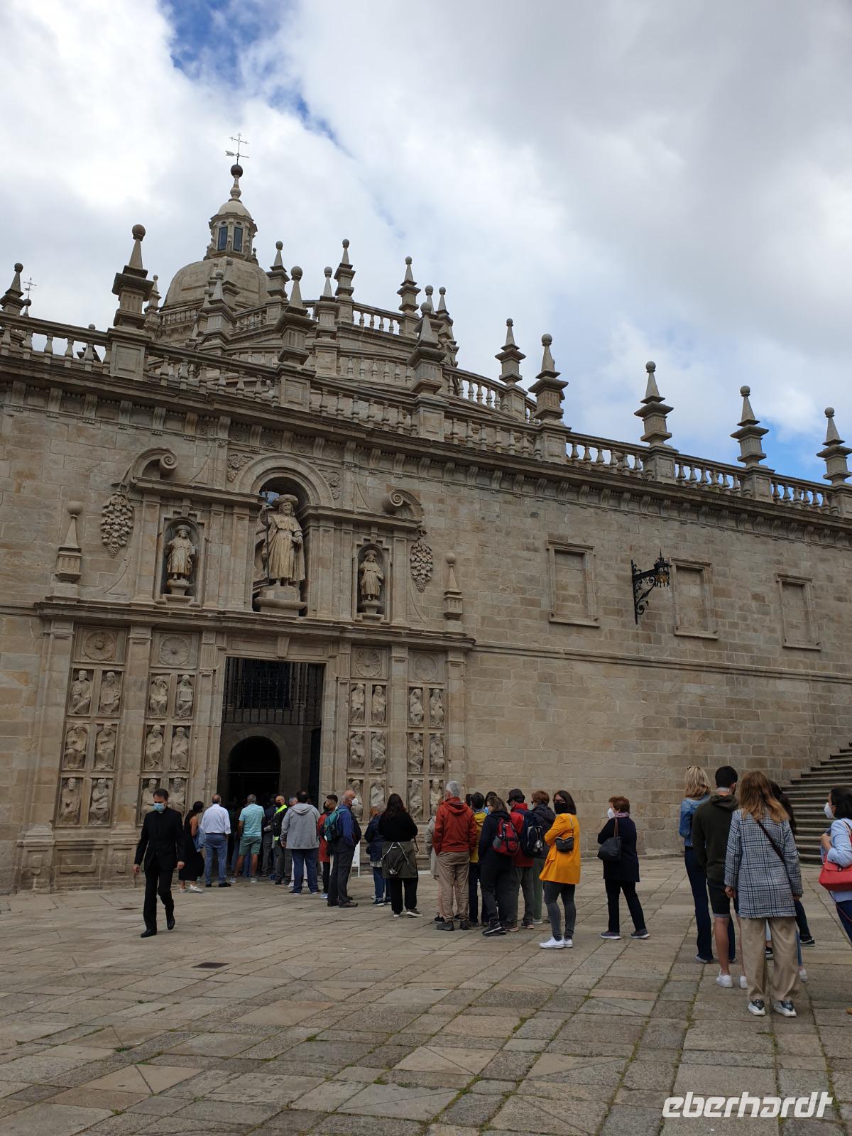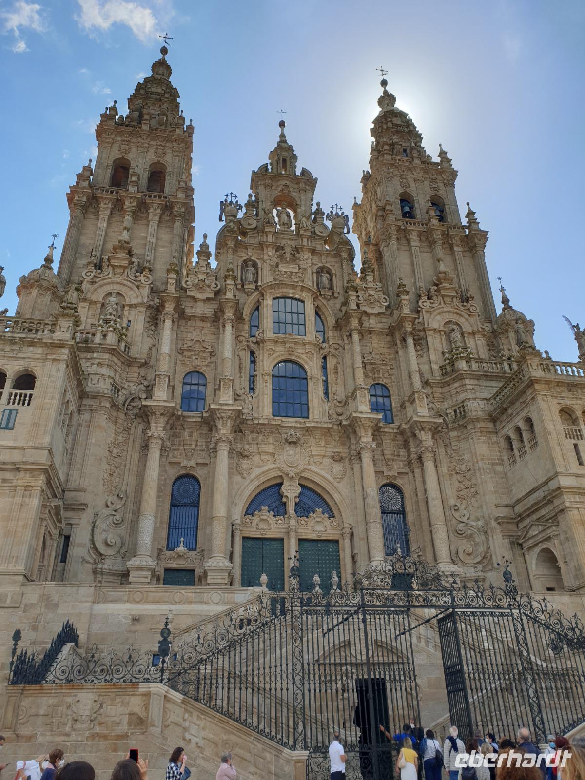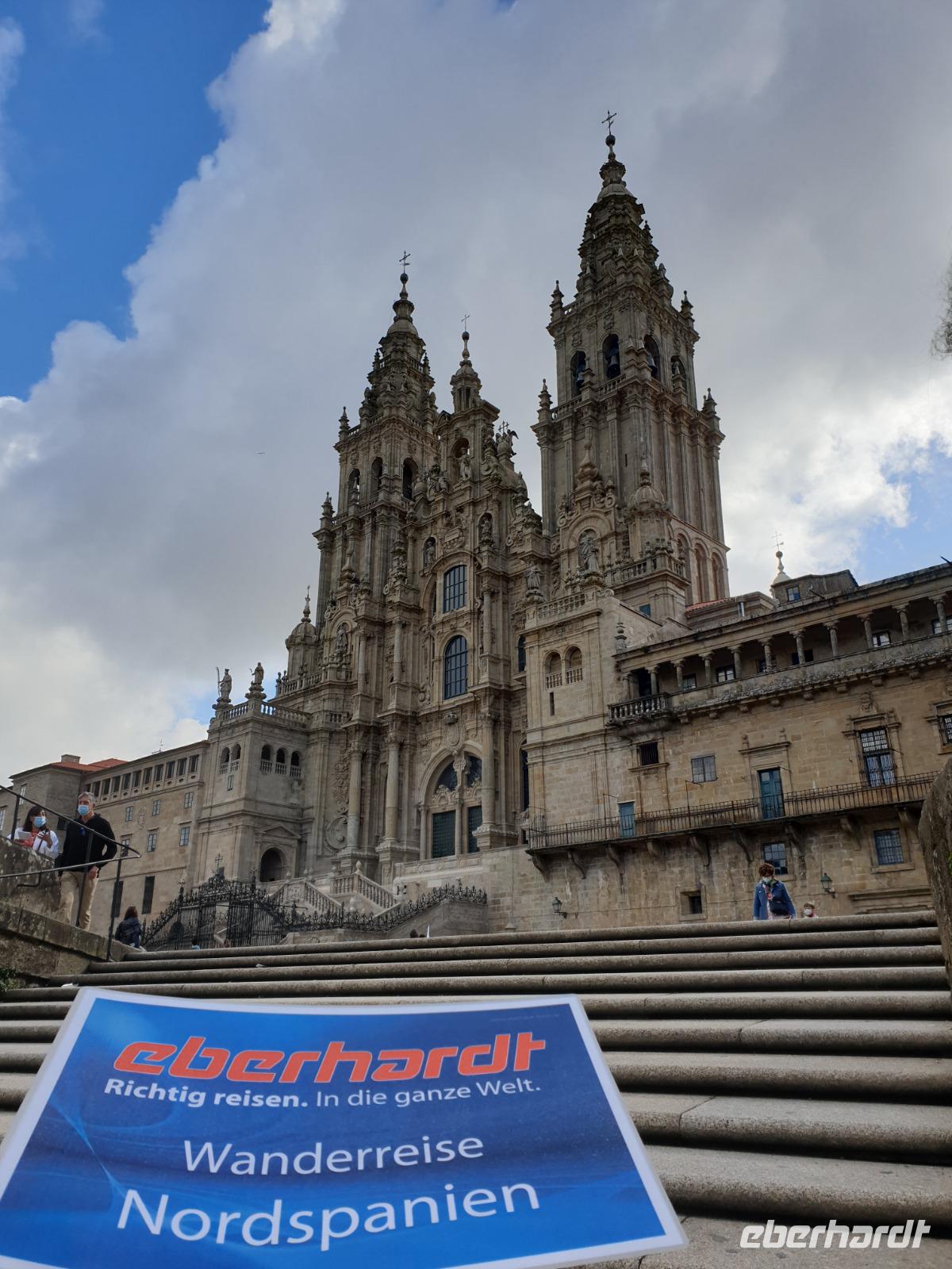 Wir haben unser Ziel erreicht und hören schon die Glocken läuten. 12 Uhr hören wir der Pilgermesse zu. Heute ist die Pilgermesse wegen Corona auf weniger als 300 Plätze drinnen beschränkt. Wir besichtigen auch San Francisco Kirche. Nach mehr als 2 Jahre ist Baustelle in der Kathedrale schon fertig und können in alle Ruhe sie besichtigen. Wegen Corona kann man nicht wie immer dem Aposteln umarmen aber sein Grab kann man immer noch sehen. Was für eine Ruhe hier. Später bei einer Stadtbesichtigung erkunden wir weiter die Altstadt von Santiago de Compostela, die neben der Kathedrale und dem Jakobsweg natürlich auch zum Weltkulturerbe der UNESCO gehört. Eberhardt Travel bietet auch heute wieder eine Überraschung und besorgt für alle Gäste ein Glas Ribeiro Wein um zu feiern, dass man es bis hier her geschafft hat.