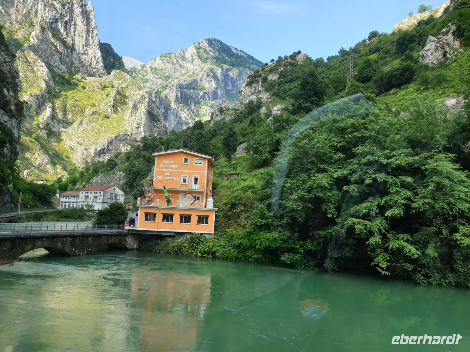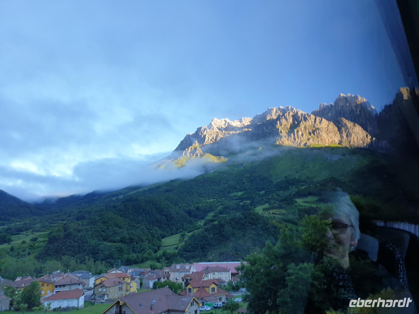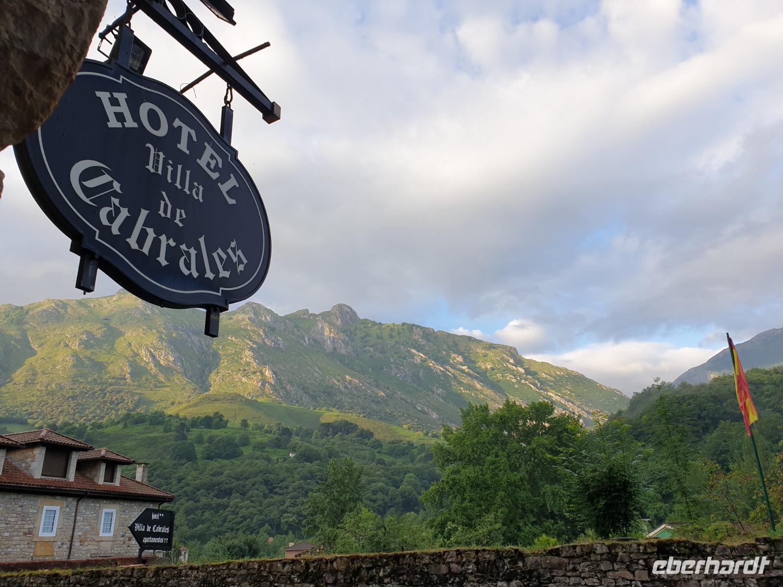 Wir fühlen uns wie in den Alpen. Das sieht genauso aus, oder? Wunderschön! Wer hätte gedacht, dass es solche Hochgipfel und Bergketten bis zu 2.648 Meter im Norden Spaniens, weit entfernt von den Pyrenäen gibt. Wir haben einfach Glück mit dem Wetter durch die Cares Schlucht. Im Posada de Valdeon Tal hängen paar Wolken, dass man alle Gipfel nicht heute sehen kann aber morgen schon. Wir werden sie morgen früh wieder sehen. Angekommen, treffen wir uns am Dorfplatz, um ein Bier zu trinken und damit auf die erste schöne Wanderung anzustoßen. Später im Hotel hat die Besitzerin und seine Familie ein tolles Abendessen für uns vorbereitet. Wir gucken Fußball aber gehen auch heute früh ins Bett, da morgen der Wecker zeitig klingelt.