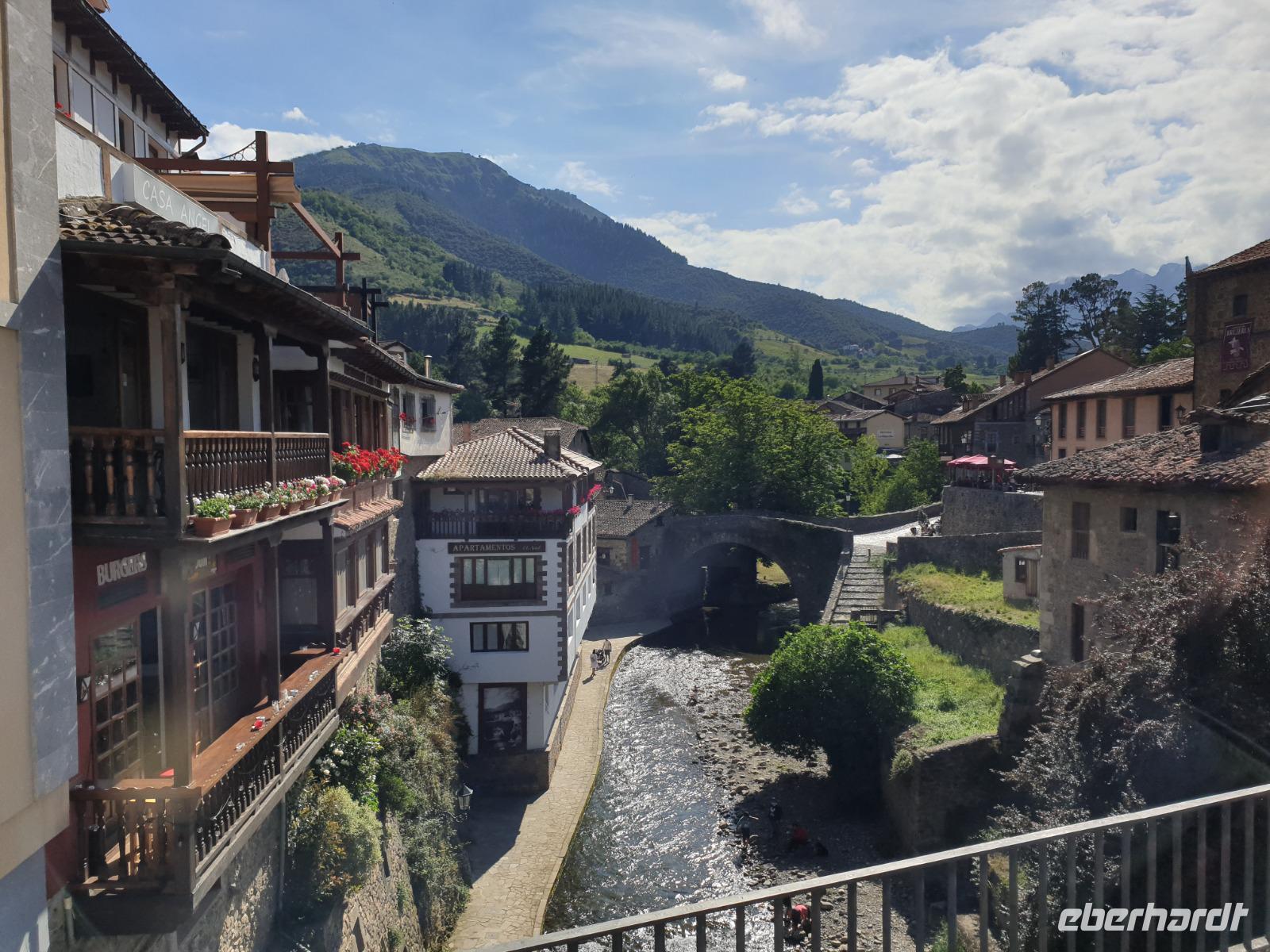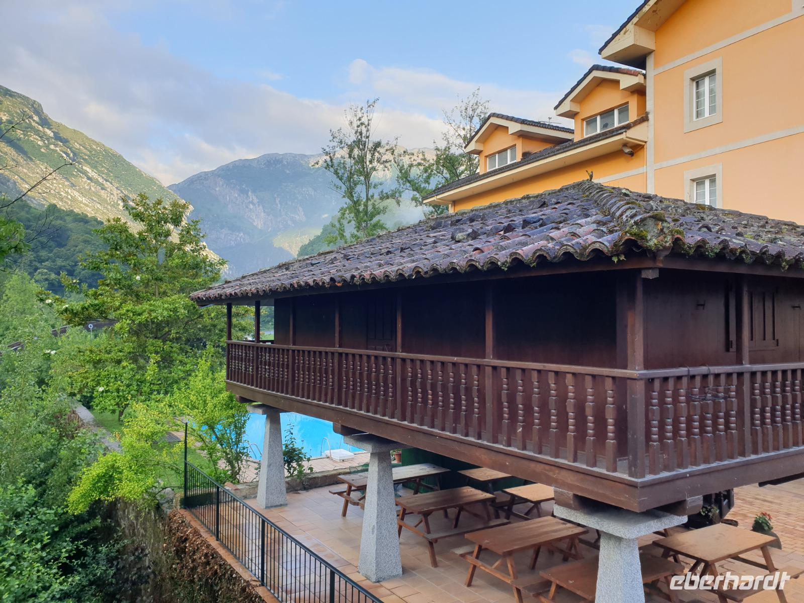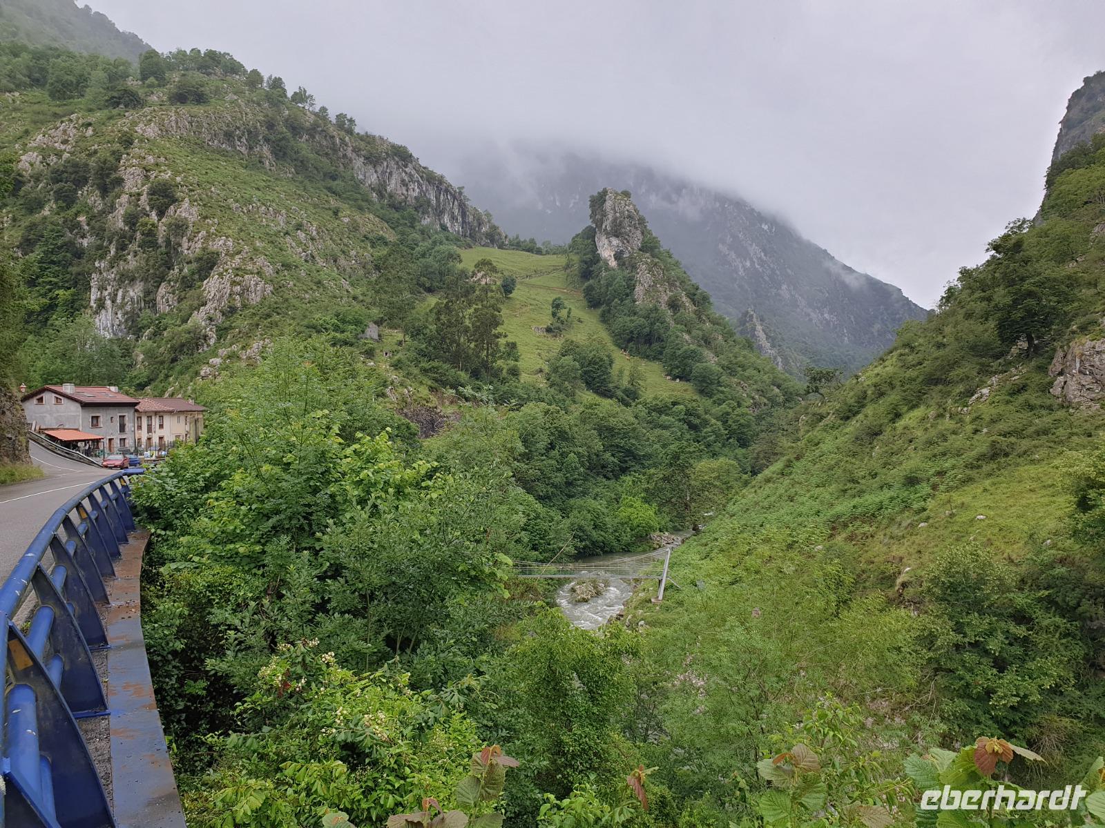 Wir fühlen uns wie in den Alpen. Das sieht genauso aus, oder? Wunderschön! Wer hätte gedacht, dass es solche Hochgipfel und Bergketten bis zu 2.648 Meter im Norden Spaniens, weit entfernt von den Pyrenäen gibt. Wir haben einfach Glück mit dem Wetter durch die Cares Schlucht. Im Posada de Valdeon Tal hängen paar Wolken, dass man alle Gipfel nicht heute sehen kann aber morgen schon. Wir werden sie morgen früh wieder sehen. Angekommen, treffen wir uns am Dorfplatz, um ein Bier zu trinken und damit auf die erste schöne Wanderung anzustoßen. Später im Hotel hat die Besitzerin und seine Familie ein tolles Abendessen für uns vorbereitet. Wir gucken Fußball aber gehen auch heute früh ins Bett, da morgen der Wecker zeitig klingelt.