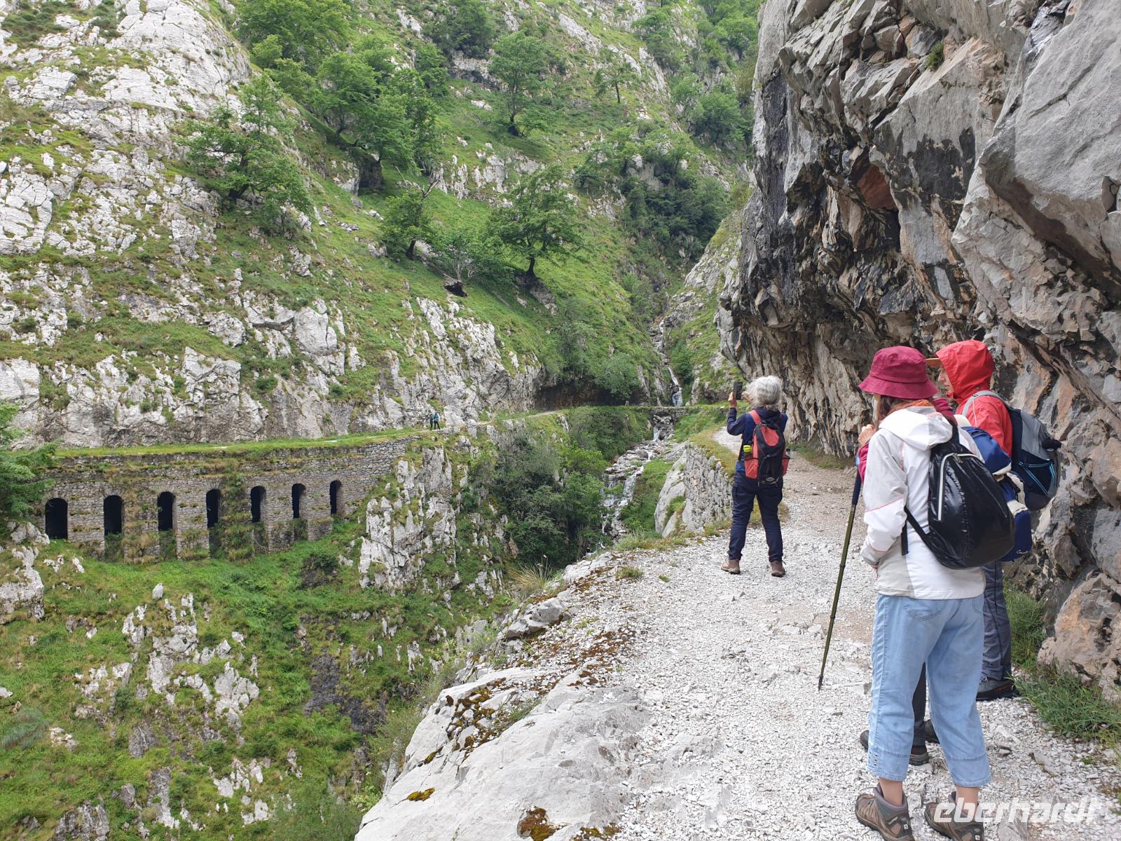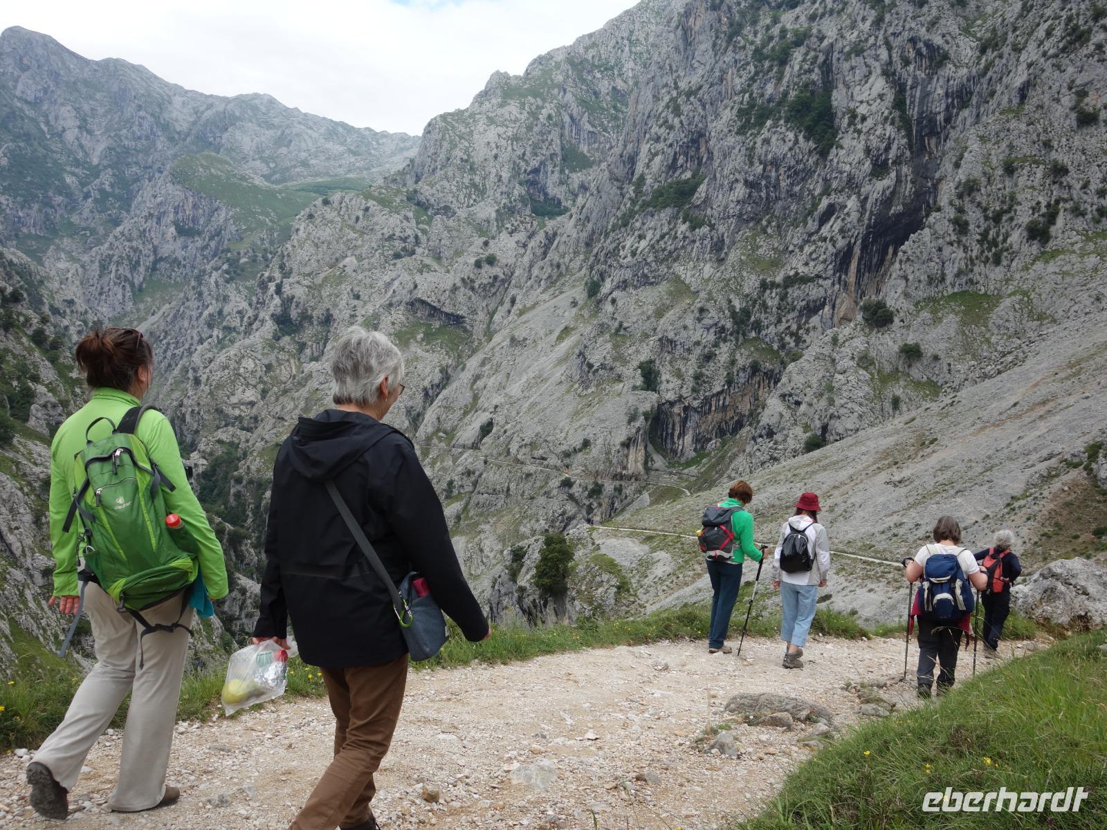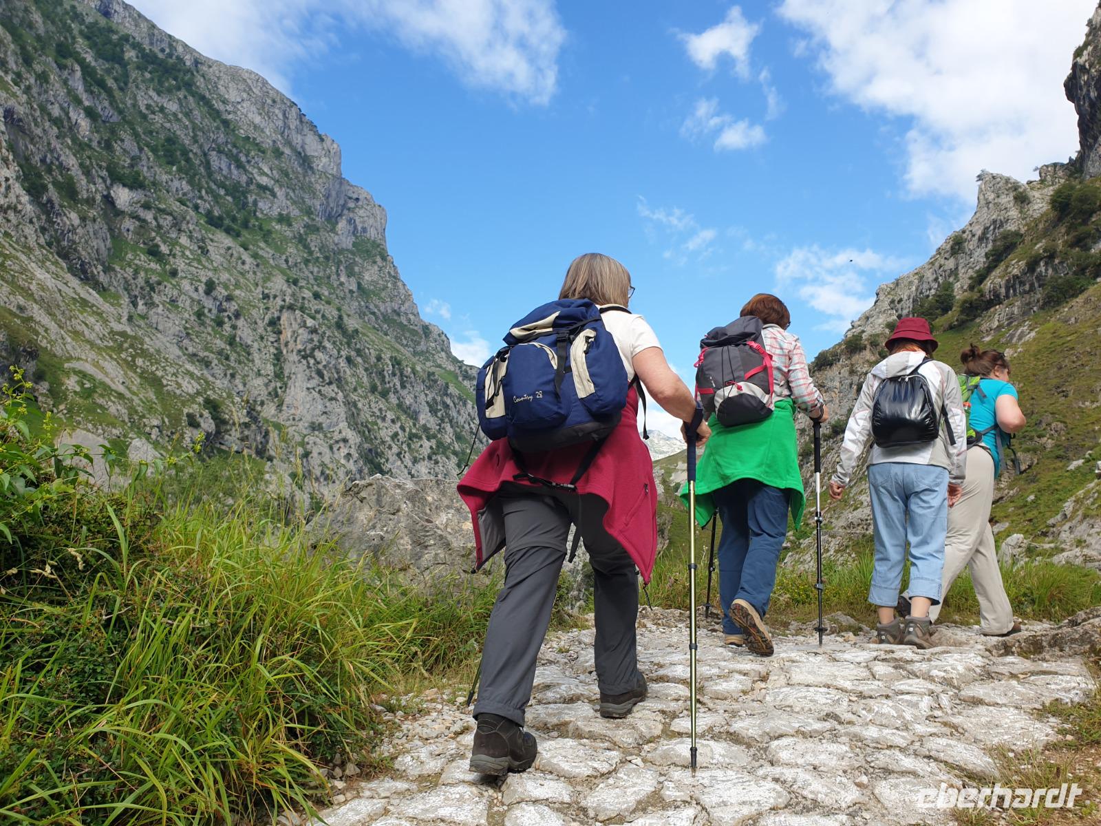Wir verteilen im Bus unser Picknick. Brötchen, Obst, Saft und einen Snack mit Müslie Riegel dazu. Nach dem Frühstück schnüren wir zum ersten Mal richtig unsere Wanderschuhe. Wir fahren zur Wasserkraftanlage von Poncebos, der Tür zum Nationalpark Picos de Europa und beginnen hier unsere Wanderreise mit einer 12 Kilometer langen tollen und leichten Wanderung durch die atemberaubende Cares Schlucht (die berühmte Ruta del Cares), die uns bis Cain bringt. Die Ruta del Cares ist einer der bekanntesten Wanderwege zwischen Asturien und Leon und verläuft im mittleren und östlichen Teil des Picos de Europa. Die erste Stunde der Wanderung war nicht gerade flach, aber nachdem wir den höchsten Punkt erreicht haben, können wir diese tolle Landschaft genießen. Während der Wanderung machen wir verschiedene Pausen, eine davon als Picknickpause mit unseren mitgebrachten spanischen Omelettbrötchen, Saft, einem Müsli-Riegel und einem Stück Obst. Uns gefällt die Natur hier inmitten einer der schönsten Schluchten Spaniens. Doch das Schönste kommt am Ende und wir lassen uns überraschen: Der Cares-Klamm! Man könnte sagen, es ist wie eine Wanderung durch eine "göttliche" Schlucht, oder? Angekommen in Cain, trinken viele von uns zum ersten Mal einen Tinto de Verano (Mischung aus Rotwein und Sprite) mit Oliven als Tapas. Wir befinden uns nicht mehr in Asturien sondern in Leon. Die Grenze ist ungefähr in der Mitte der Schlucht-Wanderung. Am Ende warten auf uns die Taxis, um uns bis Posada de Valdeon zu bringen, der Bus darf und kann bis Cain nicht fahren. Wenn man will kann man auch weiter noch nach oben bis Posada de Valdeon zu Fuß, wo sich unser Hotel Cumbres de Valdeon befindet. Für diejenigen, welche 12 Kilometer wandern nicht genug sind, bieten sich die 9 Kilometer von Cain bis Posada de Valdeon, durch das Tal im Herzen des Nationalparks an, einfach herrlich! 2 von uns trauen sich mit Benjamin dazu aber nur bis El Tombo Aussichtspunkt und dann weiter mit Taxi bis zum Hotel.