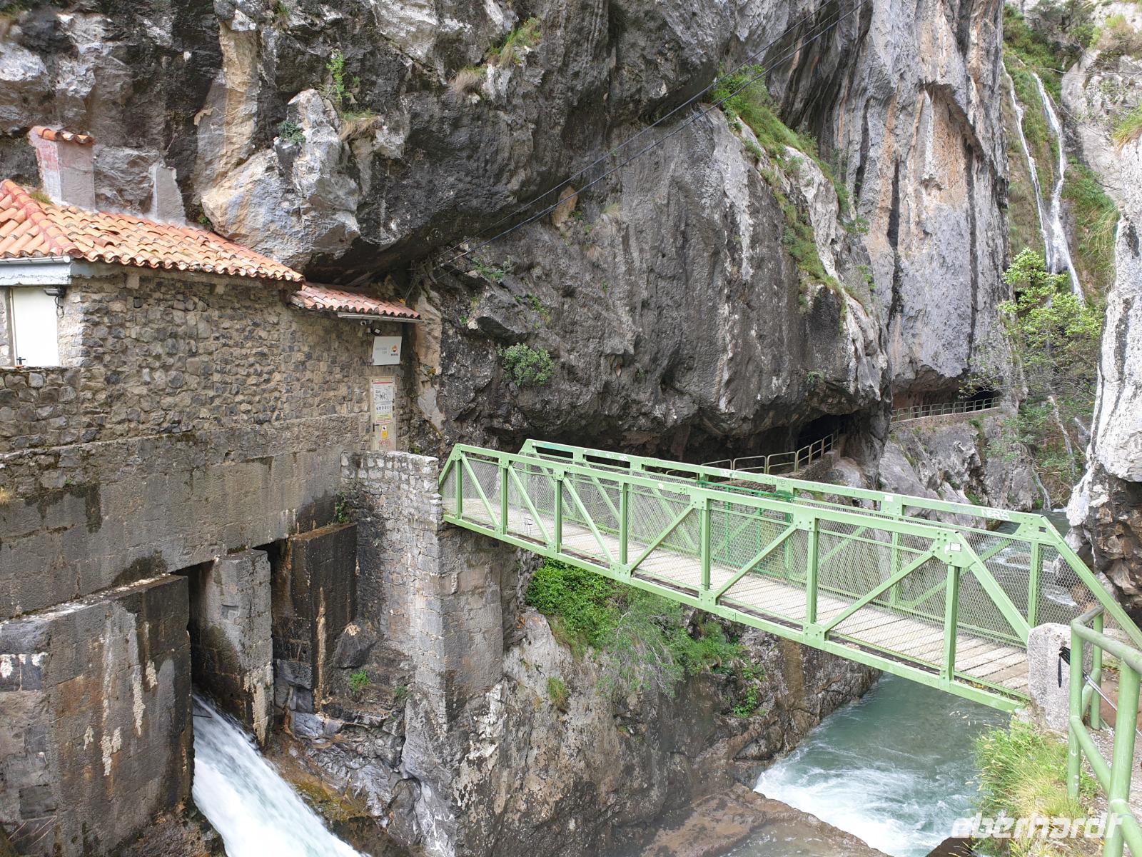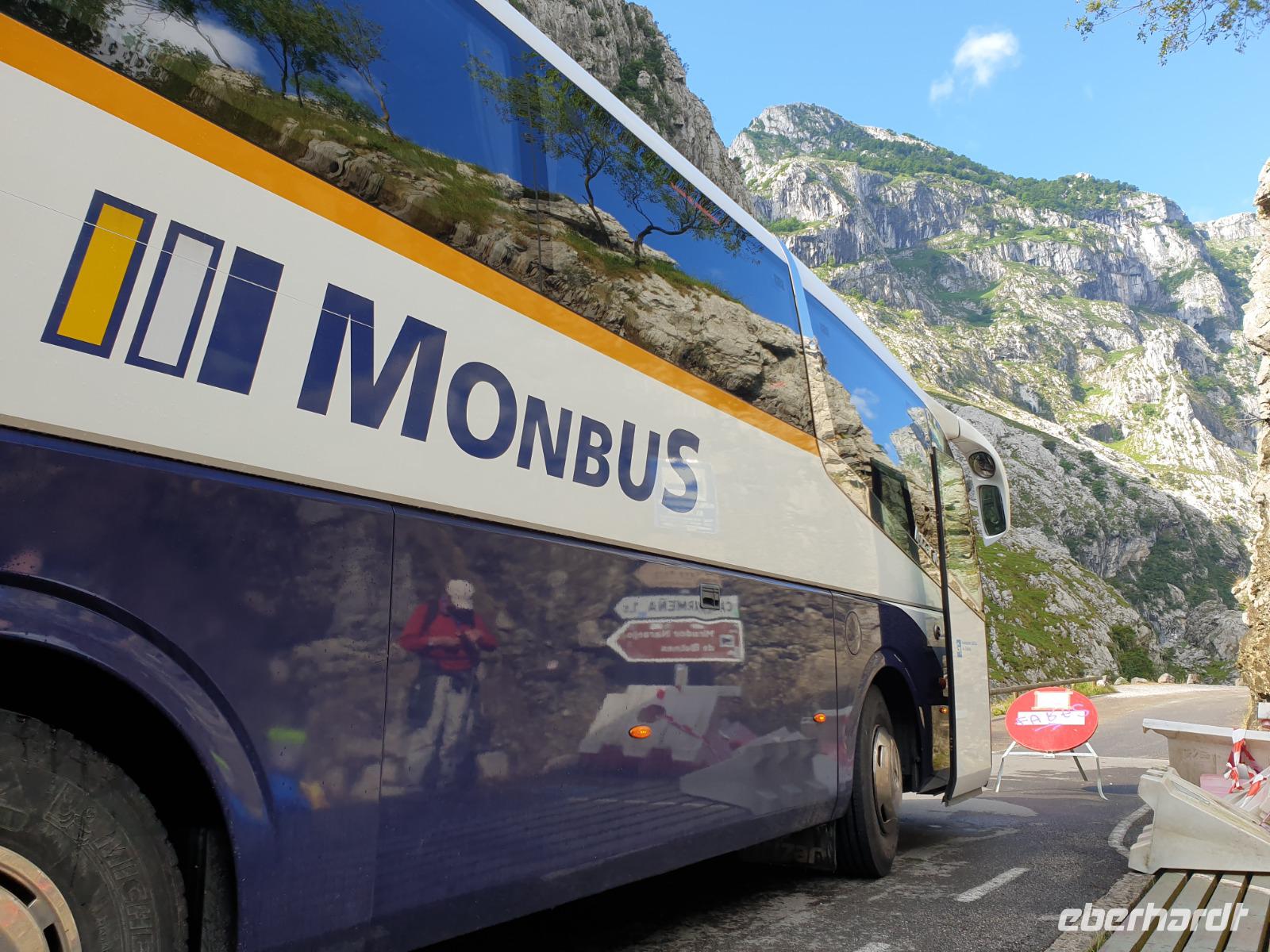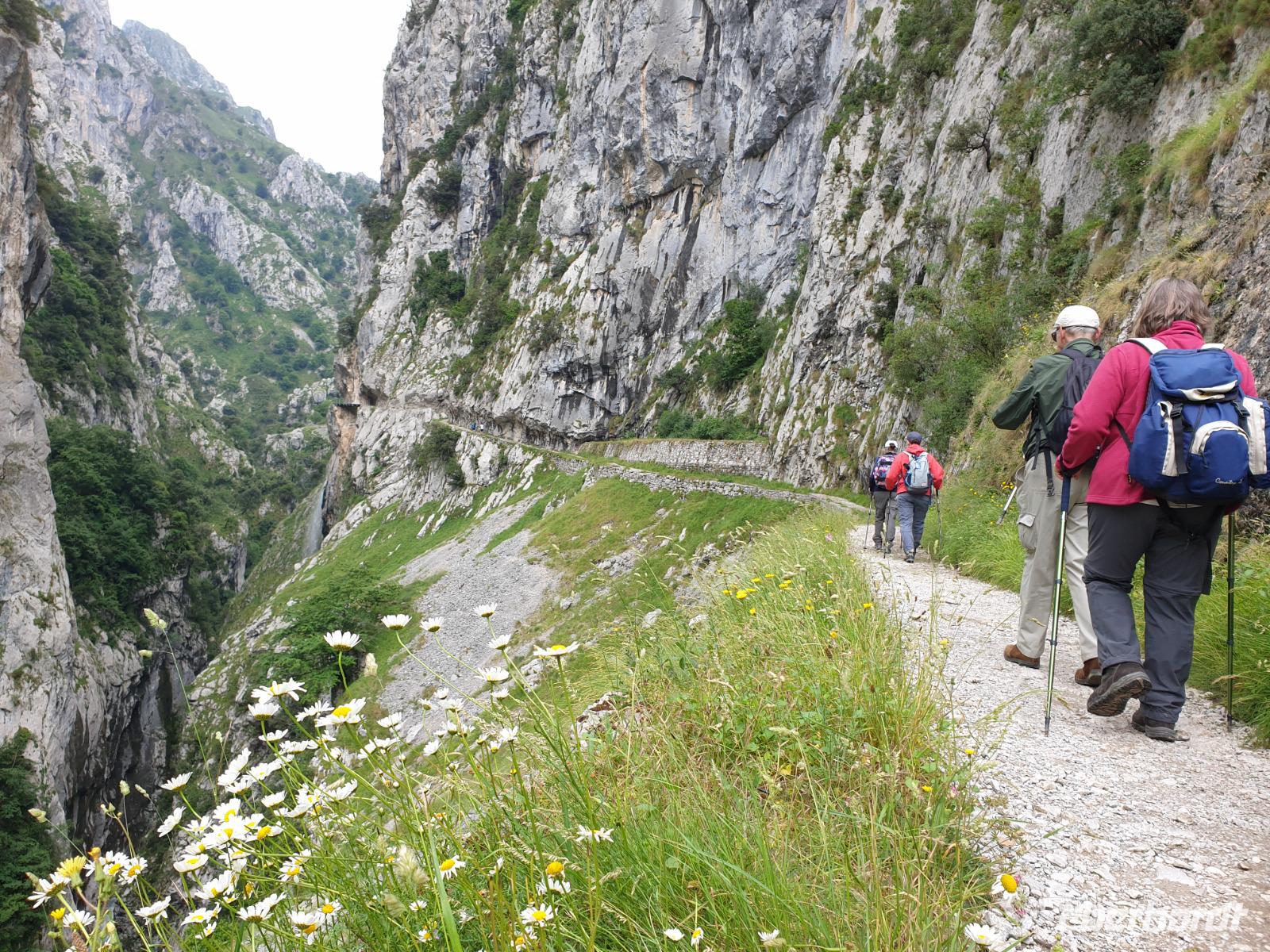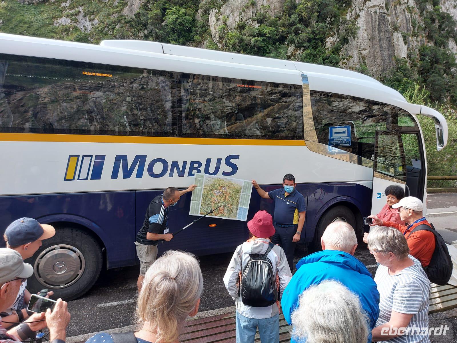 Wir verteilen im Bus unser Picknick. Brötchen, Obst, Saft und einen Snack mit Müslie Riegel dazu. Nach dem Frühstück schnüren wir zum ersten Mal richtig unsere Wanderschuhe. Wir fahren zur Wasserkraftanlage von Poncebos, der Tür zum Nationalpark Picos de Europa und beginnen hier unsere Wanderreise mit einer 12 Kilometer langen tollen und leichten Wanderung durch die atemberaubende Cares Schlucht (die berühmte Ruta del Cares), die uns bis Cain bringt. Die Ruta del Cares ist einer der bekanntesten Wanderwege zwischen Asturien und Leon und verläuft im mittleren und östlichen Teil des Picos de Europa. Die erste Stunde der Wanderung war nicht gerade flach, aber nachdem wir den höchsten Punkt erreicht haben, können wir diese tolle Landschaft genießen. Während der Wanderung machen wir verschiedene Pausen, eine davon als Picknickpause mit unseren mitgebrachten spanischen Omelettbrötchen, Saft, einem Müsli-Riegel und einem Stück Obst. Uns gefällt die Natur hier inmitten einer der schönsten Schluchten Spaniens. Doch das Schönste kommt am Ende und wir lassen uns überraschen: Der Cares-Klamm! Man könnte sagen, es ist wie eine Wanderung durch eine "göttliche" Schlucht, oder? Angekommen in Cain, trinken viele von uns zum ersten Mal einen Tinto de Verano (Mischung aus Rotwein und Sprite) mit Oliven als Tapas. Wir befinden uns nicht mehr in Asturien sondern in Leon. Die Grenze ist ungefähr in der Mitte der Schlucht-Wanderung. Am Ende warten auf uns die Taxis, um uns bis Posada de Valdeon zu bringen, der Bus darf und kann bis Cain nicht fahren. Wenn man will kann man auch weiter noch nach oben bis Posada de Valdeon zu Fuß, wo sich unser Hotel Cumbres de Valdeon befindet. Für diejenigen, welche 12 Kilometer wandern nicht genug sind, bieten sich die 9 Kilometer von Cain bis Posada de Valdeon, durch das Tal im Herzen des Nationalparks an, einfach herrlich! 2 von uns trauen sich mit Benjamin dazu aber nur bis El Tombo Aussichtspunkt und dann weiter mit Taxi bis zum Hotel.