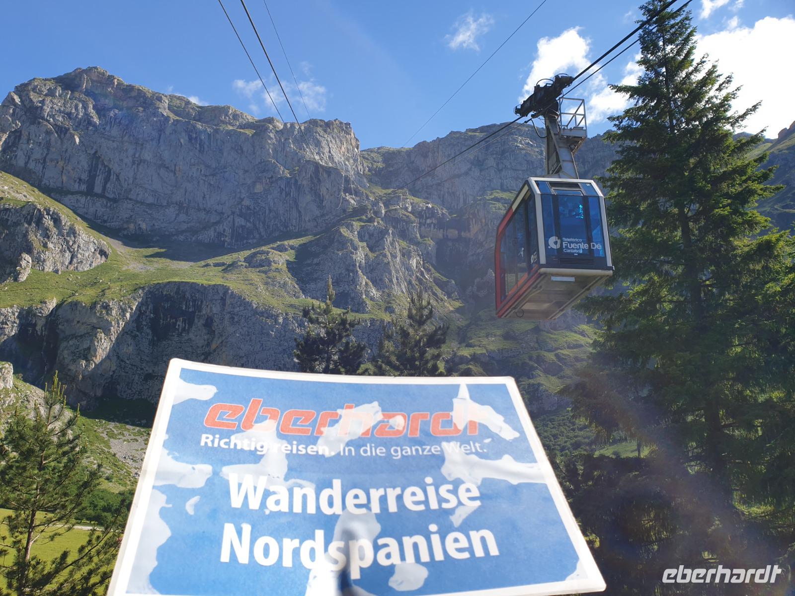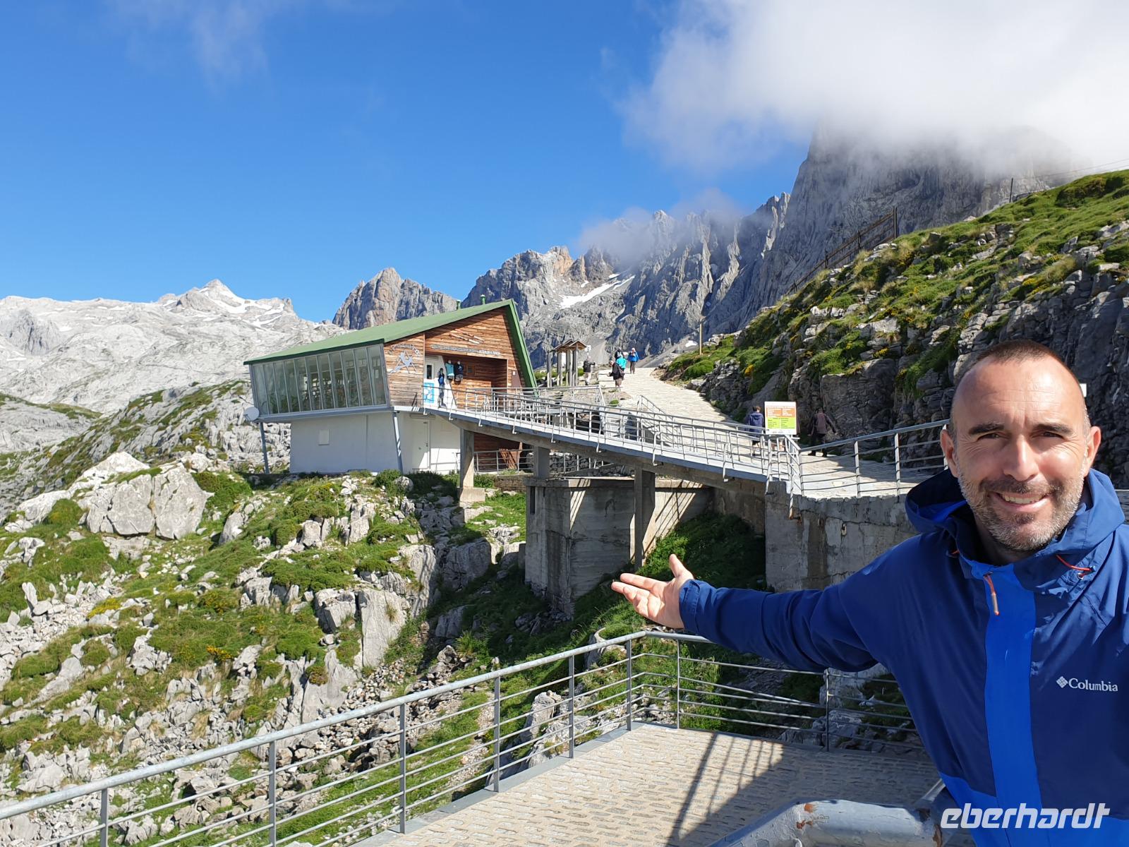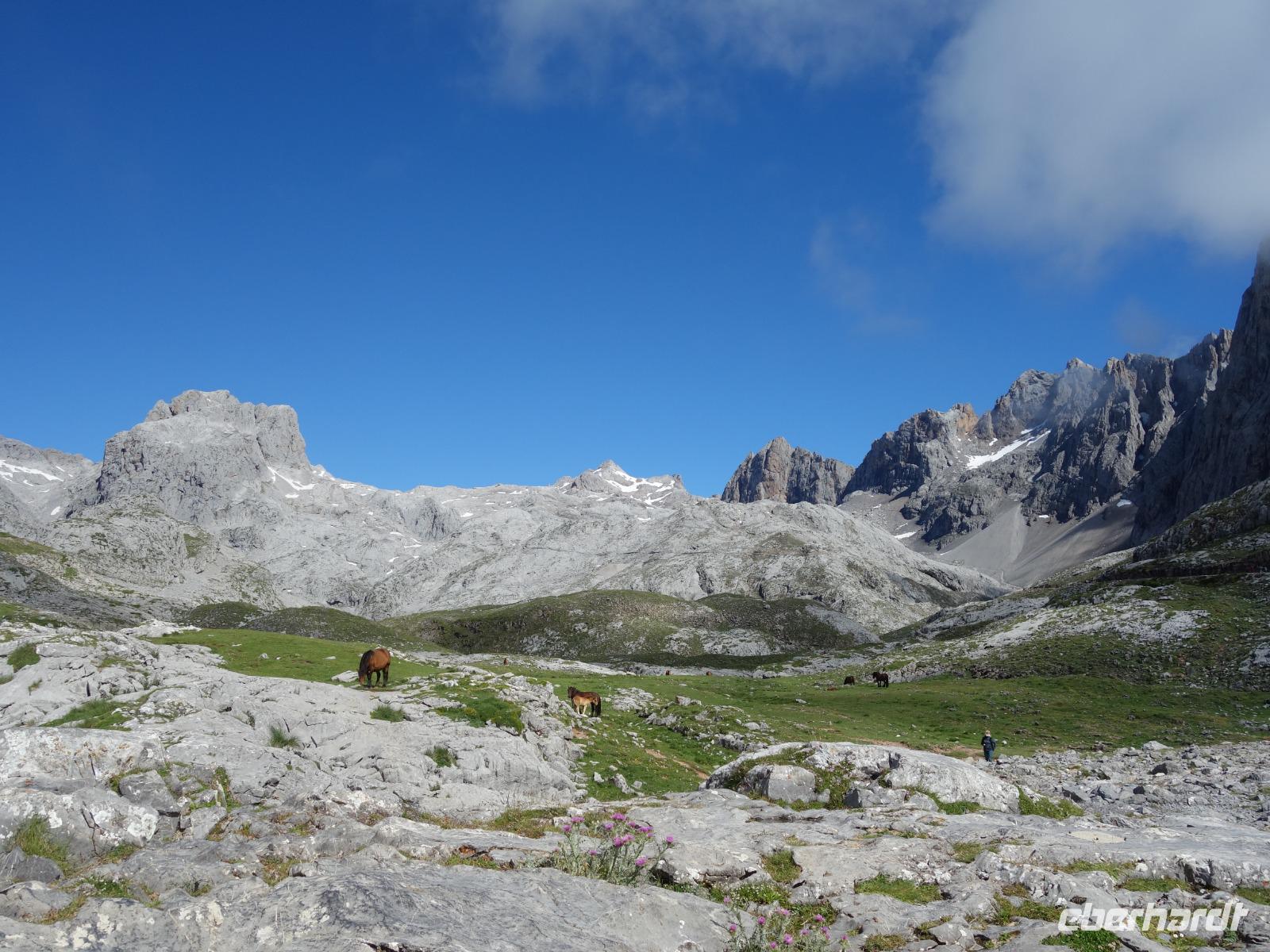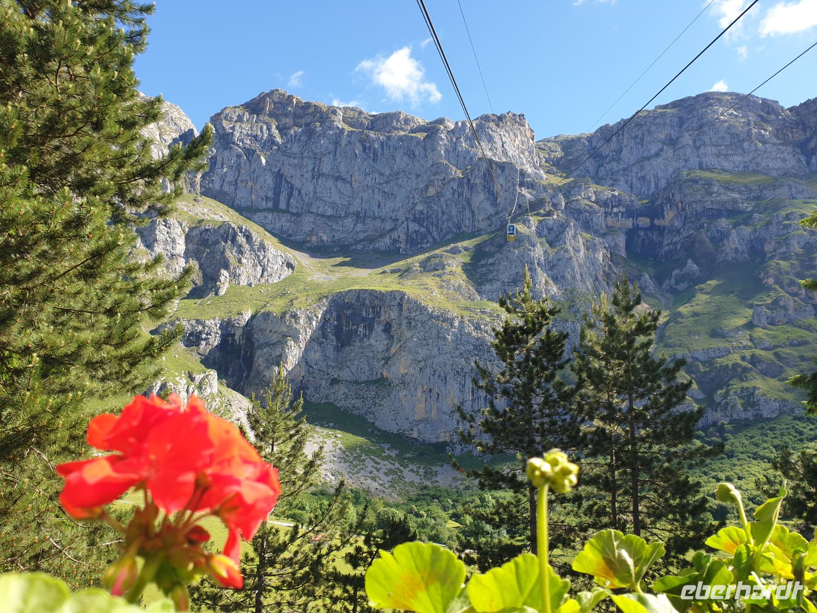 Nachdem wir mit der Seilbahn in Fuente De 753 Meter hochgefahren sind, unternehmen wir hier oben auf 1.823 Meter eine unvergessliche Wanderung im Herzen des Picos de Europa. Wir fühlen uns wieder wie in den Alpen und haben echt so ein Glück mit dem Wetter. Nur Sonne!! Vor uns können wir bizarre Faltengebirge und ausgeprägte Karstlandschaften sehen, die durch das Zusammenstoßen der Iberischen Halbinsel mit der afrikanischen Platte entstanden sind. Wir sehen heute einige von den etwa 200 Gipfeln, die sich im Picos de Europa auf einer sehr kompakten Fläche in über 2.000 Metern Höhe befinden! Der höchste Gipfel dieses Gebirges ist mit 2.648 Metern der Torre de Cerredo. Gemeinsam mit Oscar entdecken wir diese herrlichen und hohen Berge. Wir wandern vom Aussichtspunkt El Cable oberhalb von Fuente bis Aliva zur Berghütte, wo wir unsere Mittagspause machen. Auf dem Weg singen wir: "Herrliche Berge, sonnige Höhen, Bergvagabunden sind wir". Die Landschaft hier oben ist so toll. Wir wandern gemeinsam mit wilden Pferden und Kühen durch schöne, grüne Wiesen unterhalb des schneebedeckten Gipfels.