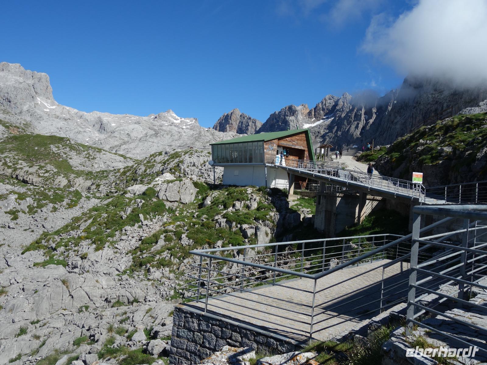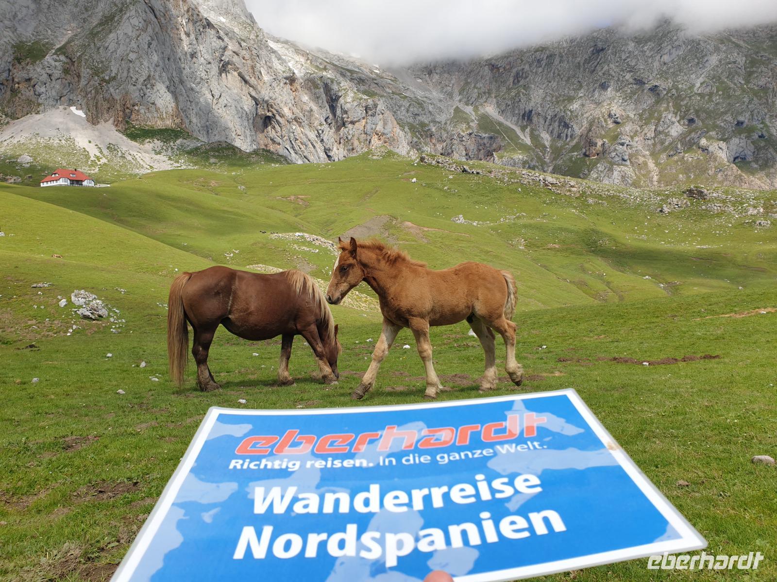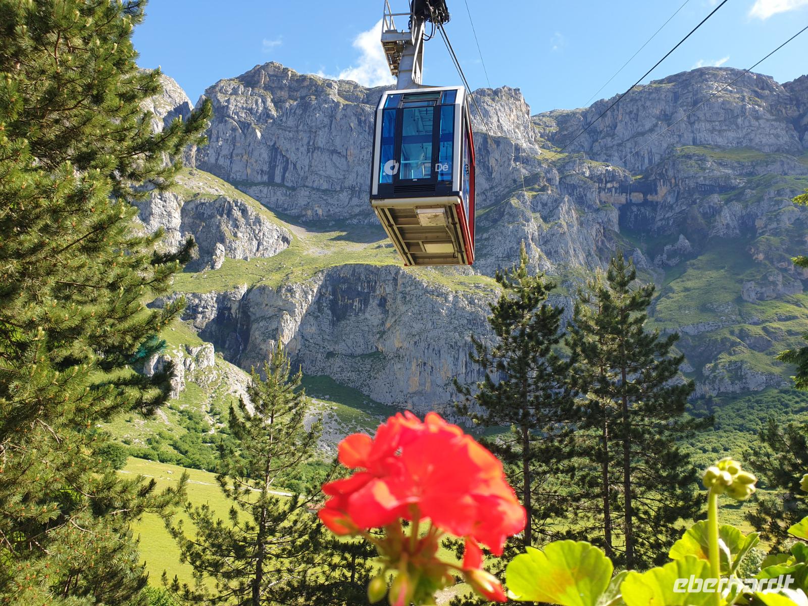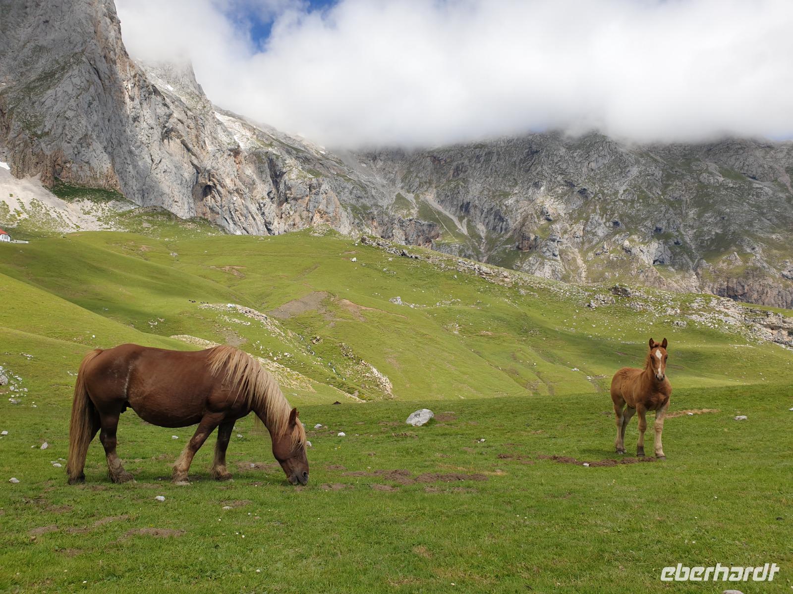 Nachdem wir mit der Seilbahn in Fuente De 753 Meter hochgefahren sind, unternehmen wir hier oben auf 1.823 Meter eine unvergessliche Wanderung im Herzen des Picos de Europa. Wir fühlen uns wieder wie in den Alpen und haben echt so ein Glück mit dem Wetter. Nur Sonne!! Vor uns können wir bizarre Faltengebirge und ausgeprägte Karstlandschaften sehen, die durch das Zusammenstoßen der Iberischen Halbinsel mit der afrikanischen Platte entstanden sind. Wir sehen heute einige von den etwa 200 Gipfeln, die sich im Picos de Europa auf einer sehr kompakten Fläche in über 2.000 Metern Höhe befinden! Der höchste Gipfel dieses Gebirges ist mit 2.648 Metern der Torre de Cerredo. Gemeinsam mit Oscar entdecken wir diese herrlichen und hohen Berge. Wir wandern vom Aussichtspunkt El Cable oberhalb von Fuente bis Aliva zur Berghütte, wo wir unsere Mittagspause machen. Auf dem Weg singen wir: "Herrliche Berge, sonnige Höhen, Bergvagabunden sind wir". Die Landschaft hier oben ist so toll. Wir wandern gemeinsam mit wilden Pferden und Kühen durch schöne, grüne Wiesen unterhalb des schneebedeckten Gipfels.