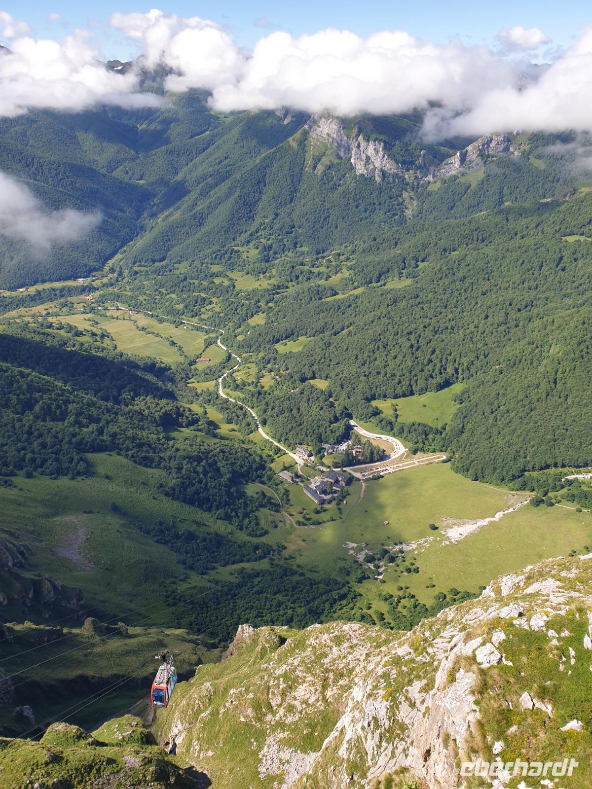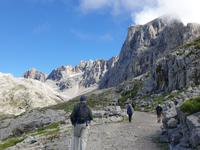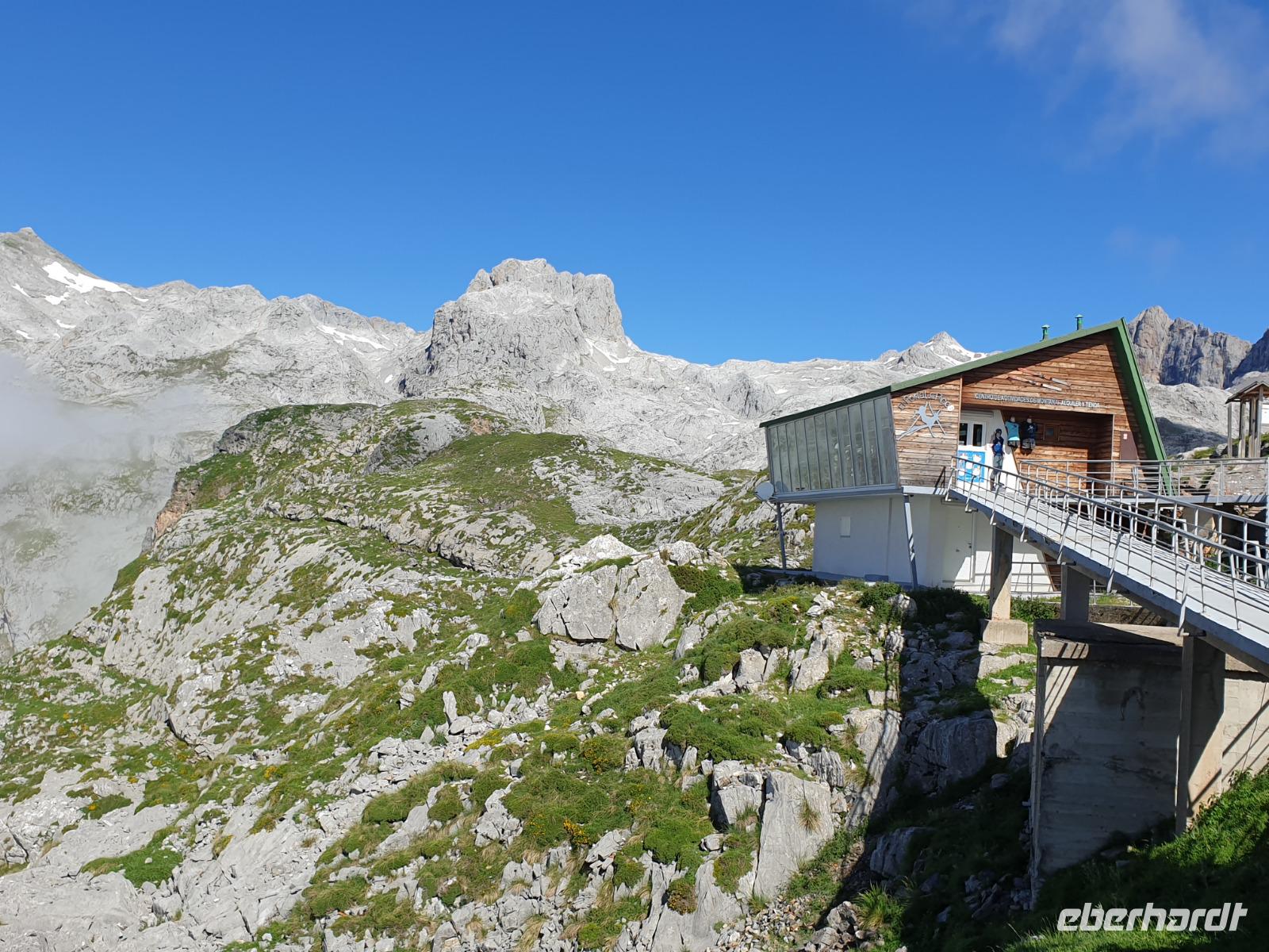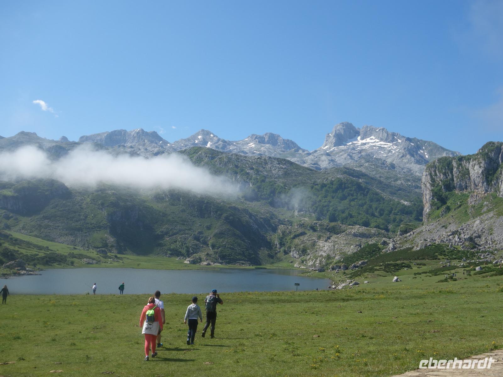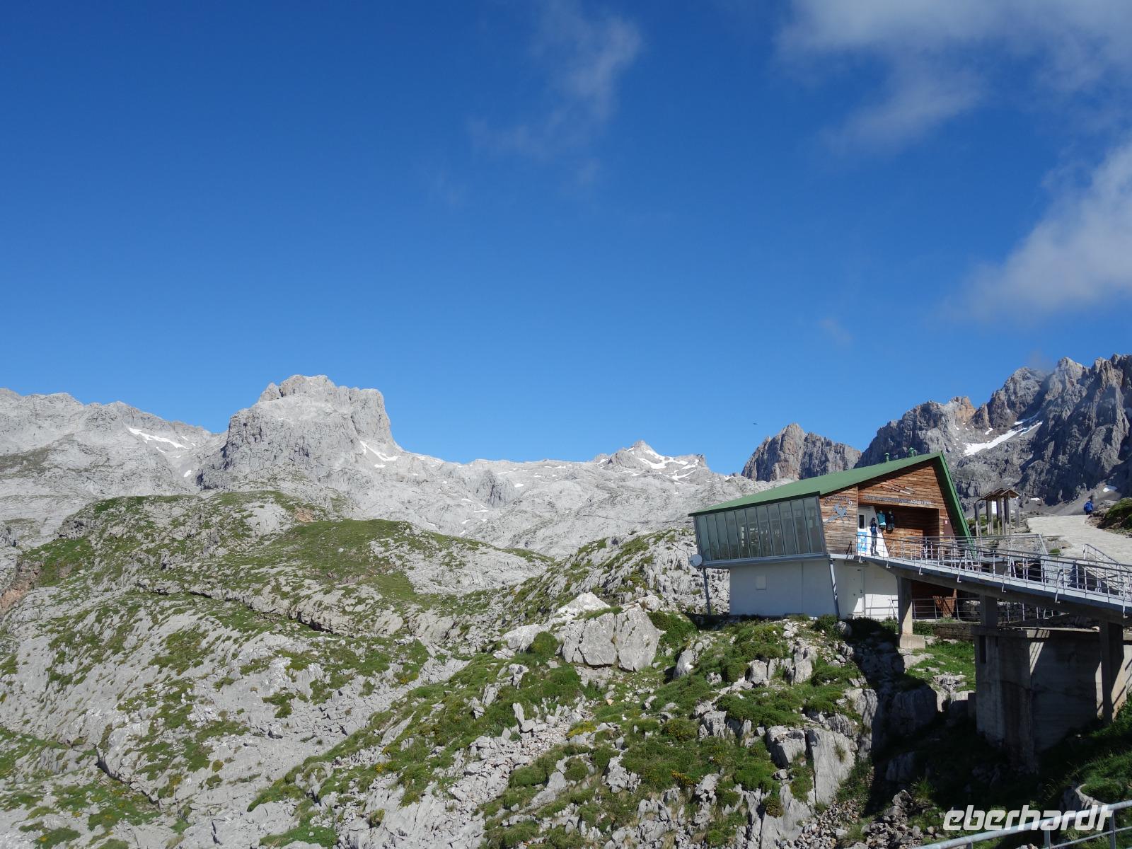 Nachdem wir mit der Seilbahn in Fuente De 753 Meter hochgefahren sind, unternehmen wir hier oben auf 1.823 Meter eine unvergessliche Wanderung im Herzen des Picos de Europa. Wir fühlen uns wieder wie in den Alpen und haben echt so ein Glück mit dem Wetter. Nur Sonne!! Vor uns können wir bizarre Faltengebirge und ausgeprägte Karstlandschaften sehen, die durch das Zusammenstoßen der Iberischen Halbinsel mit der afrikanischen Platte entstanden sind. Wir sehen heute einige von den etwa 200 Gipfeln, die sich im Picos de Europa auf einer sehr kompakten Fläche in über 2.000 Metern Höhe befinden! Der höchste Gipfel dieses Gebirges ist mit 2.648 Metern der Torre de Cerredo. Gemeinsam mit Oscar entdecken wir diese herrlichen und hohen Berge. Wir wandern vom Aussichtspunkt El Cable oberhalb von Fuente bis Aliva zur Berghütte, wo wir unsere Mittagspause machen. Auf dem Weg singen wir: "Herrliche Berge, sonnige Höhen, Bergvagabunden sind wir". Die Landschaft hier oben ist so toll. Wir wandern gemeinsam mit wilden Pferden und Kühen durch schöne, grüne Wiesen unterhalb des schneebedeckten Gipfels.