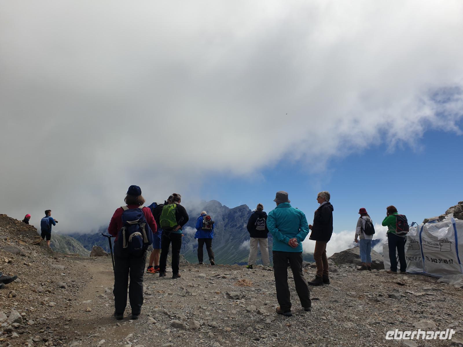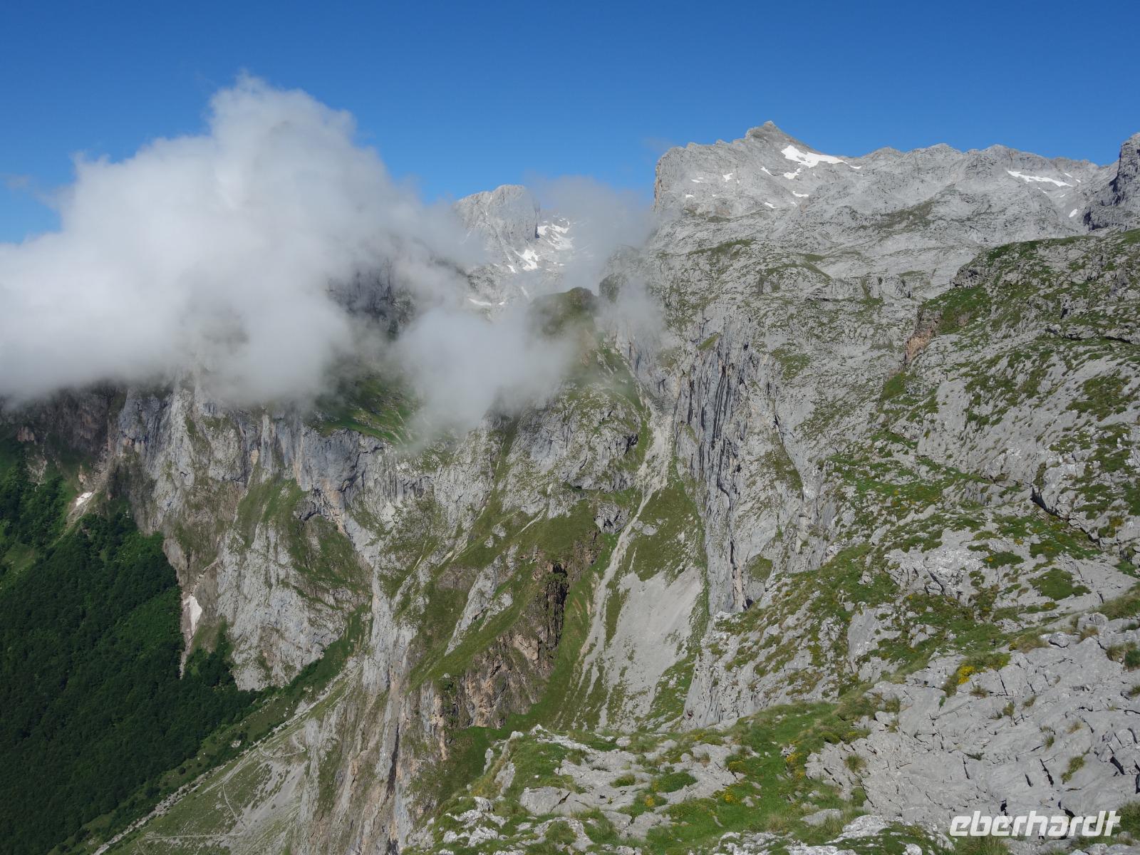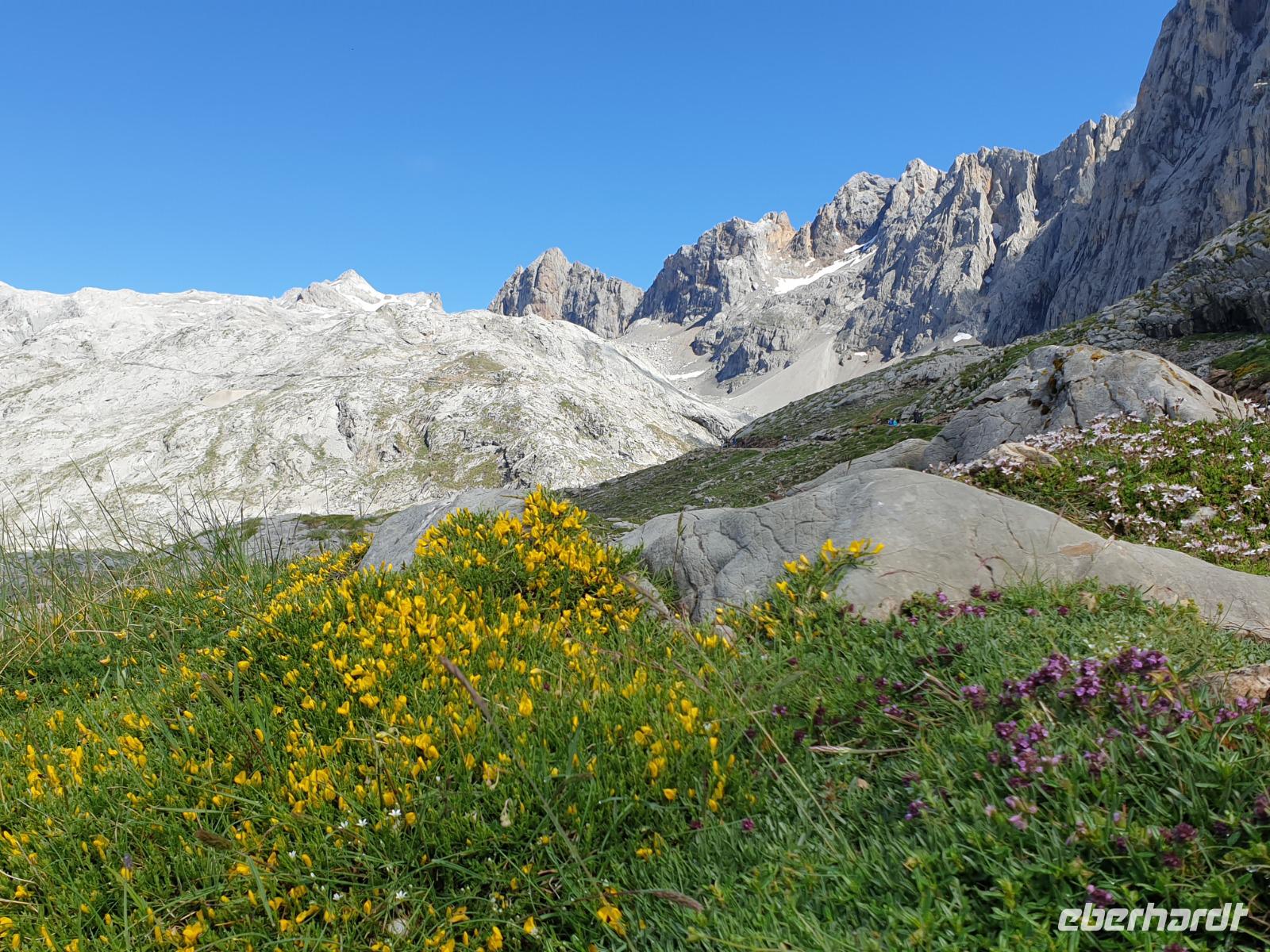 Um kurz nach 6 Uhr klingelt der Wecker und nach dem Frühstück fahren wir kurz nach 7 Uhr los in Richtung Kantabrien. Die erste Stunde im Bus versuchen wir noch ein bisschen zu schlafen und als wir die Augen öffnen, haben wir vor uns die "spanischen Alpen". Eine tolle Landschaft. Heute ohne Wolken. Wir fahren über einen Pass auf die andere Seite, wo wir ein unvergessliches Panorama über dem Nebel, der im Tal noch hängt, haben. Ein Meer aus Nebel und Gipfeln unter uns erschien wie ein Traum mit der Sonne als Zeuge. In Fuente De an der Seilbahnstation angekommen, treffen wir unseren örtlichen Wanderreiseleiter Oscar. Wir machen heute alle diese moderate bis anspruchsvolle, fast 16 Kilometer lange schöne Wanderung mit. Das Wetter könnte nicht besser sein. Letzten Winter und Frühling hat es hier viel geregnet und geschneit. Nun sind überall Blumen. Wir wandern nur einen Meter entfernt von Schnee.