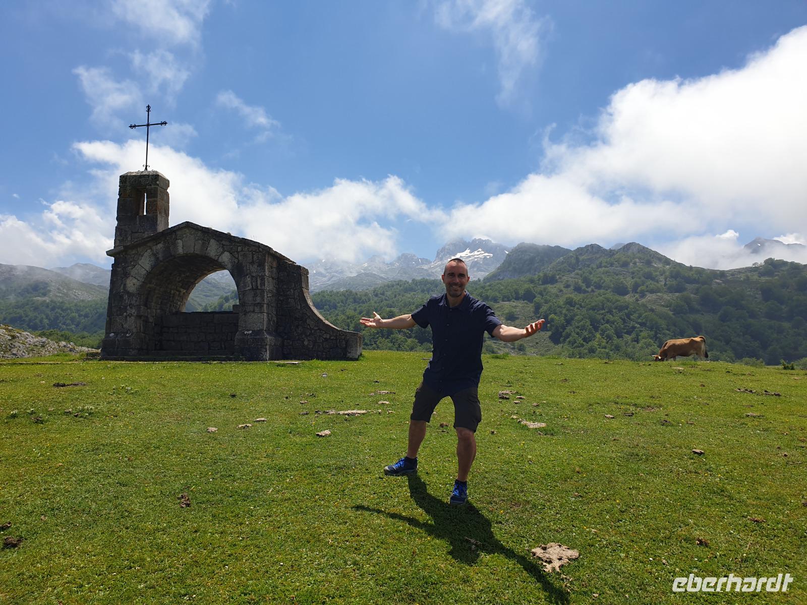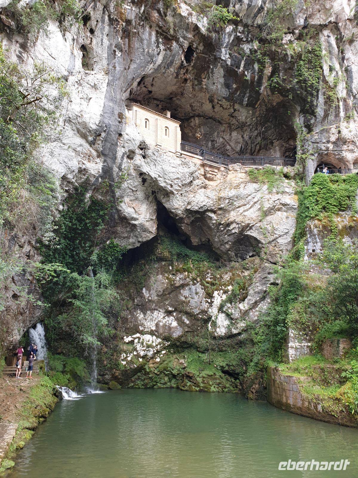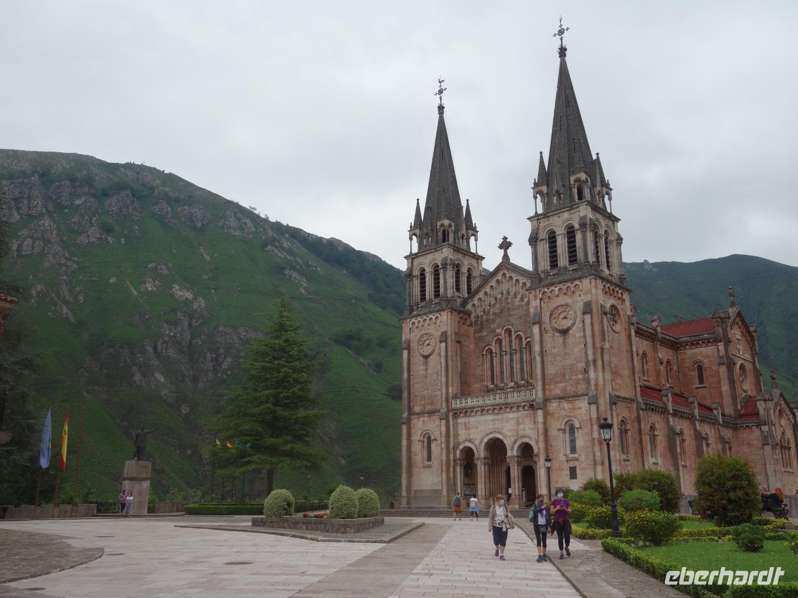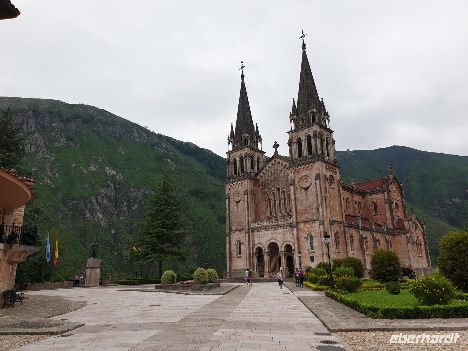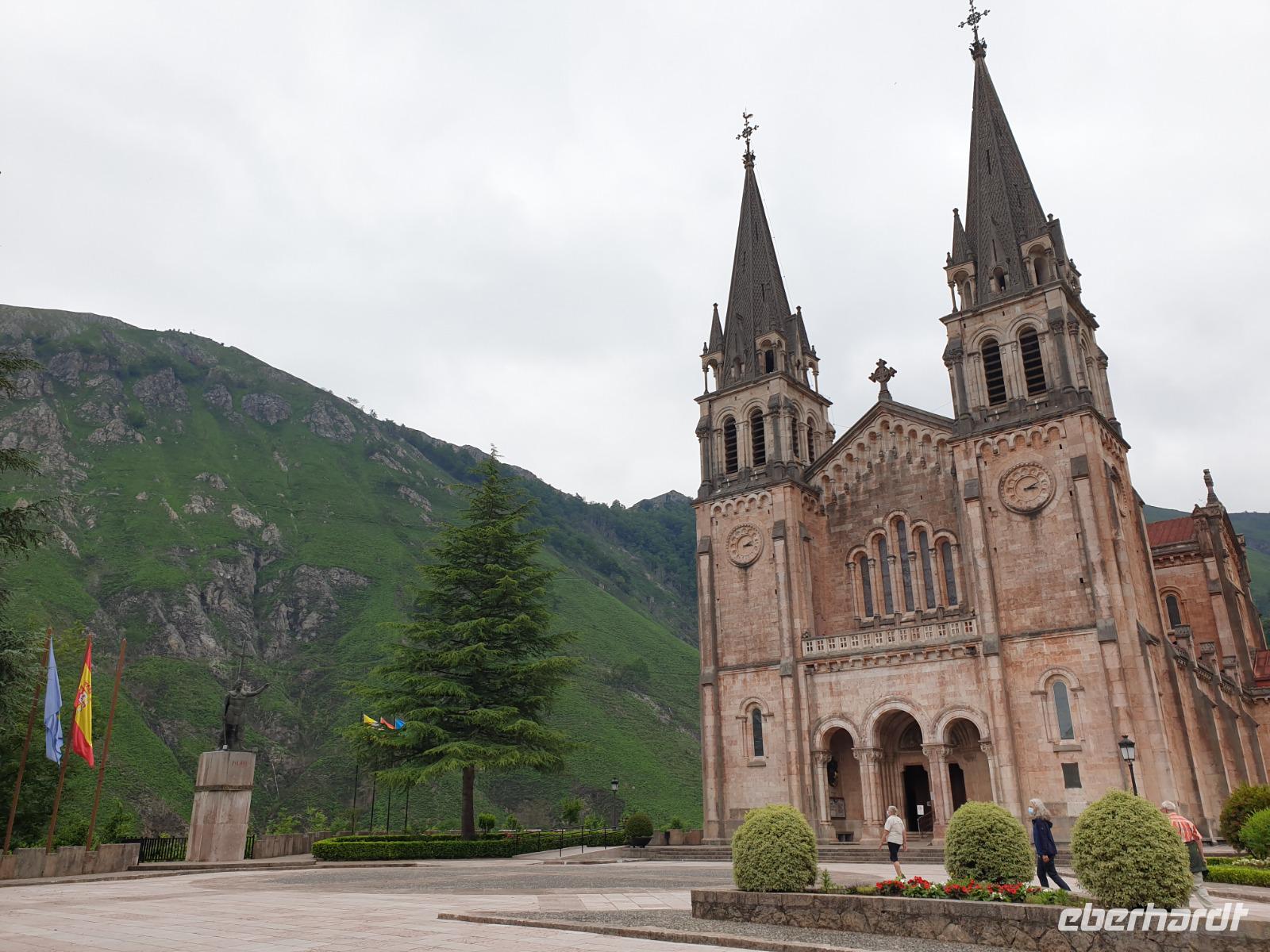 Nach dem Frühstück verlassen wir das kantabrische Tal des Picos de Europa und fahren bis Covadonga. Das Wetter ist heute wieder Klasse. Wir haben eine Genehmigung für den Bus und wir entscheiden uns über die serpentinenreiche Panoramastraße bis zu den Gletscher-Seen von Covadonga zu fahren. Da oben machen wir eine herrliche Wanderung um die 2 See herum. Später weiter unter am Wallfahrtsort Covadonga besichtigen wir die große Basilika und eine kleine Kapelle, die in die Felsengrotte gebaut wurden. Hier trafen wir auch andere Pilger, da hier auch eine Station der Küsten-Nordvariante des spanischen Jakobswegs ist. Berühmt wurde Covadonga, als 722 genau hier in diesem Gebirge die Reconquista (Wiedereroberung der Christen) mit der Schlacht von Covadonga, die erst 1492 im andalusischen Granada beendet wurde, begann.