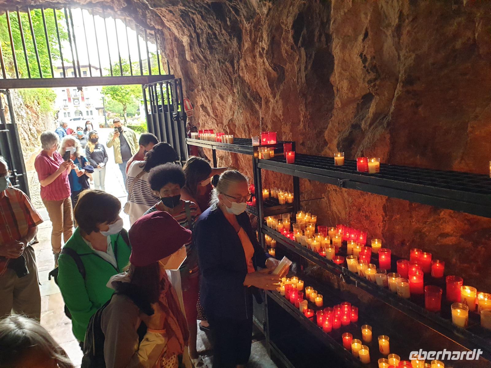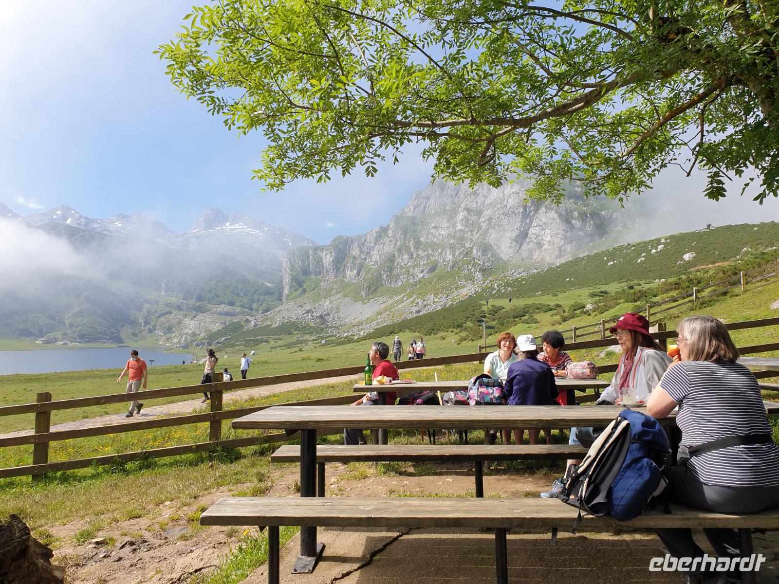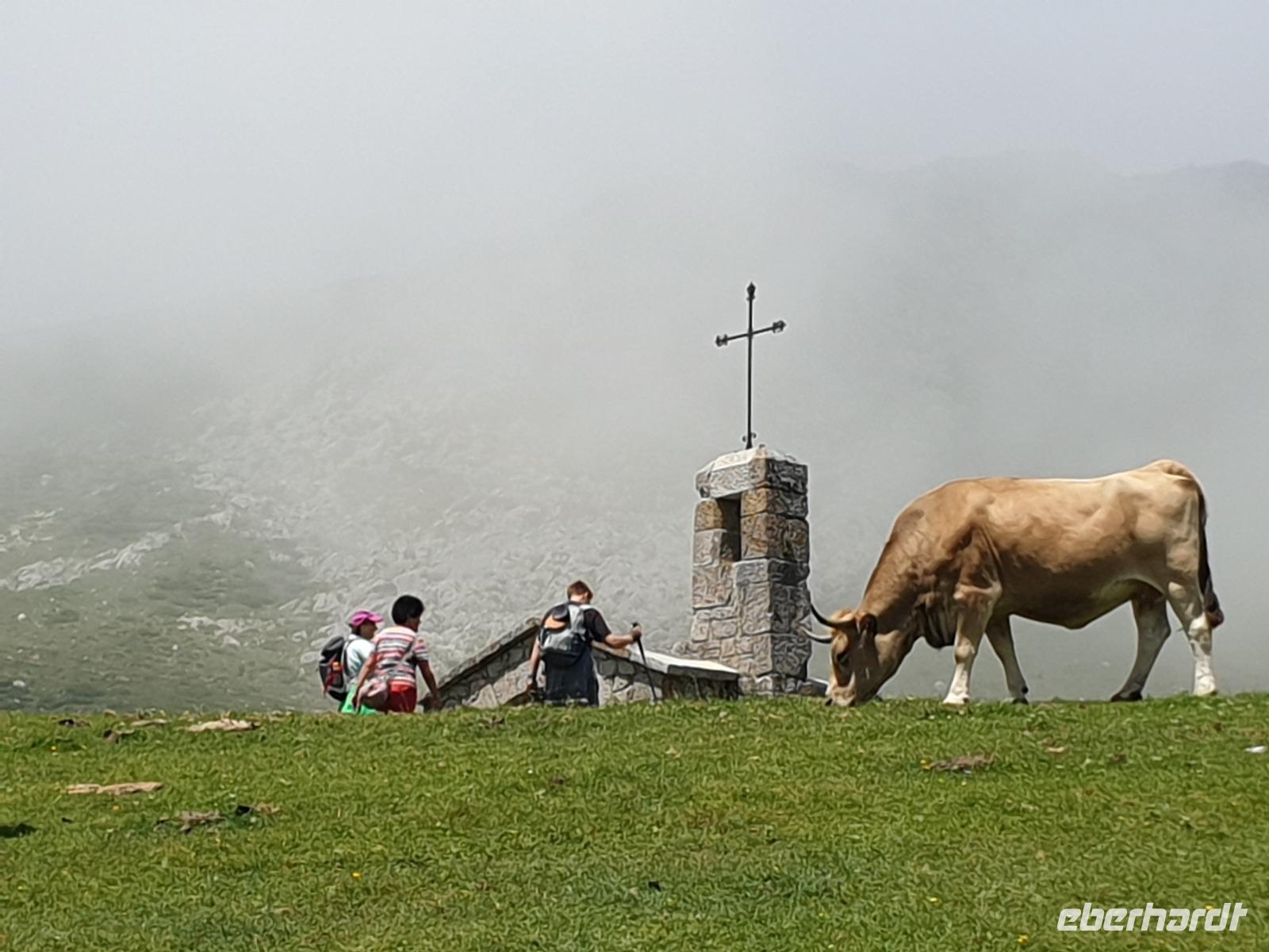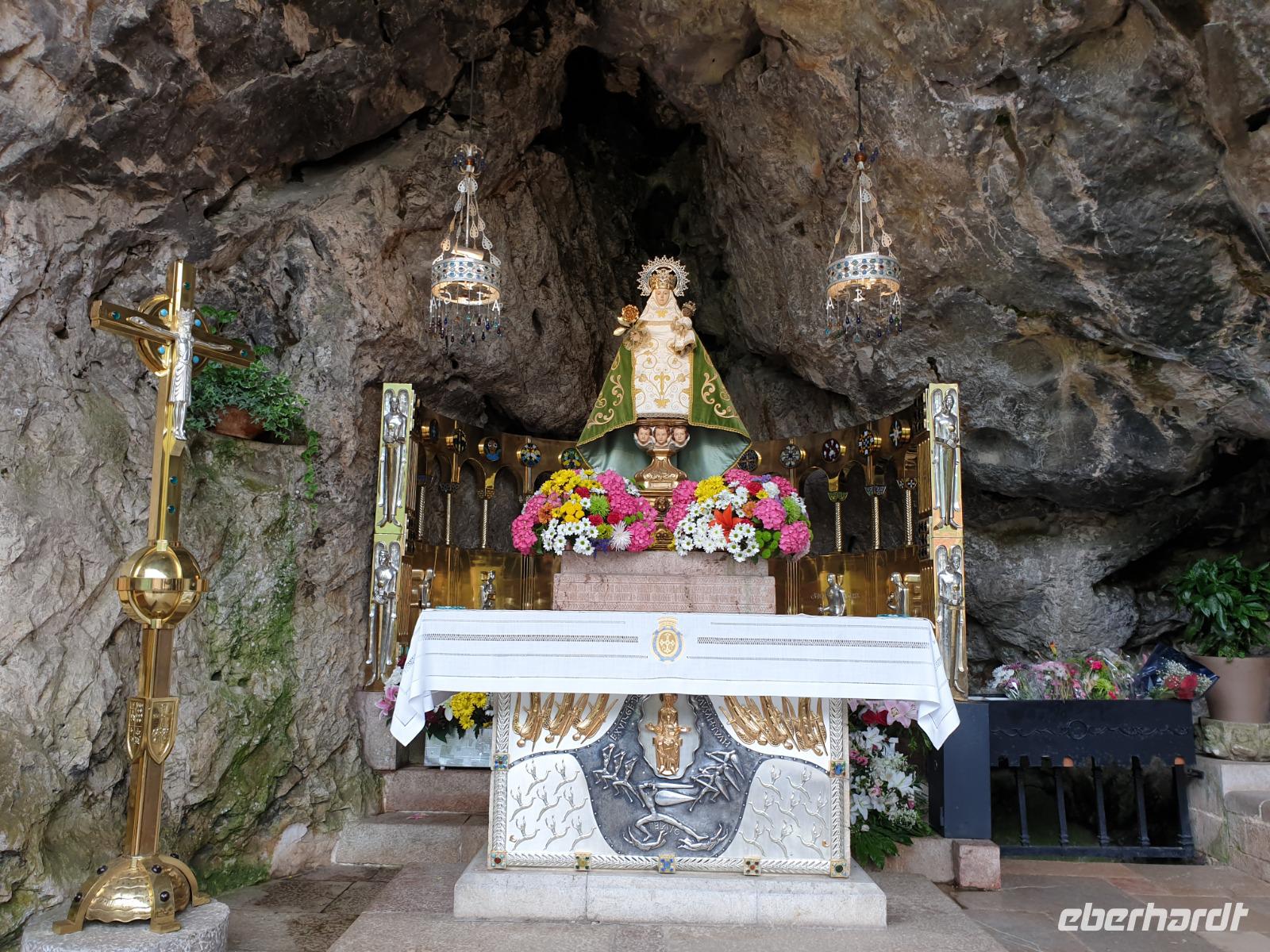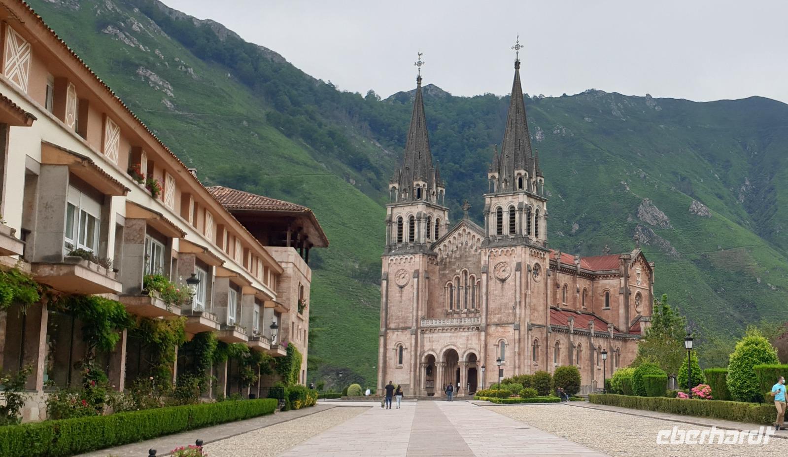 Nach dem Frühstück verlassen wir das kantabrische Tal des Picos de Europa und fahren bis Covadonga. Das Wetter ist heute wieder Klasse. Wir haben eine Genehmigung für den Bus und wir entscheiden uns über die serpentinenreiche Panoramastraße bis zu den Gletscher-Seen von Covadonga zu fahren. Da oben machen wir eine herrliche Wanderung um die 2 See herum. Später weiter unter am Wallfahrtsort Covadonga besichtigen wir die große Basilika und eine kleine Kapelle, die in die Felsengrotte gebaut wurden. Hier trafen wir auch andere Pilger, da hier auch eine Station der Küsten-Nordvariante des spanischen Jakobswegs ist. Berühmt wurde Covadonga, als 722 genau hier in diesem Gebirge die Reconquista (Wiedereroberung der Christen) mit der Schlacht von Covadonga, die erst 1492 im andalusischen Granada beendet wurde, begann.