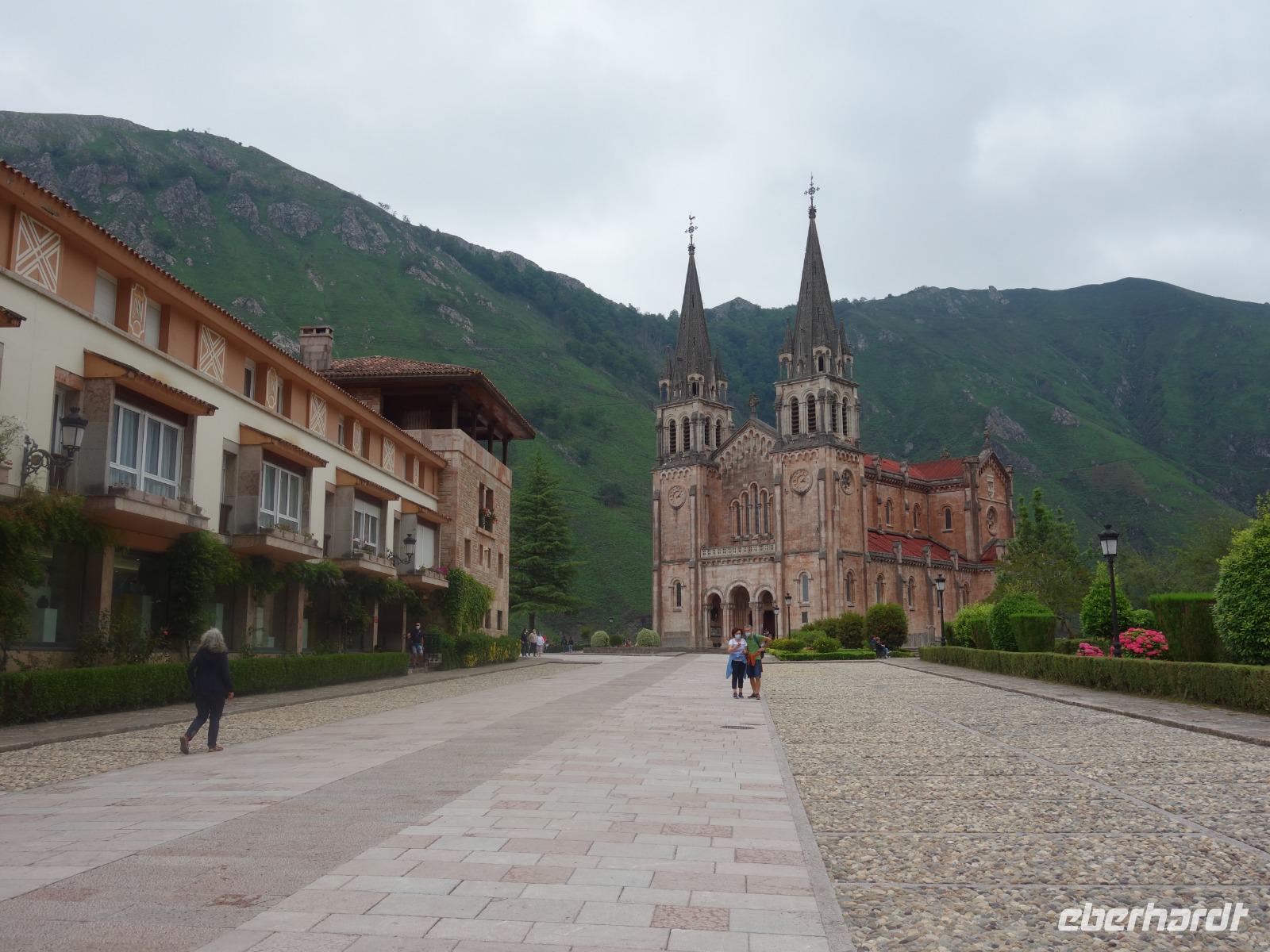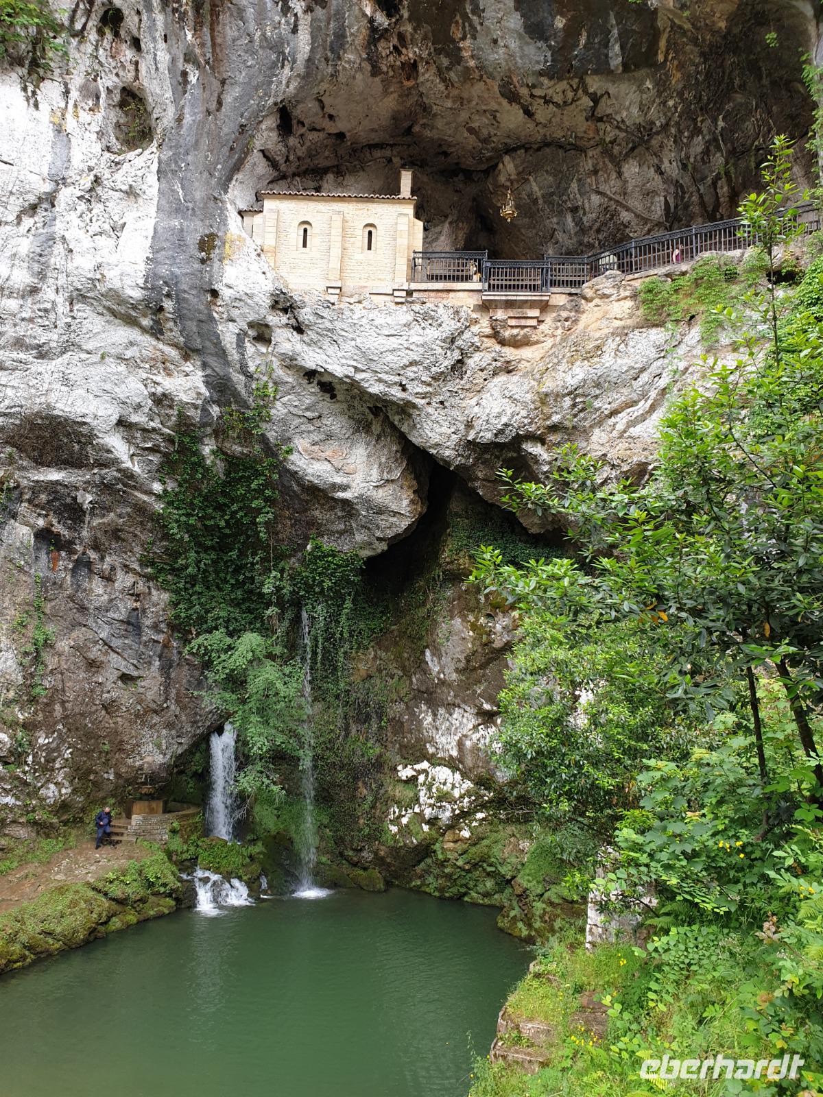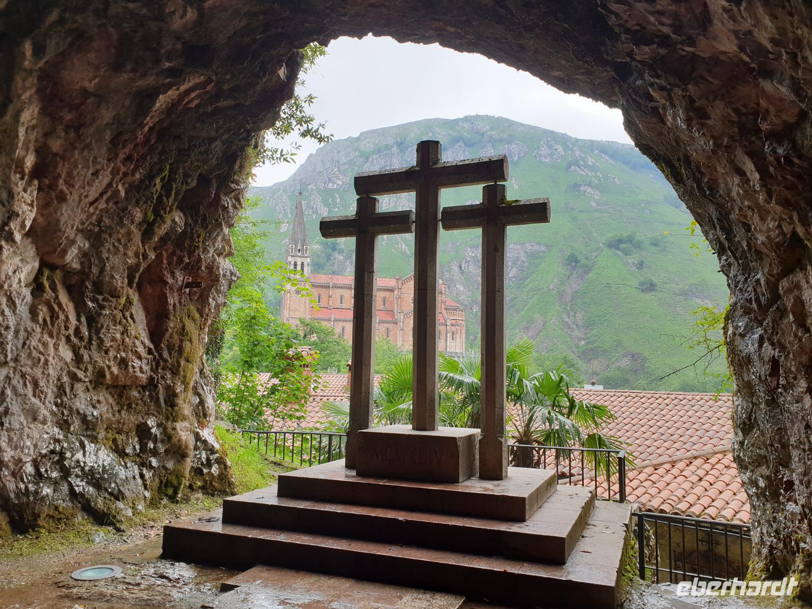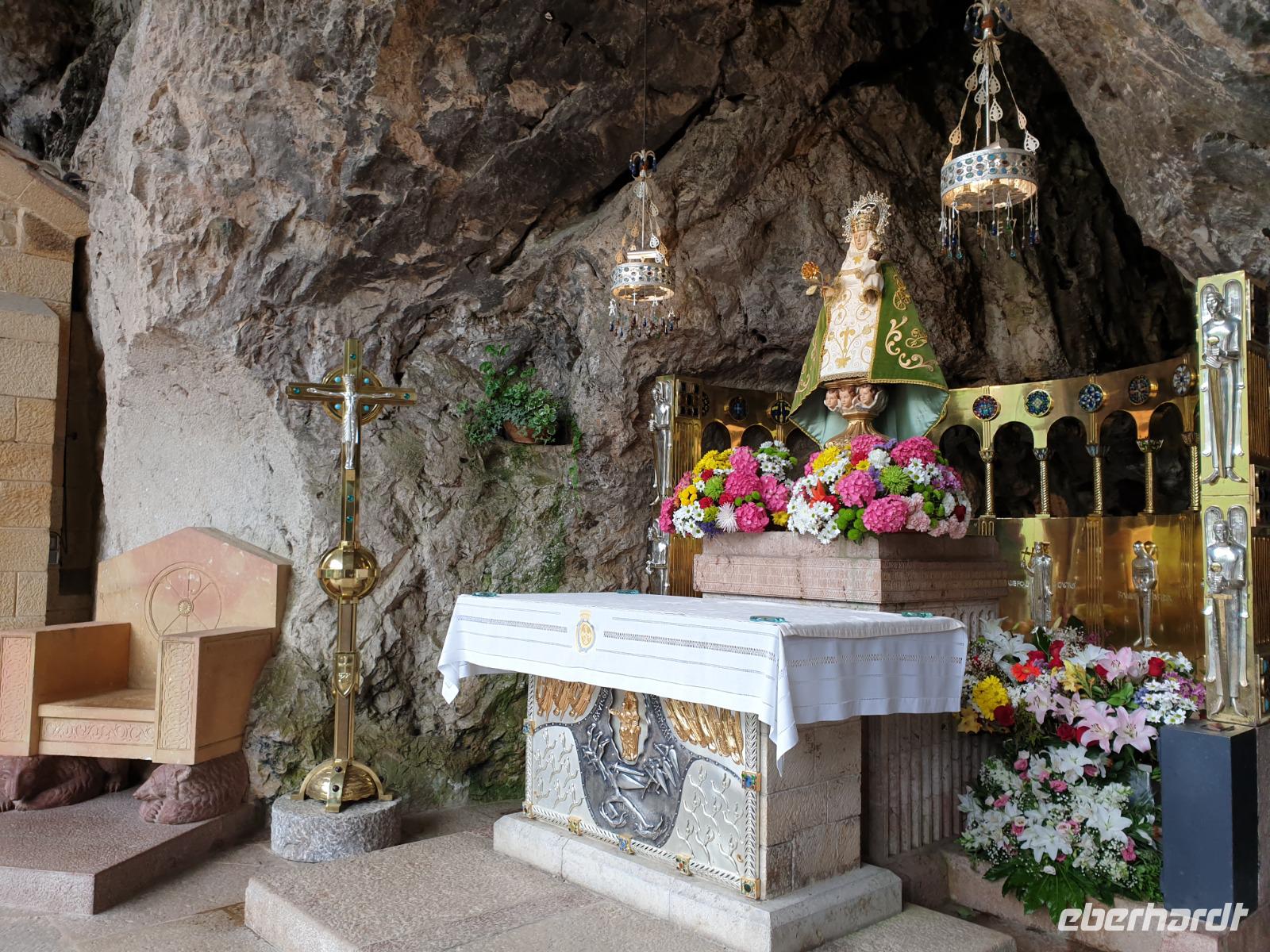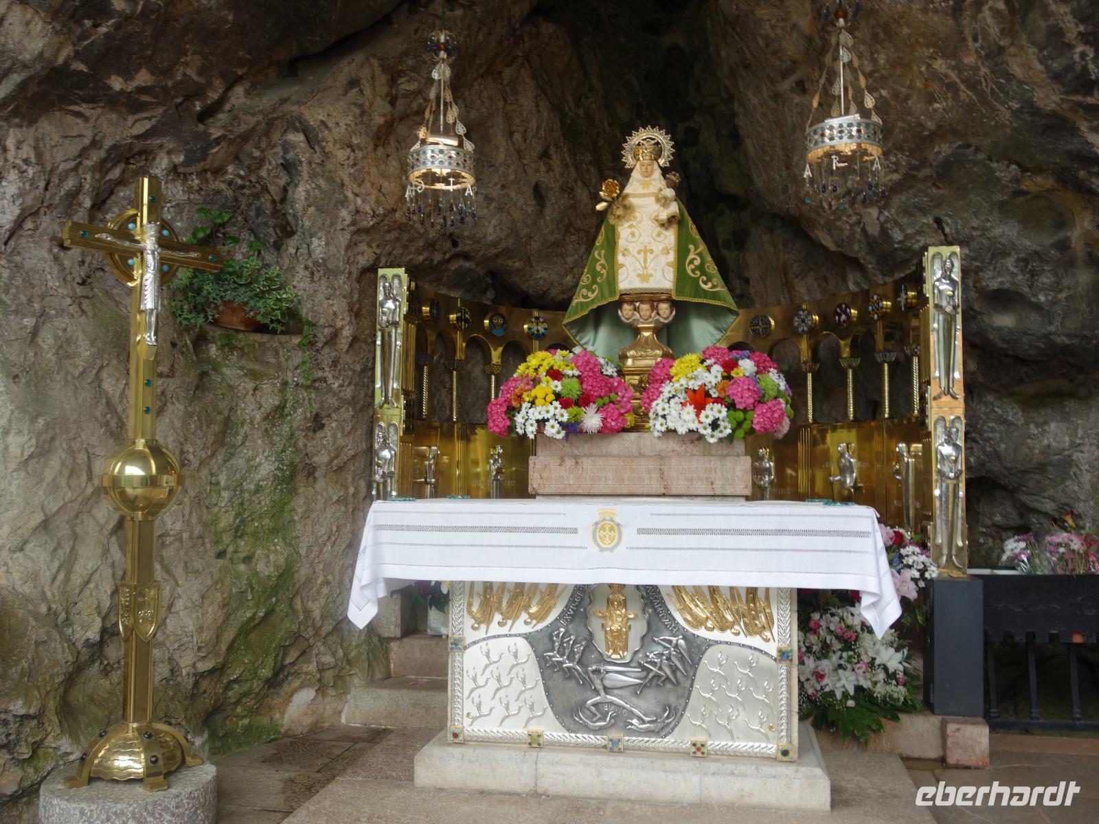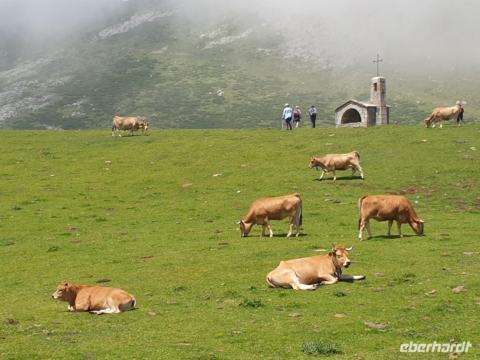 Nach dem Frühstück verlassen wir das kantabrische Tal des Picos de Europa und fahren bis Covadonga. Das Wetter ist heute wieder Klasse. Wir haben eine Genehmigung für den Bus und wir entscheiden uns über die serpentinenreiche Panoramastraße bis zu den Gletscher-Seen von Covadonga zu fahren. Da oben machen wir eine herrliche Wanderung um die 2 See herum. Später weiter unter am Wallfahrtsort Covadonga besichtigen wir die große Basilika und eine kleine Kapelle, die in die Felsengrotte gebaut wurden. Hier trafen wir auch andere Pilger, da hier auch eine Station der Küsten-Nordvariante des spanischen Jakobswegs ist. Berühmt wurde Covadonga, als 722 genau hier in diesem Gebirge die Reconquista (Wiedereroberung der Christen) mit der Schlacht von Covadonga, die erst 1492 im andalusischen Granada beendet wurde, begann.