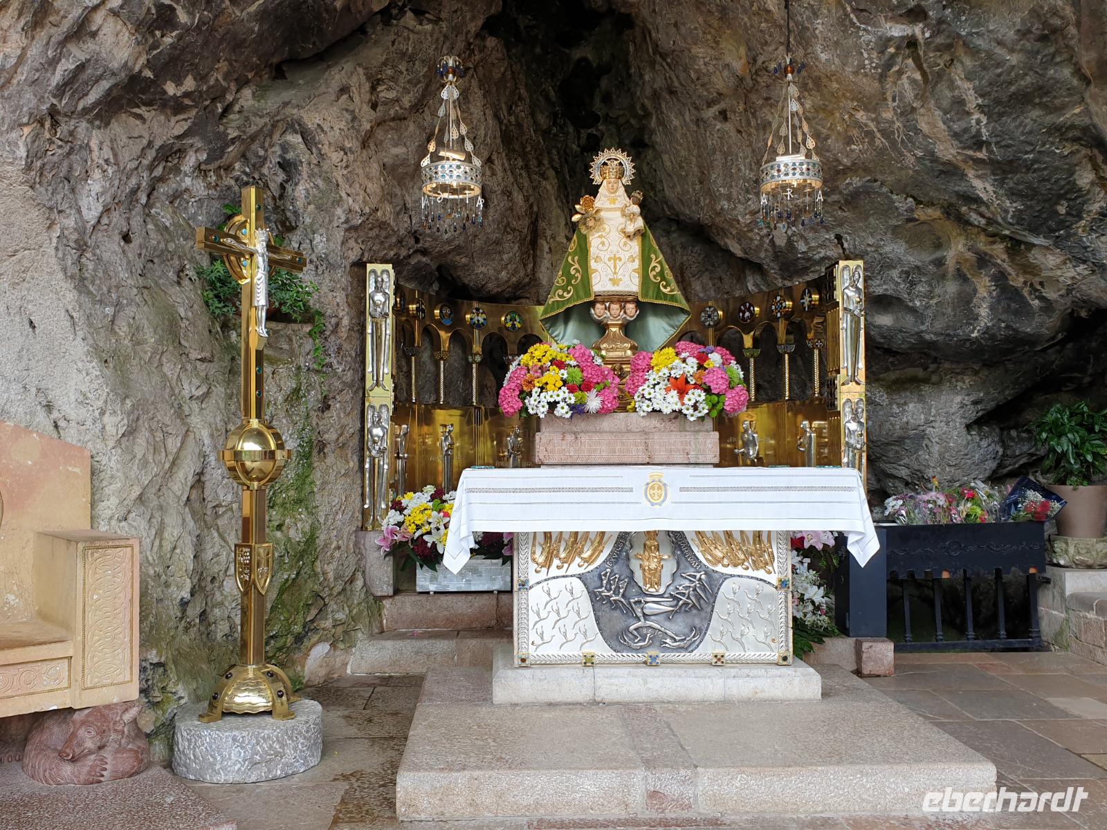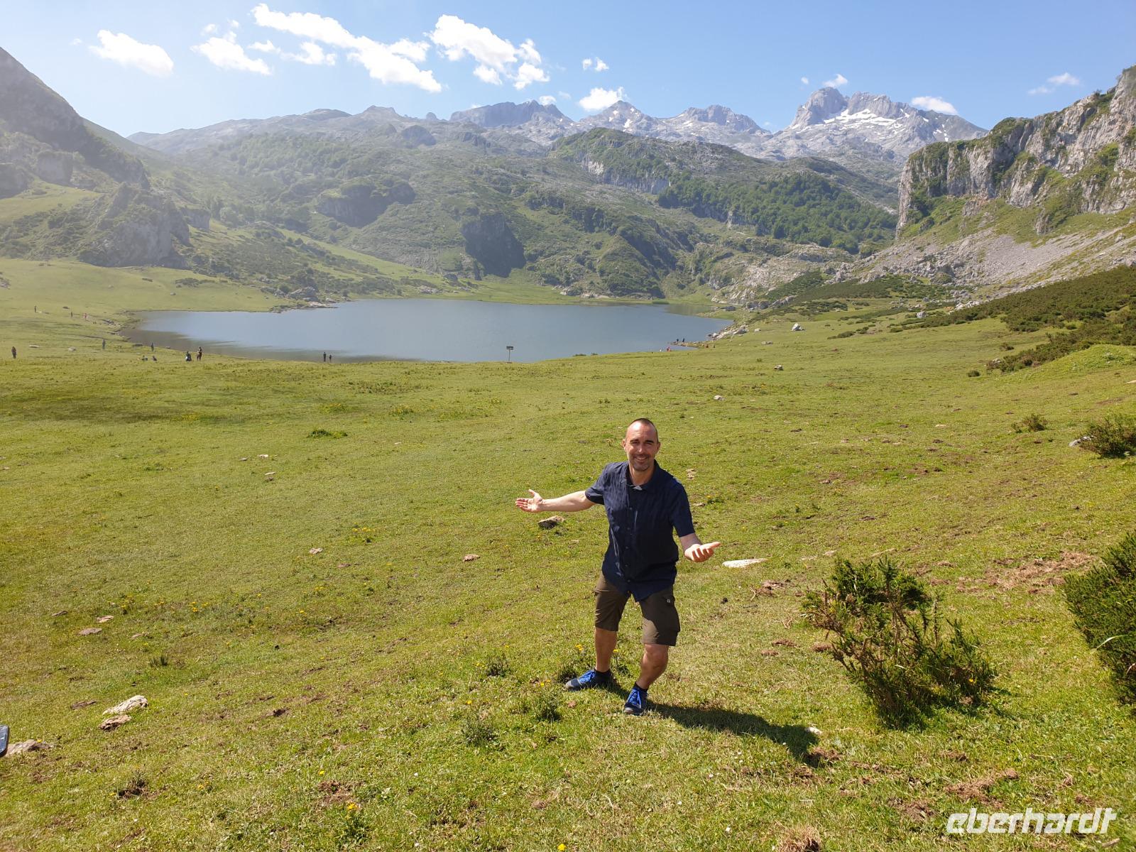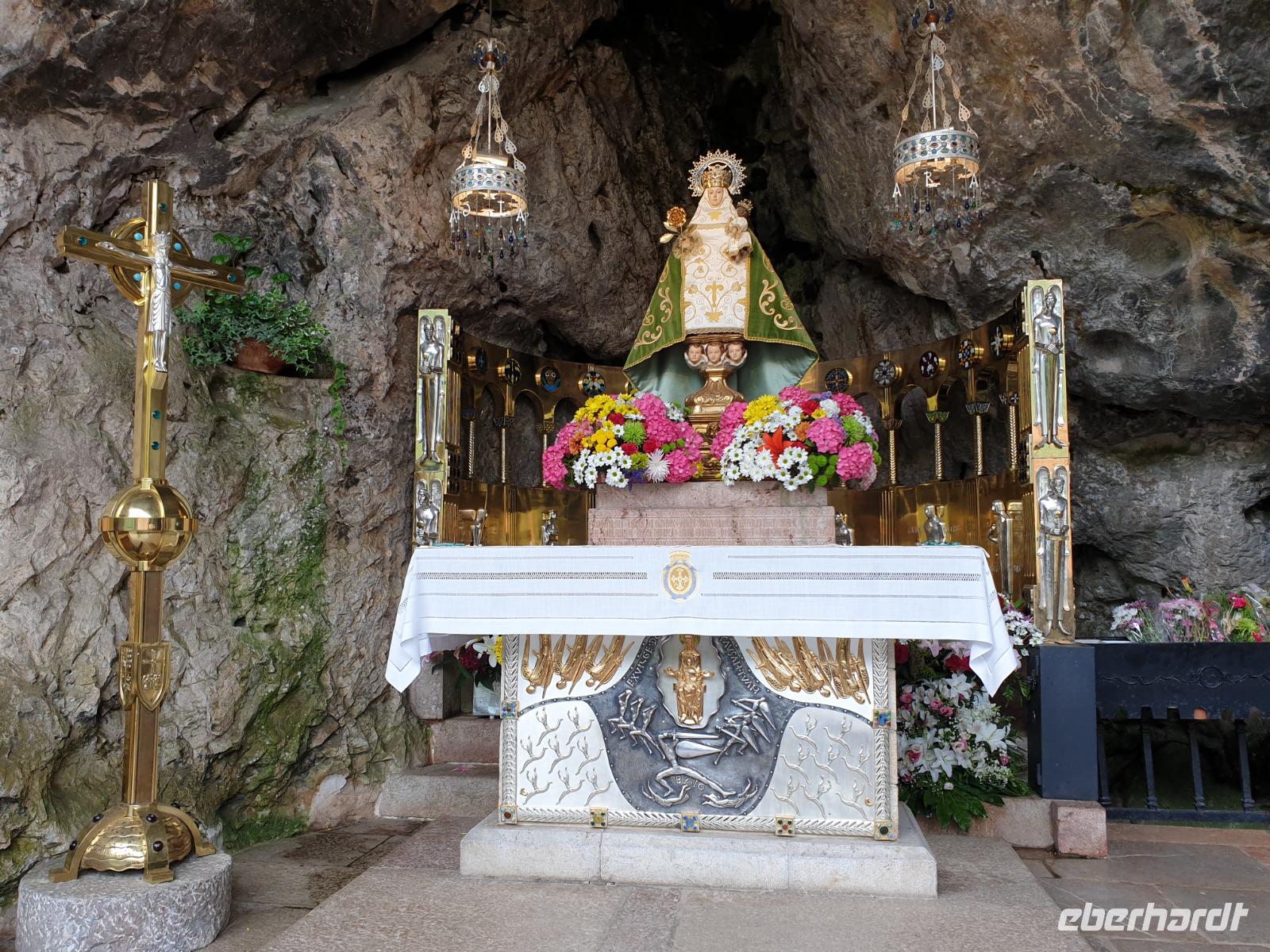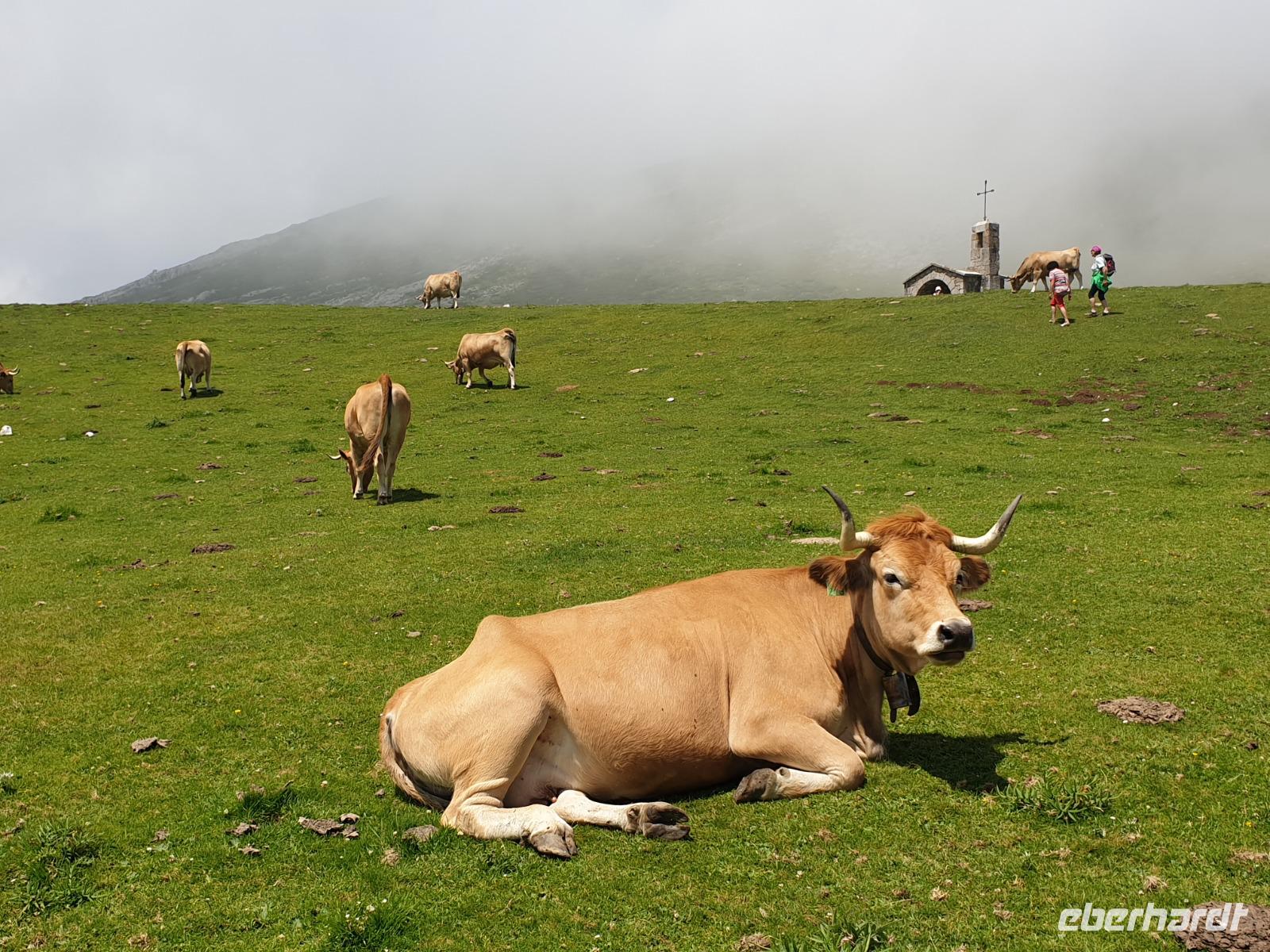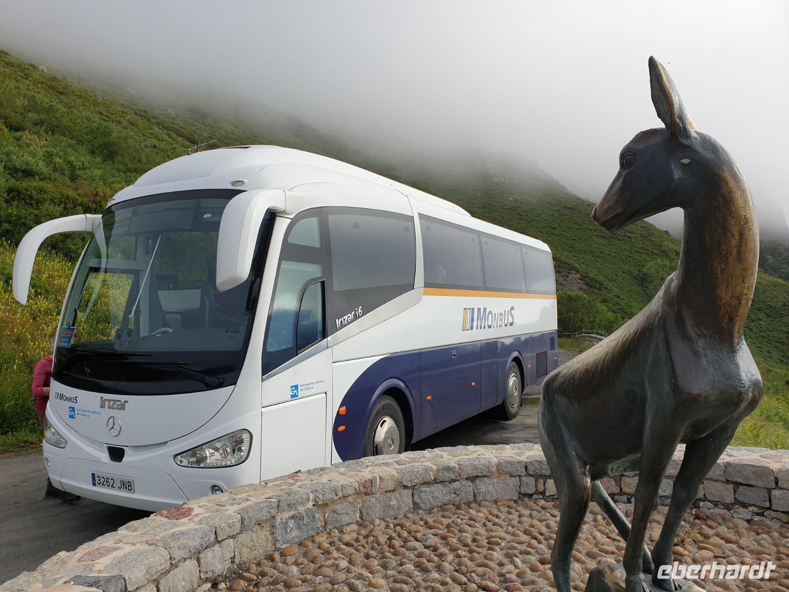 Nach dem Frühstück verlassen wir das kantabrische Tal des Picos de Europa und fahren bis Covadonga. Das Wetter ist heute wieder Klasse. Wir haben eine Genehmigung für den Bus und wir entscheiden uns über die serpentinenreiche Panoramastraße bis zu den Gletscher-Seen von Covadonga zu fahren. Da oben machen wir eine herrliche Wanderung um die 2 See herum. Später weiter unter am Wallfahrtsort Covadonga besichtigen wir die große Basilika und eine kleine Kapelle, die in die Felsengrotte gebaut wurden. Hier trafen wir auch andere Pilger, da hier auch eine Station der Küsten-Nordvariante des spanischen Jakobswegs ist. Berühmt wurde Covadonga, als 722 genau hier in diesem Gebirge die Reconquista (Wiedereroberung der Christen) mit der Schlacht von Covadonga, die erst 1492 im andalusischen Granada beendet wurde, begann.
