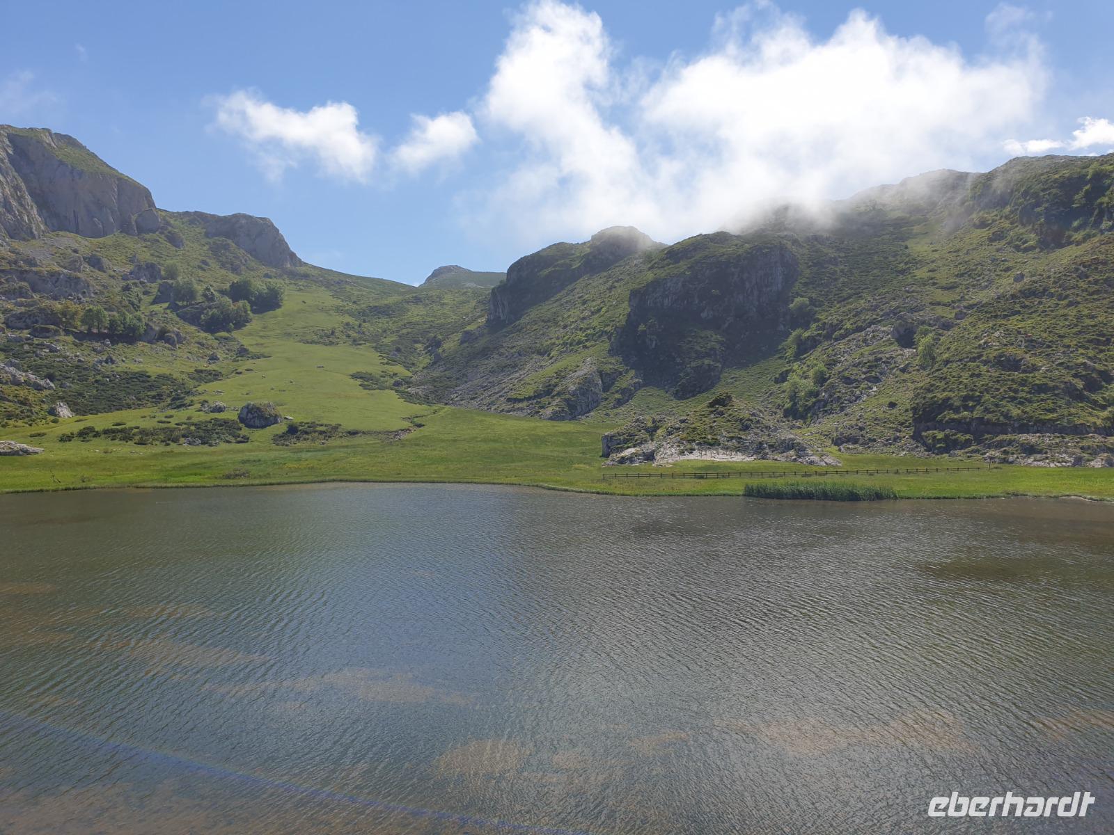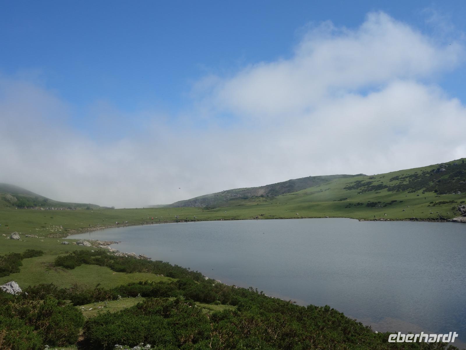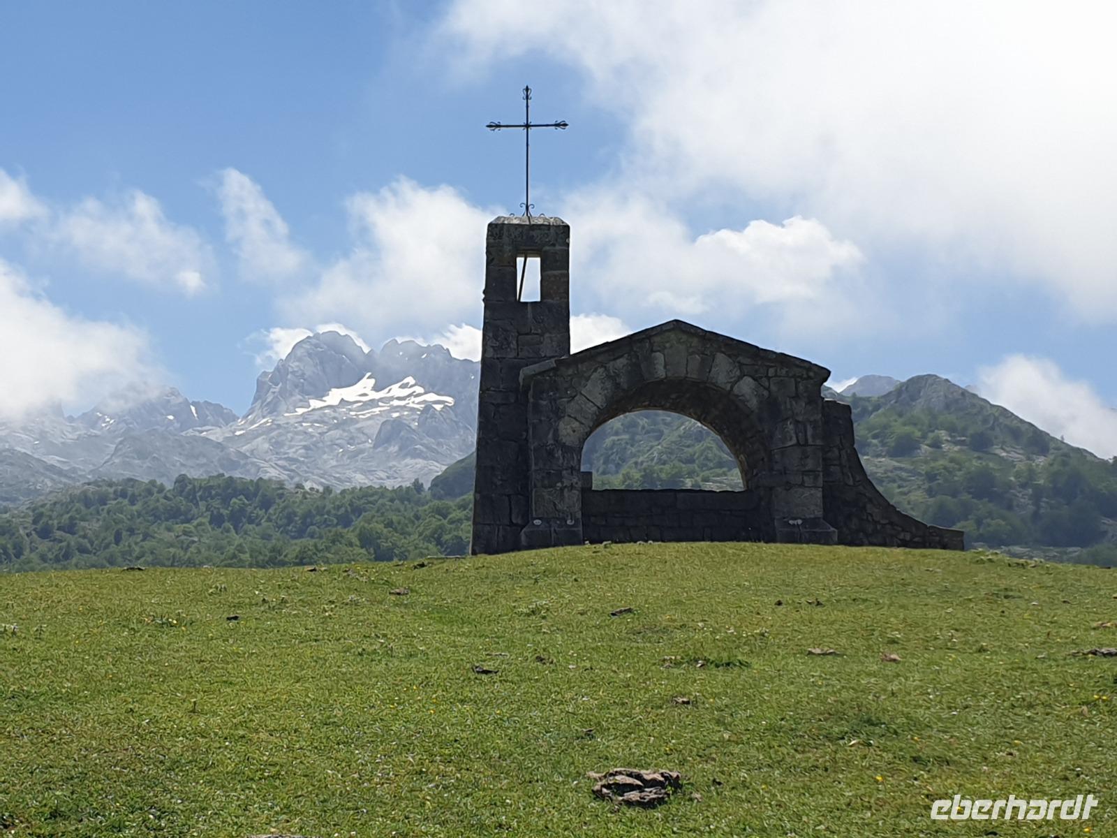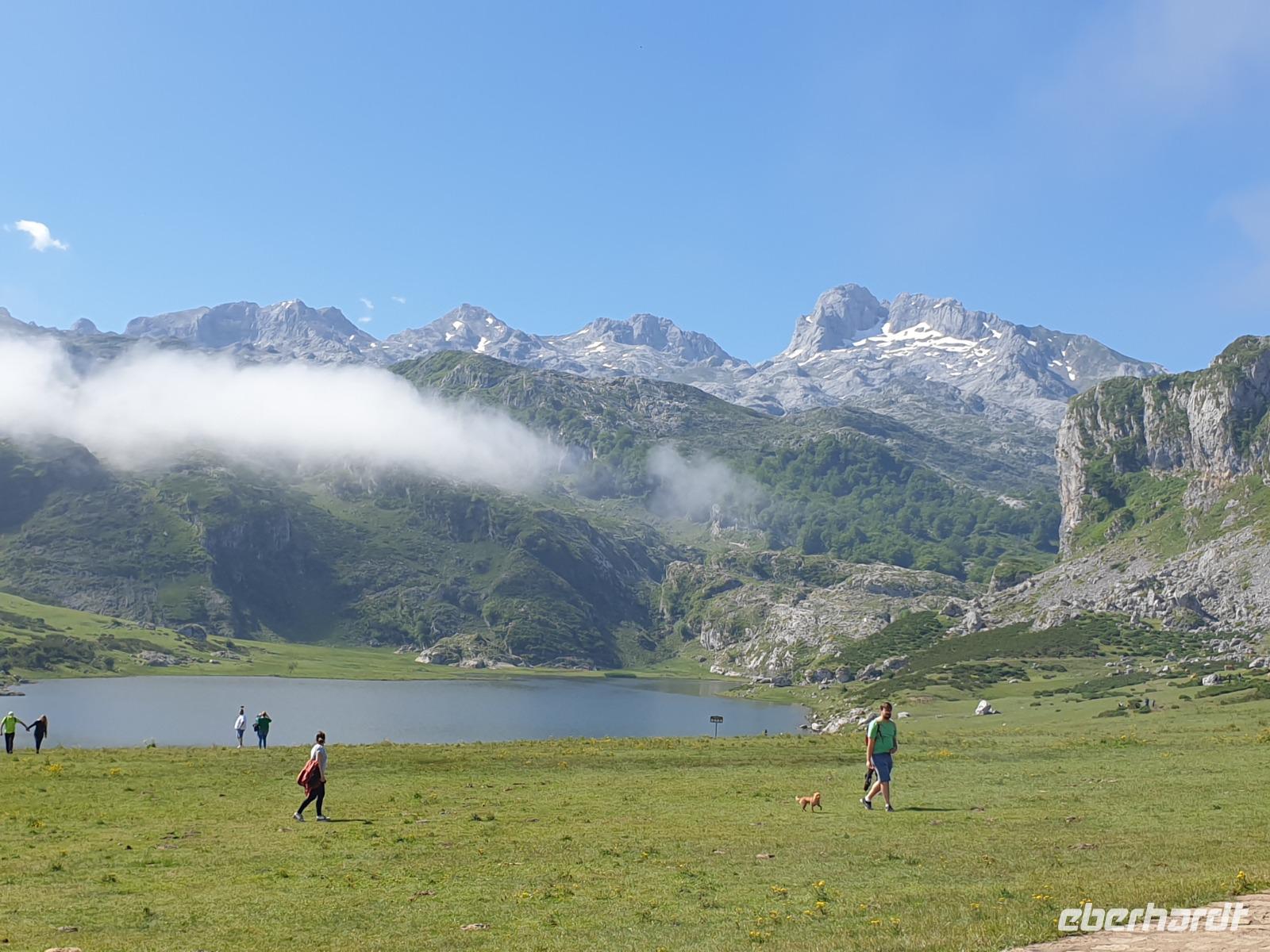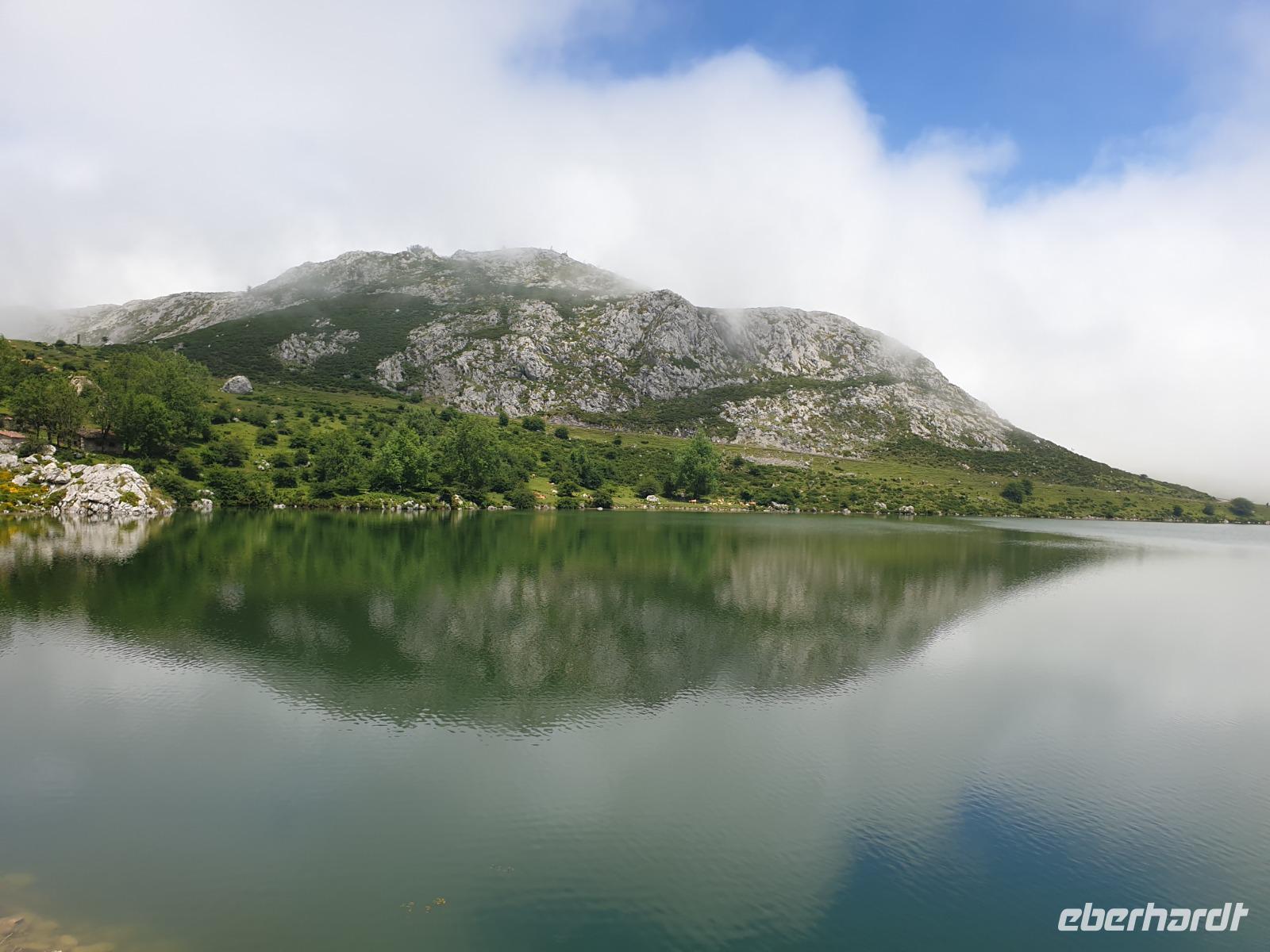 Nach dem Frühstück verlassen wir das kantabrische Tal des Picos de Europa und fahren bis Covadonga. Das Wetter ist heute wieder Klasse. Wir haben eine Genehmigung für den Bus und wir entscheiden uns über die serpentinenreiche Panoramastraße bis zu den Gletscher-Seen von Covadonga zu fahren. Da oben machen wir eine herrliche Wanderung um die 2 See herum. Später weiter unter am Wallfahrtsort Covadonga besichtigen wir die große Basilika und eine kleine Kapelle, die in die Felsengrotte gebaut wurden. Hier trafen wir auch andere Pilger, da hier auch eine Station der Küsten-Nordvariante des spanischen Jakobswegs ist. Berühmt wurde Covadonga, als 722 genau hier in diesem Gebirge die Reconquista (Wiedereroberung der Christen) mit der Schlacht von Covadonga, die erst 1492 im andalusischen Granada beendet wurde, begann.