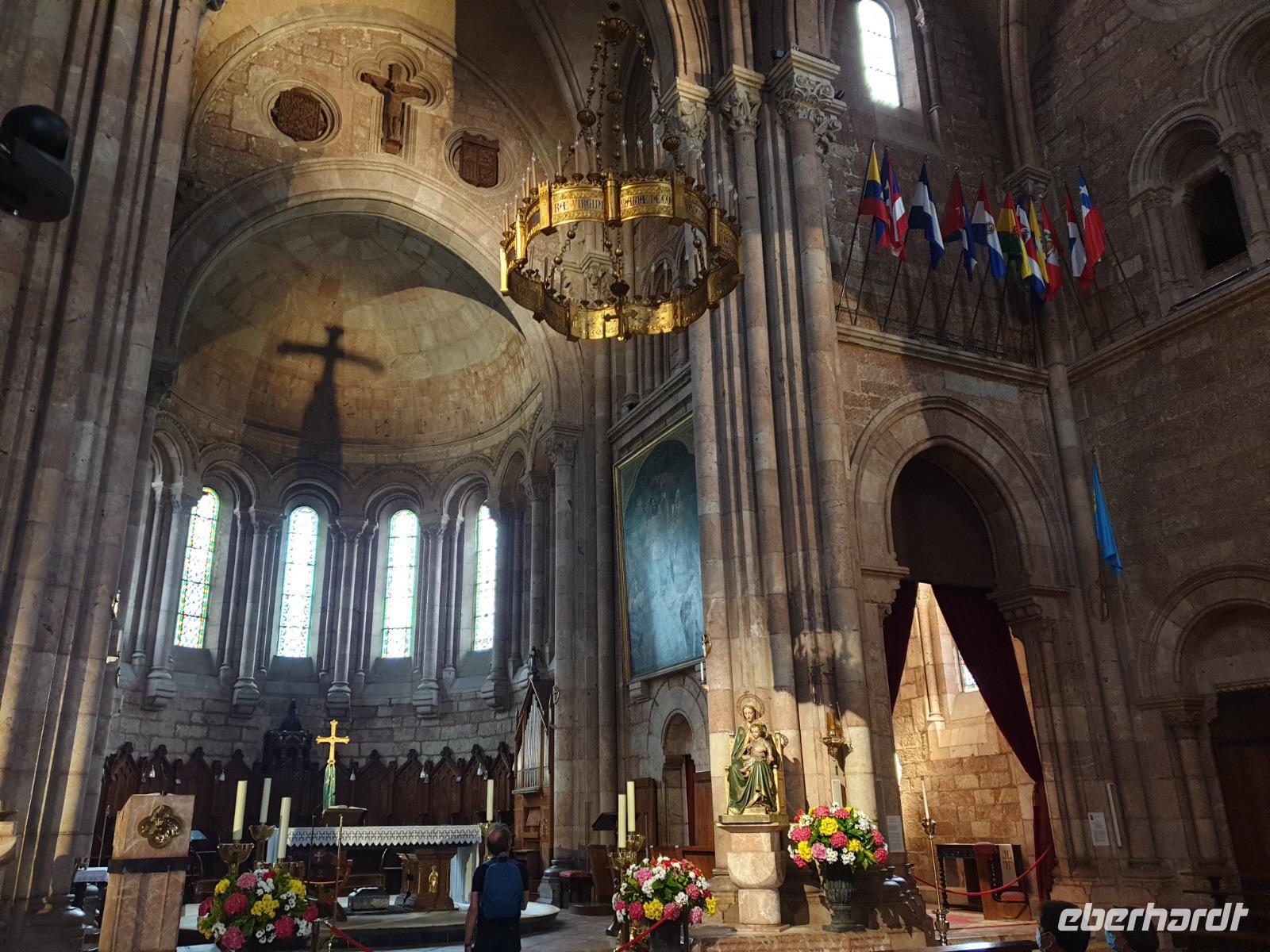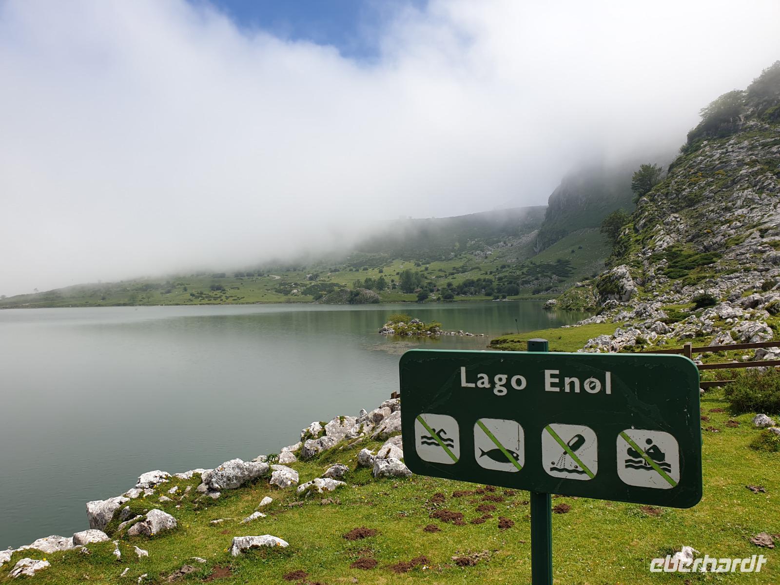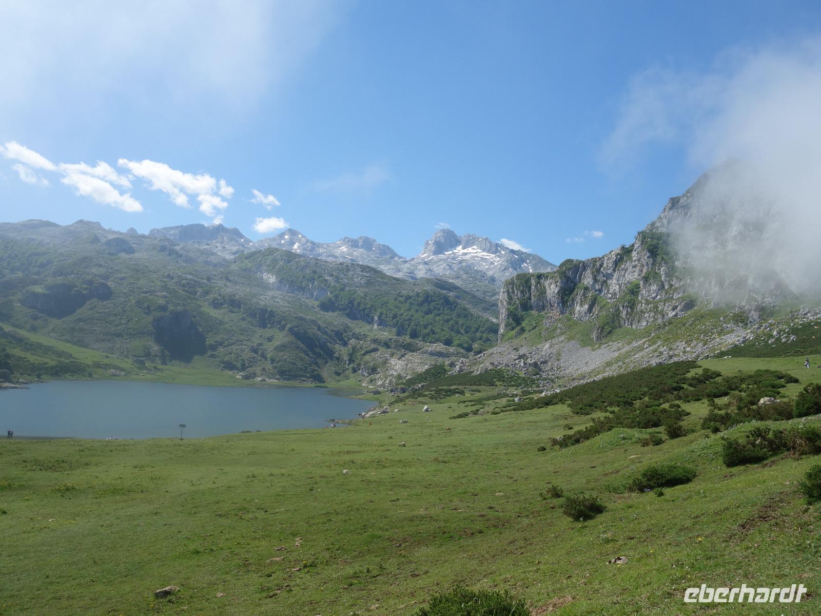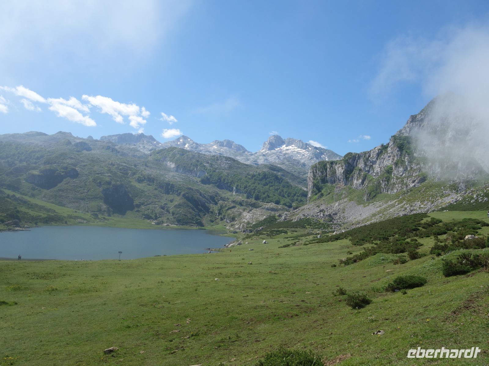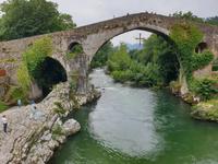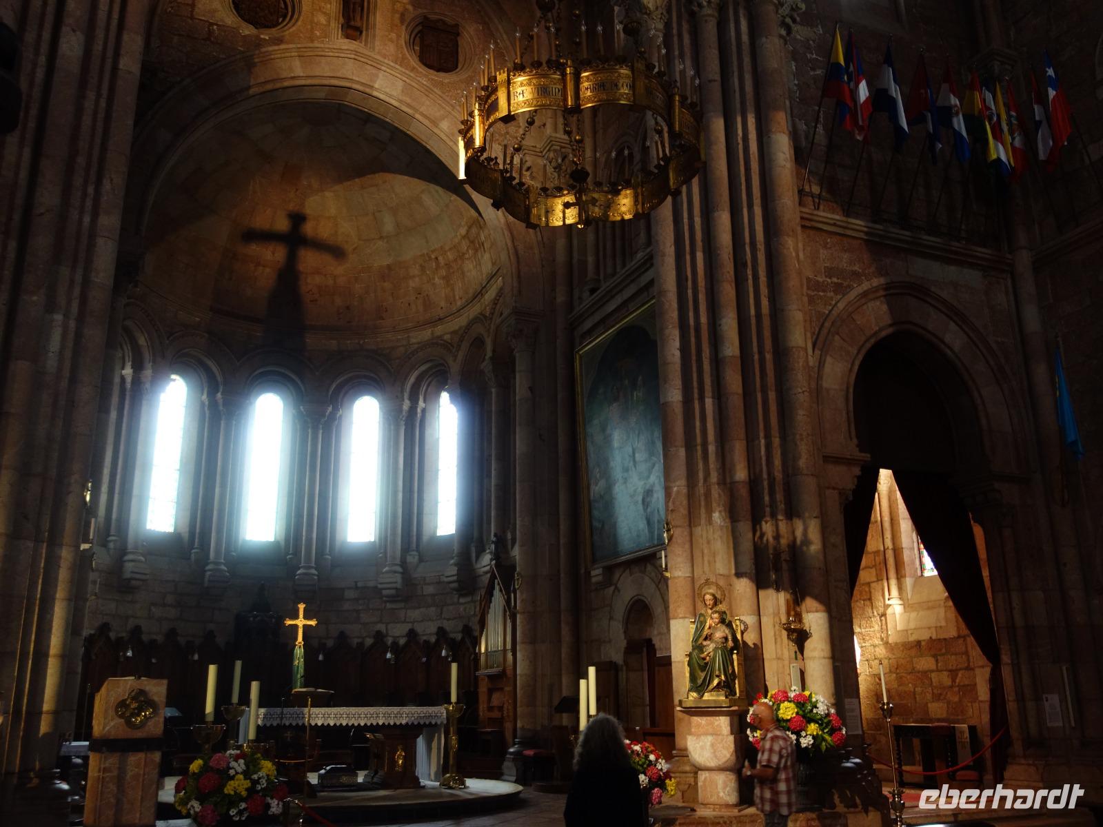 Nach dem Frühstück verlassen wir das kantabrische Tal des Picos de Europa und fahren bis Covadonga. Das Wetter ist heute wieder Klasse. Wir haben eine Genehmigung für den Bus und wir entscheiden uns über die serpentinenreiche Panoramastraße bis zu den Gletscher-Seen von Covadonga zu fahren. Da oben machen wir eine herrliche Wanderung um die 2 See herum. Später weiter unter am Wallfahrtsort Covadonga besichtigen wir die große Basilika und eine kleine Kapelle, die in die Felsengrotte gebaut wurden. Hier trafen wir auch andere Pilger, da hier auch eine Station der Küsten-Nordvariante des spanischen Jakobswegs ist. Berühmt wurde Covadonga, als 722 genau hier in diesem Gebirge die Reconquista (Wiedereroberung der Christen) mit der Schlacht von Covadonga, die erst 1492 im andalusischen Granada beendet wurde, begann.