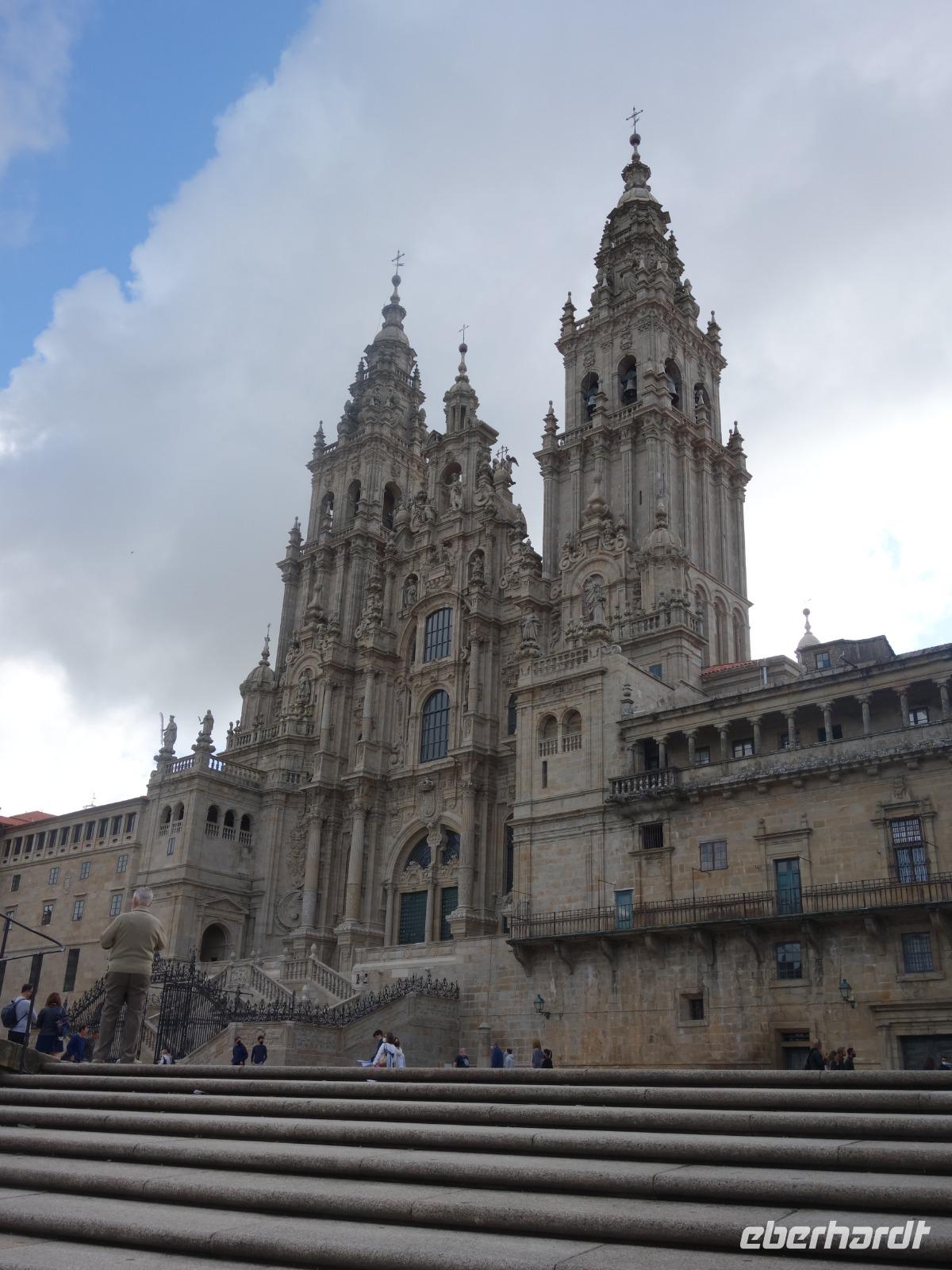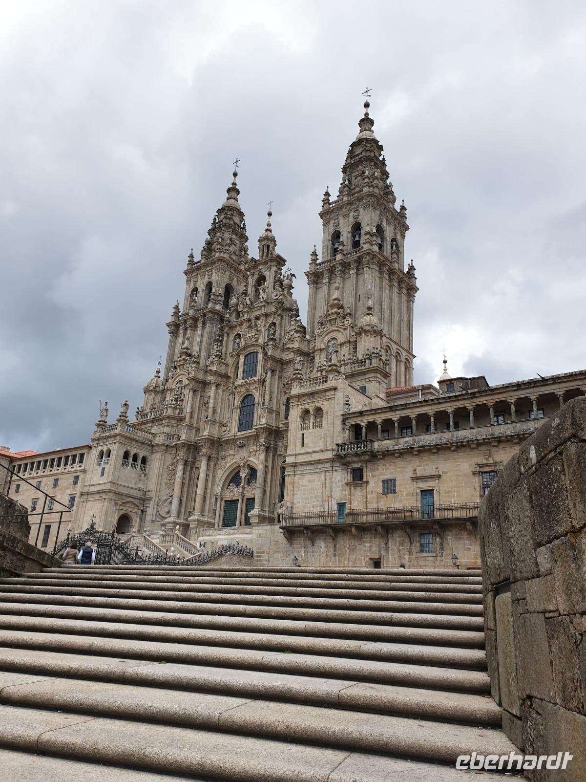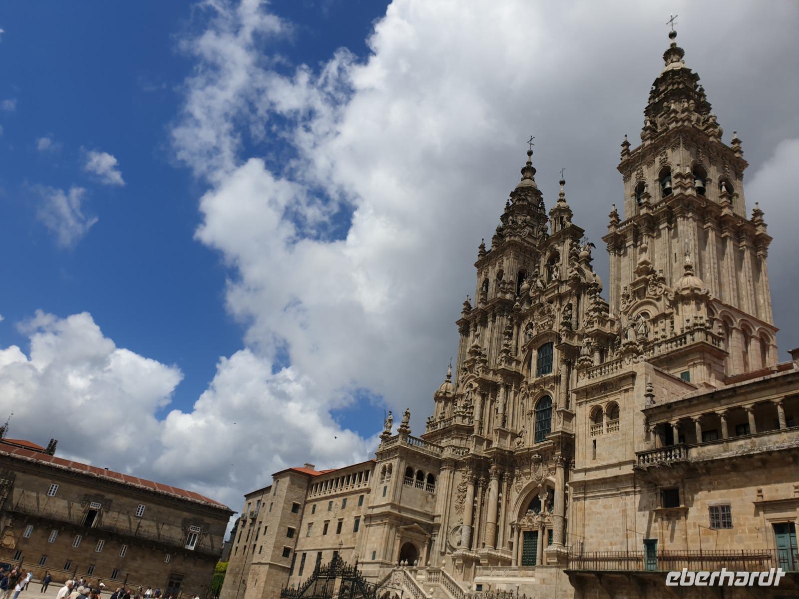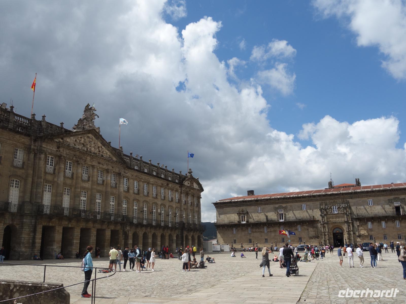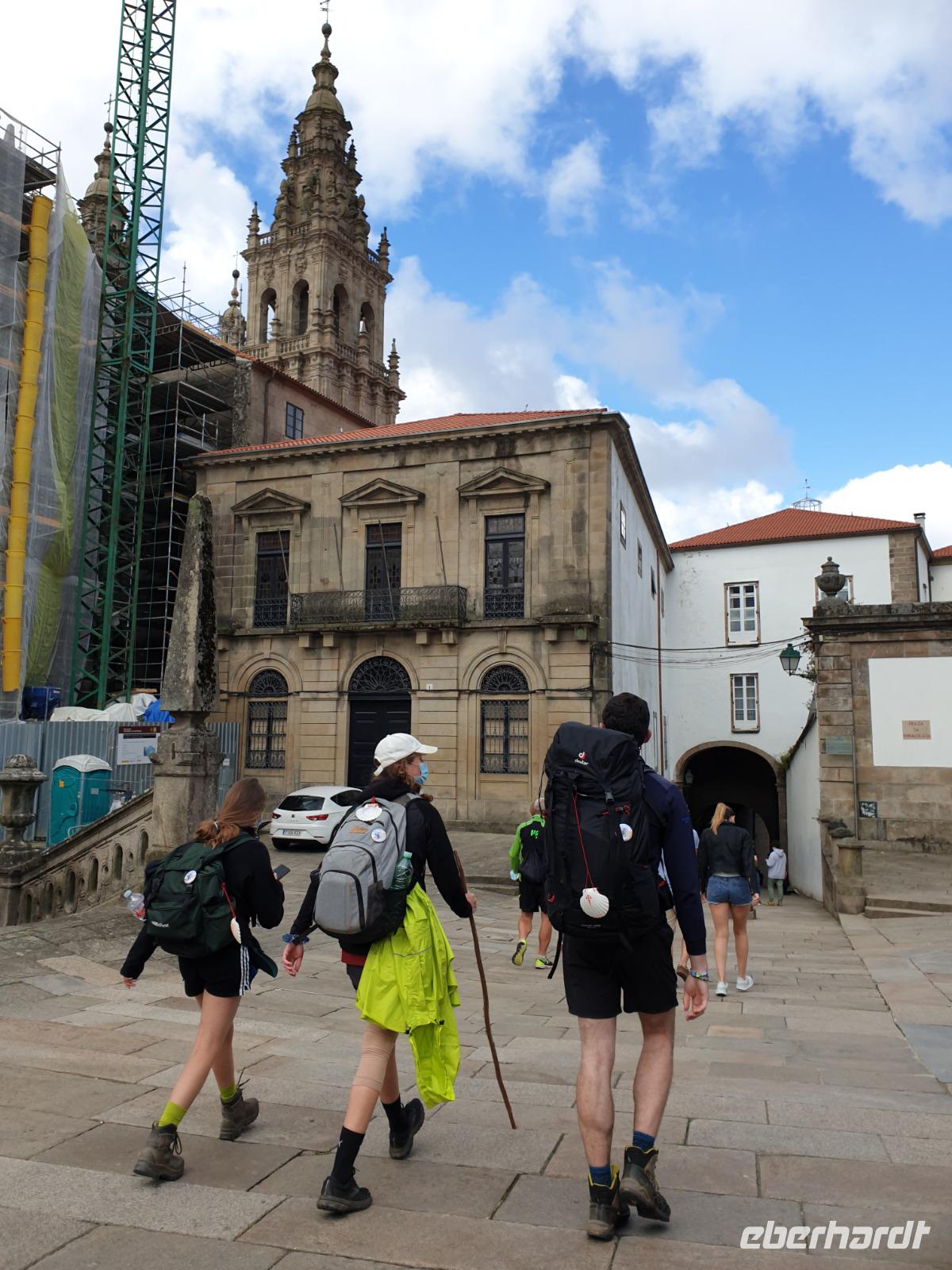 Heute entscheiden wir uns dafür, die letzten 5 Kilometer bis Santiago ohne reden zu wandern. Wir befinden uns hier vor den Toren von dem weltbekannten Wallfahrtsort Santiago de Compostela und der Hauptstadt der Provinz Galicien. Wir wandern heute das berühmte letzte Stück des Jakobswegs von Monte do Gozo (Hügel der Freude) von wo man die Türme der Kathedrale sieht bis Santiago de Compostela. Unsere Seele freut sich schon darauf! Auf dem Weg sehen wir die Türme der Kathedrale schon von Weitem und kommen wie schon im Mittelalter in der Stadt an, um traditionell den Apostel zu umarmen. Am Obradoiro Platz gegenüber der prächtigen Fassade der Kathedrale, machen alle tolle Bilder zur Erinnerung.